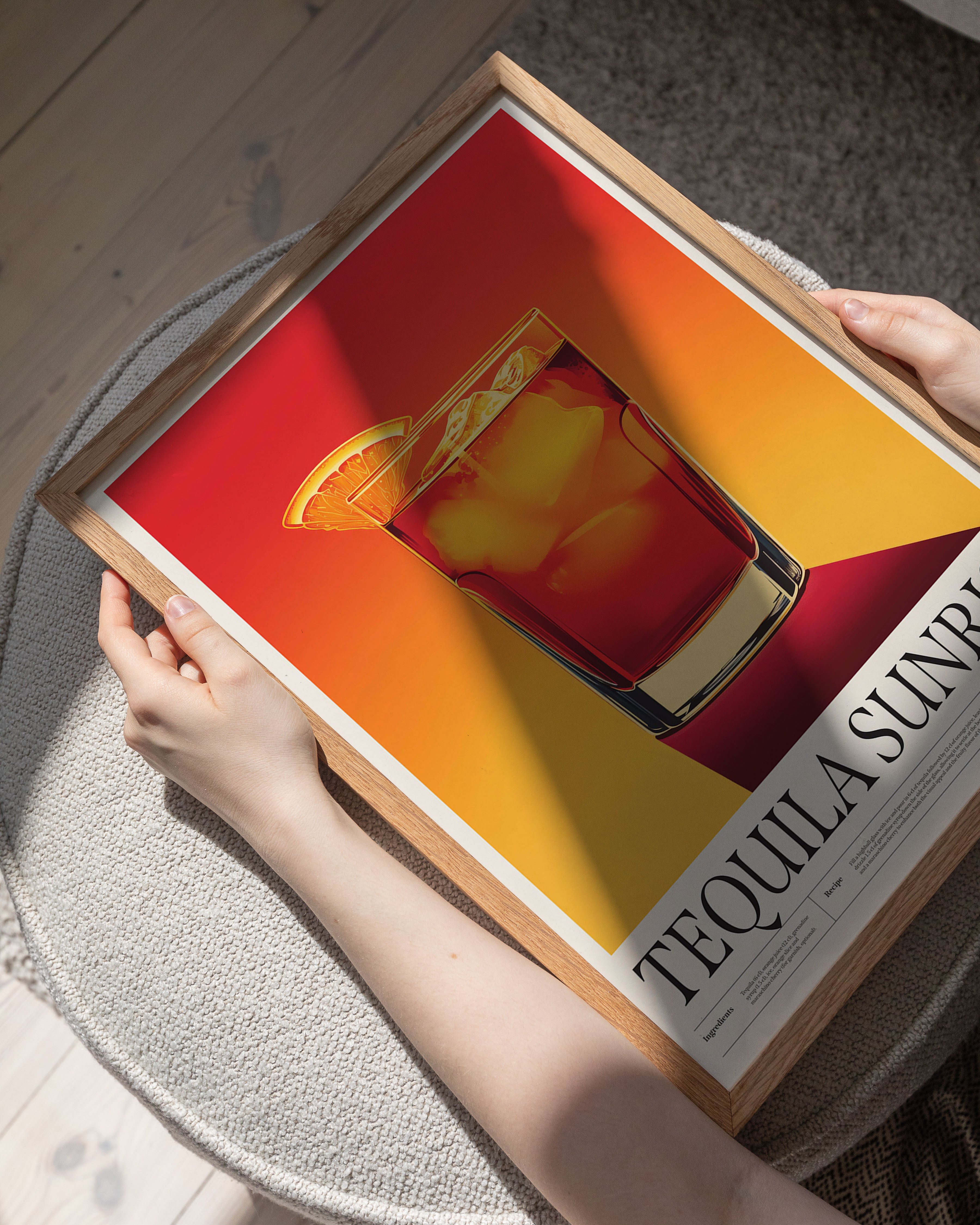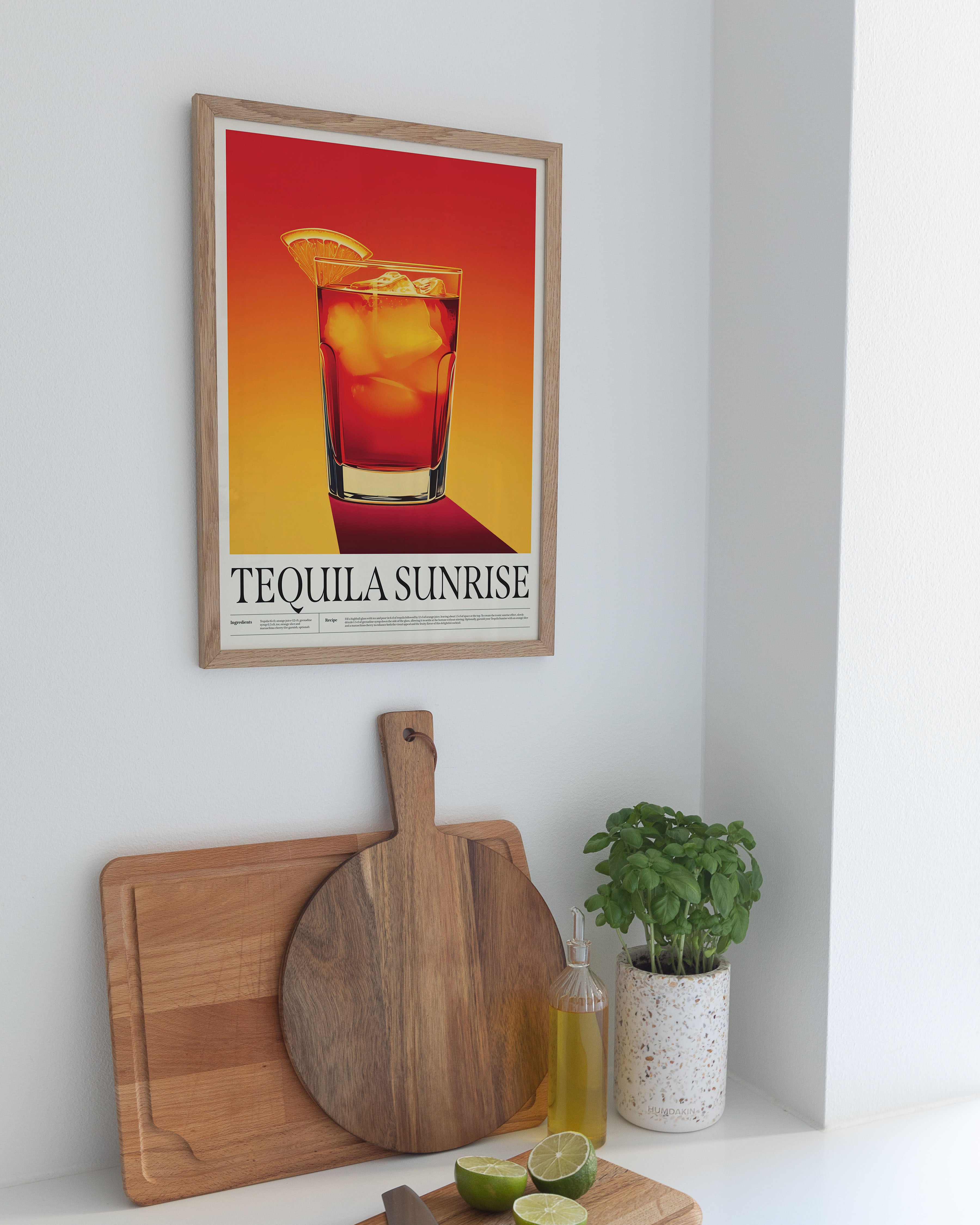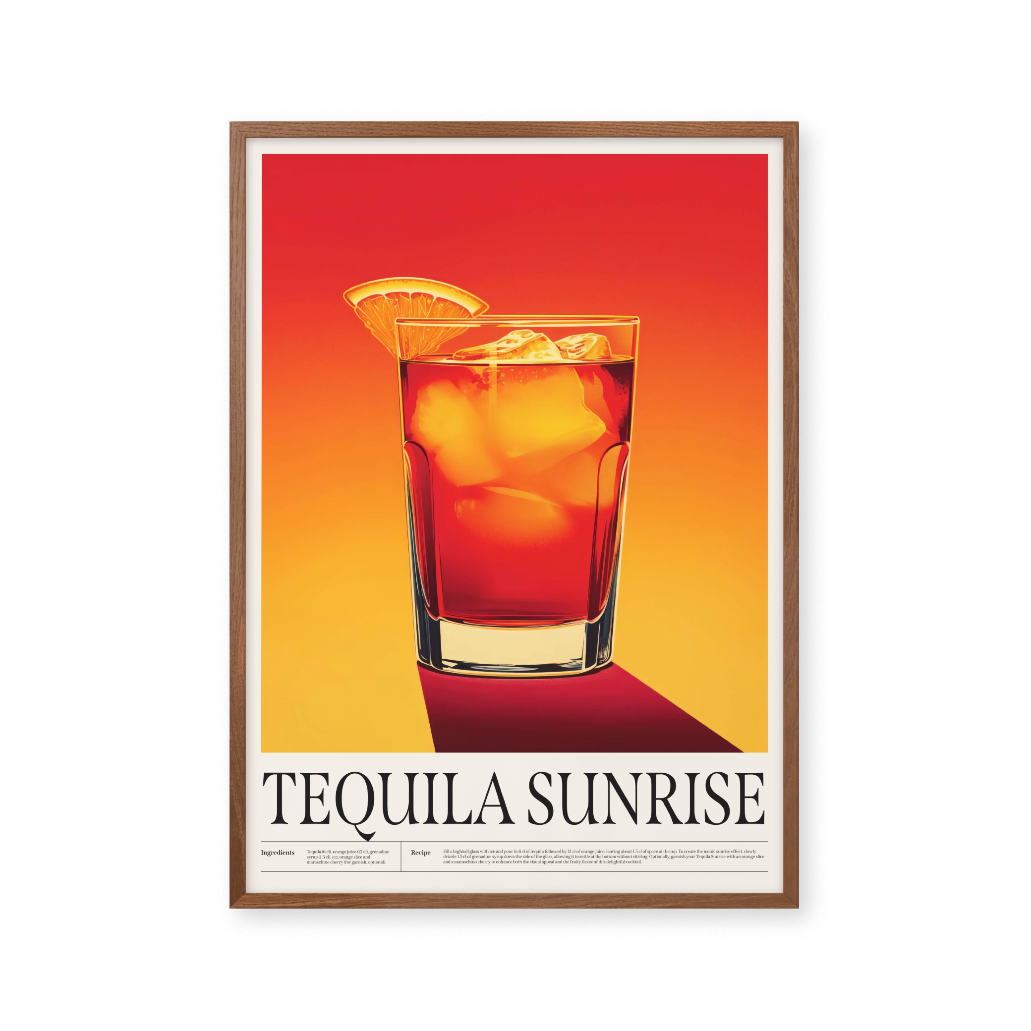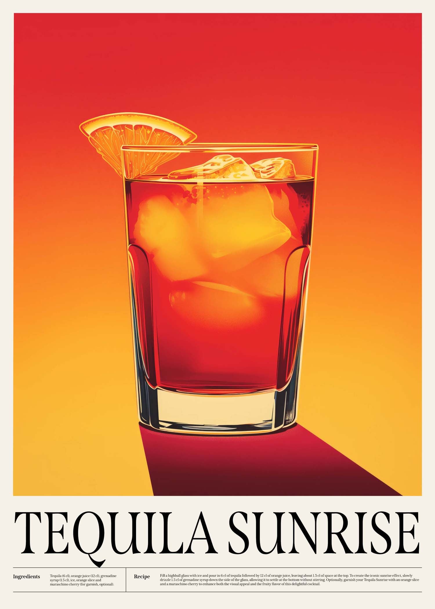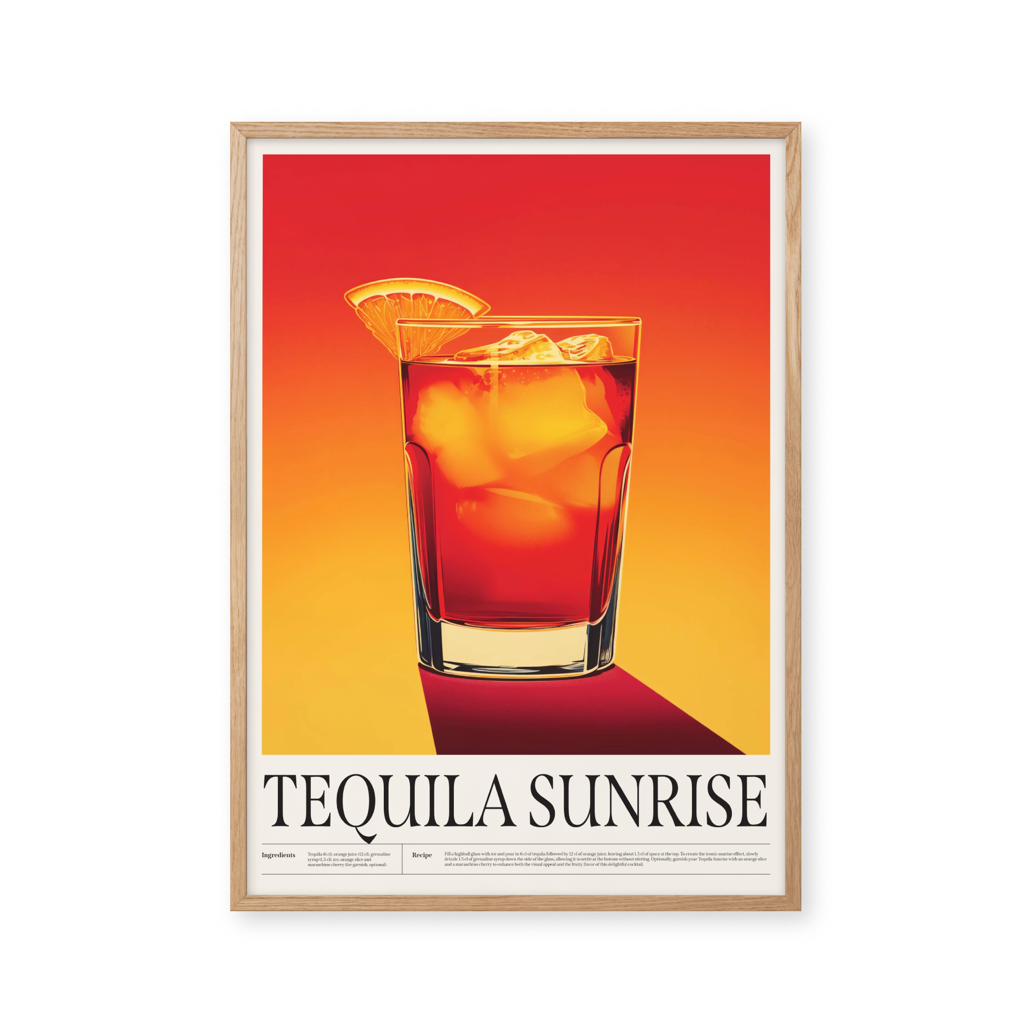 Oplev "Tequila Sunrise" plakaten, hvor varme røde og gyldne nuancer fanger essensen af en perfekt blanding. Denne vægkunst tilføjer et strejf af livlig elegance til ethvert rum, og fejrer den ikoniske cocktail med en visuel flair, der vækker sanserne. Ideal til mixologi-entusiaster og farveelskere.