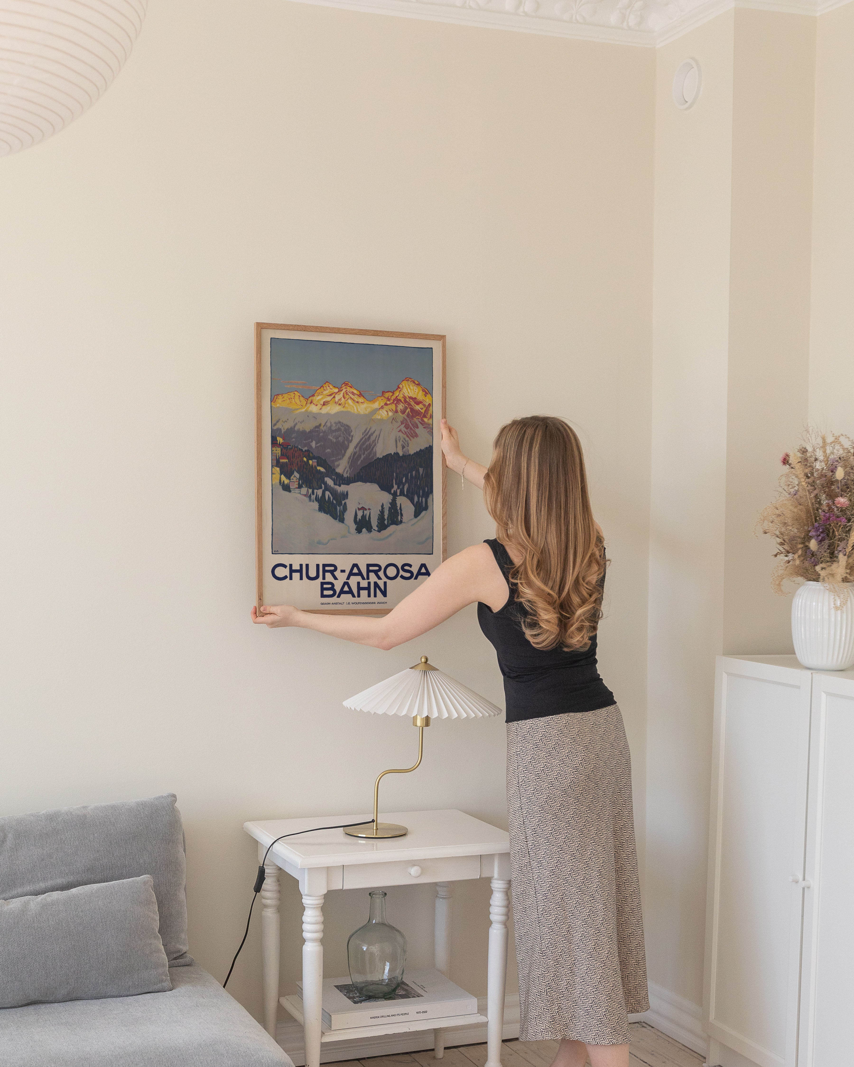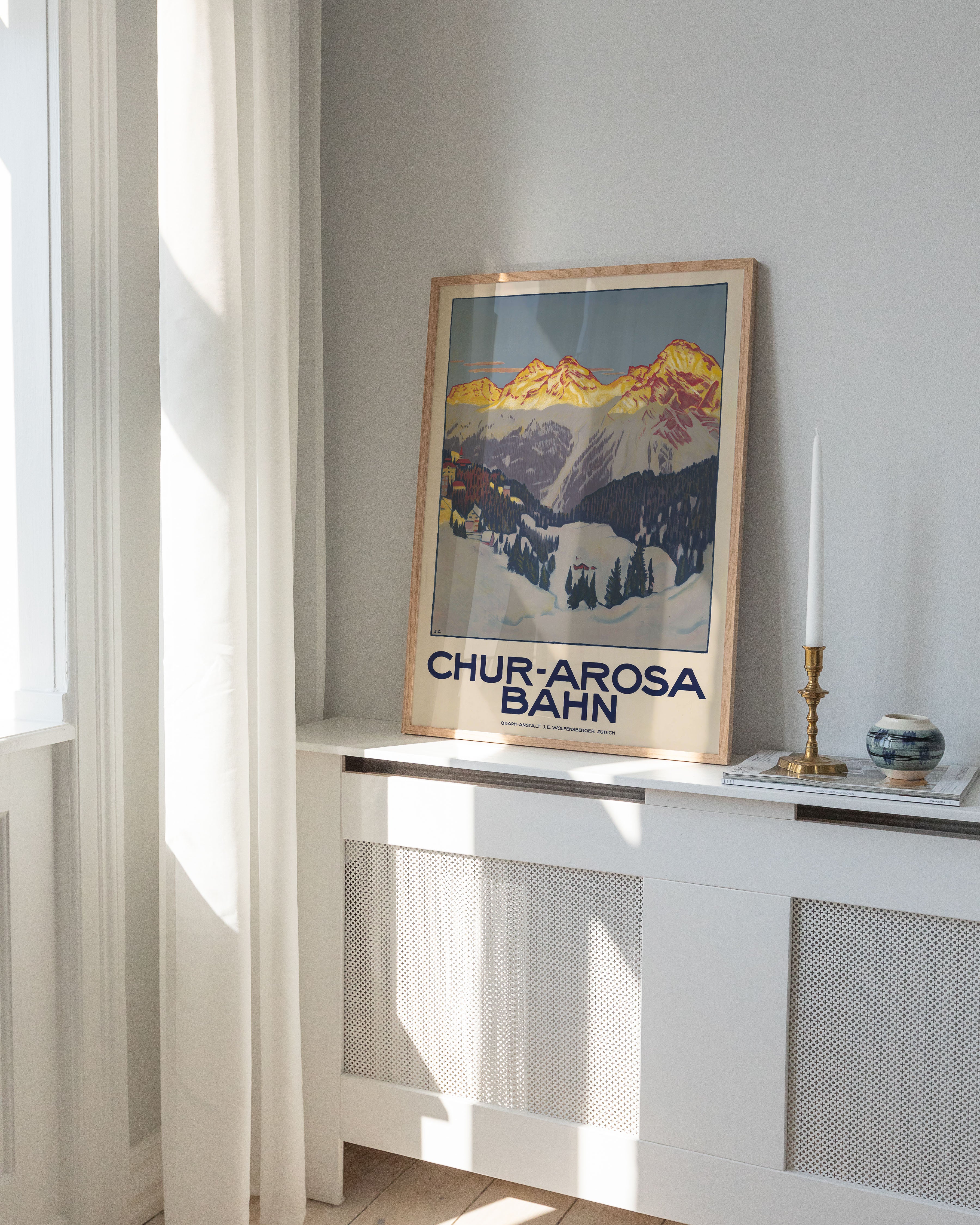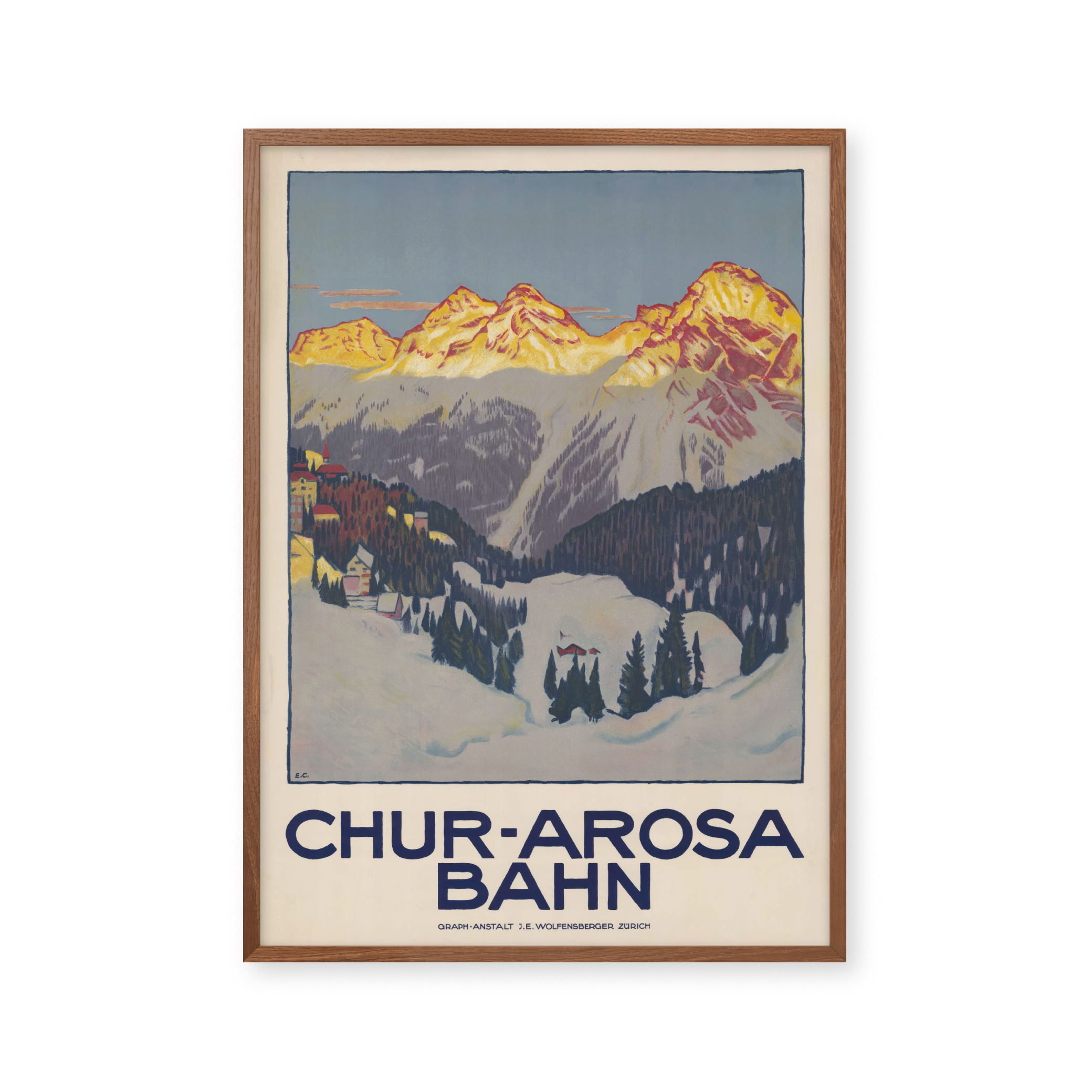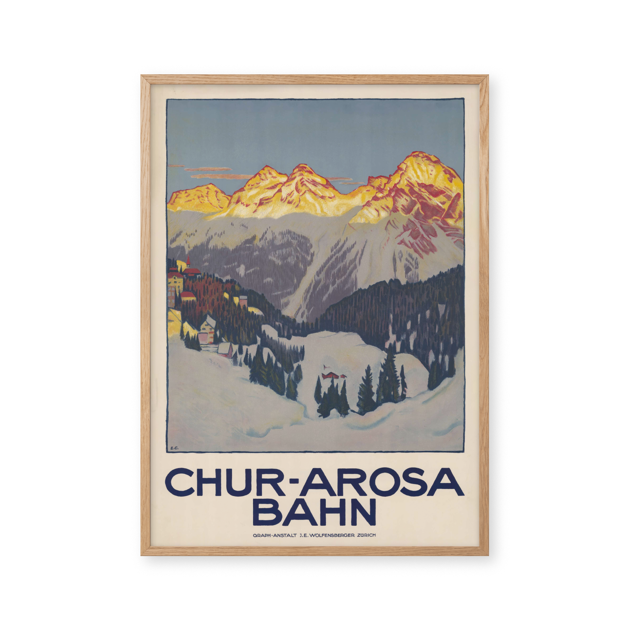 "Alpine Eventyr" plakaten indfanger essensen af bjergenes majestæt med sine levende farver og nostalgiske charme. Perfekt til at tilføje et strejf af vintage elegance til dit rum, denne plakat fremhæver de gyldne solnedgangstoner og den fredfyldte atmosfære i Alperne. Ideal til naturelskere og eventyrlystne sjæle.
