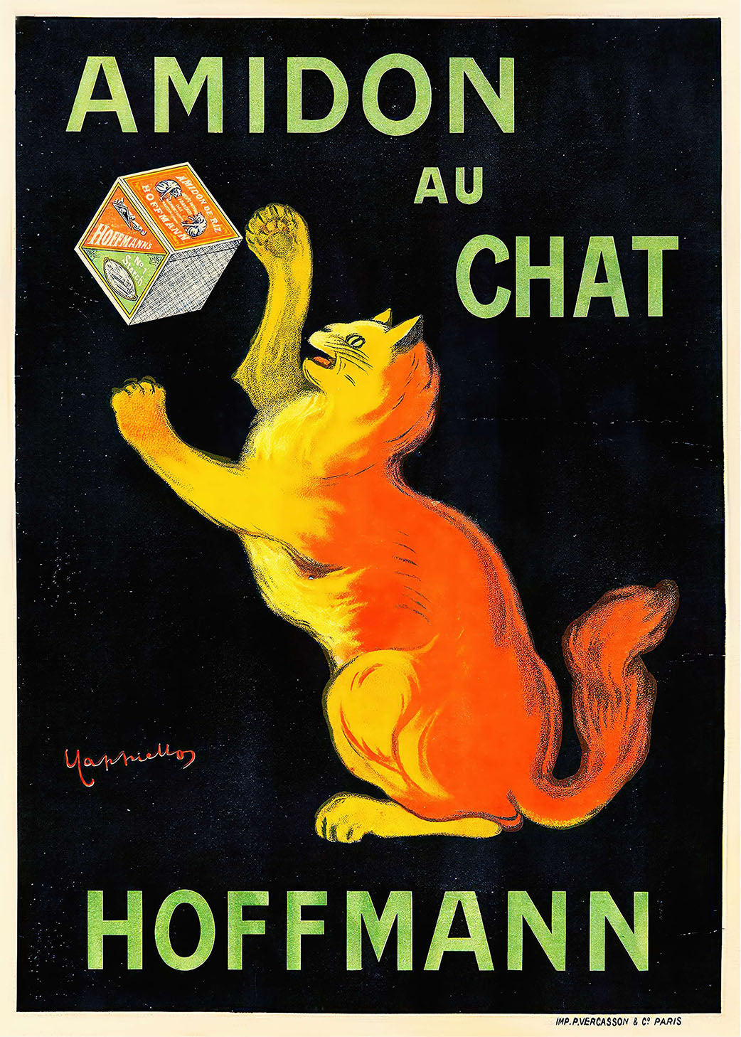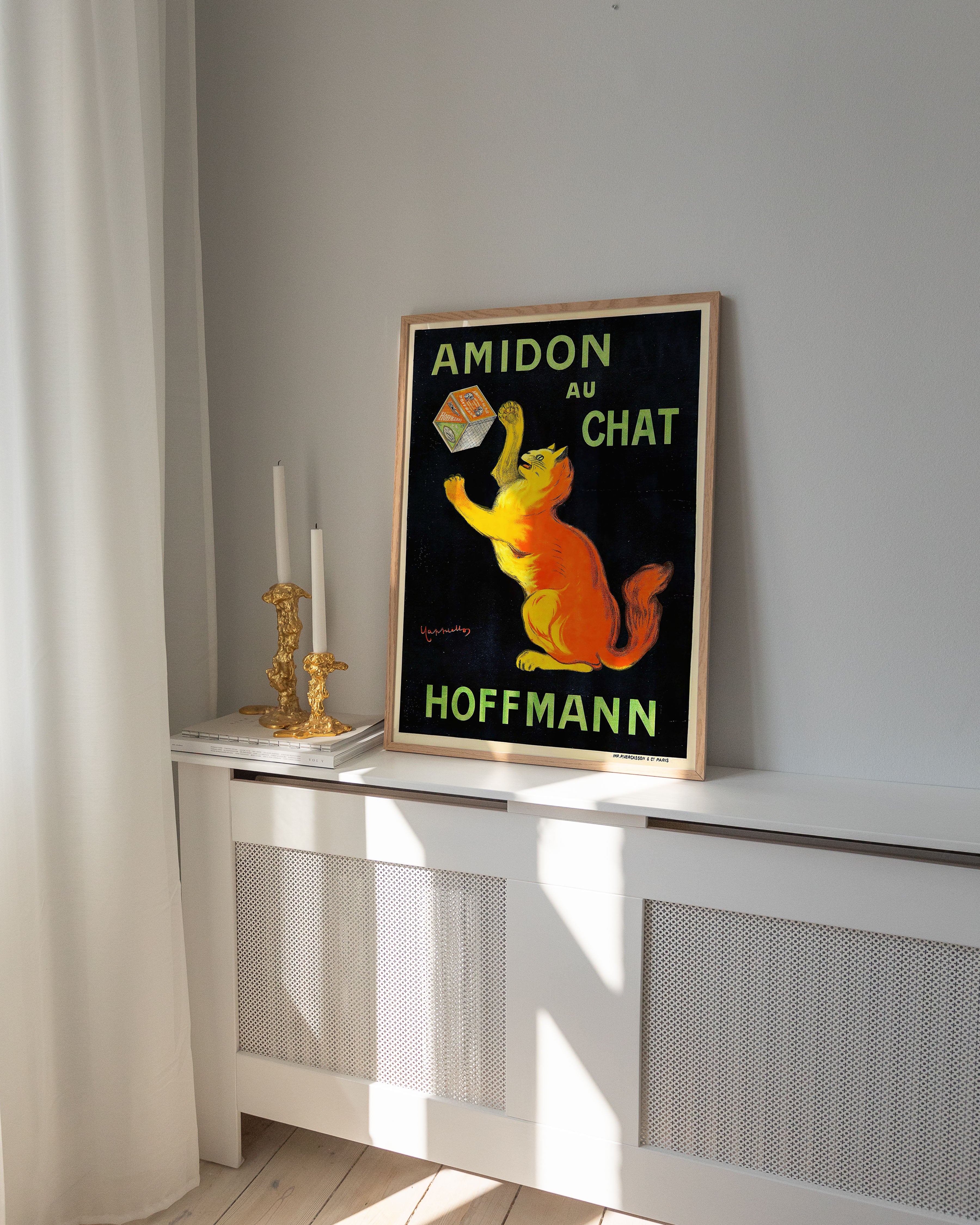 "Amidon Au Chat" plakat: En livlig og farverig illustration af en legende kat, der fanger opmærksomheden med sine strålende orange og gule nuancer. Perfekt til at tilføje et unikt og kunstnerisk touch til ethvert rum. Ideel til katteelskere og kunstentusiaster.