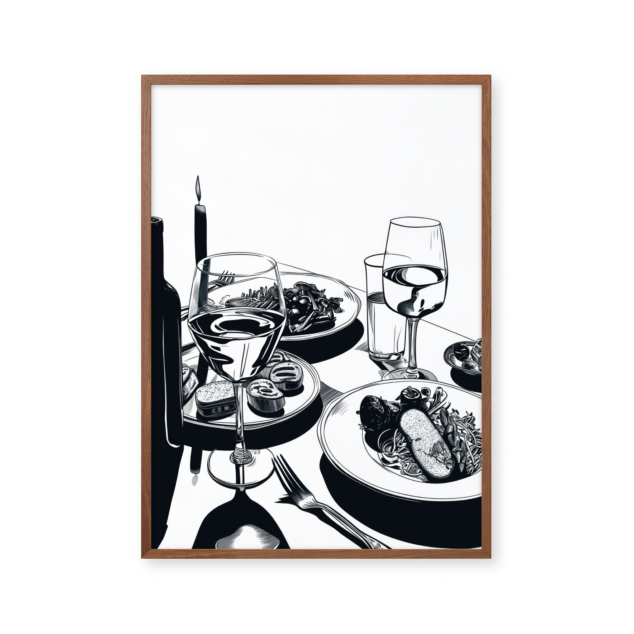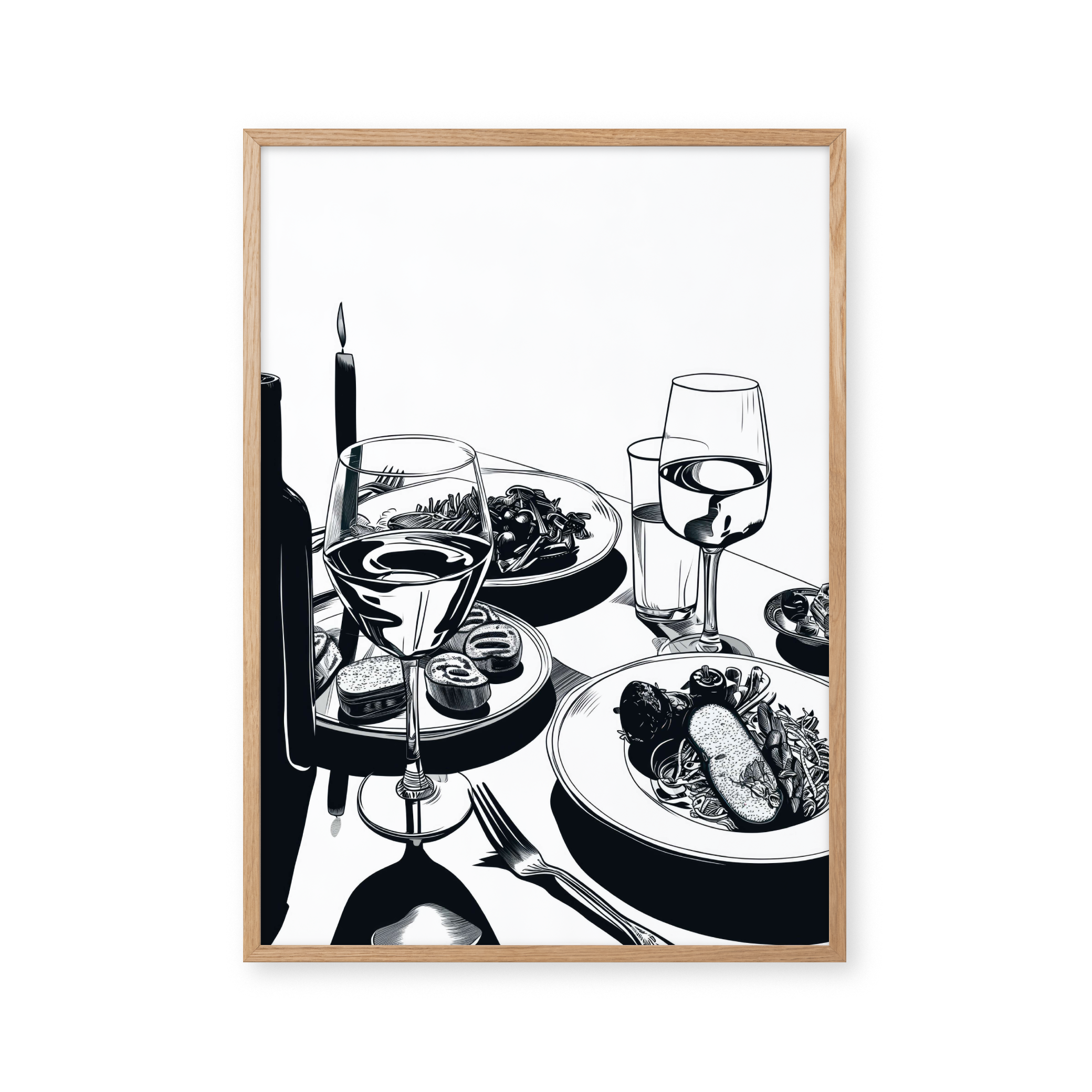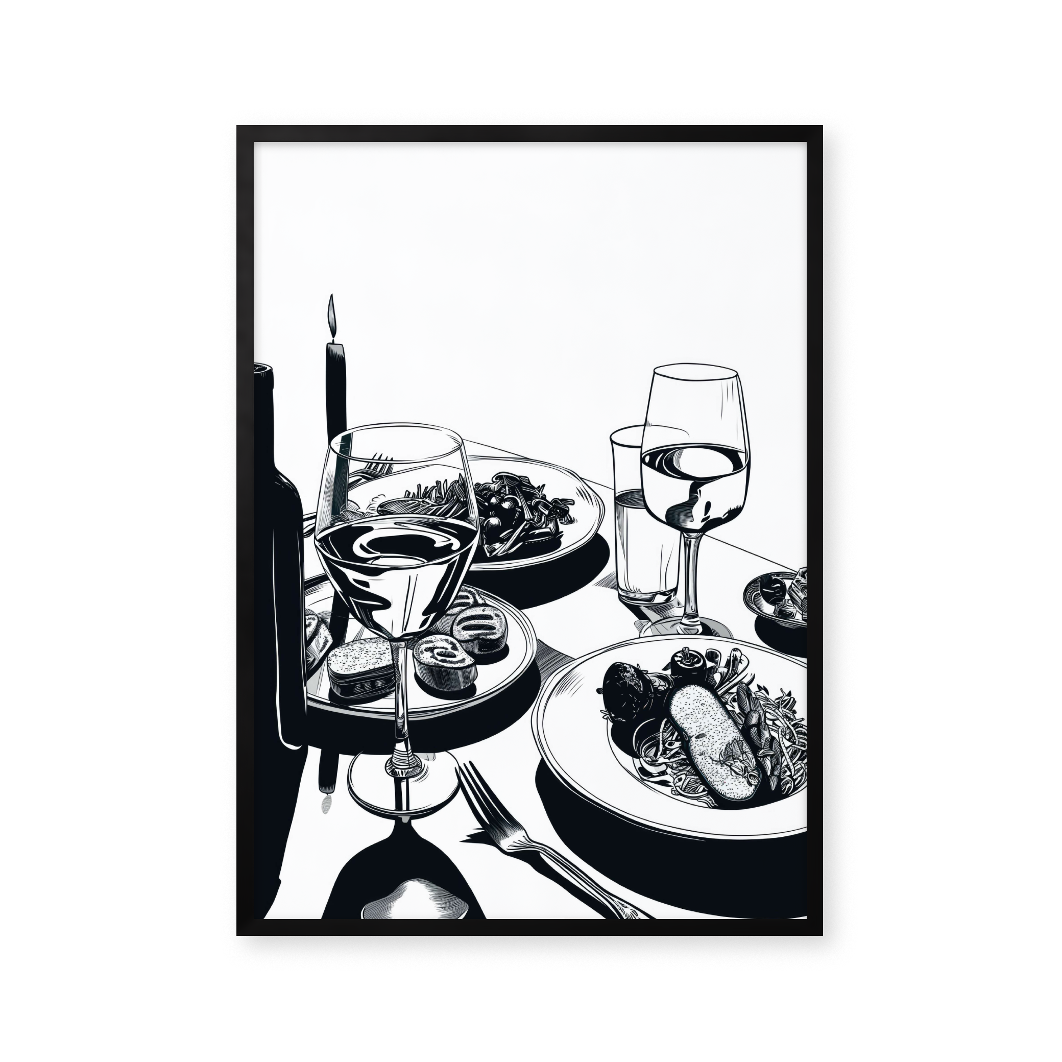 "An Evening in Monochrome" plakaten fanger essensen af elegance med sit sort-hvide farvespil. Perfekt til dem, der værdsætter minimalistisk kunst og fine dining, denne plakat tilføjer et sofistikeret touch til enhver væg. Oplev den tidløse skønhed i hver detalje. Ideal til moderne interiører.