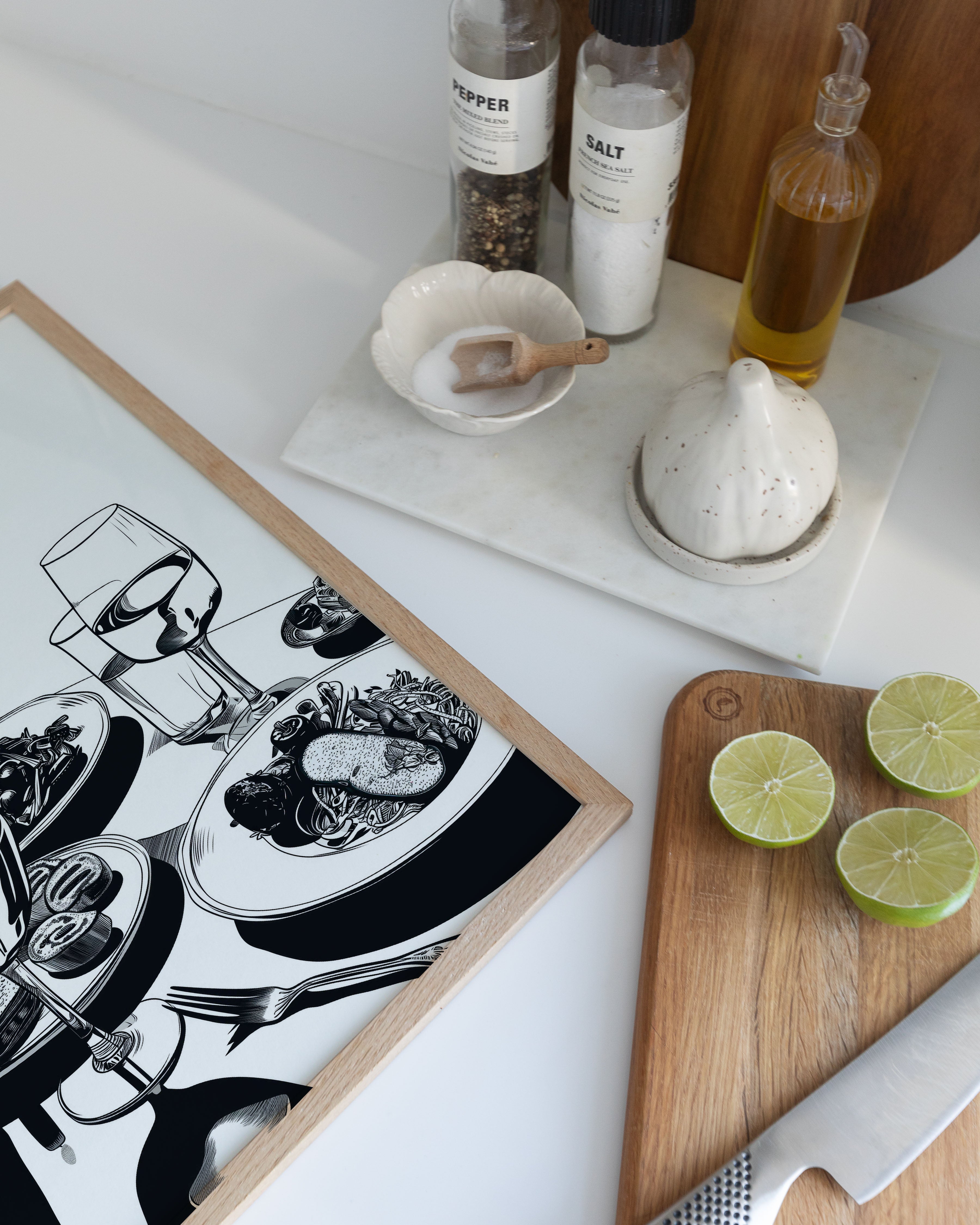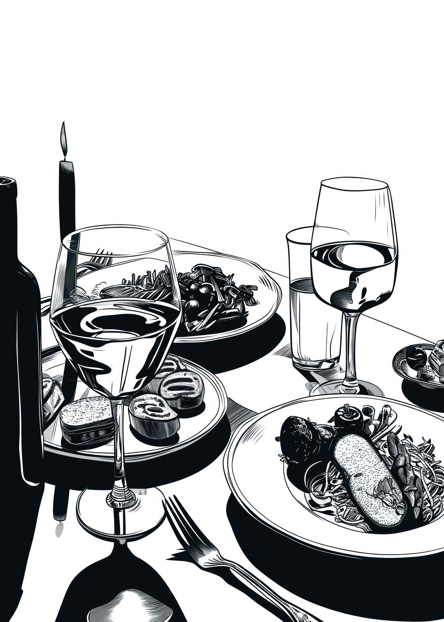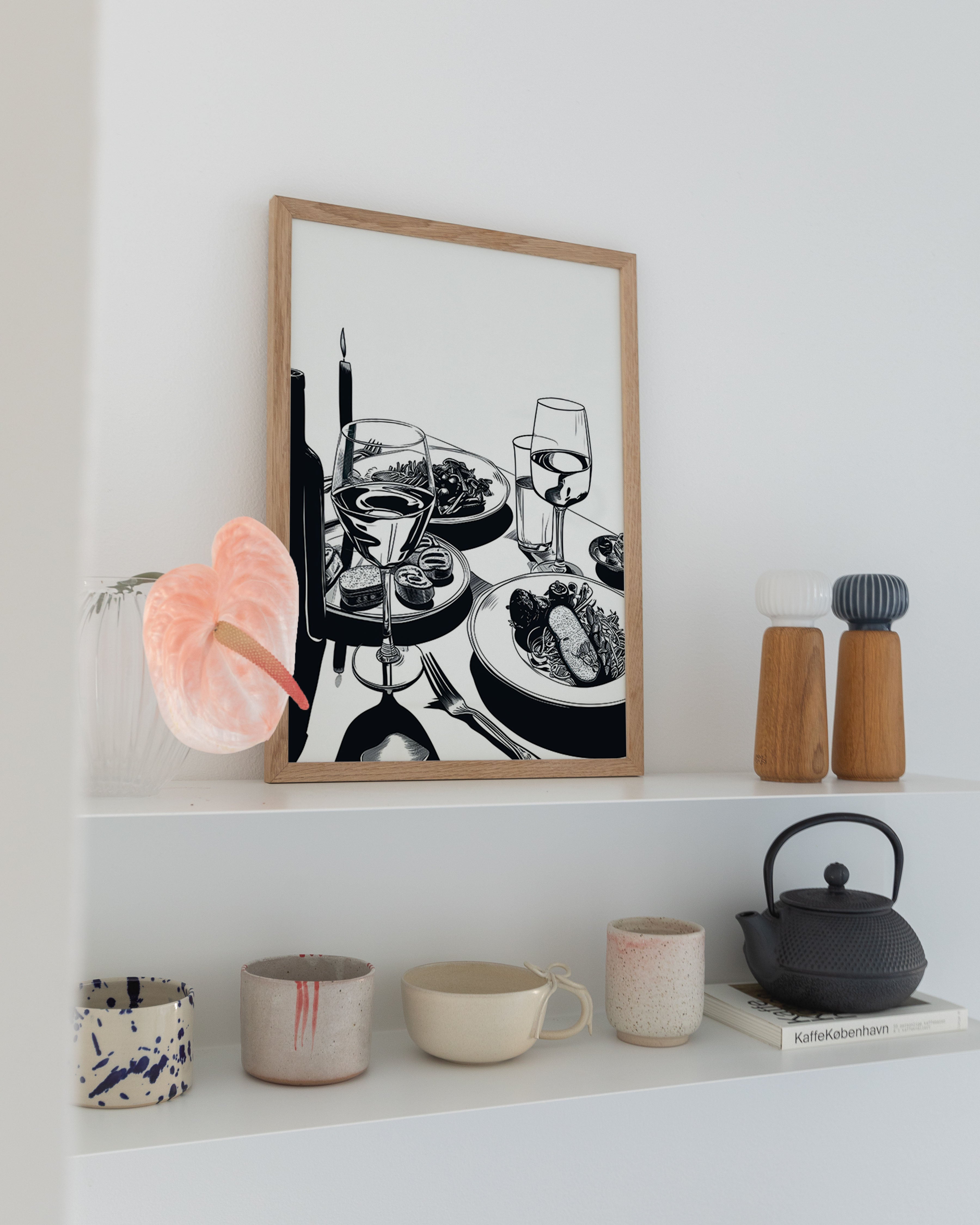 "An Evening in Monochrome" plakaten fanger essensen af elegance med sit sort-hvide farvespil. Perfekt til dem, der værdsætter minimalistisk kunst og fine dining, denne plakat tilføjer et sofistikeret touch til enhver væg. Oplev den tidløse skønhed i hver detalje. Ideal til moderne interiører.