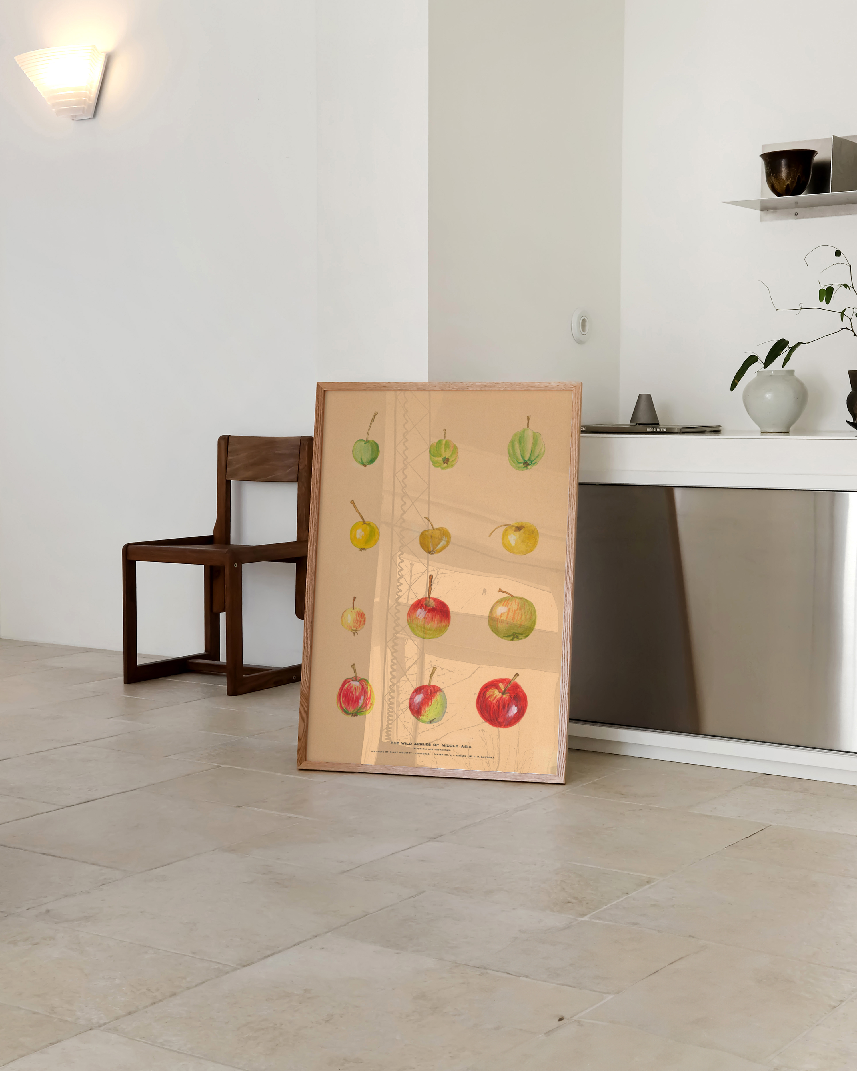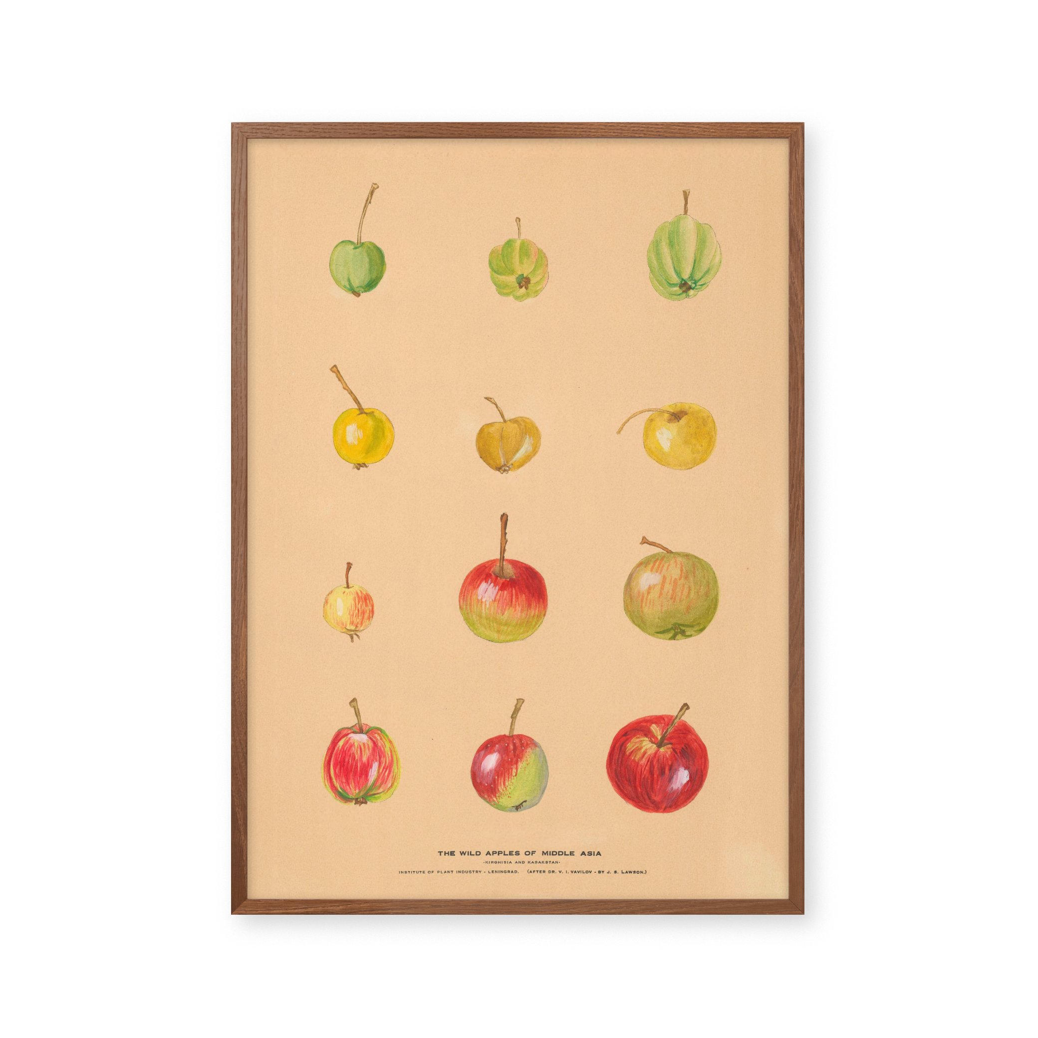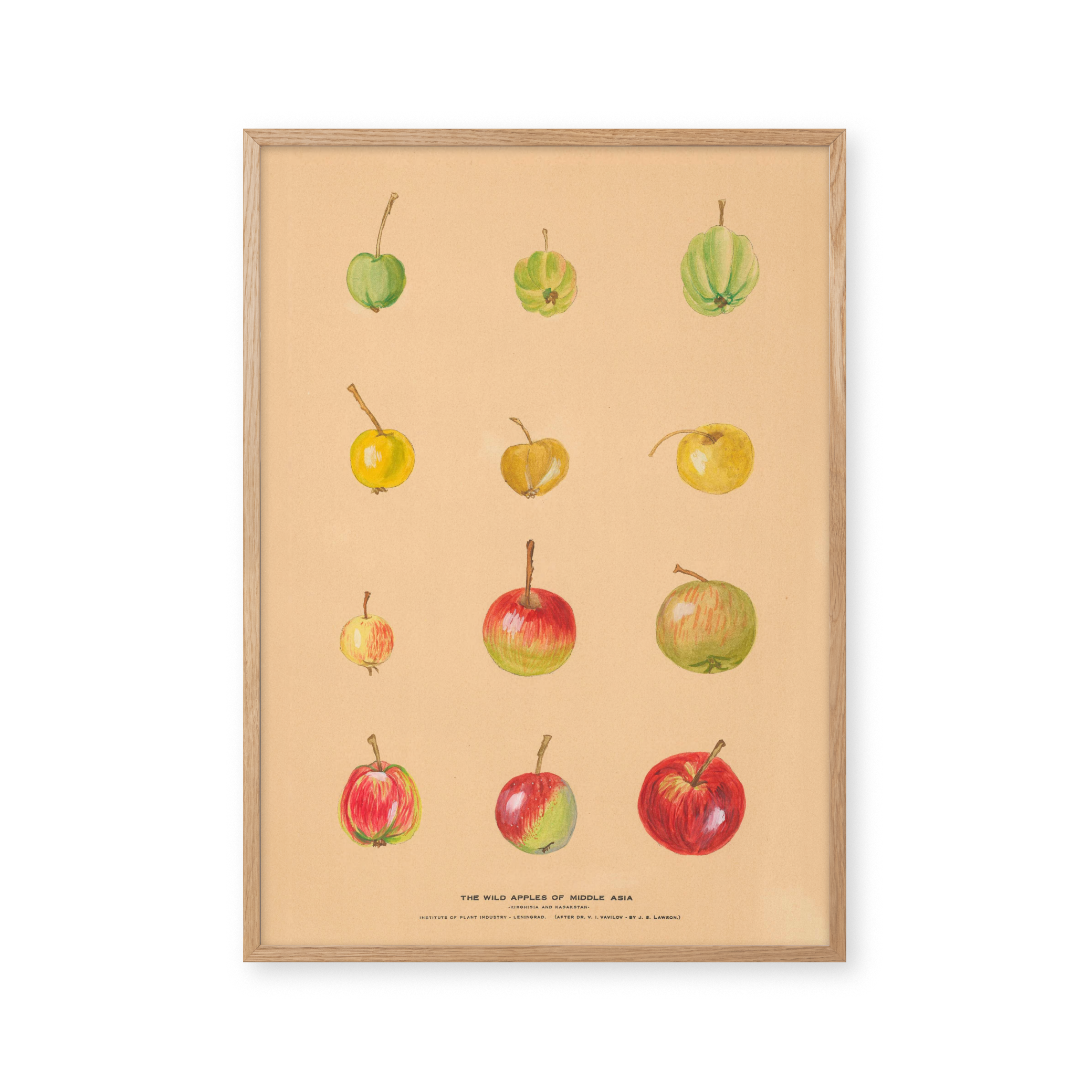 Opdag "Apples of Middle Asia" plakaten, en visuel fest af naturtro æbleillustrationer. Hver frugt er fanget i levende farver, fra smaragdgrøn til solmoden rød, arrangeret på en varm beige baggrund. Perfekt til køkkenet eller stuen, denne plakat tilføjer et strejf af naturens skønhed til dit hjem.