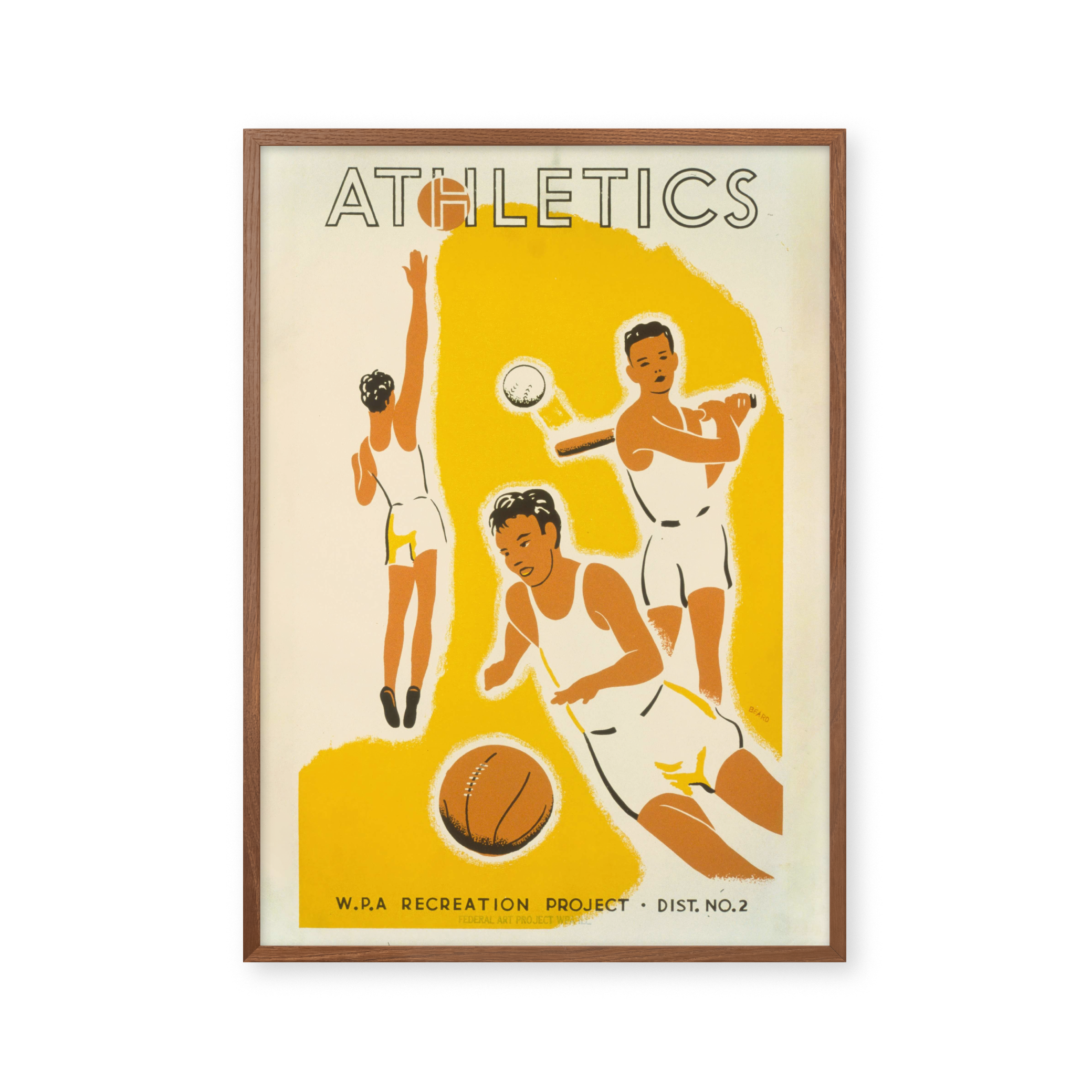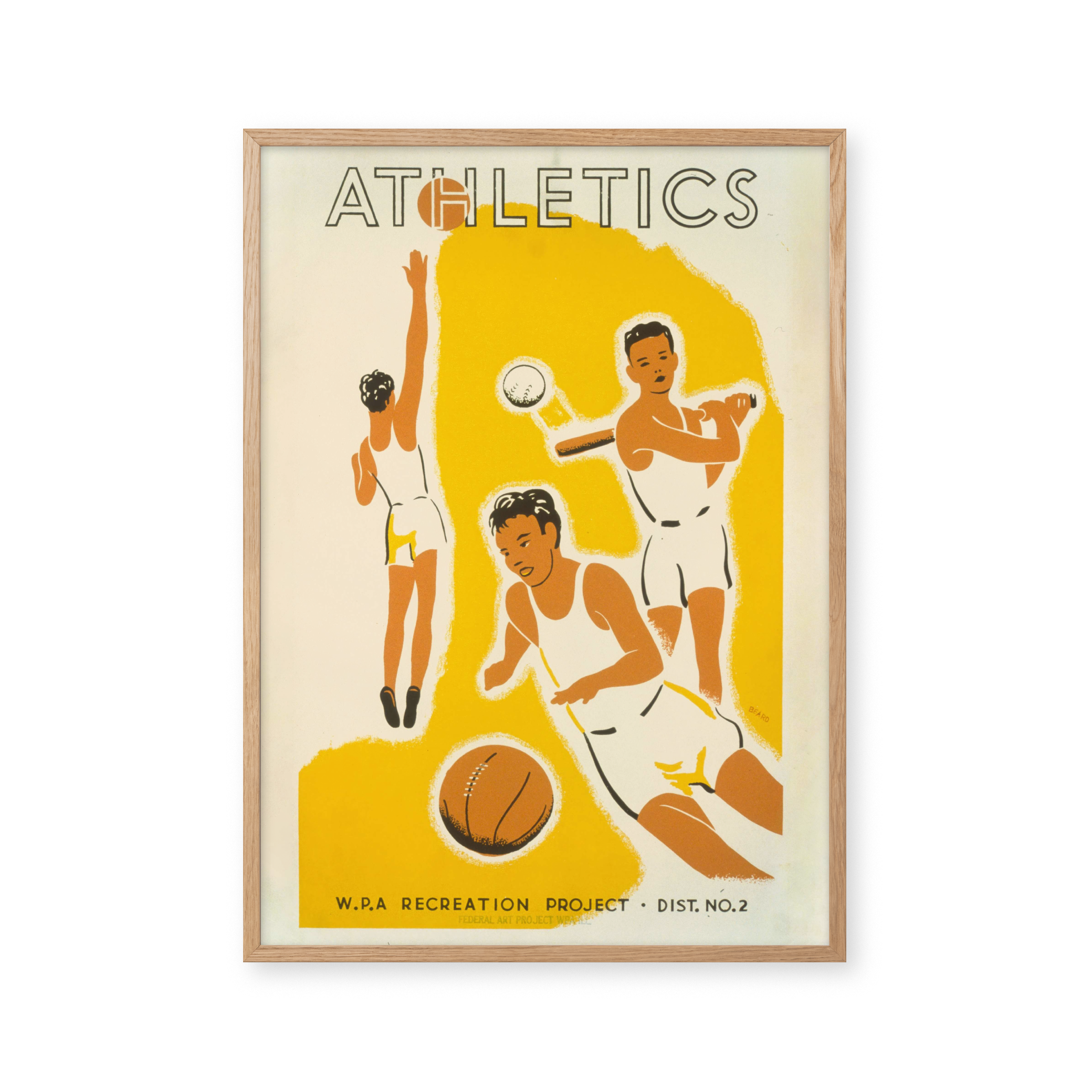 Opdag "Athletics no 2" – en dynamisk plakat, der fanger essensen af sportens verden. Levende gule nuancer og stiliserede atleter fremhæver bevægelse og energi, perfekt til enhver sportsentusiast. Et must-have til at tilføre dit rum en dosis af vintage flair og atletisk inspiration.