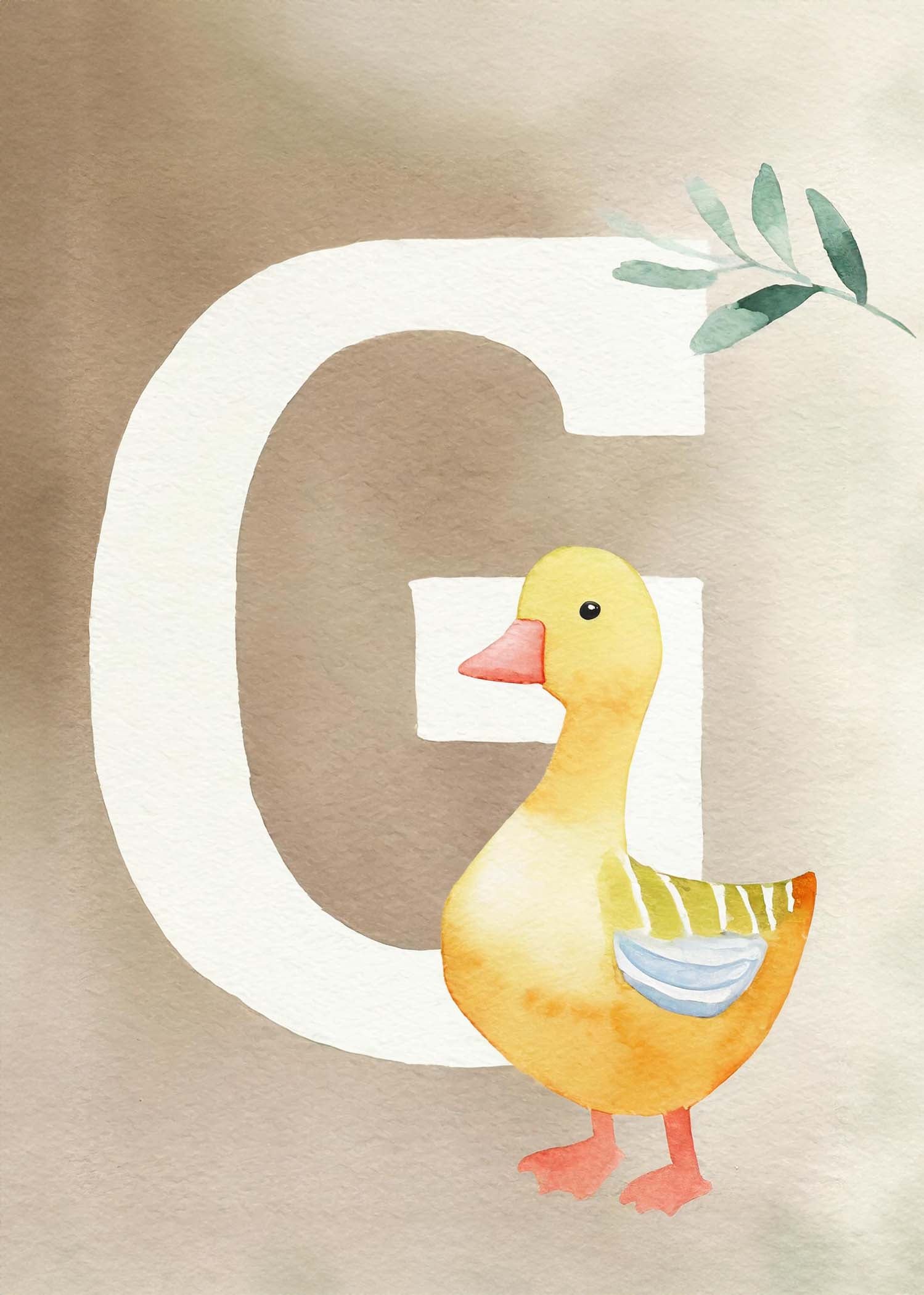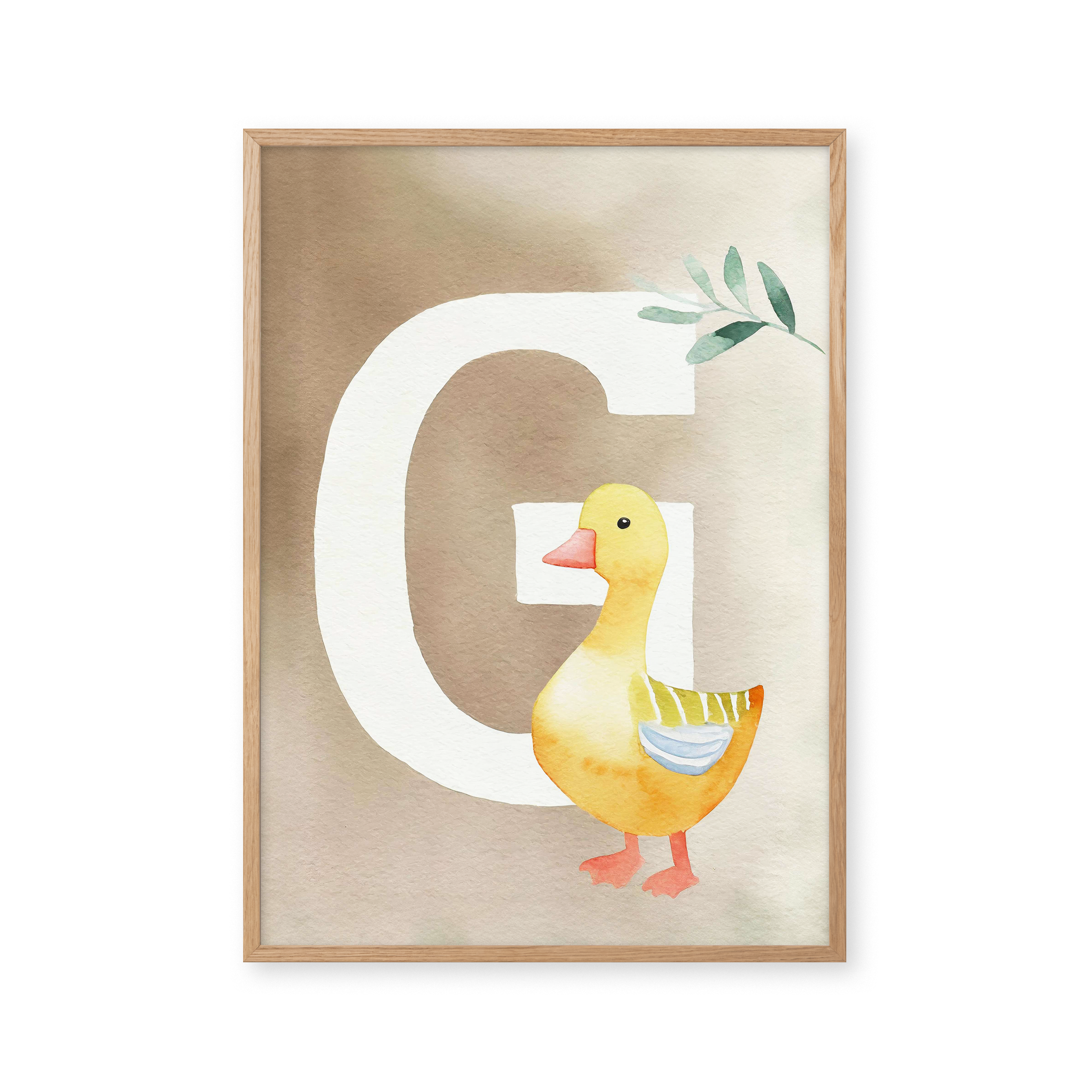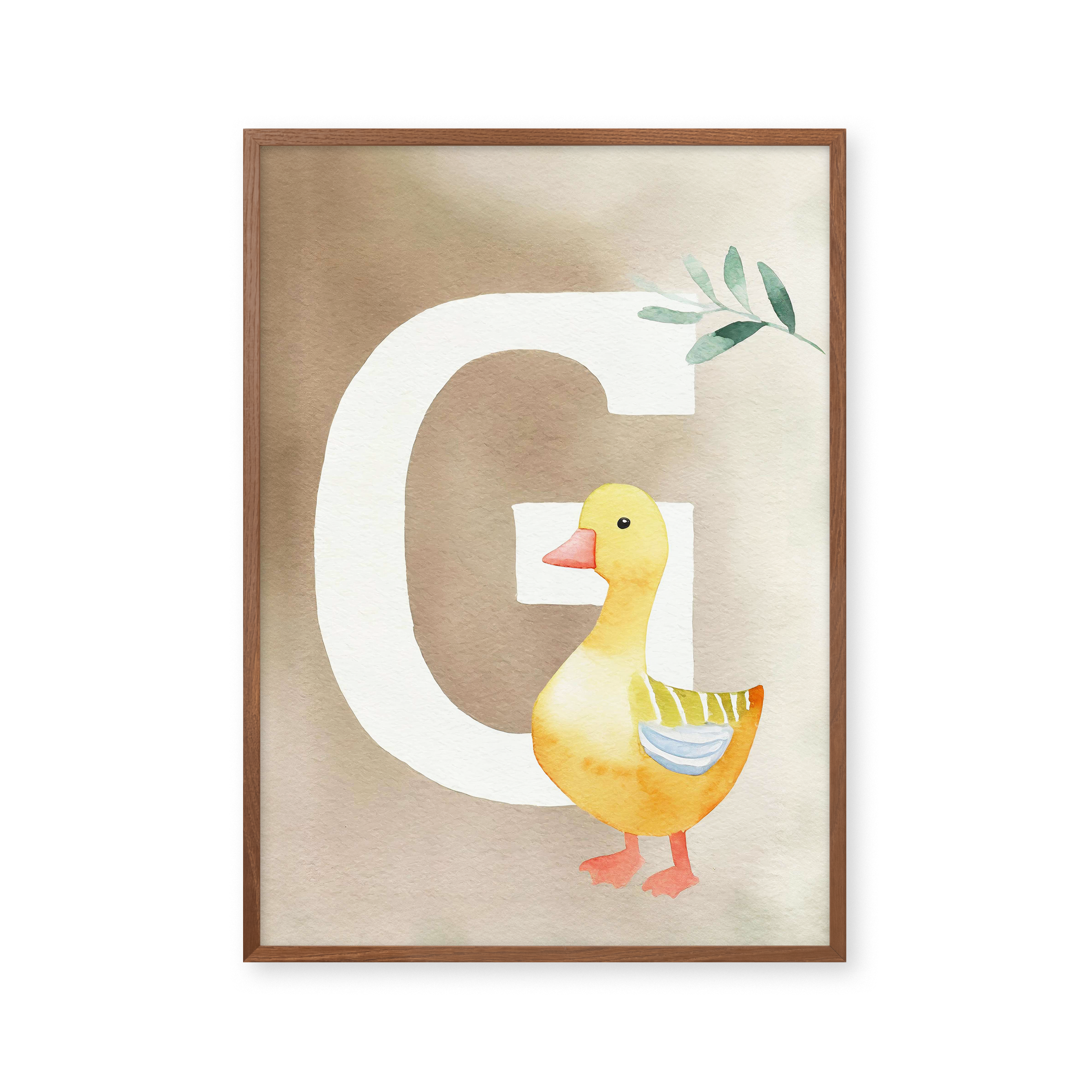 "Bogstavsplakat - G for gås" - Berig børneværelset med denne charmerende plakat, hvor et livligt, gulbrunt gåsemotiv bringer alfabetet til live. Perfekt til læring og leg, med en varm farvepalet, der tilføjer hygge og kreativitet til enhver væg. Ideal til den lille naturforsker!