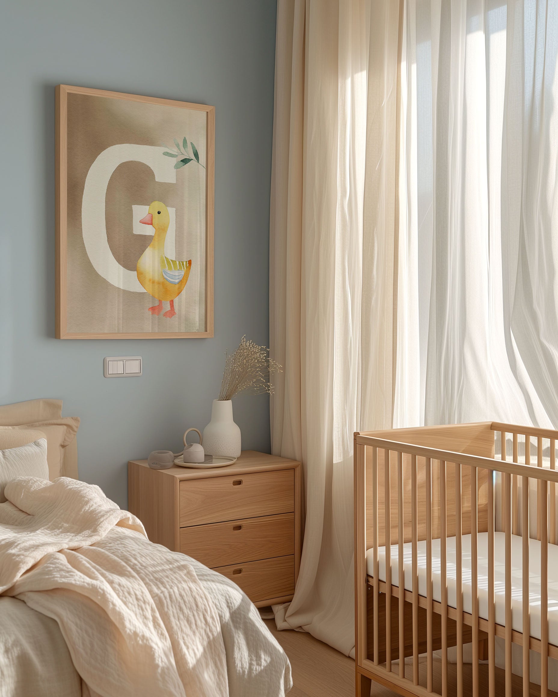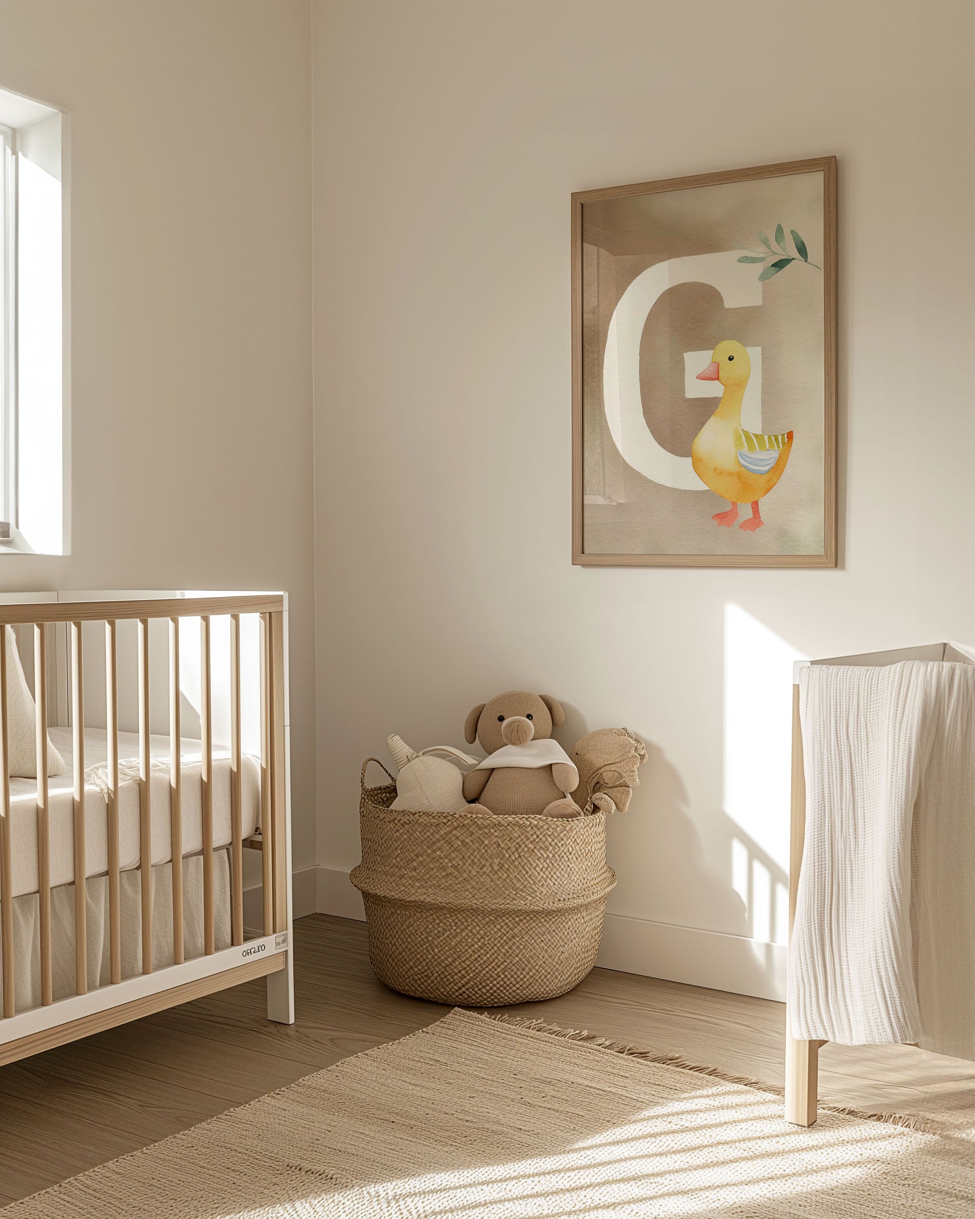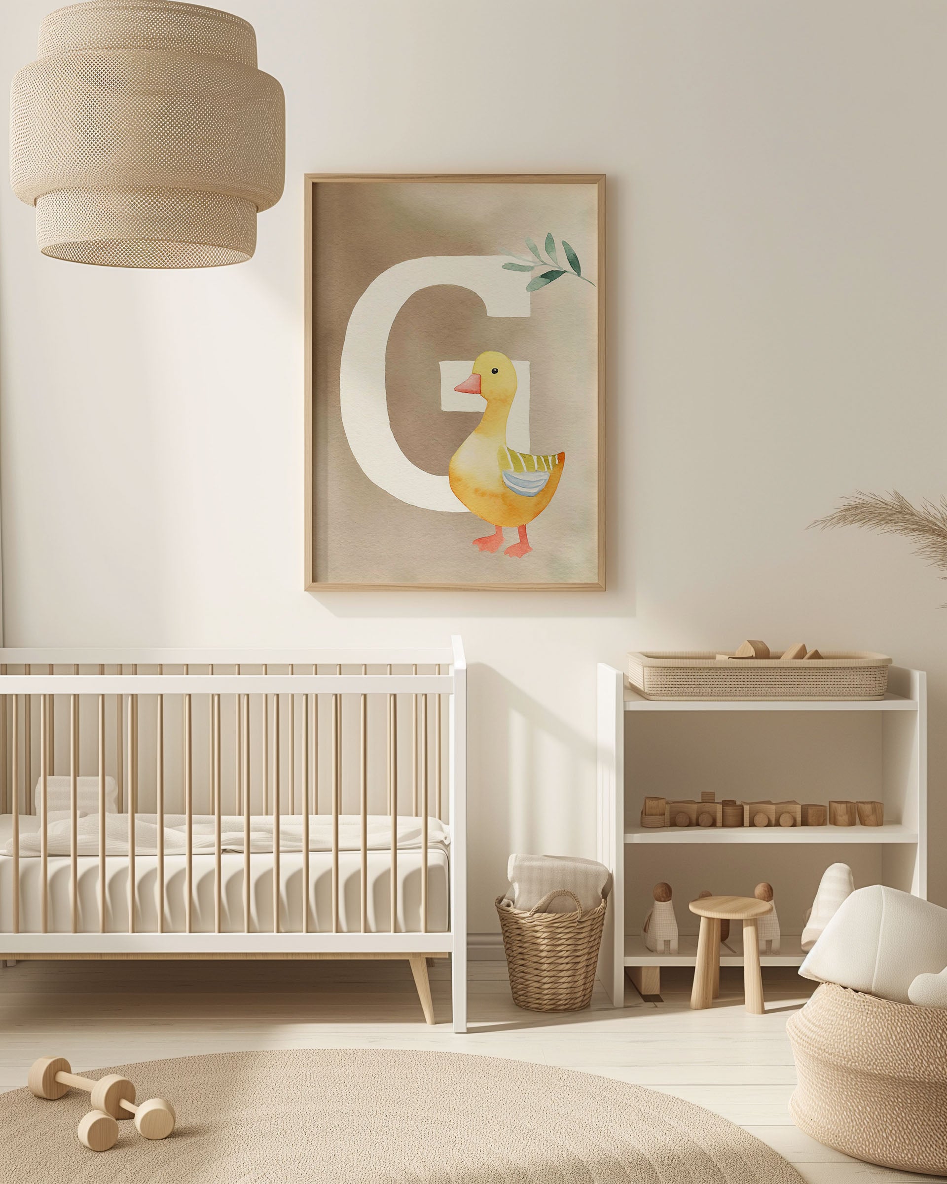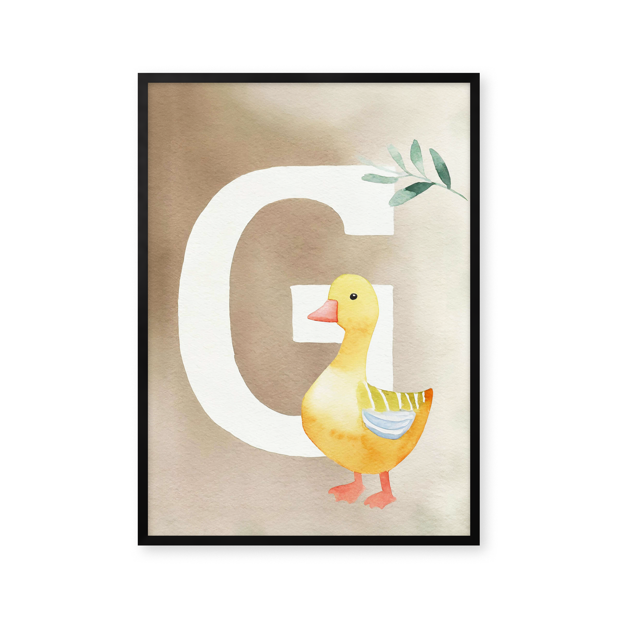 "Bogstavsplakat - G for gås" - Berig børneværelset med denne charmerende plakat, hvor et livligt, gulbrunt gåsemotiv bringer alfabetet til live. Perfekt til læring og leg, med en varm farvepalet, der tilføjer hygge og kreativitet til enhver væg. Ideal til den lille naturforsker!