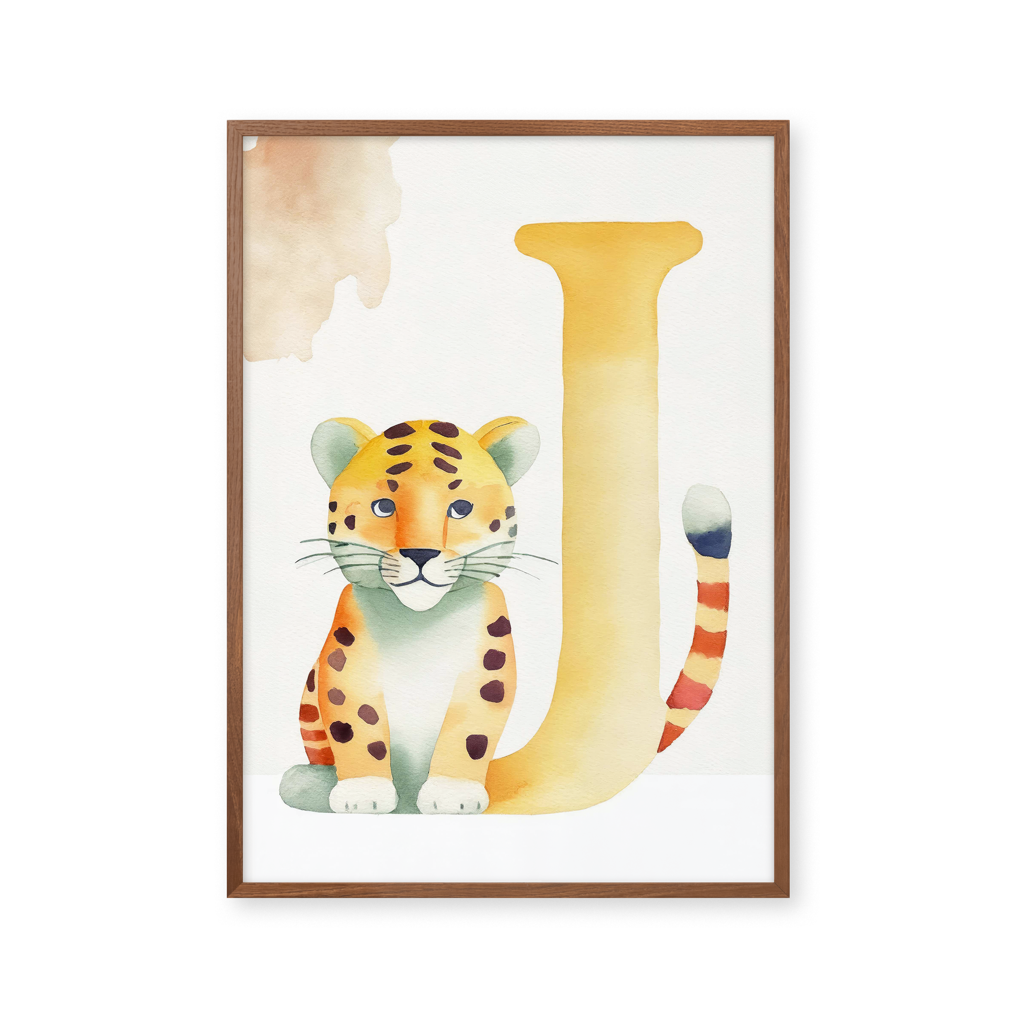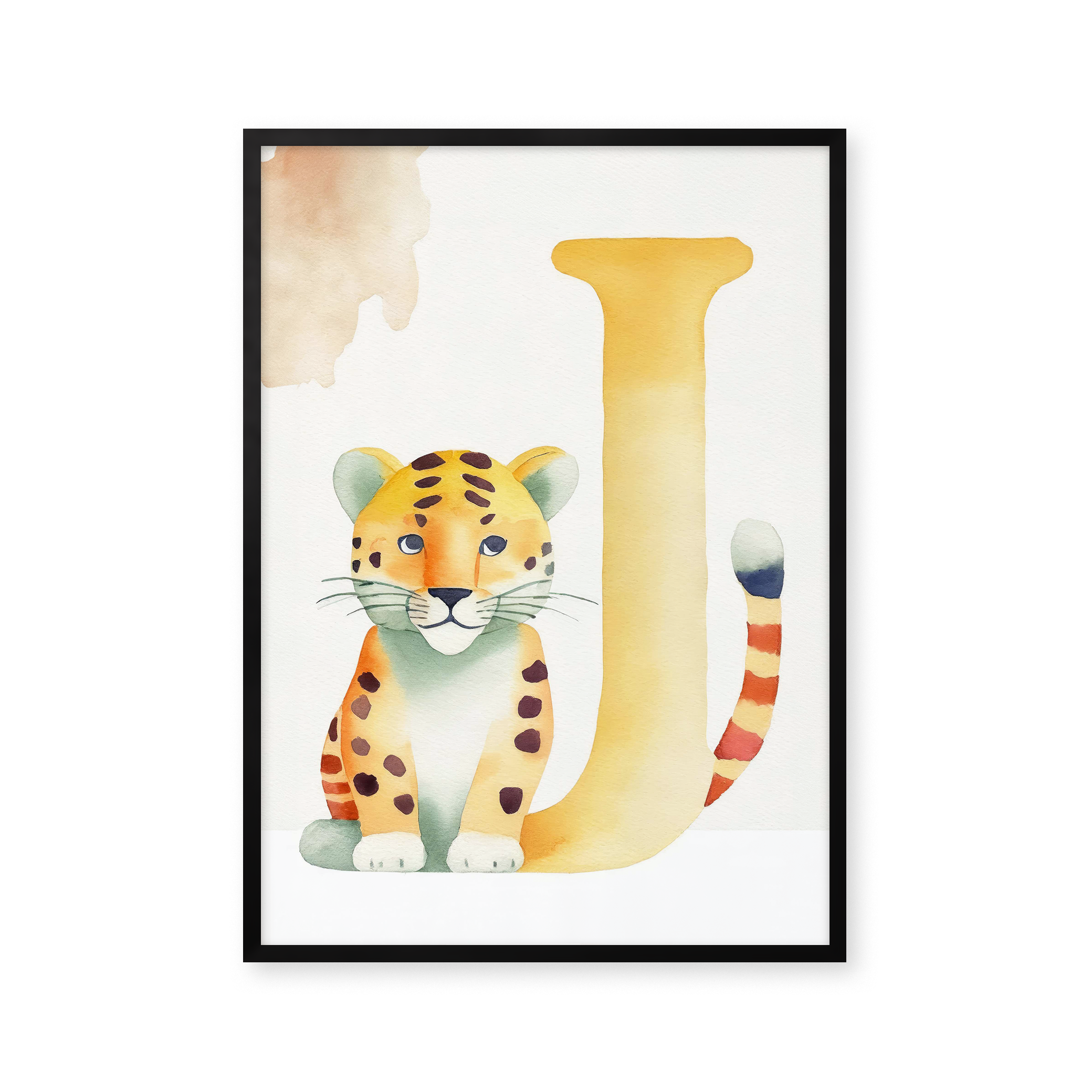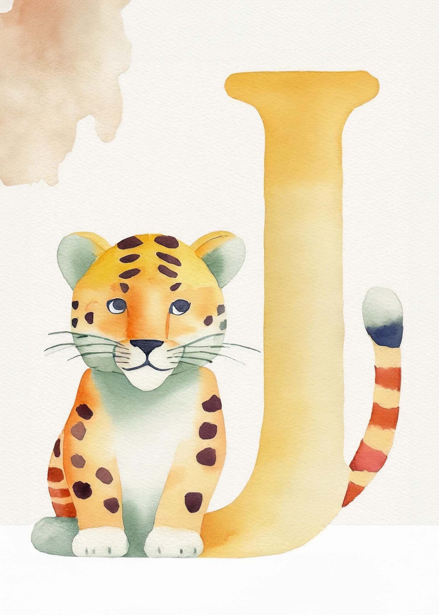 Opdag "Bogstavsplakat - J for jaguar", en charmerende tilføjelse til ethvert rum. Denne plakat fanger blikket med sin varme farvepalet og livlige illustration af en jaguar, perfekt til børneværelset eller som en pædagogisk dekoration. Levende, legende og lærerig – en ægte samtalestarter!