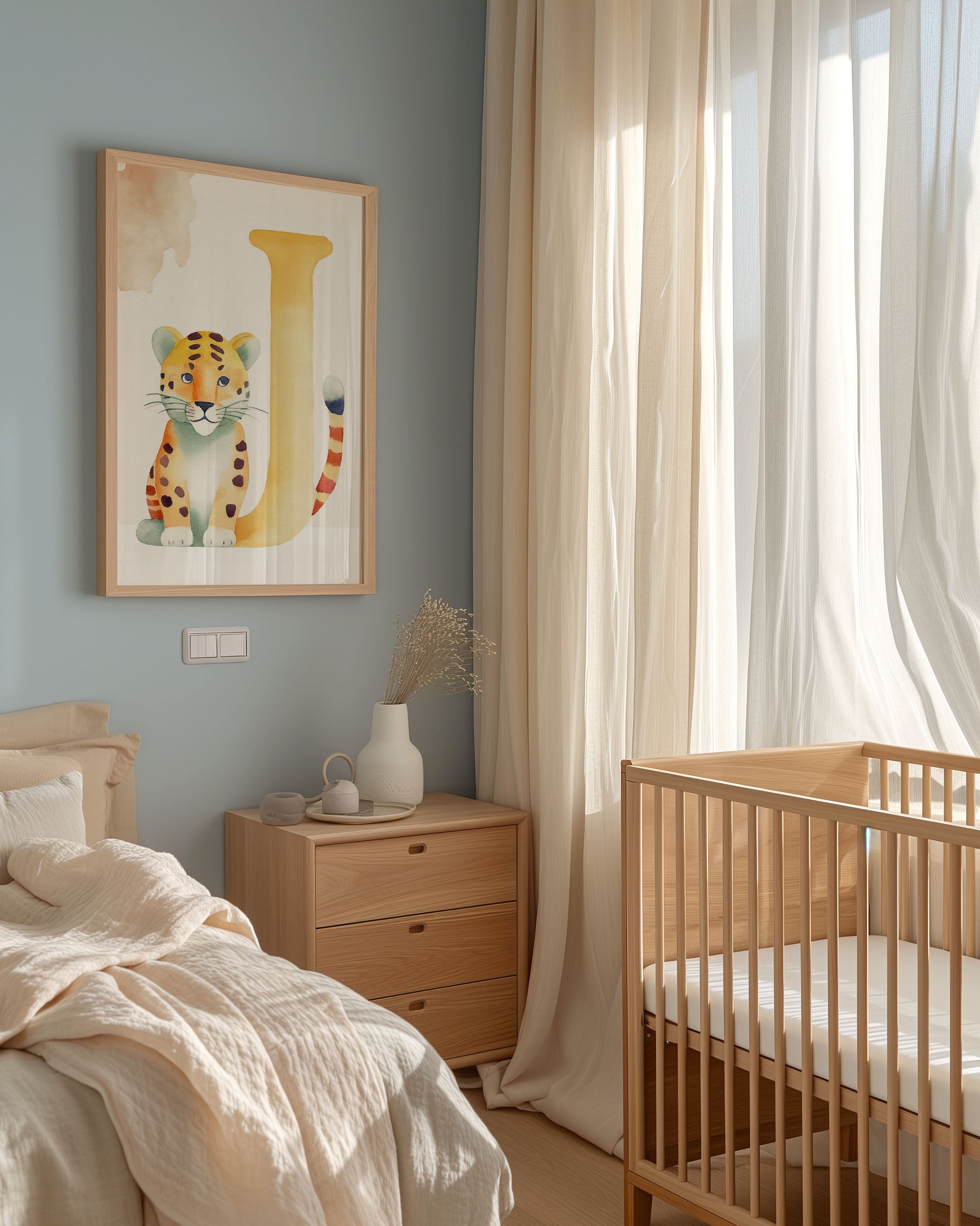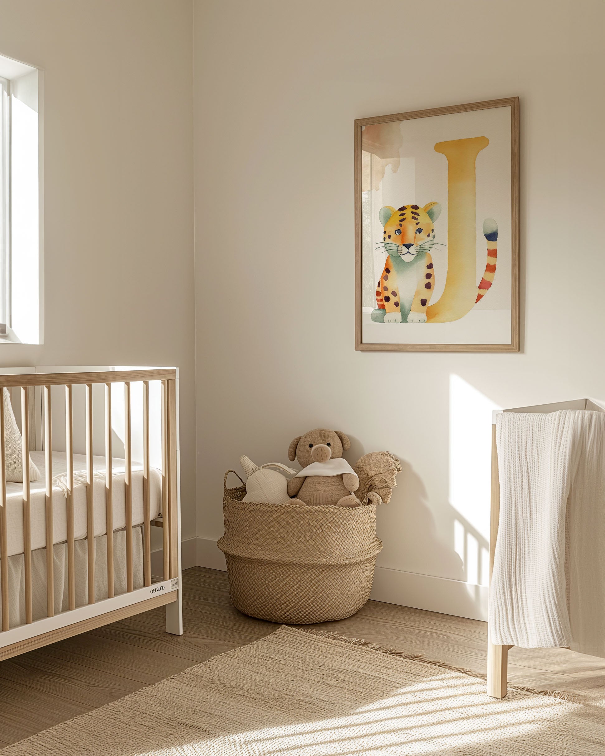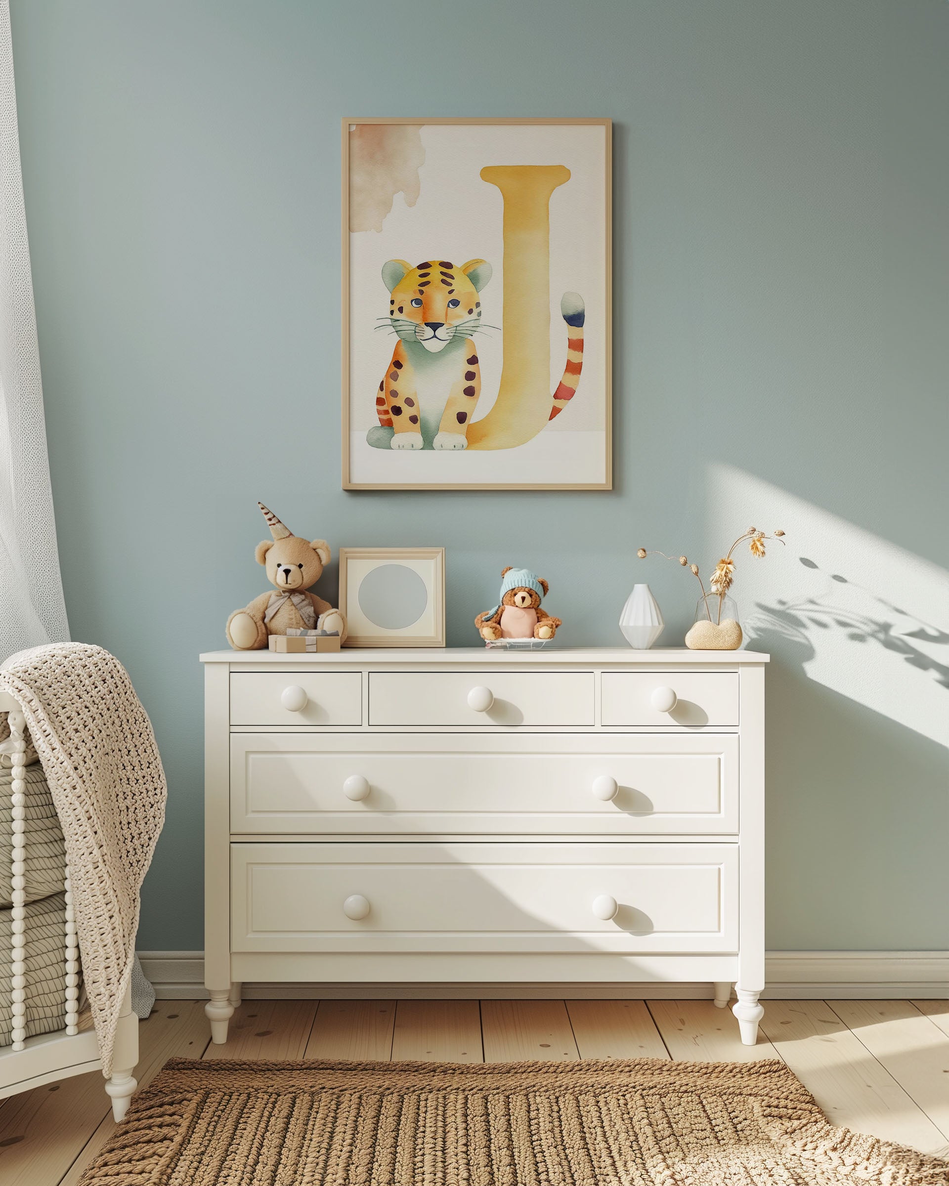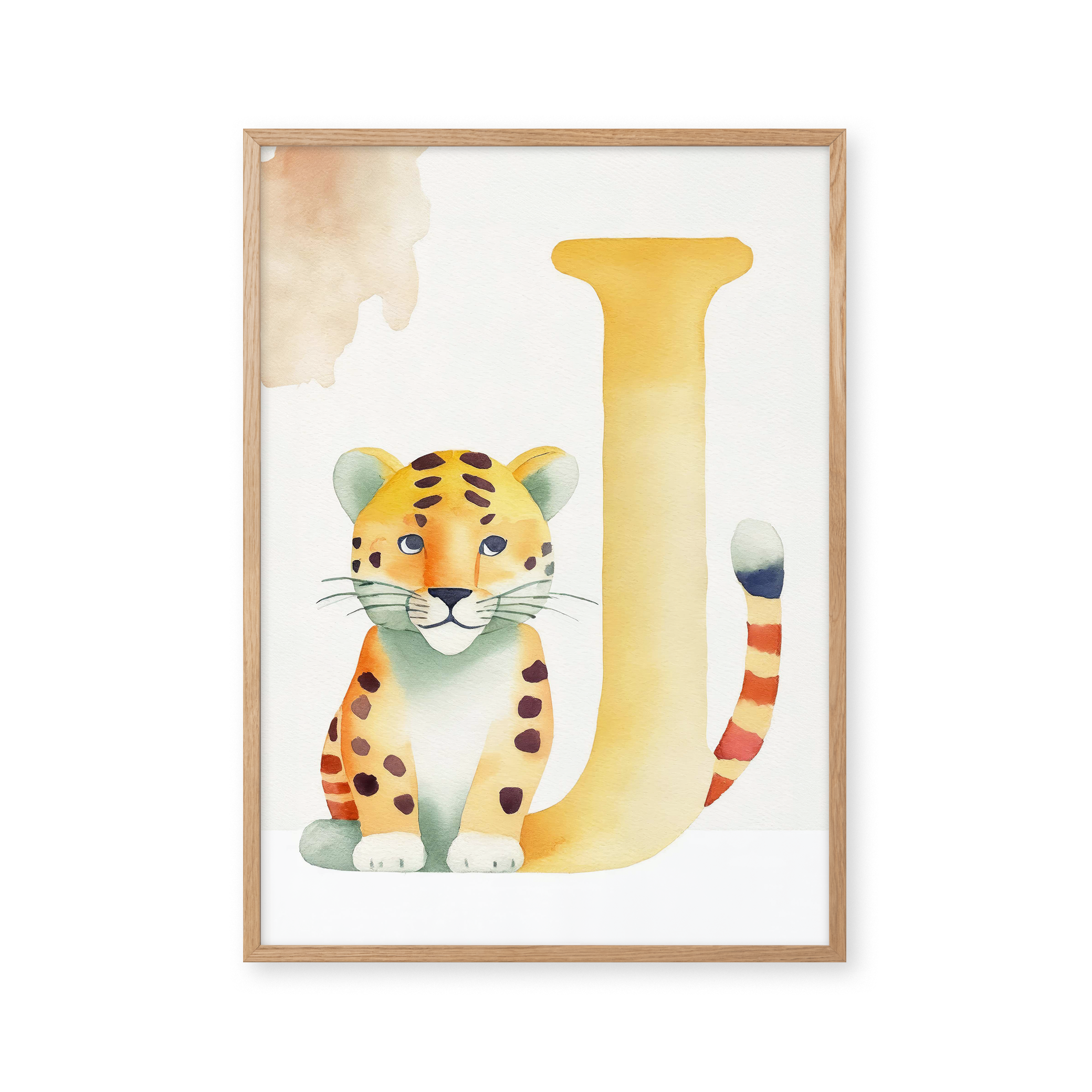 Opdag "Bogstavsplakat - J for jaguar", en charmerende tilføjelse til ethvert rum. Denne plakat fanger blikket med sin varme farvepalet og livlige illustration af en jaguar, perfekt til børneværelset eller som en pædagogisk dekoration. Levende, legende og lærerig – en ægte samtalestarter!