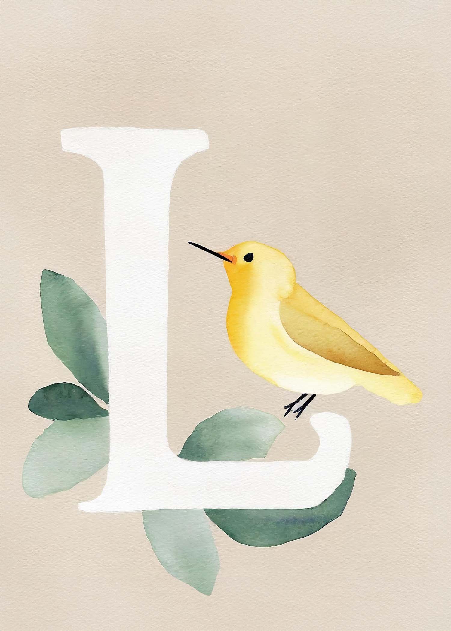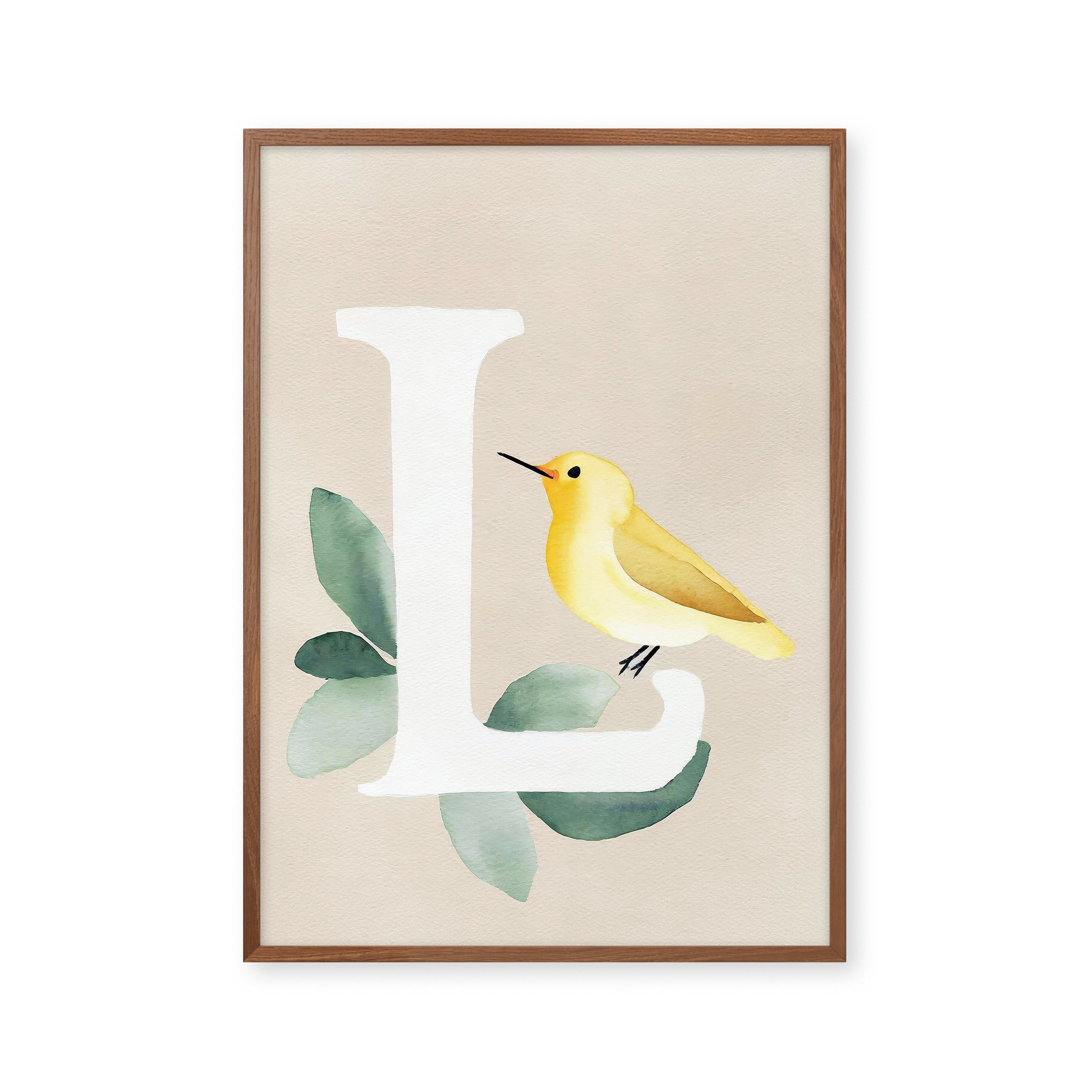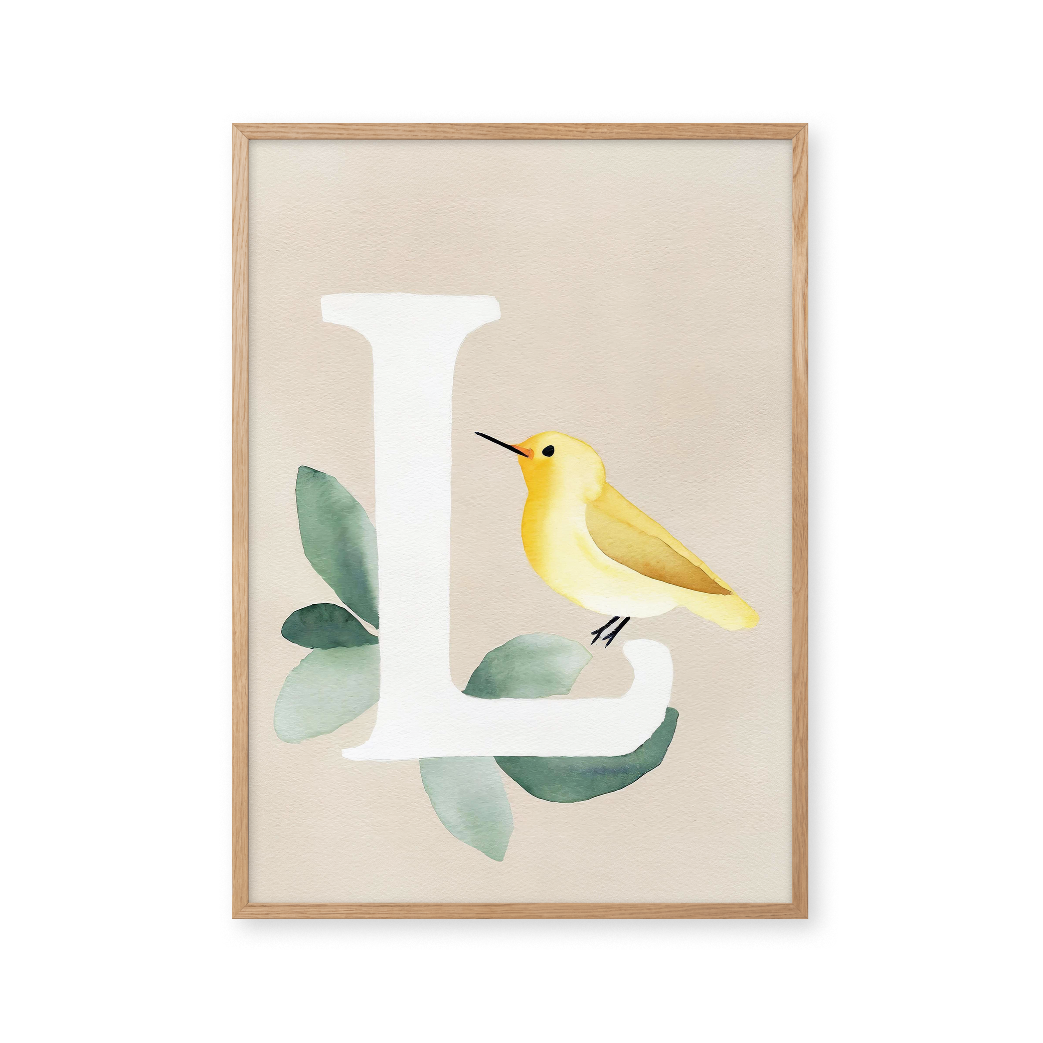 Opdag "Bogstavsplakat - L for lærke", en kunstnerisk fortolkning i akvarel. Denne plakat fanger blikket med sin bløde farvepalet og livlige lærke, perfekt til at tilføje et strejf af natur og elegance til ethvert rum. Ideal til børneværelset eller som en unik gave.