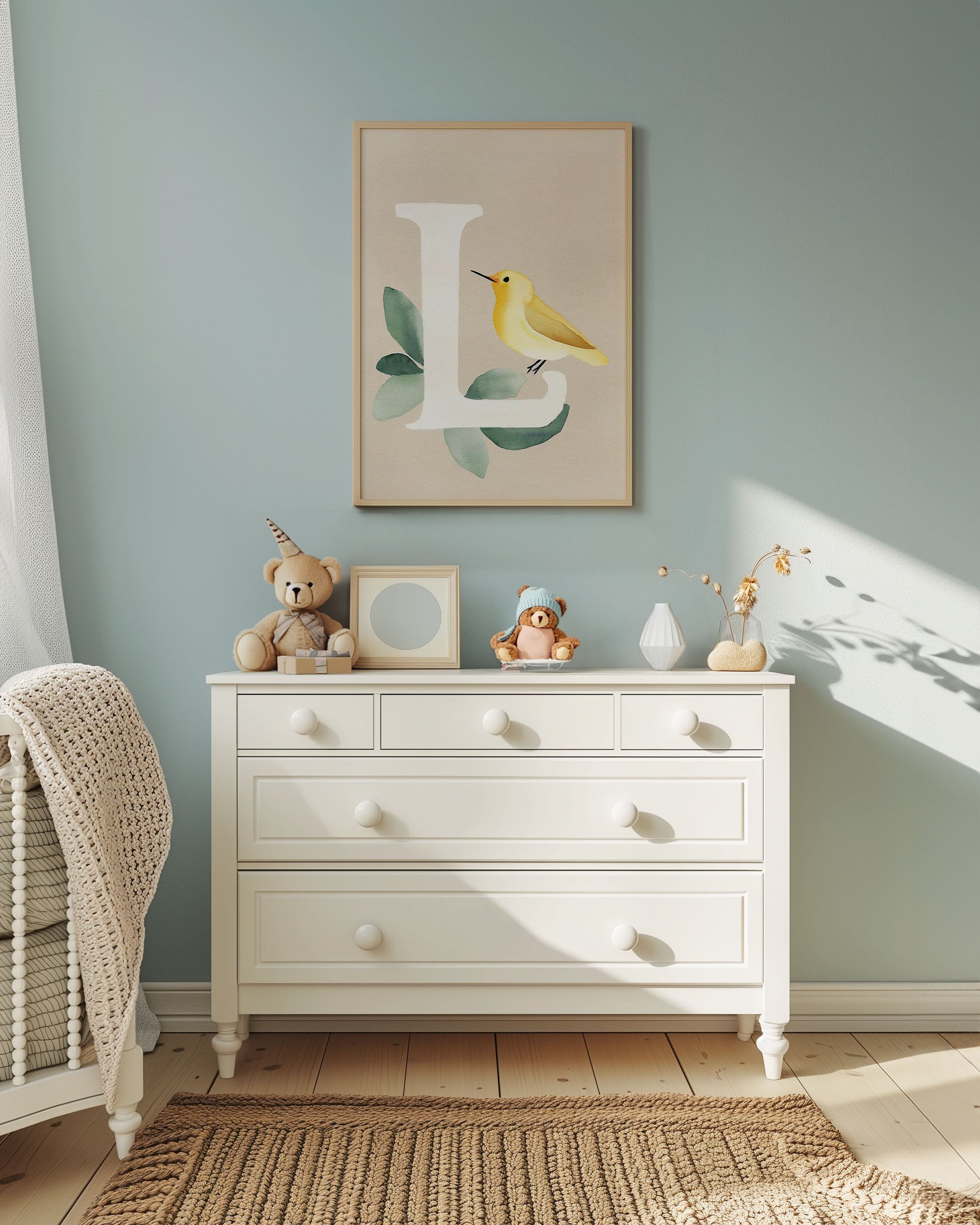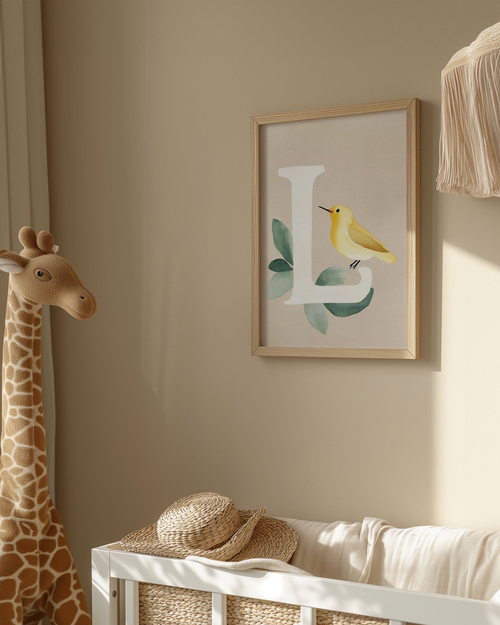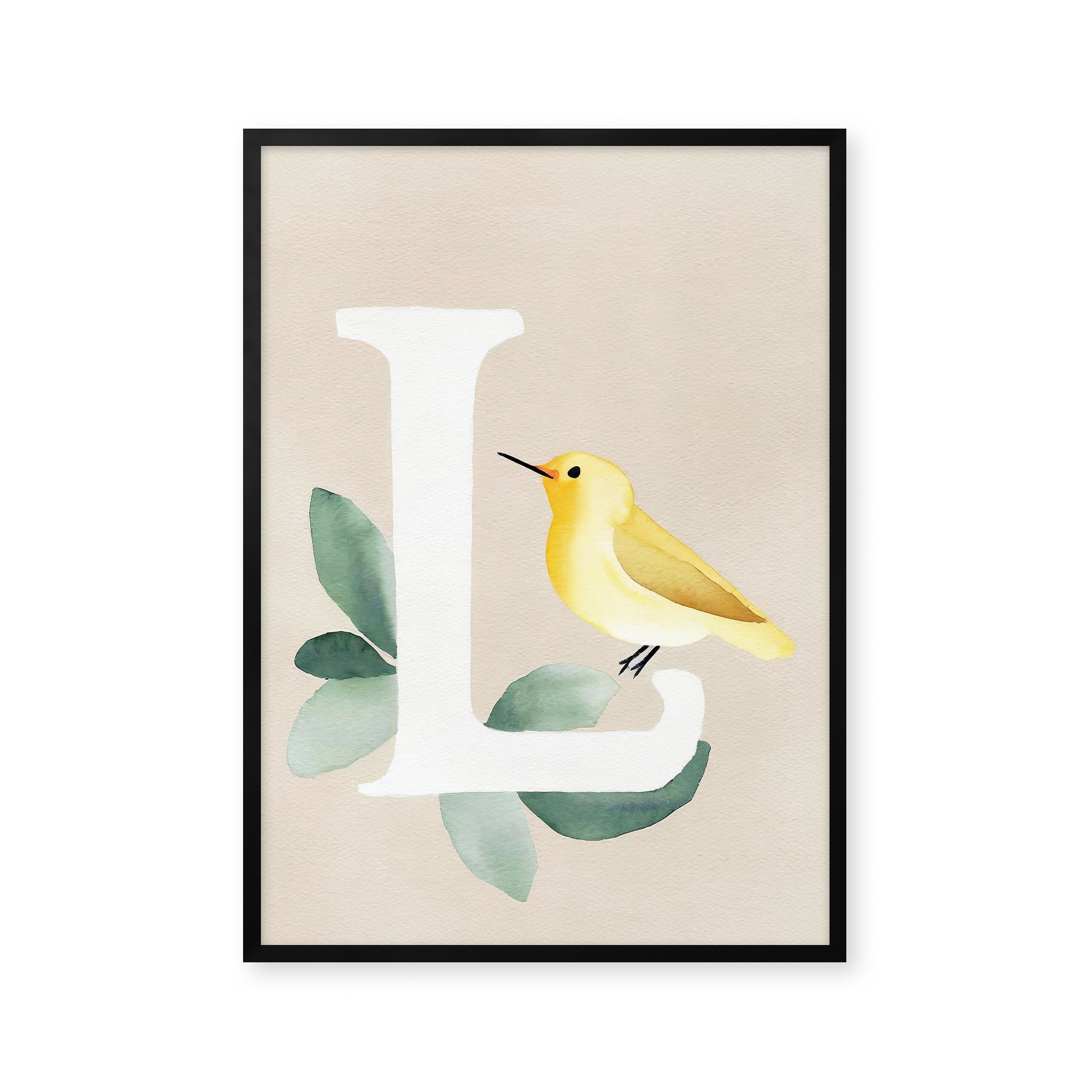 Opdag "Bogstavsplakat - L for lærke", en kunstnerisk fortolkning i akvarel. Denne plakat fanger blikket med sin bløde farvepalet og livlige lærke, perfekt til at tilføje et strejf af natur og elegance til ethvert rum. Ideal til børneværelset eller som en unik gave.