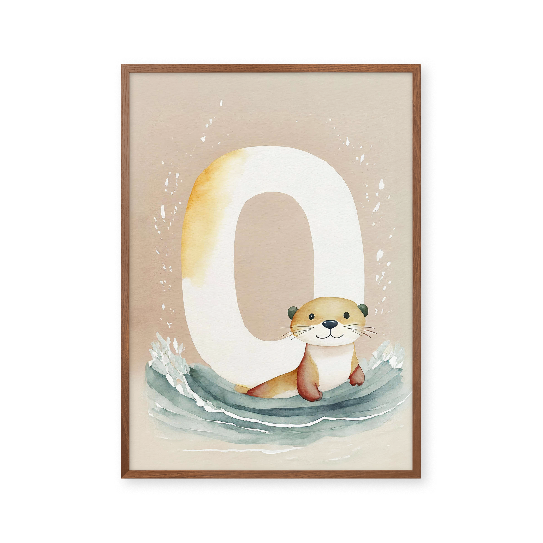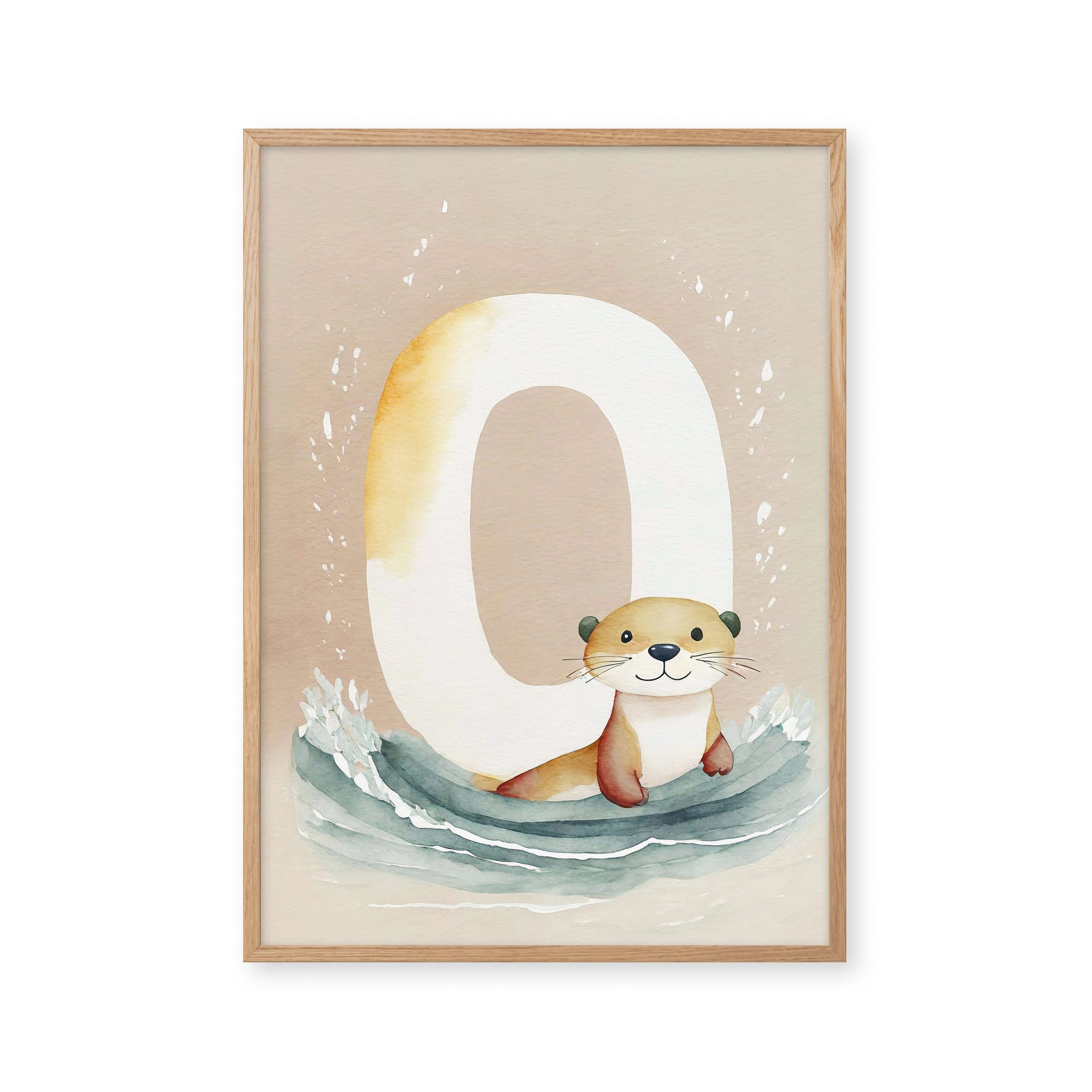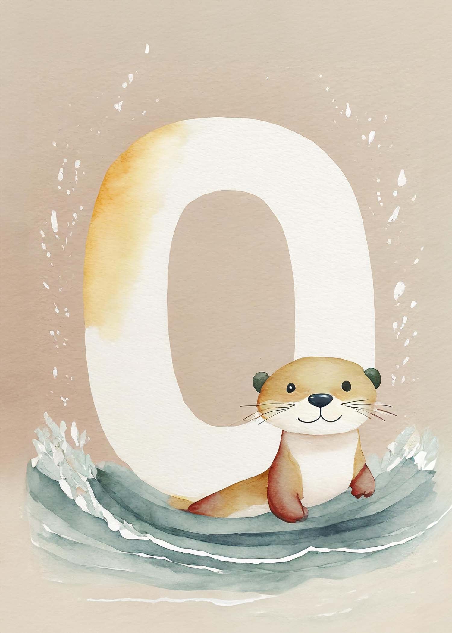 "Bogstavsplakat - O for odder" - Berig børneværelset med denne charmerende plakat, hvor en nuttet odder pryder bogstavet 'O'. De bløde, jordnære farver og akvarelstil skaber en rolig atmosfære, perfekt til lærerige stunder. Et kunstnerisk touch til legende læring og dekorativ vægkunst.