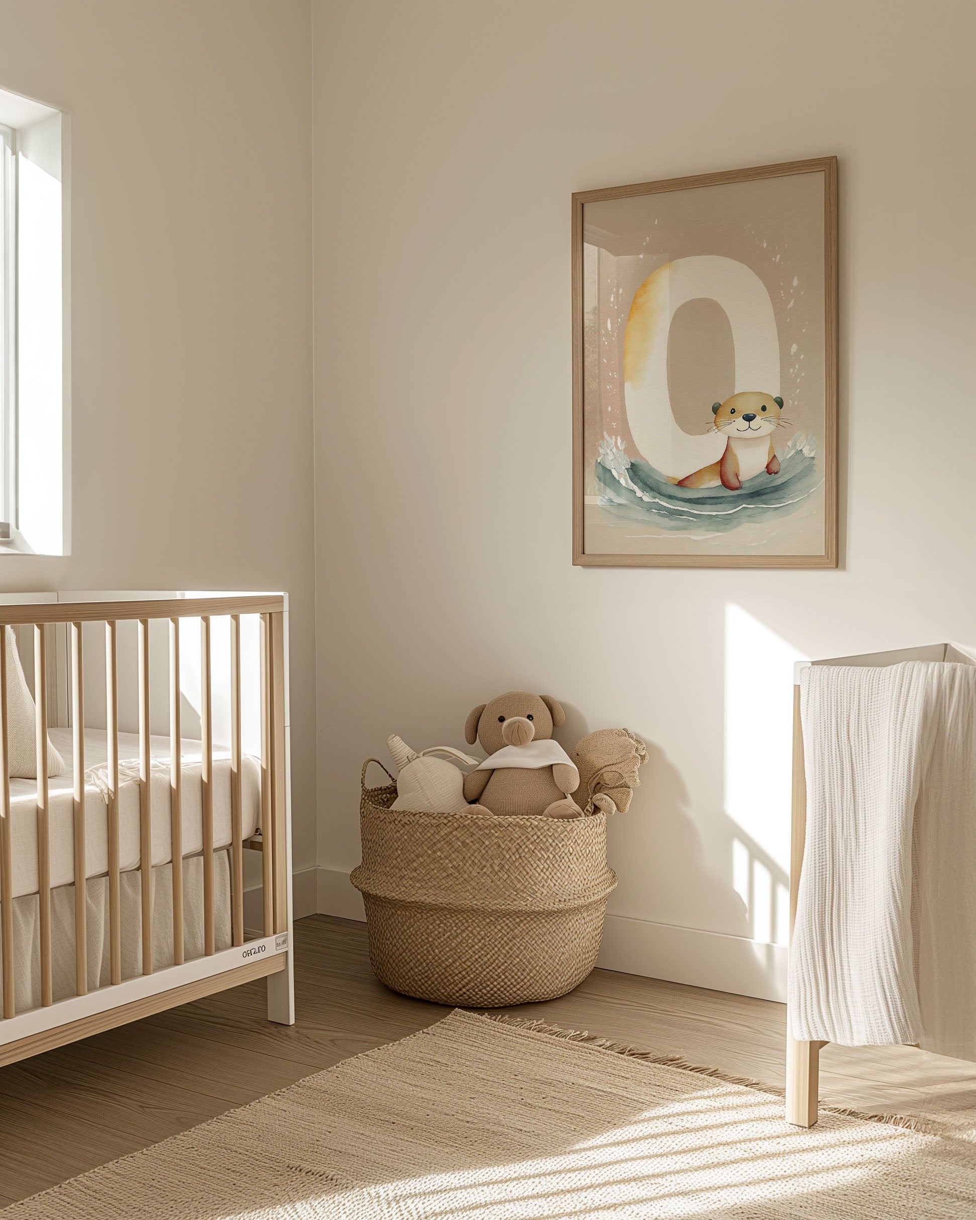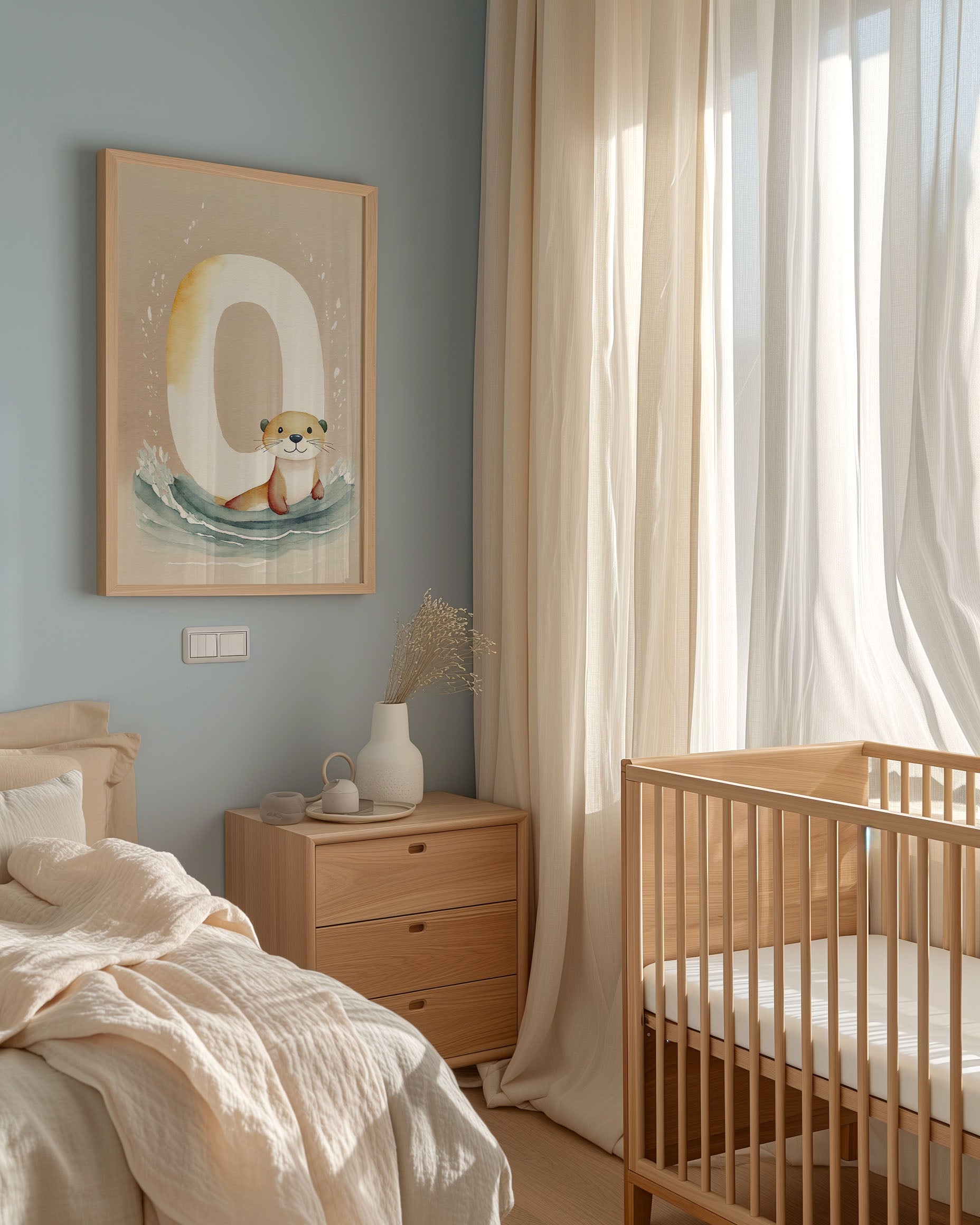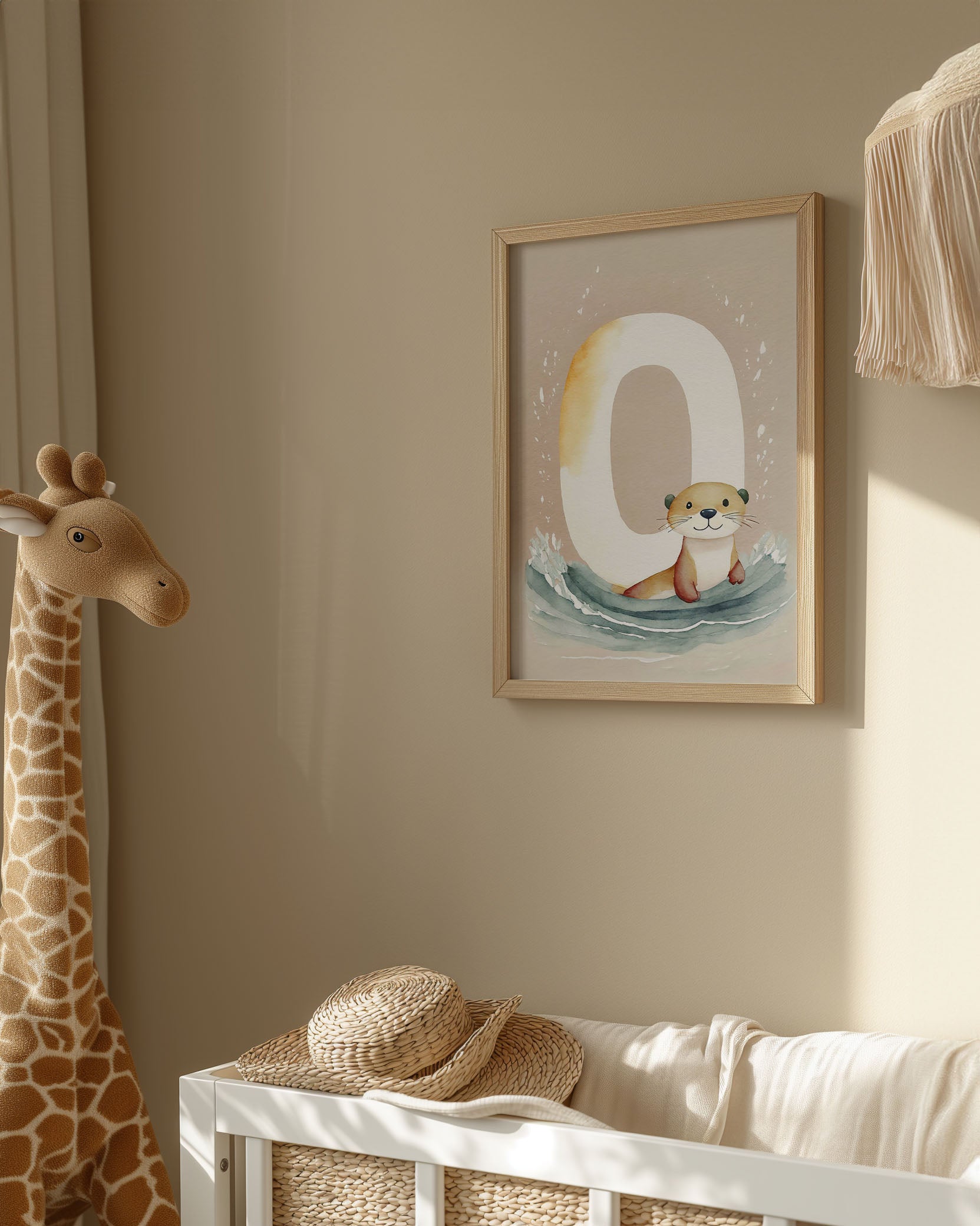 "Bogstavsplakat - O for odder" - Berig børneværelset med denne charmerende plakat, hvor en nuttet odder pryder bogstavet 'O'. De bløde, jordnære farver og akvarelstil skaber en rolig atmosfære, perfekt til lærerige stunder. Et kunstnerisk touch til legende læring og dekorativ vægkunst.