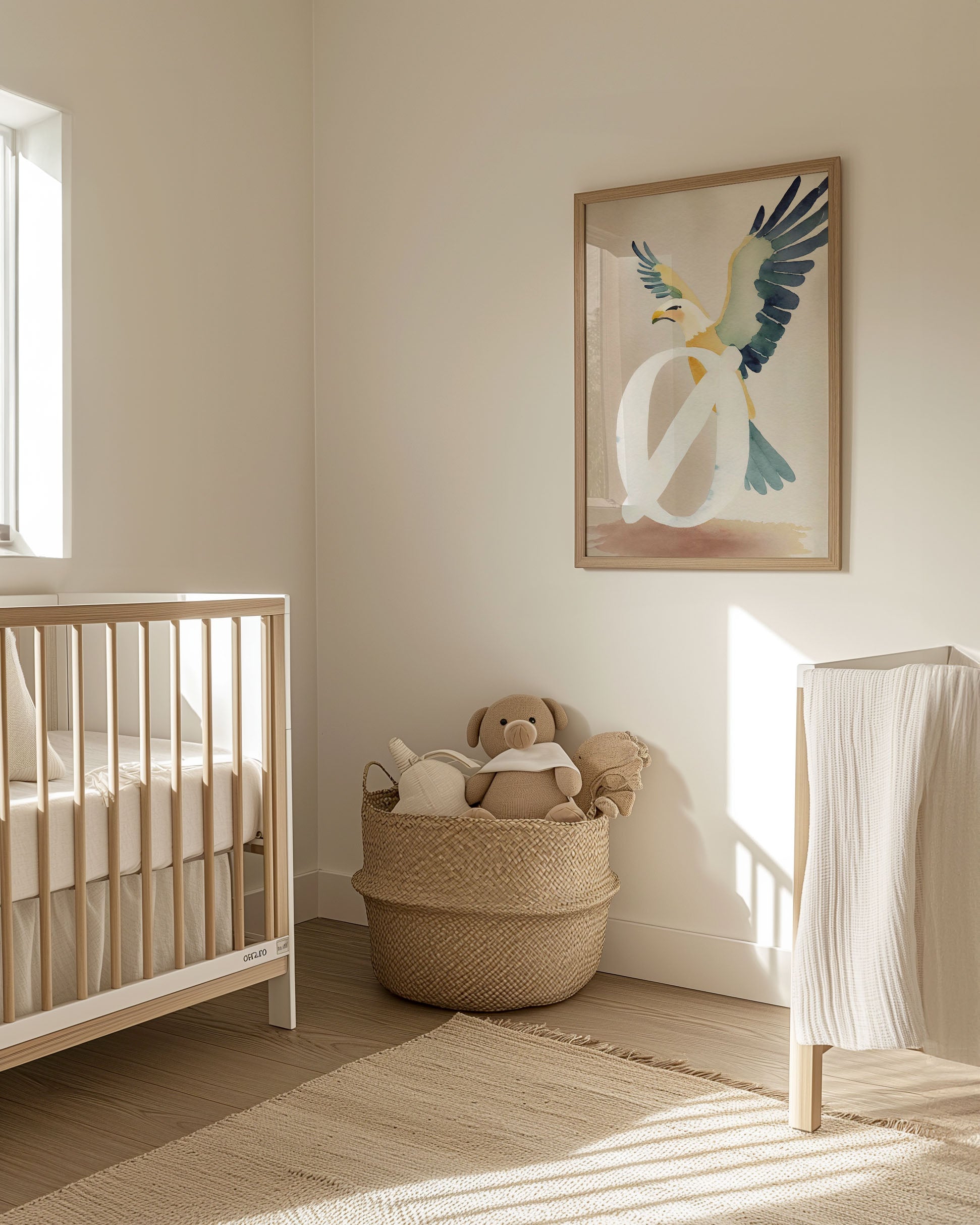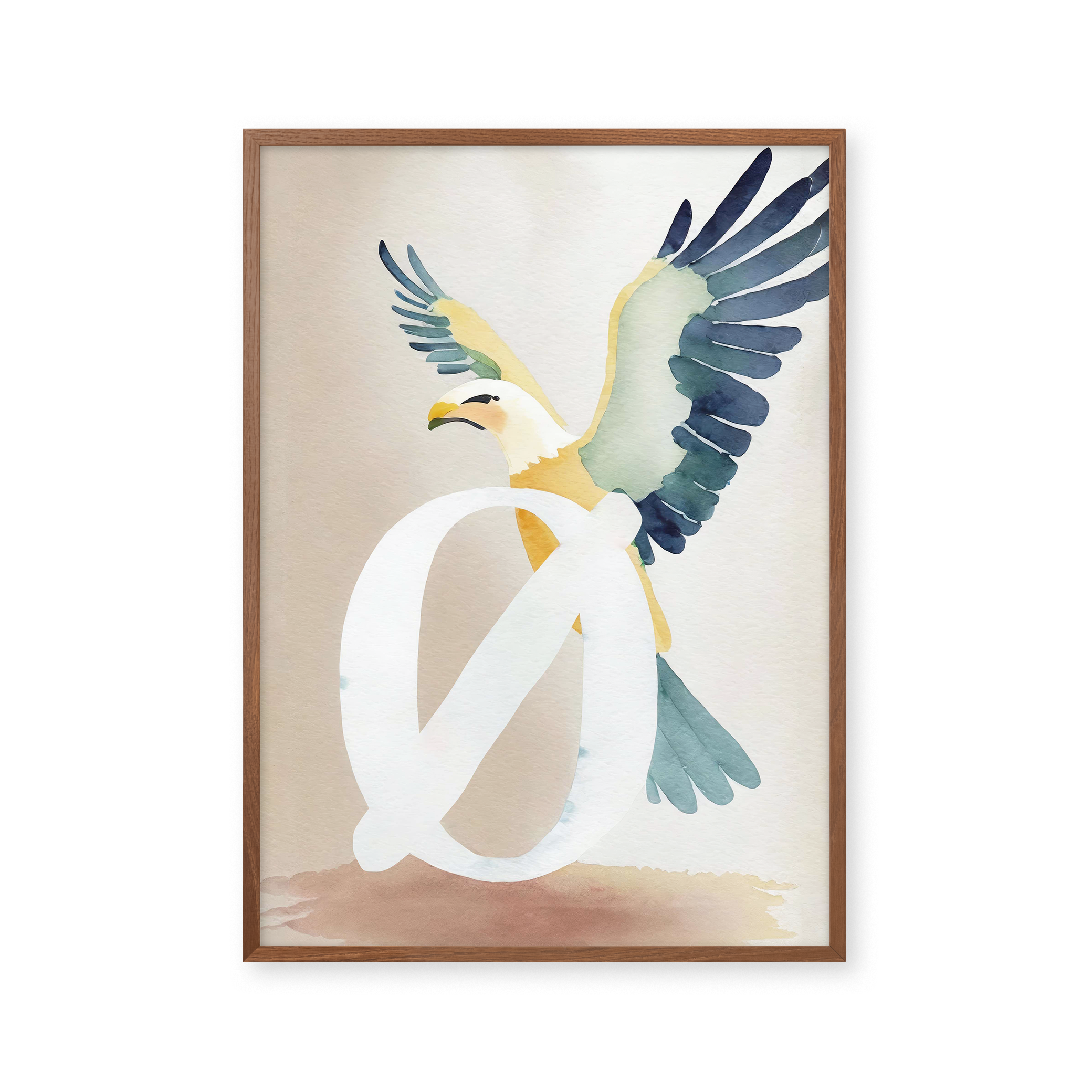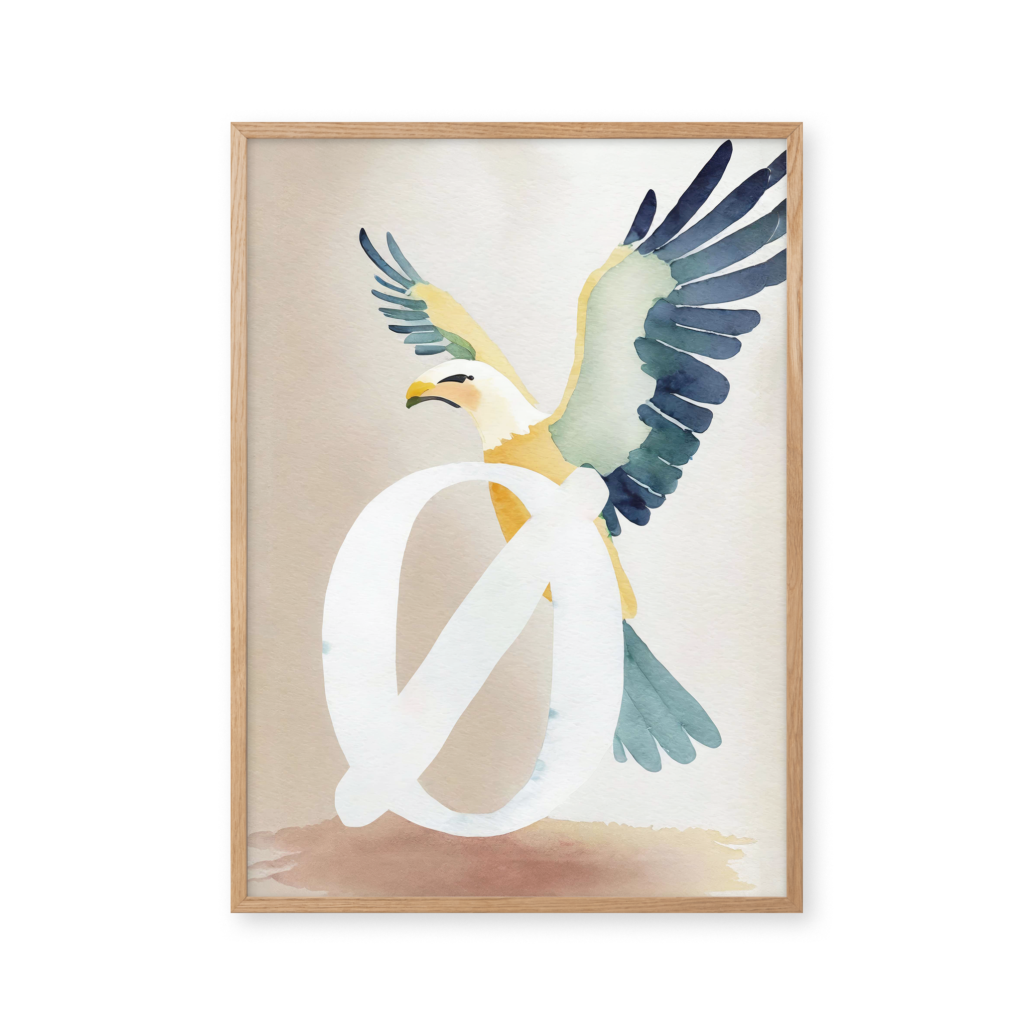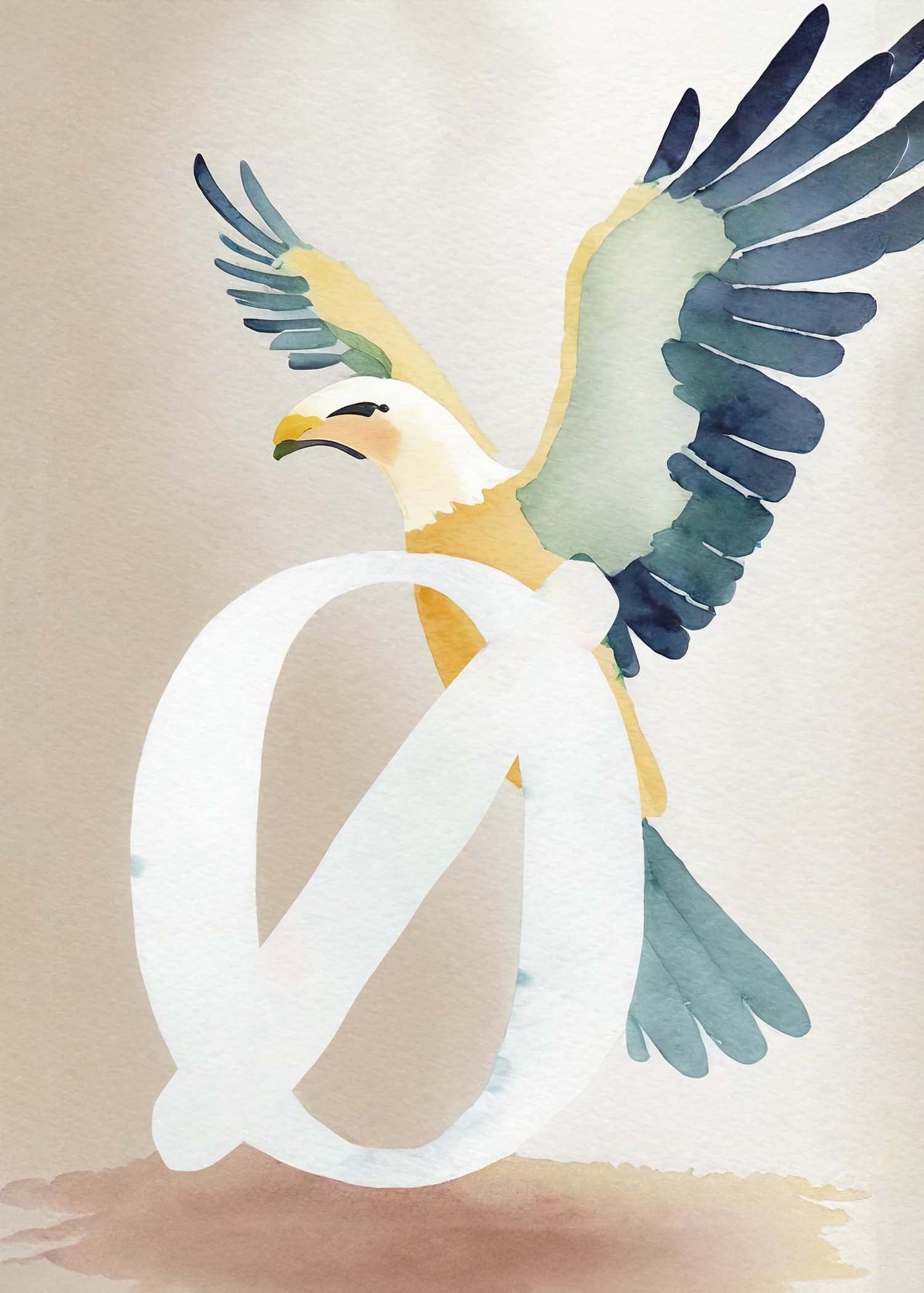 Opdag "Bogstavsplakat - Ø for ørn", en kunstnerisk fortolkning, der fanger blikket. Denne plakat blander akvarelteknikker med levende farver for at skabe en ørn i flugt, smukt integreret med bogstavet Ø. Perfekt til at tilføje et strejf af natur og elegance til ethvert rum.