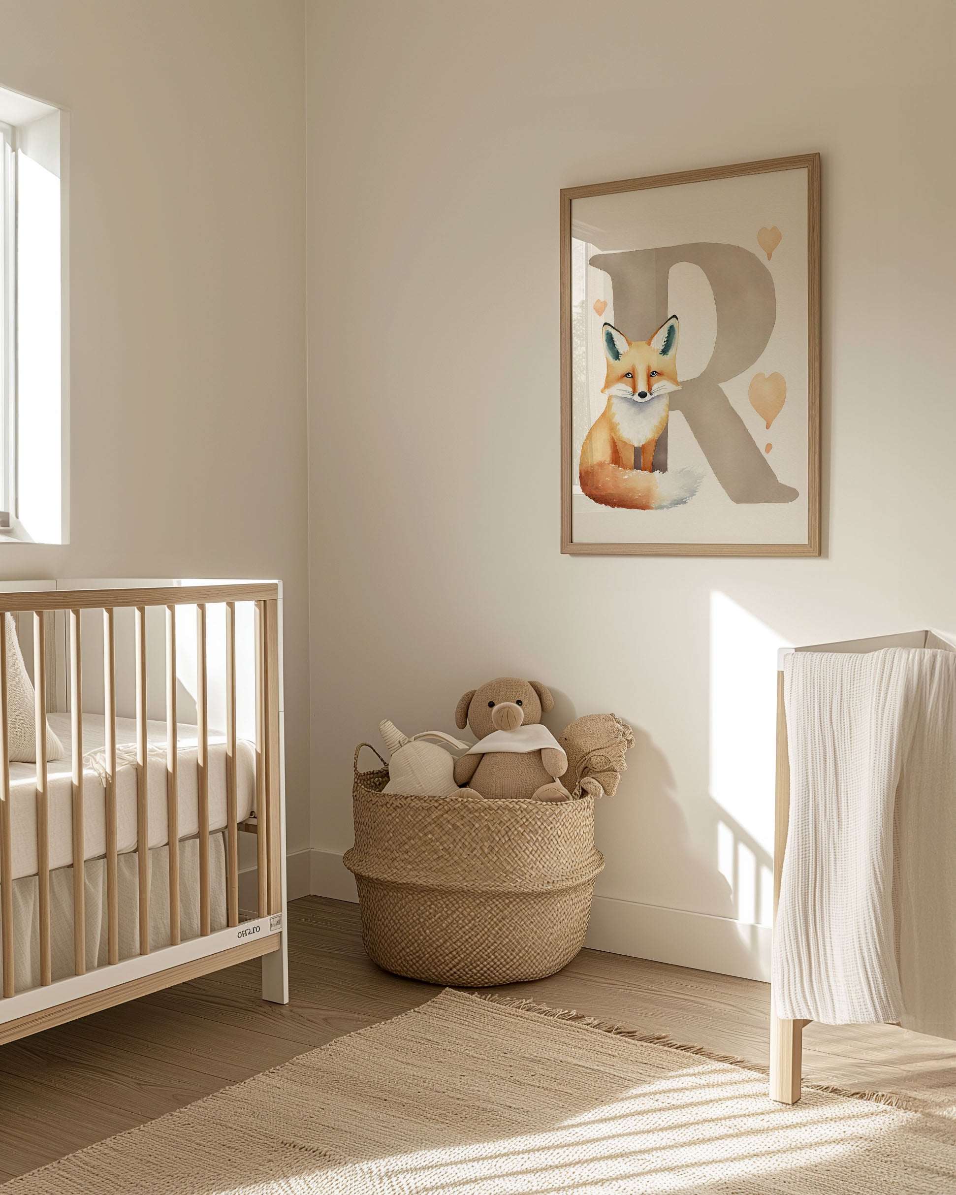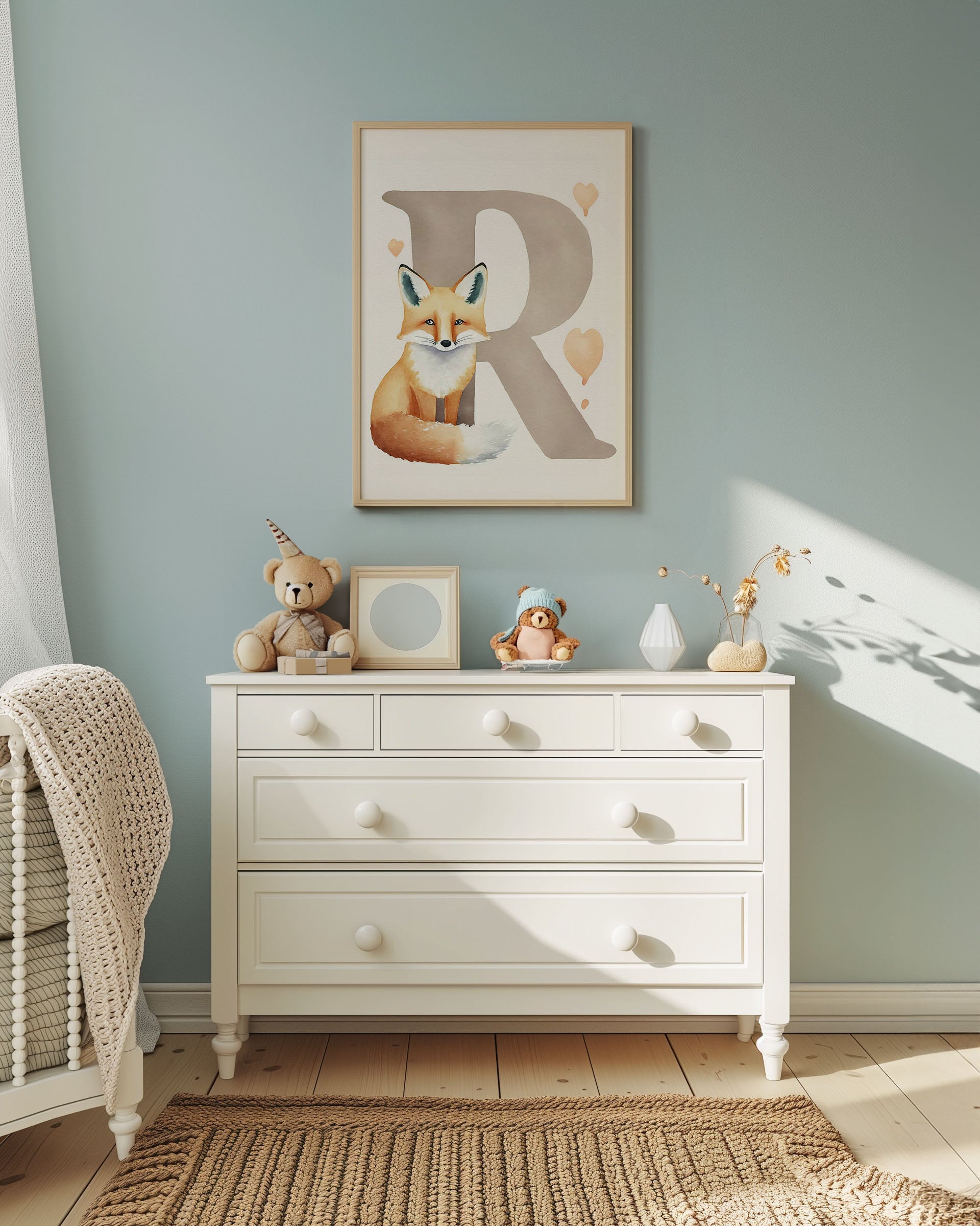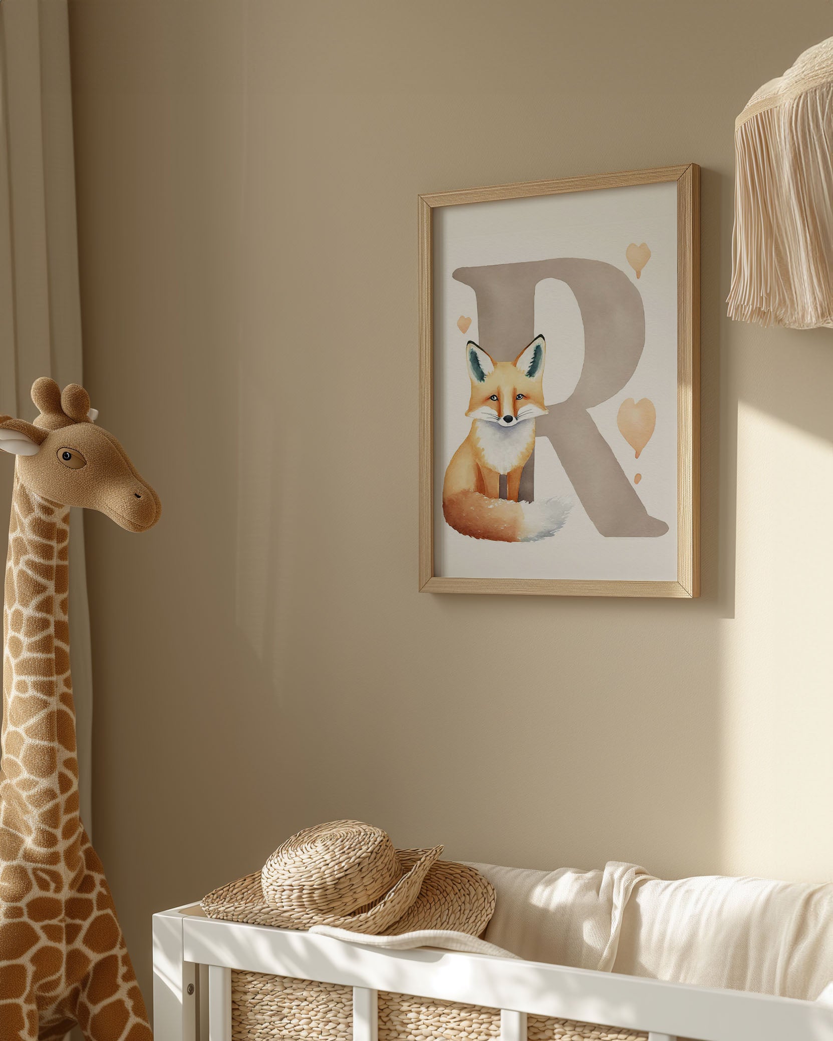 "Bogstavsplakat - R for ræv" - Oplev alfabetets magi med denne charmerende plakat, der fremviser et livligt rævemotiv. Perfekt til børneværelset, kombinerer den varme nuancer og blide penselstrøg for at skabe en hyggelig atmosfære. En kunstnerisk perle, der både er lærerig og dekorativ.