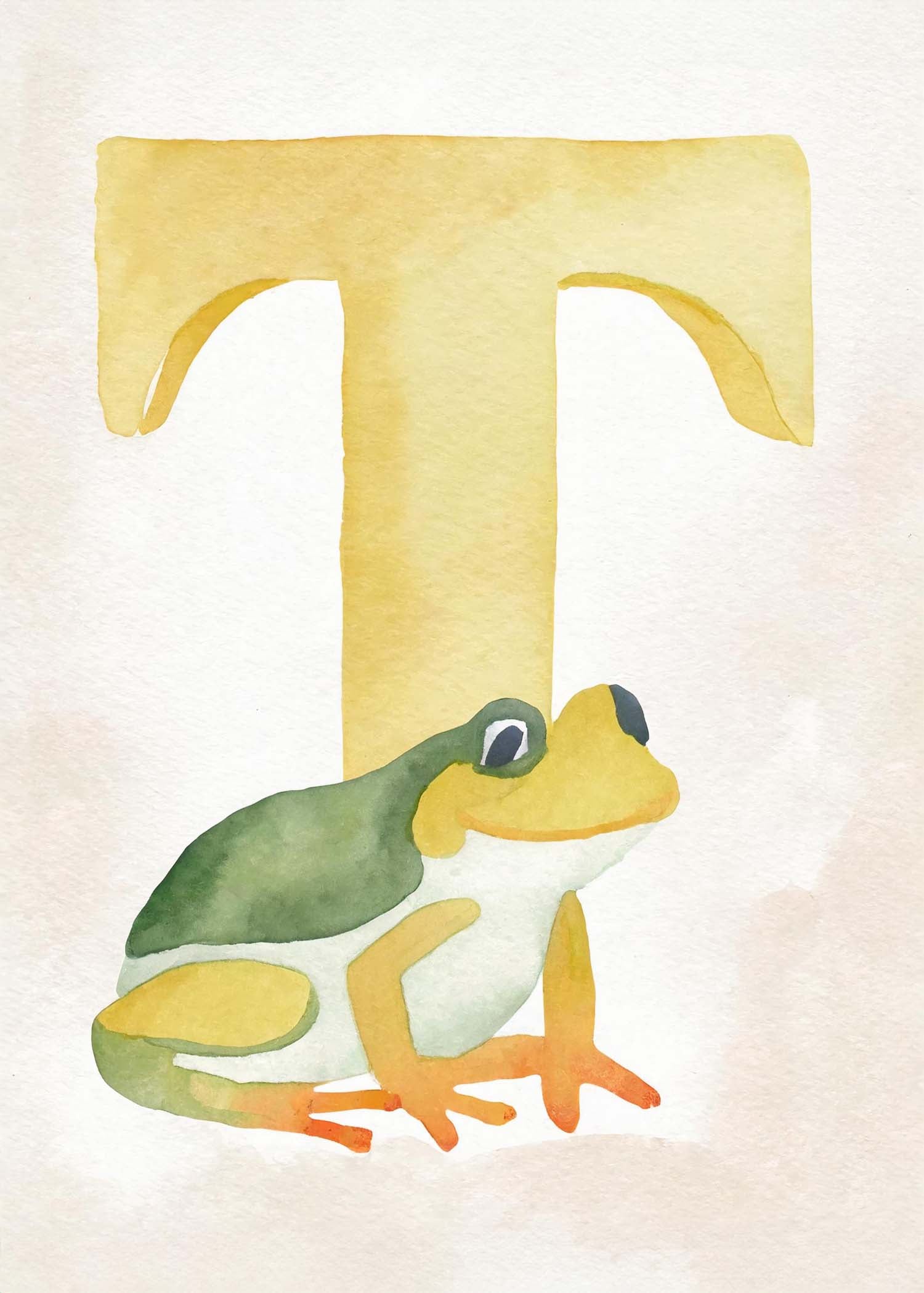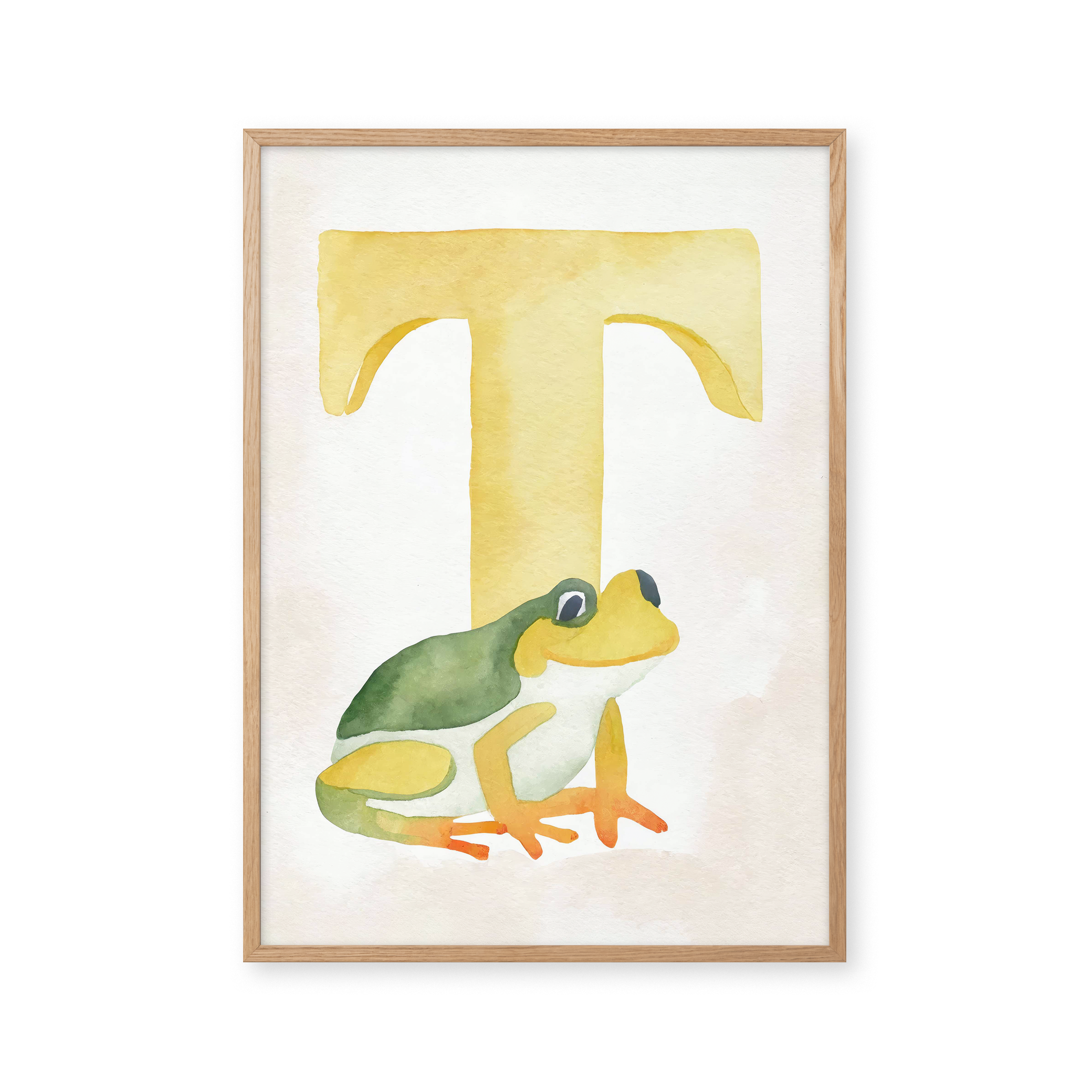 "Bogstavsplakat - T for tudse" - Opliv børneværelset med denne charmerende plakat, der kombinerer legende læring med kunstnerisk flair. Den varme gul nuance og den livlige tudse fanger blikket og inspirerer til alfabetleg. Perfekt til pædagogisk dekoration og farveglæde.