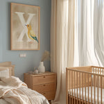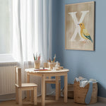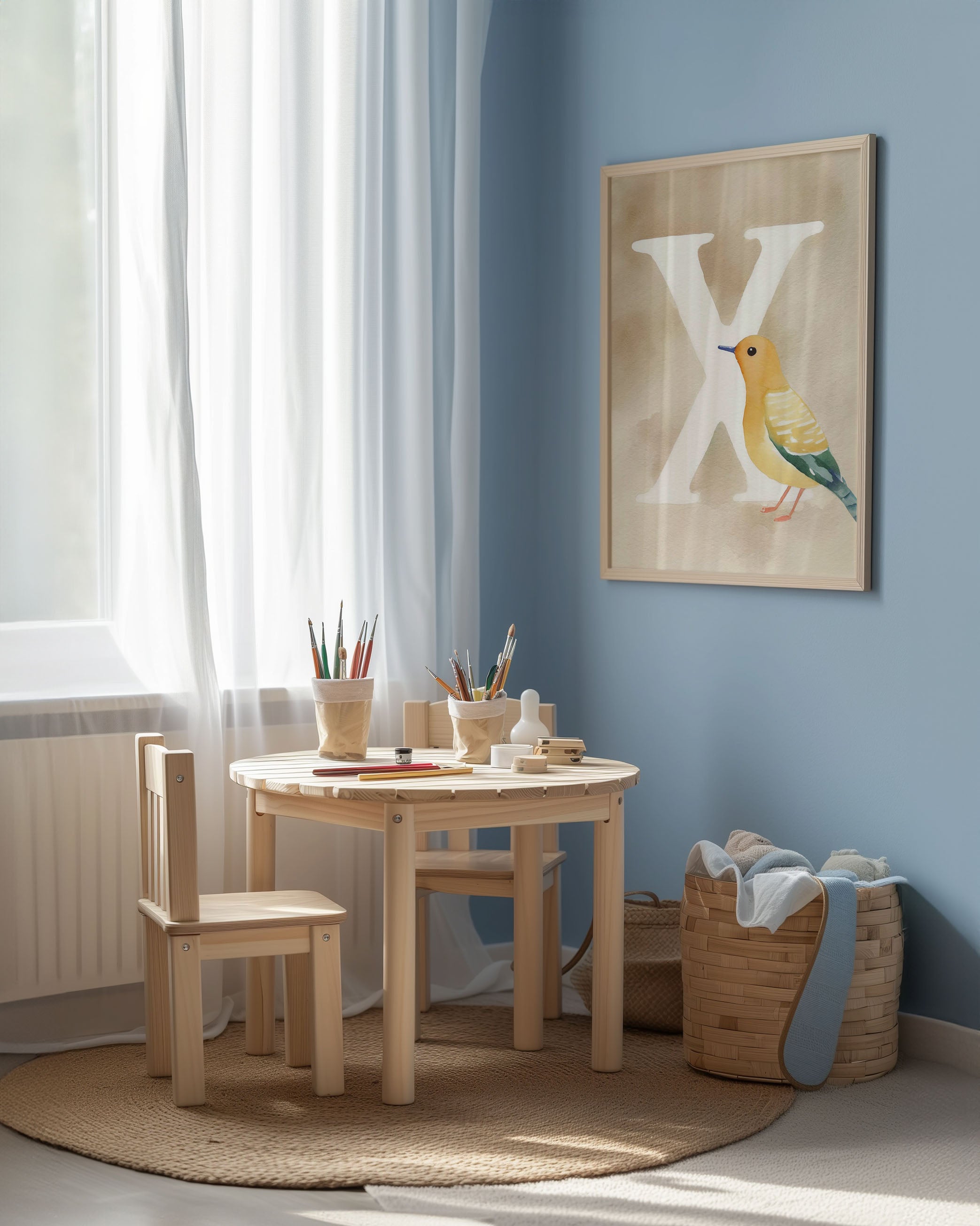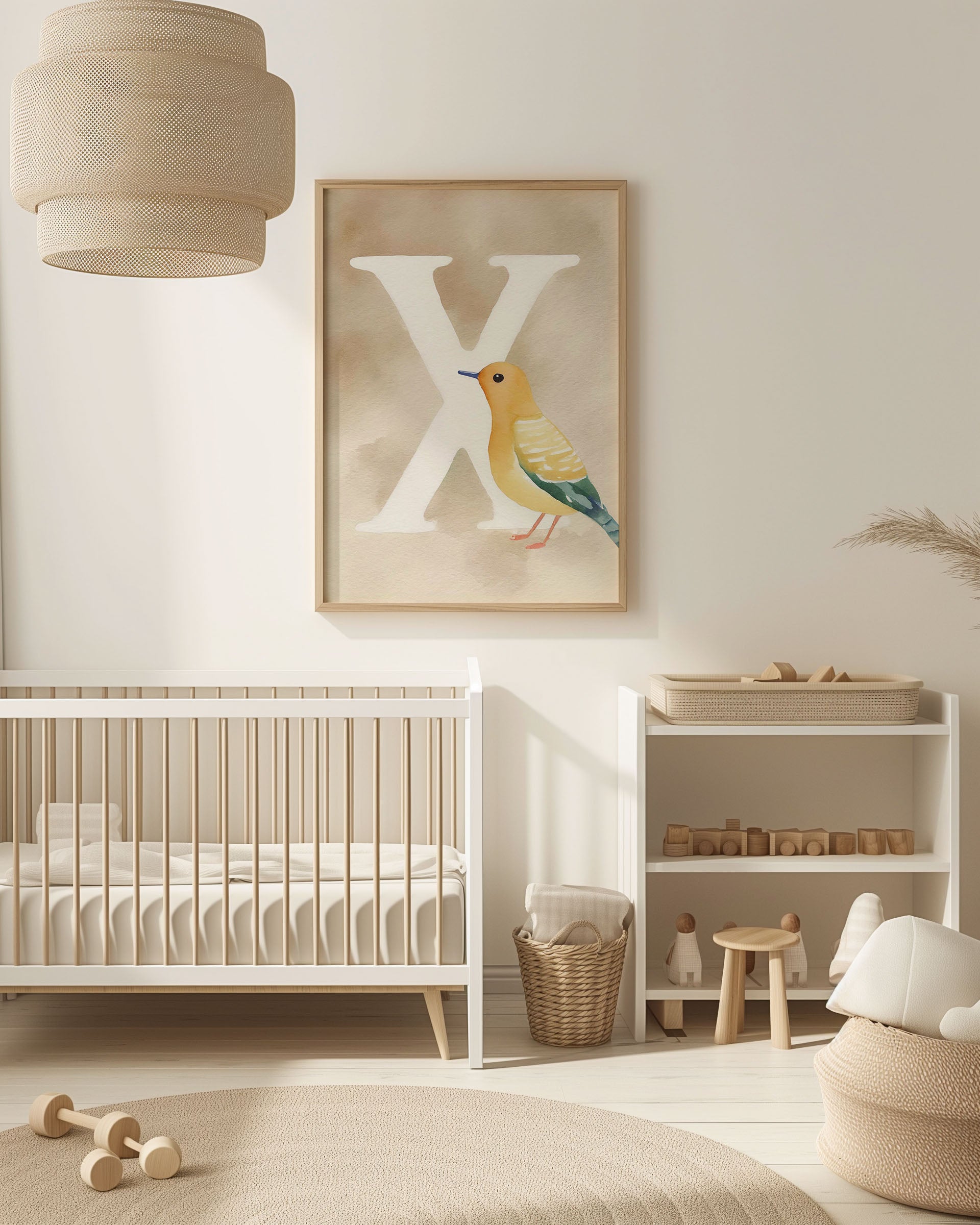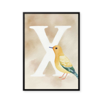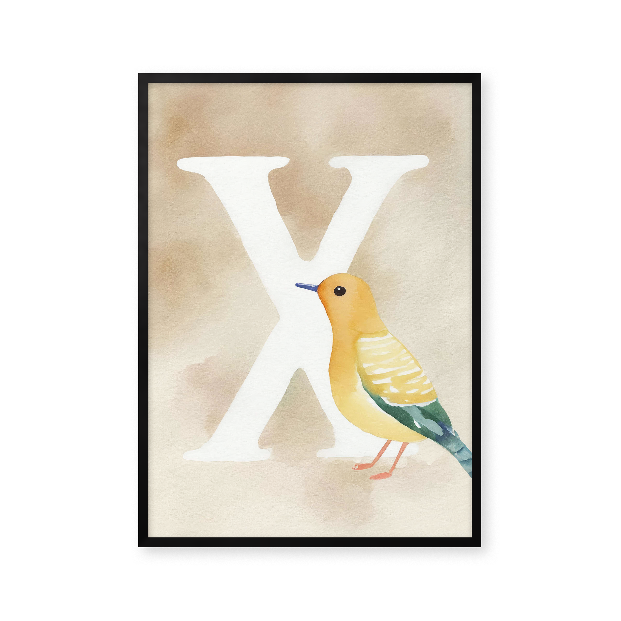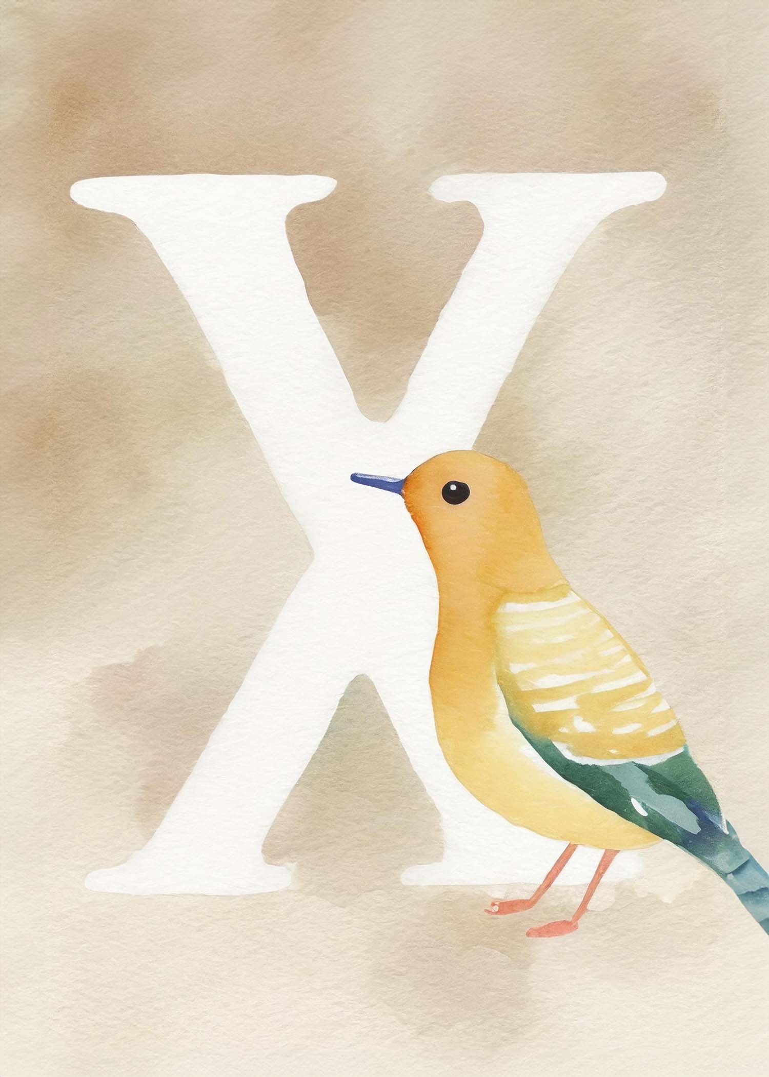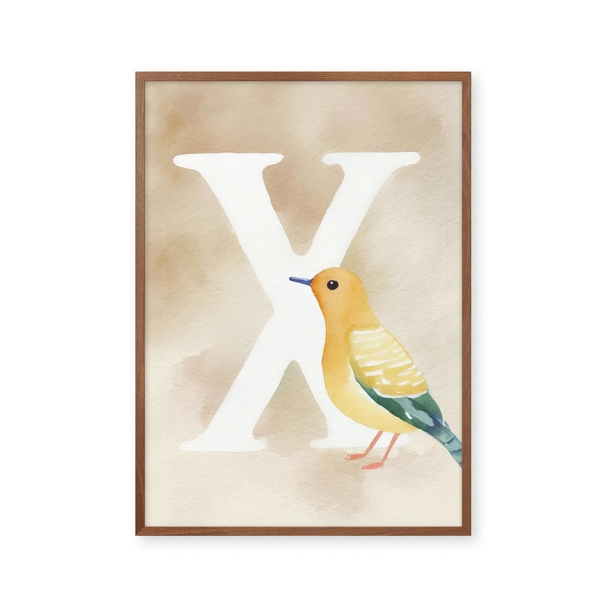 "Bogstavsplakat - X for xenops" - Oplev alfabetets magi med denne charmerende plakat, der fremviser 'X' for xenops i akvarel. Perfekt til børneværelset, med bløde farver og kunstnerisk flair, der tilfører et pædagogisk touch til enhver vægdekoration. Engagerende, lærerig og visuelt tiltalende.