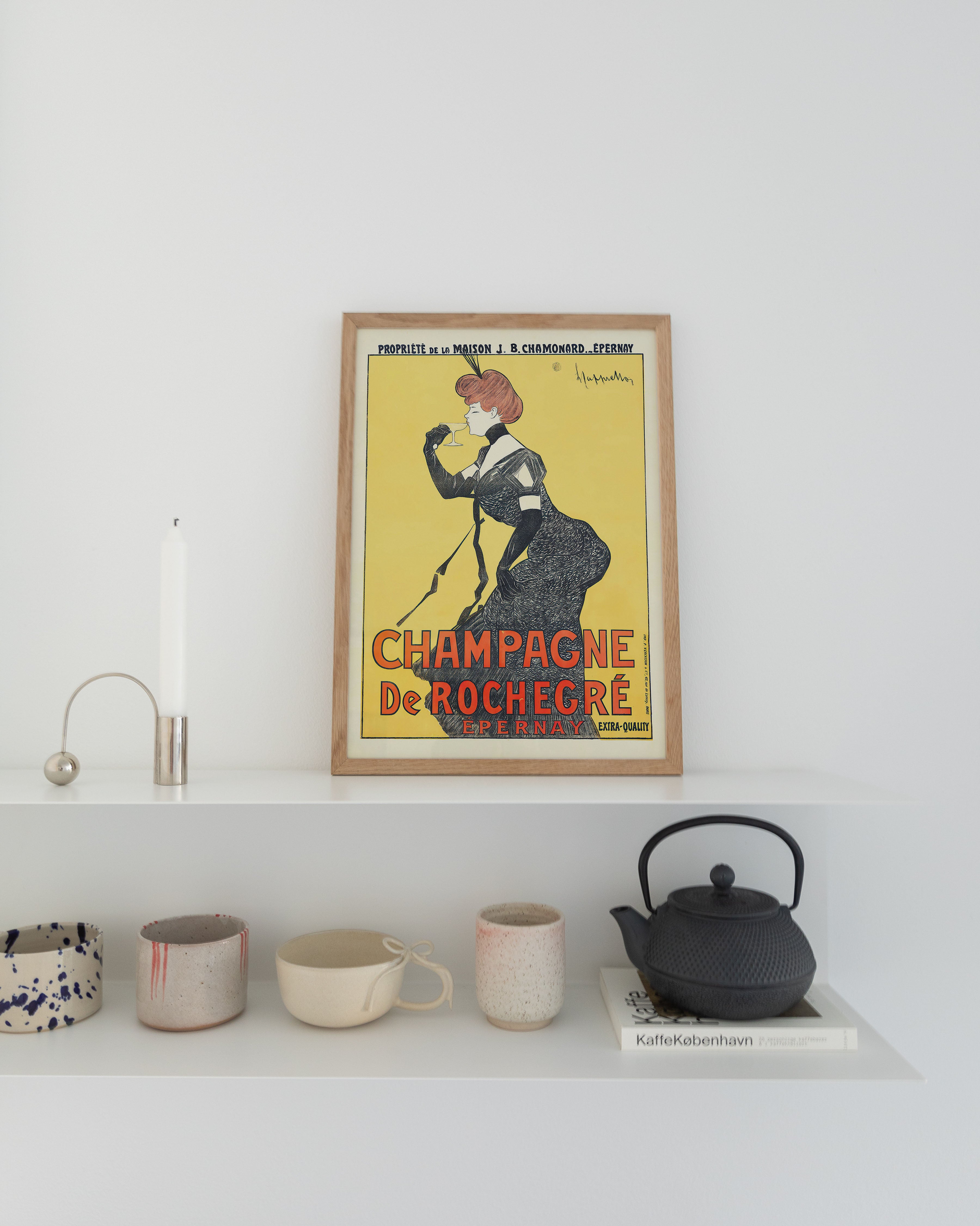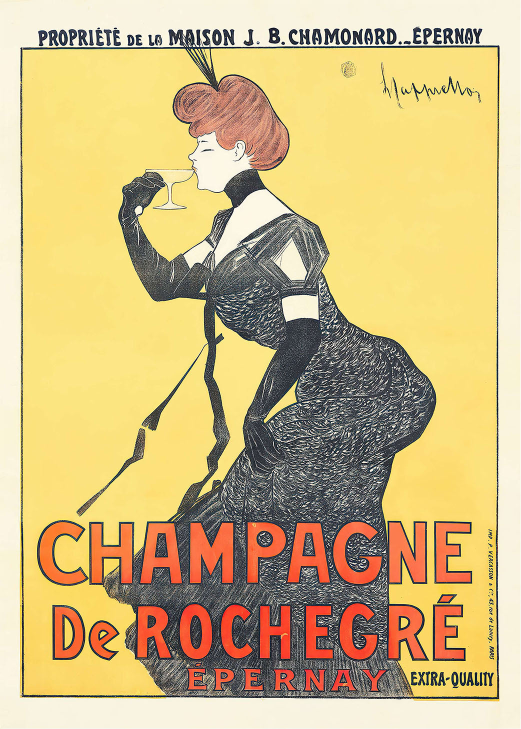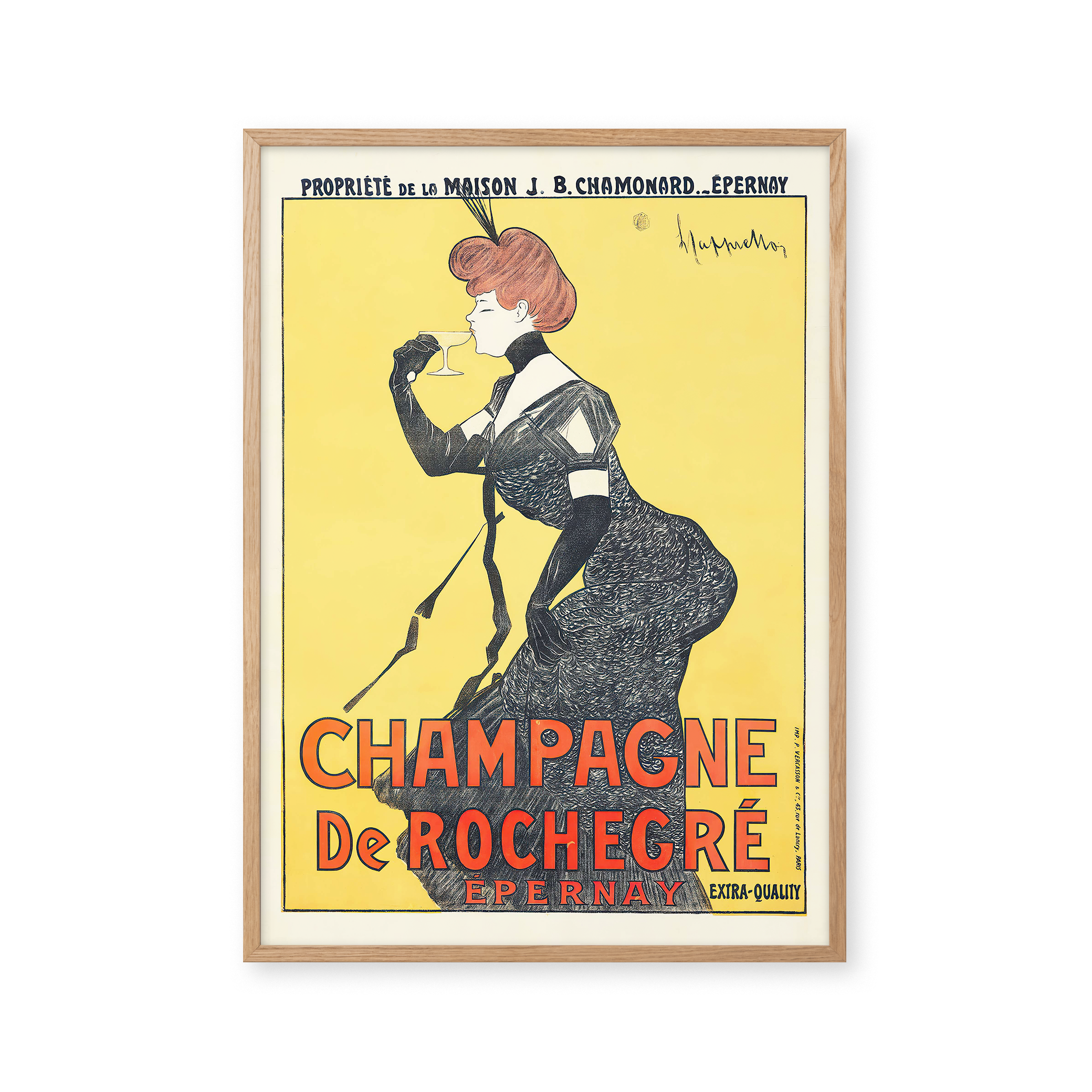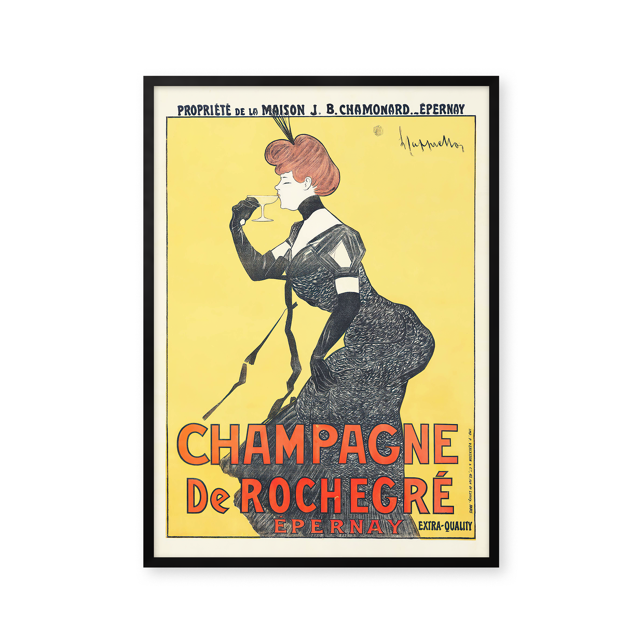 "Champagne De Rochegré" plakat: En elegant vintage plakat med levende gule og sorte nuancer. Fremhæver en stilfuld kvinde, der nipper til champagne, hvilket tilføjer et strejf af luksus og nostalgi til enhver væg. Perfekt til vinelskere og kunstsamlere.