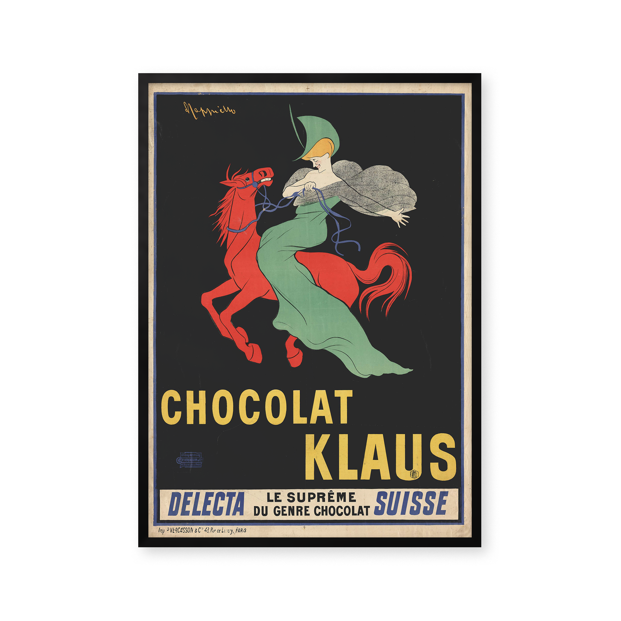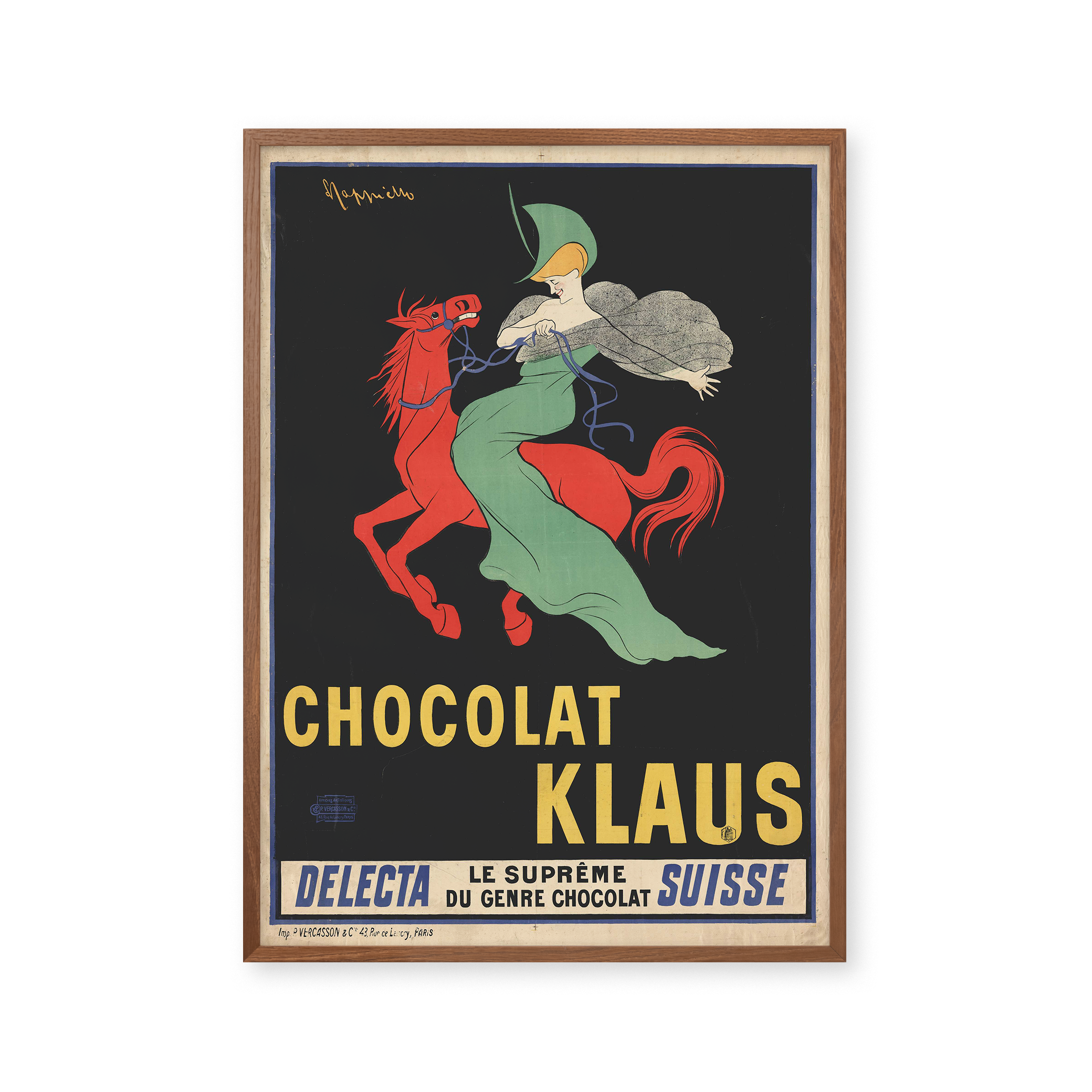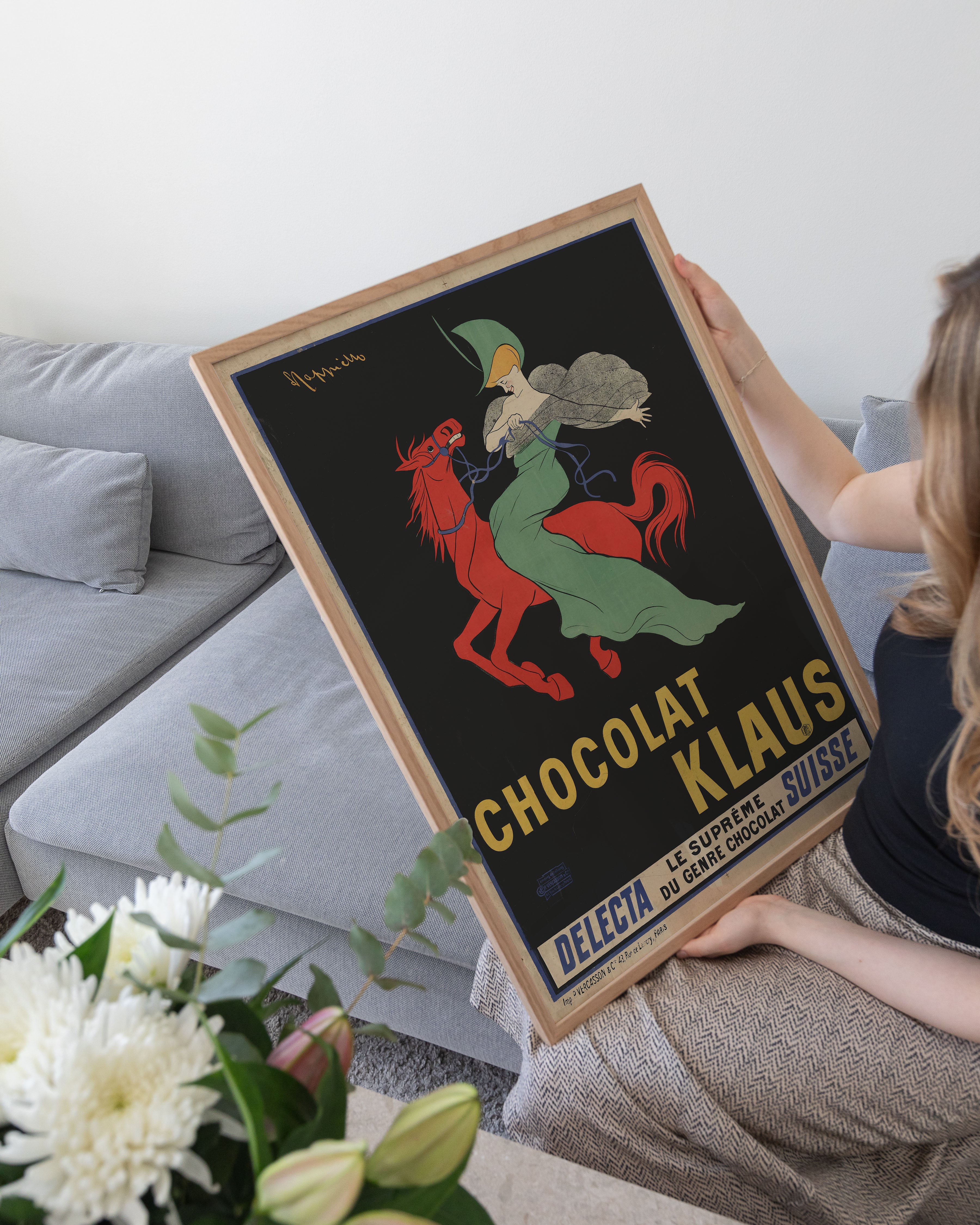 "Chocolat Klaus" - Oplev en farverig og unik plakat med en dramatisk rød hest og en elegant rytter i grøn kjole. Perfekt til at tilføje et strejf af vintage charme og kunstnerisk flair til dit hjem. Ideel til kunstelskere og samlere.