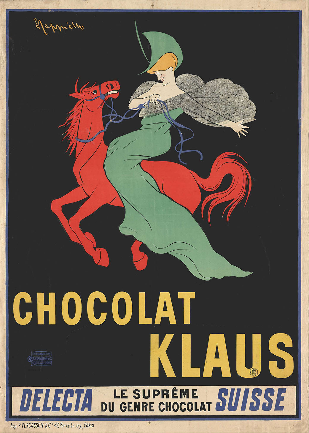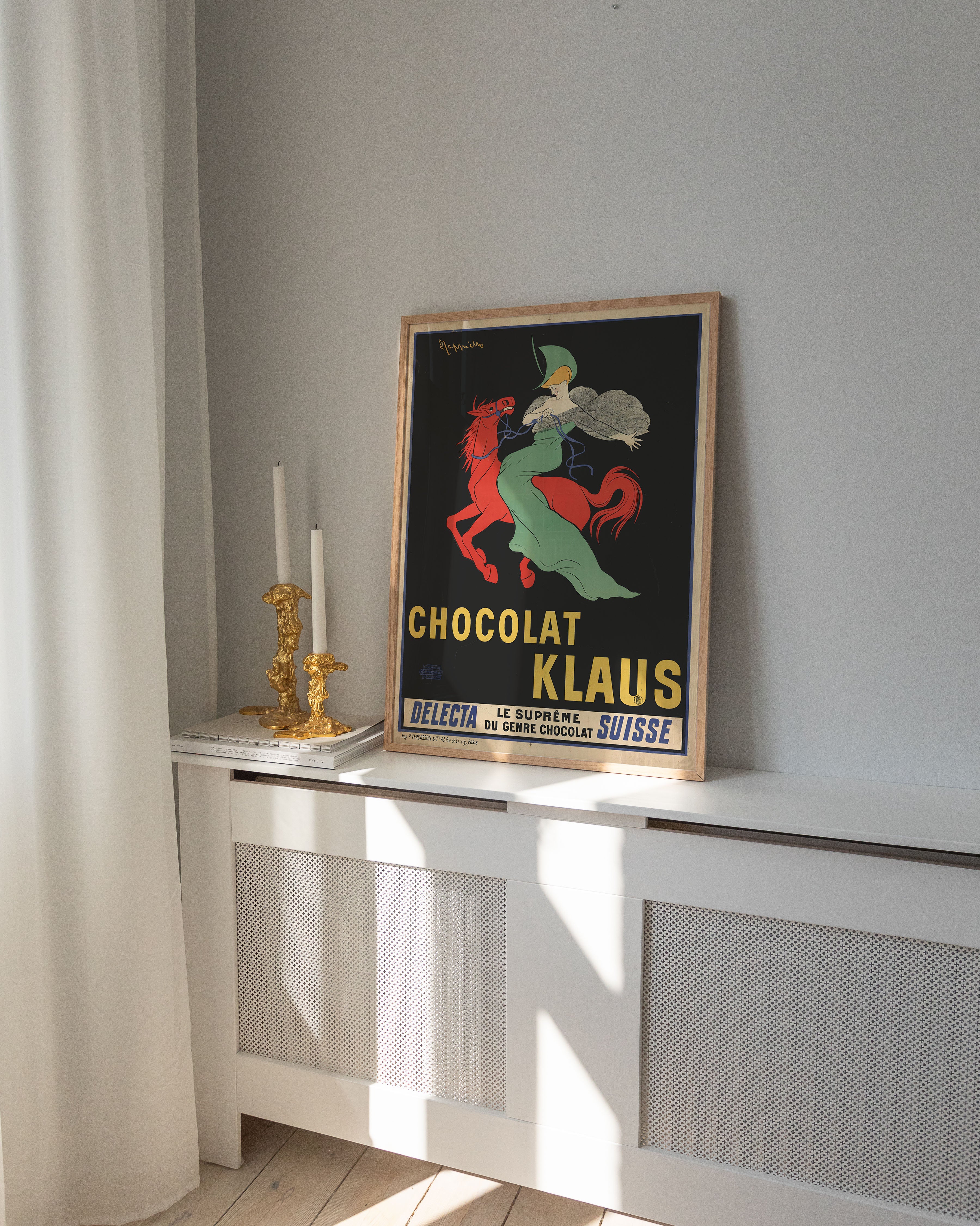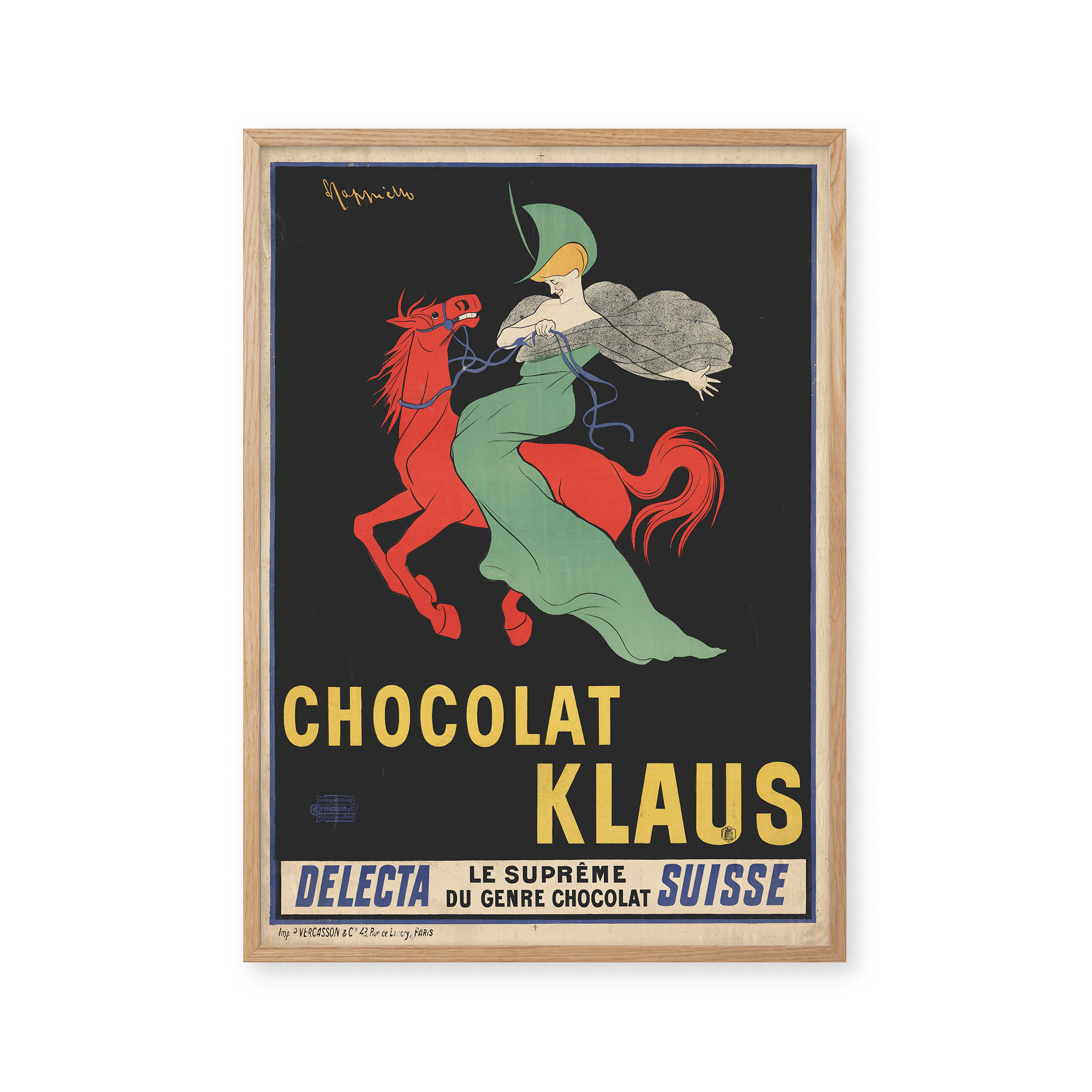 "Chocolat Klaus" - Oplev en farverig og unik plakat med en dramatisk rød hest og en elegant rytter i grøn kjole. Perfekt til at tilføje et strejf af vintage charme og kunstnerisk flair til dit hjem. Ideel til kunstelskere og samlere.