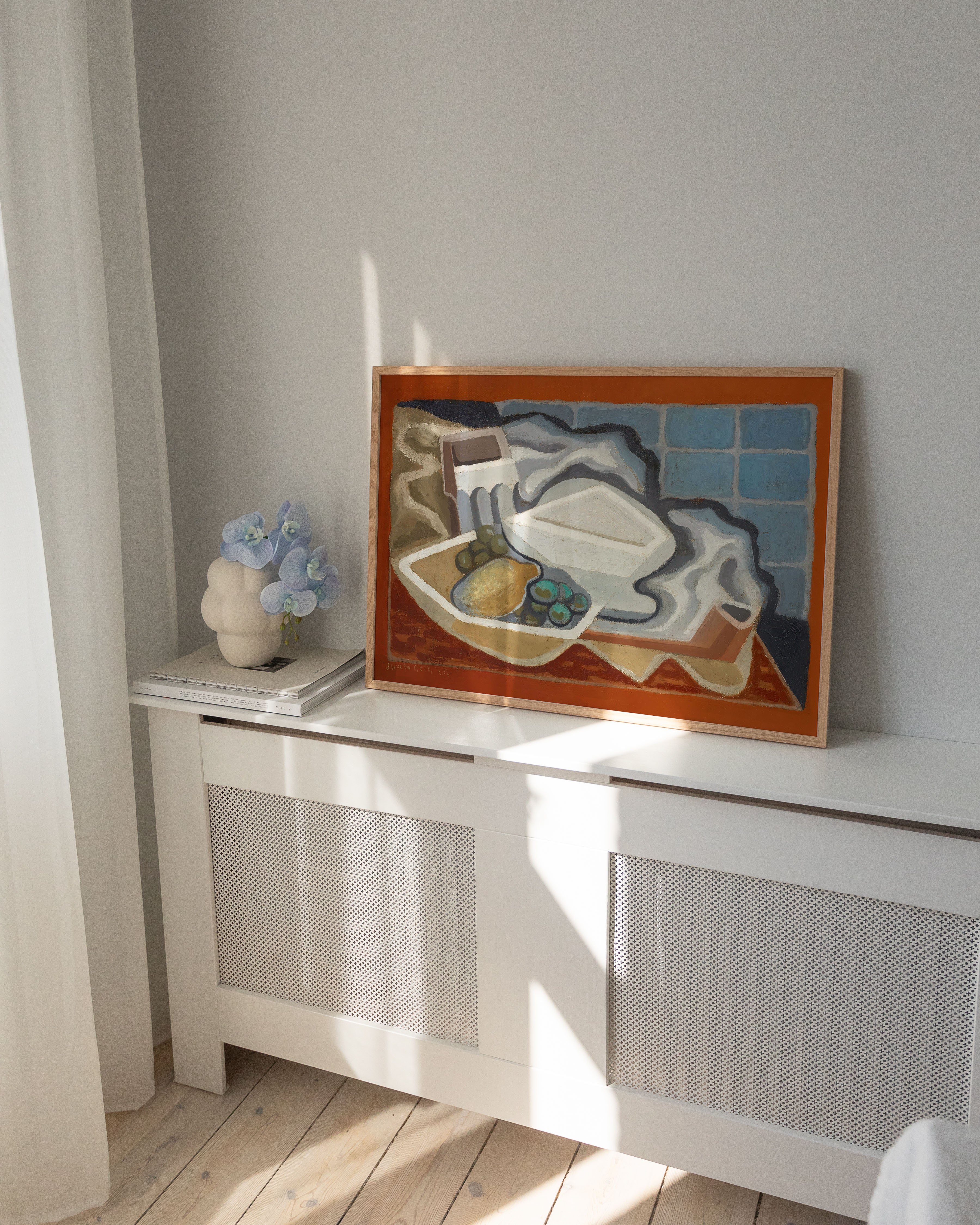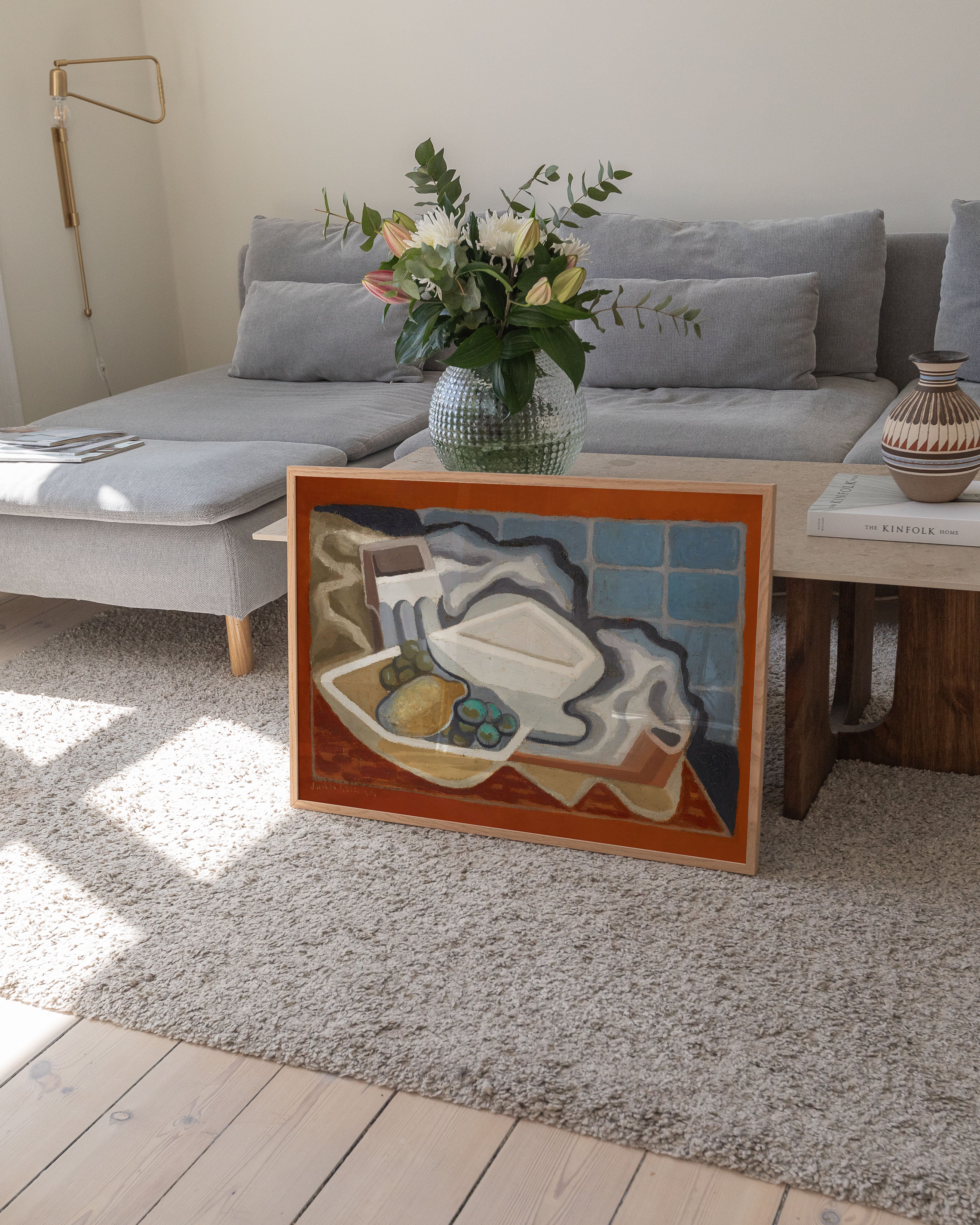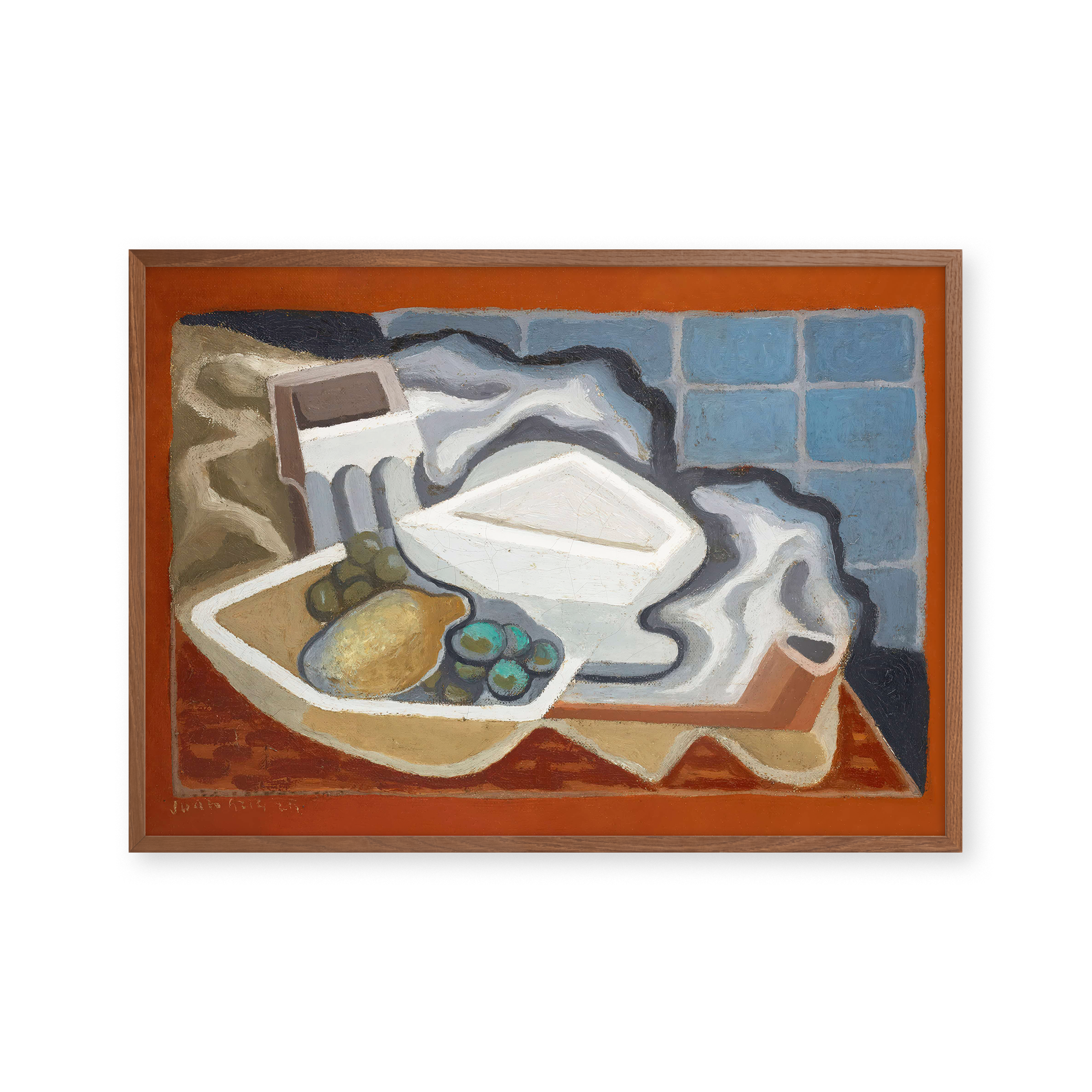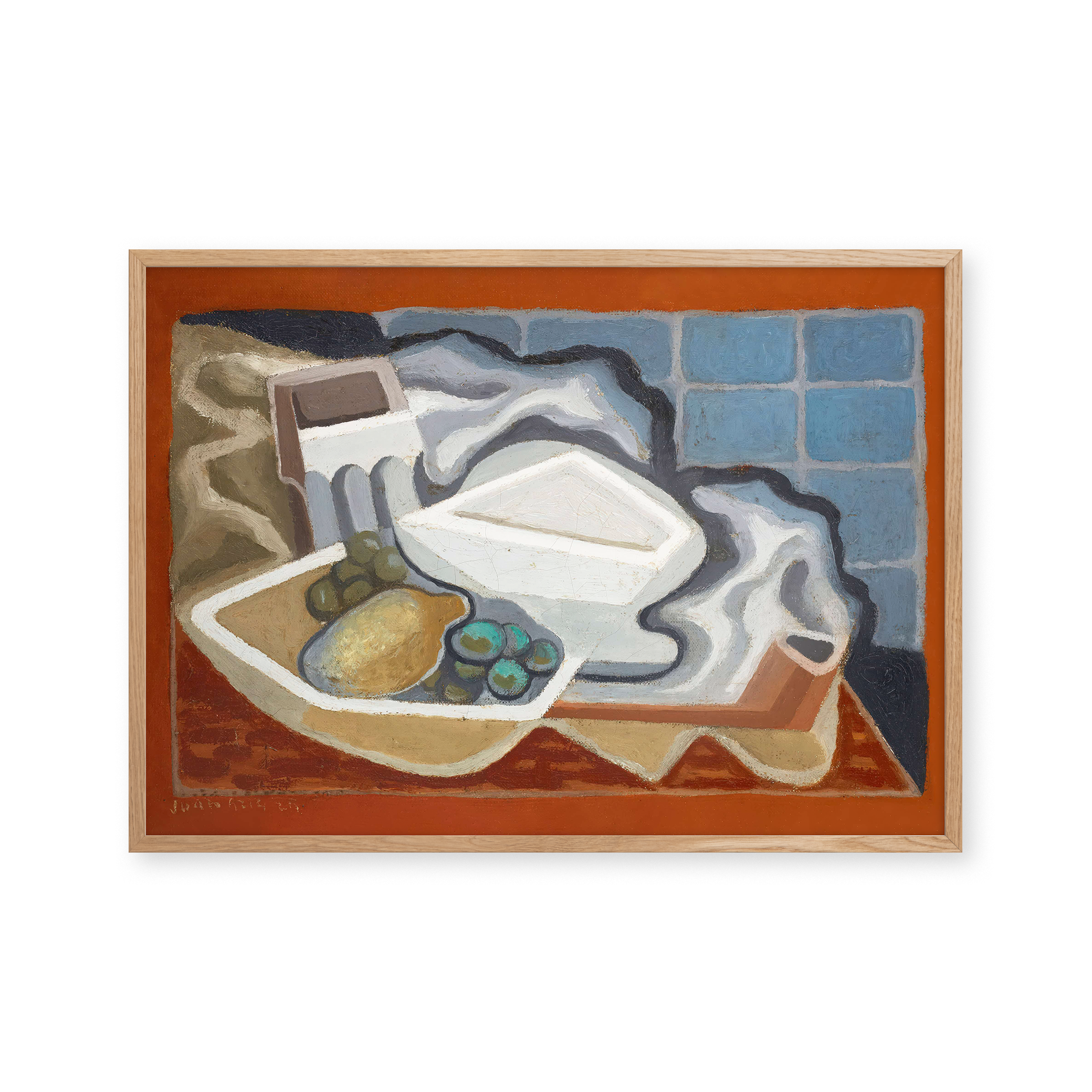 "Citron et raisin" - En farverig plakat, der fanger essensen af moderne kunst. Med levende nuancer af blå, orange og hvid, fremhæver den unikke elementer som citroner og druer. Perfekt til at tilføje et kunstnerisk touch til ethvert rum.