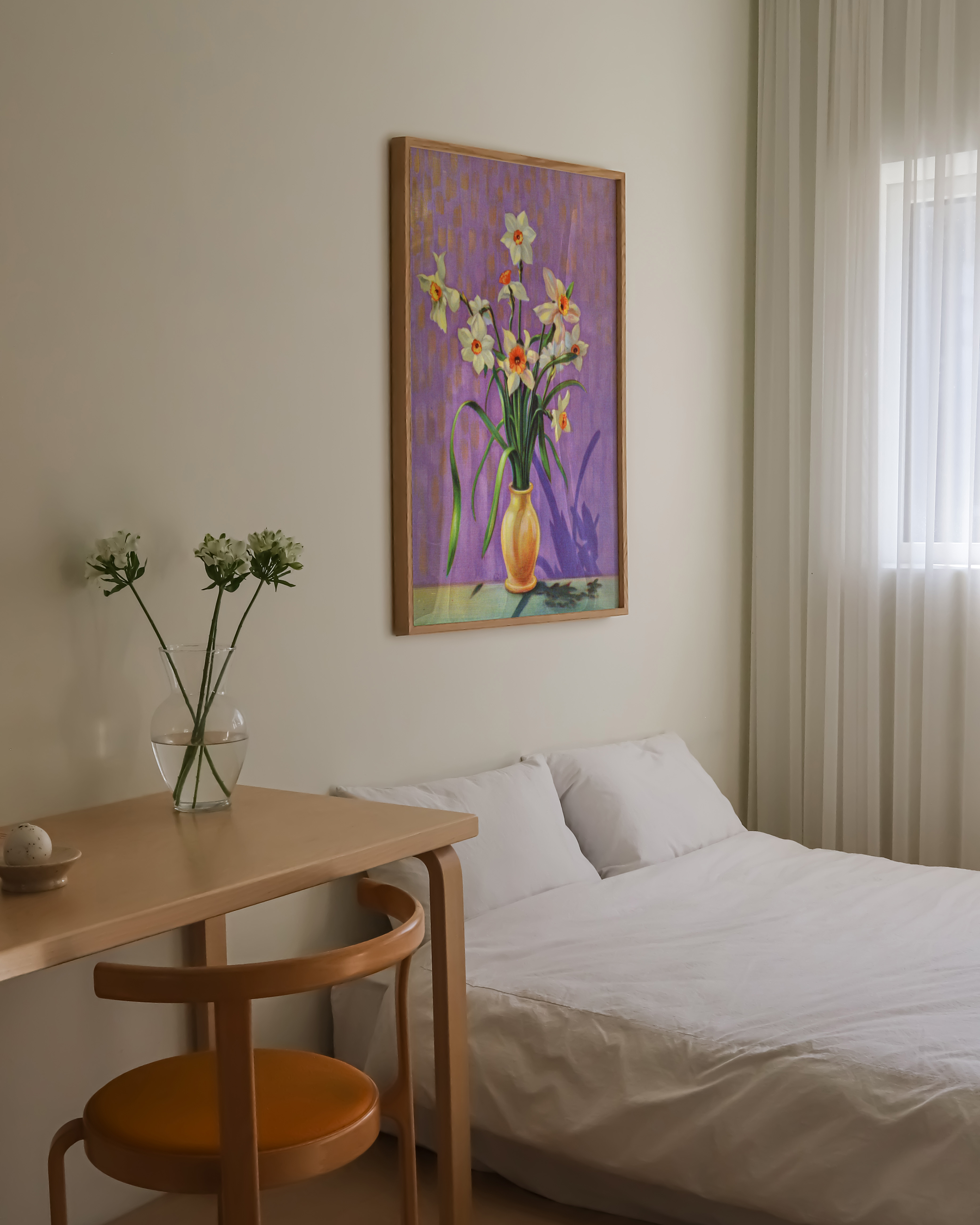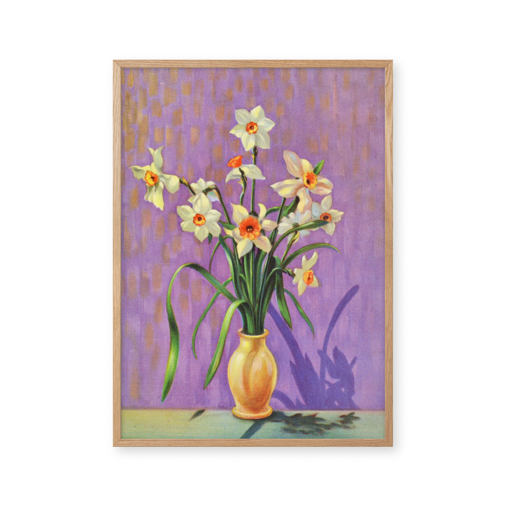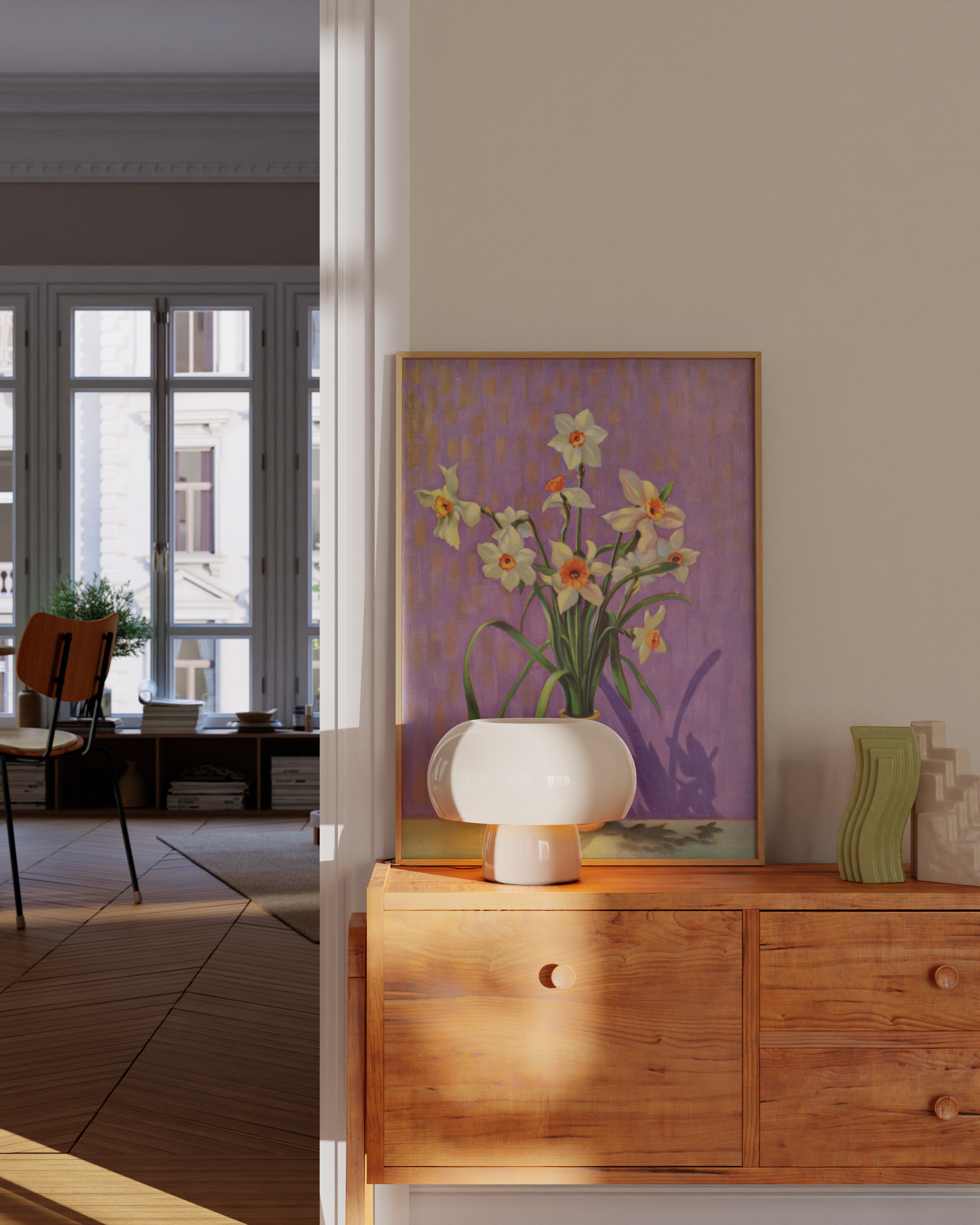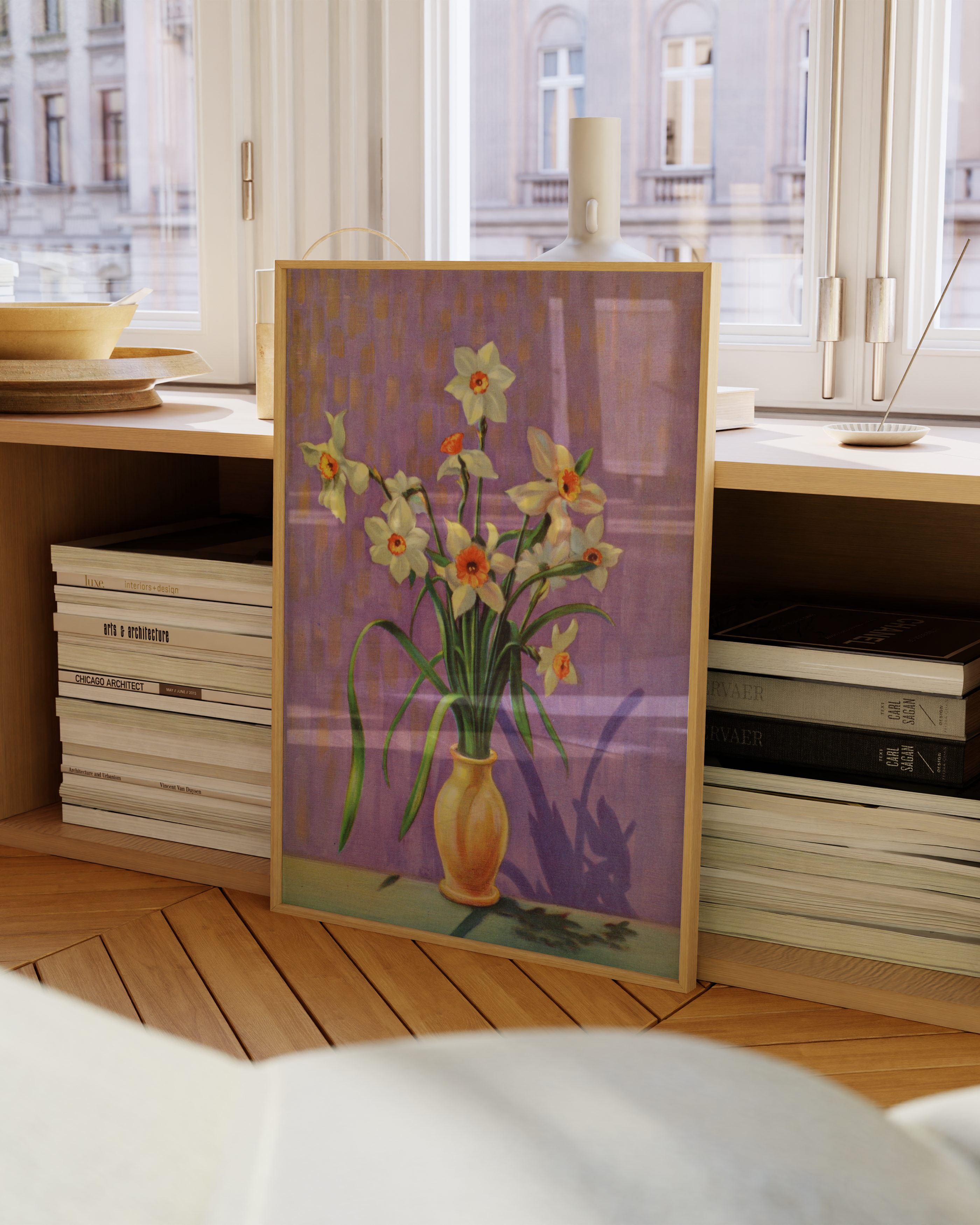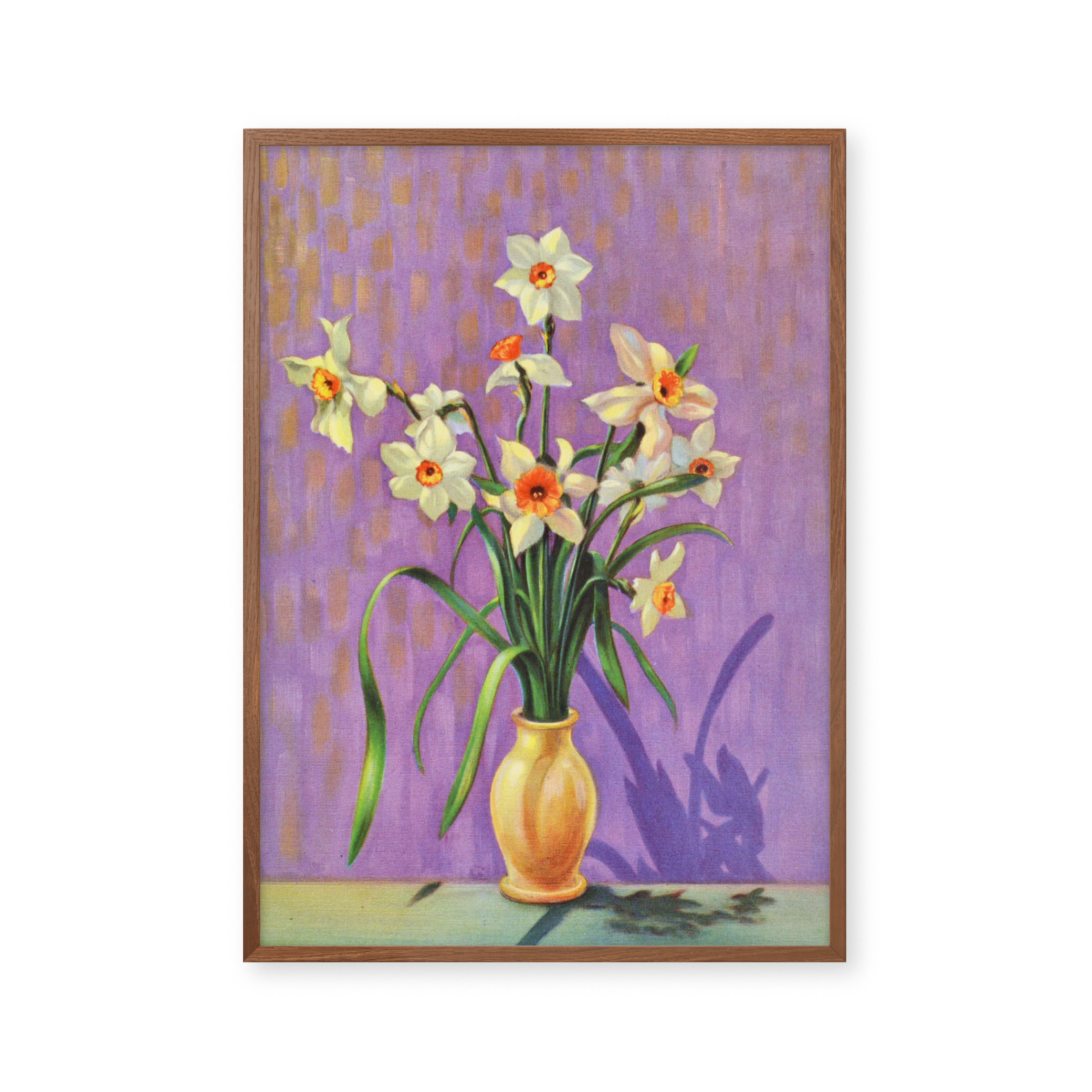 Opdag "Daffodil" plakaten, en visuel hyldest til foråret. Denne kunstneriske fortolkning fanger øjet med levende gule og hvide nuancer, kontrasteret mod en blid lilla baggrund. Perfekt til at tilføre et strejf af natur og elegance til ethvert rum. En must-have for blomsterelskere og farveentusiaster.