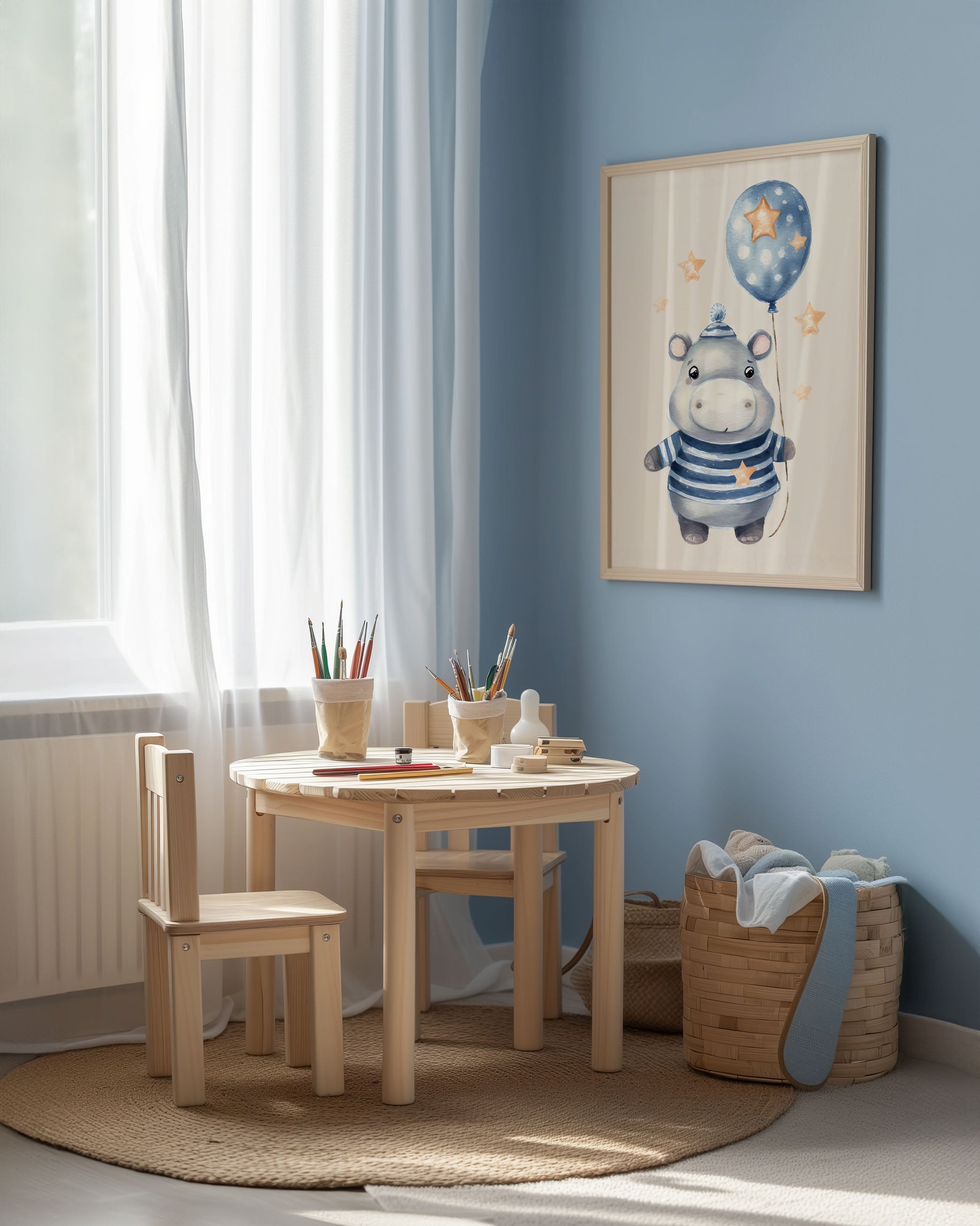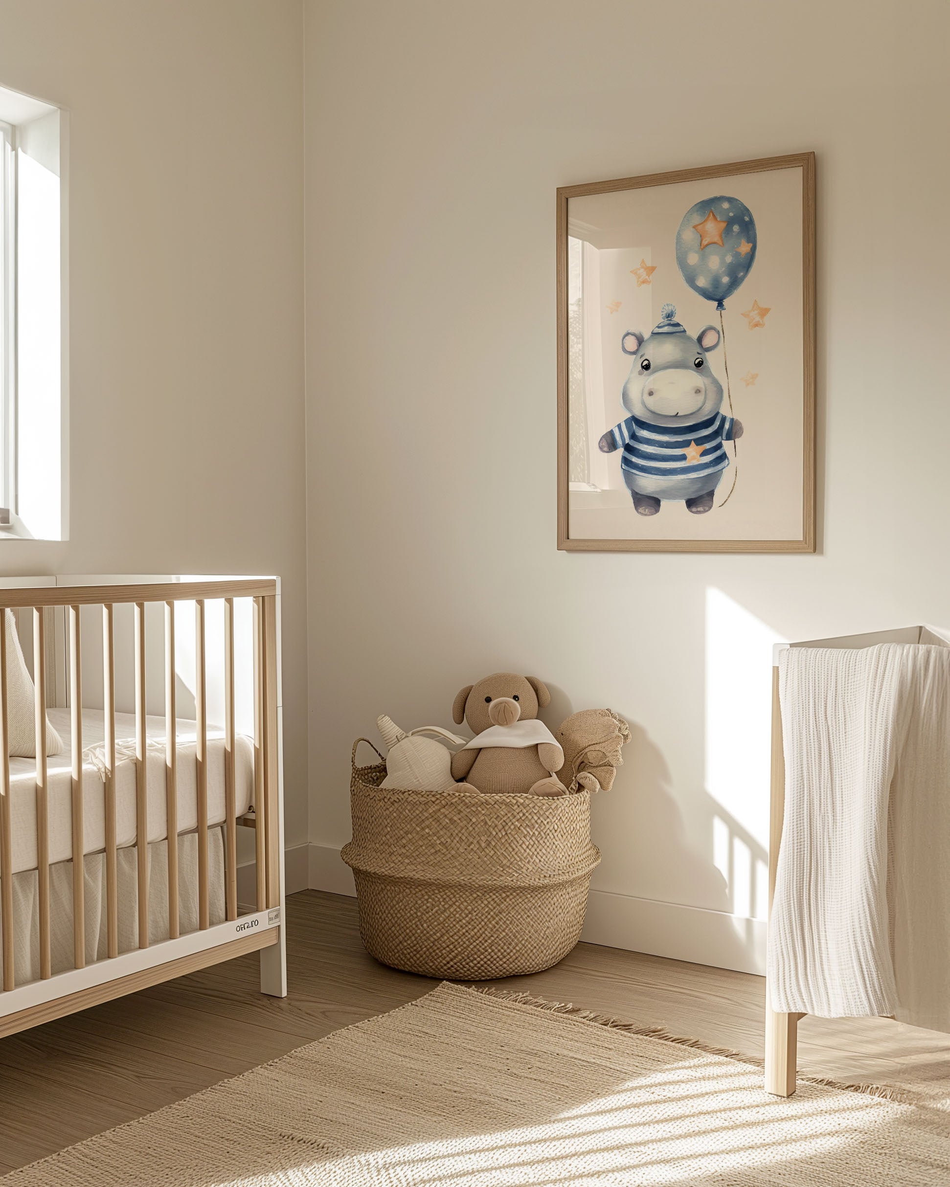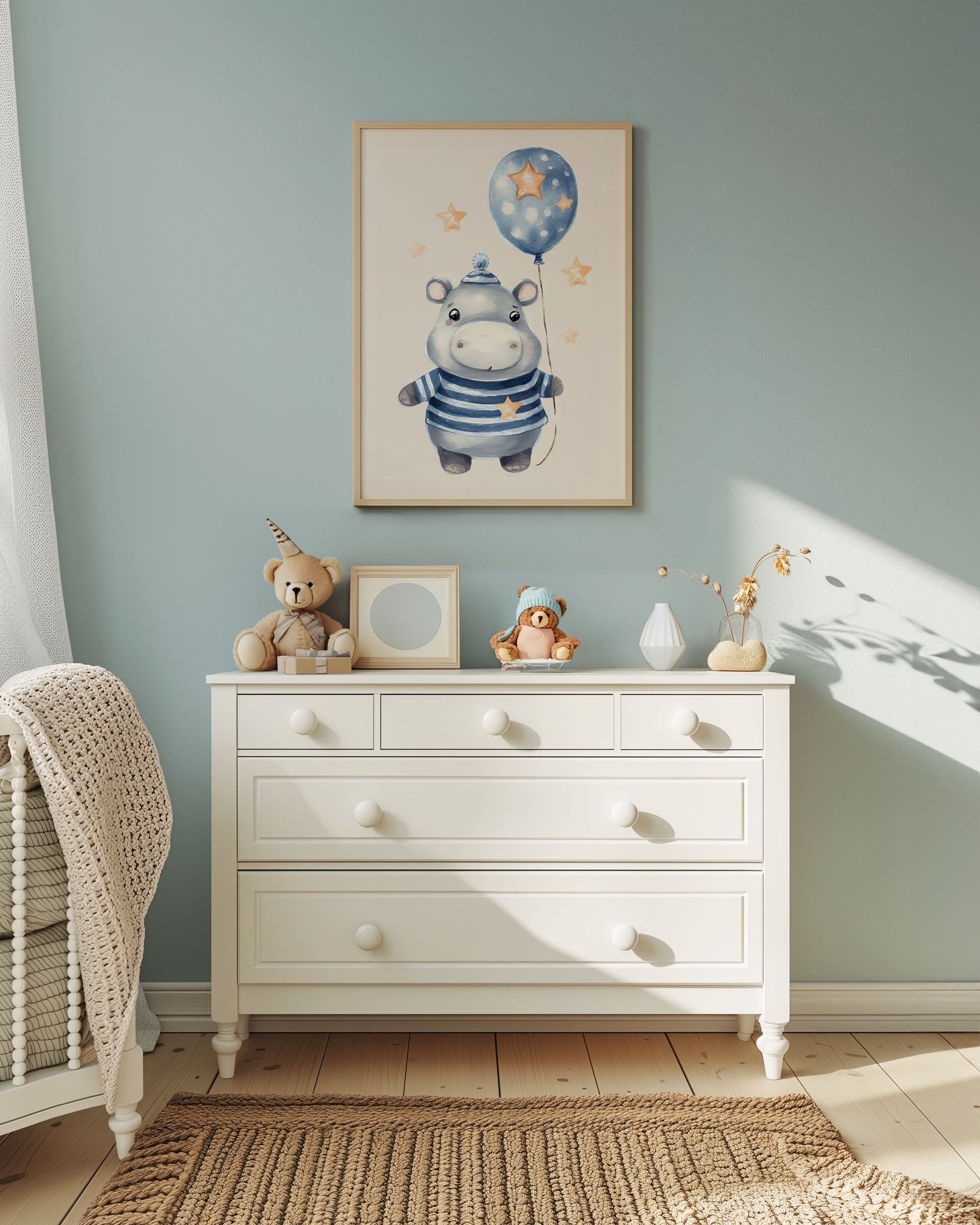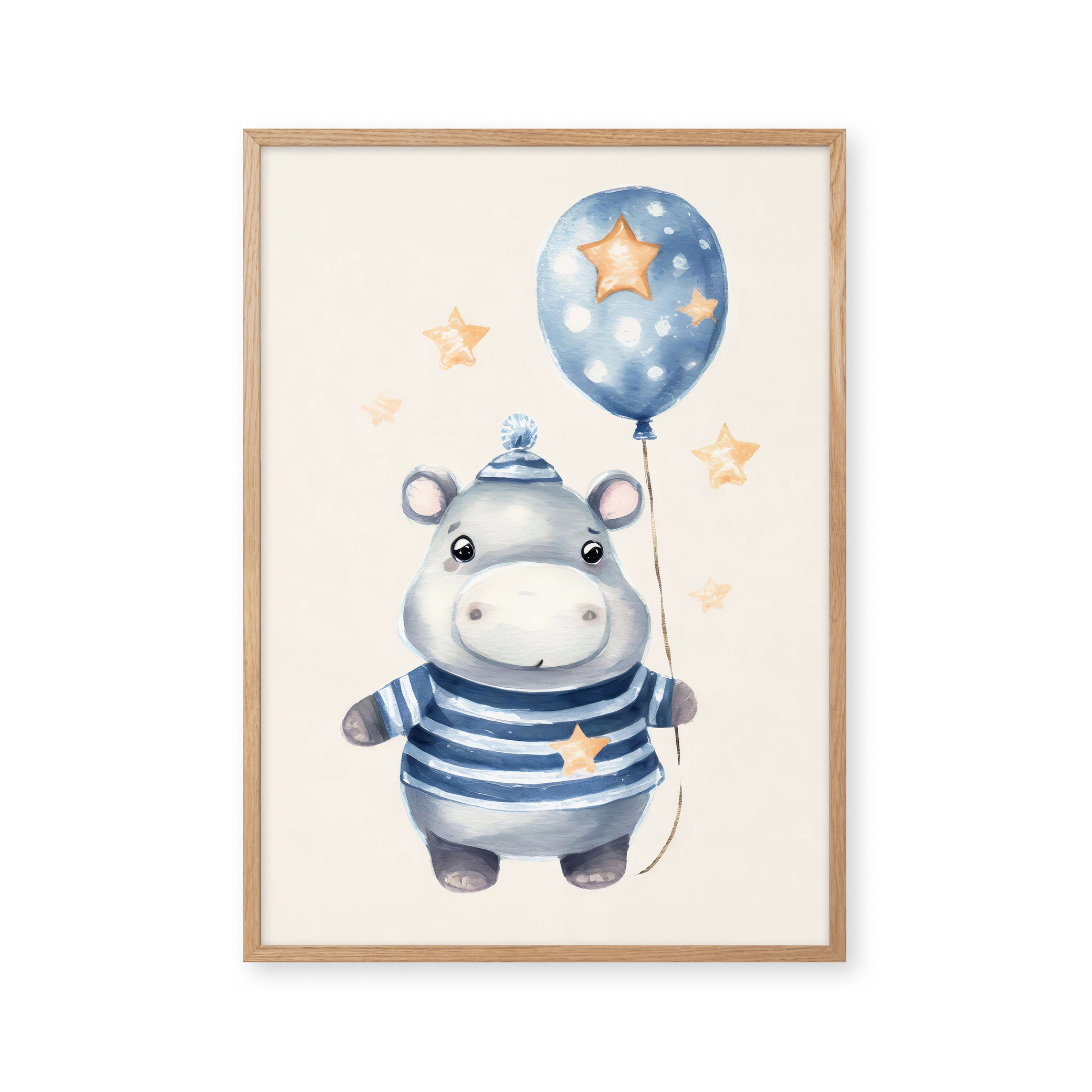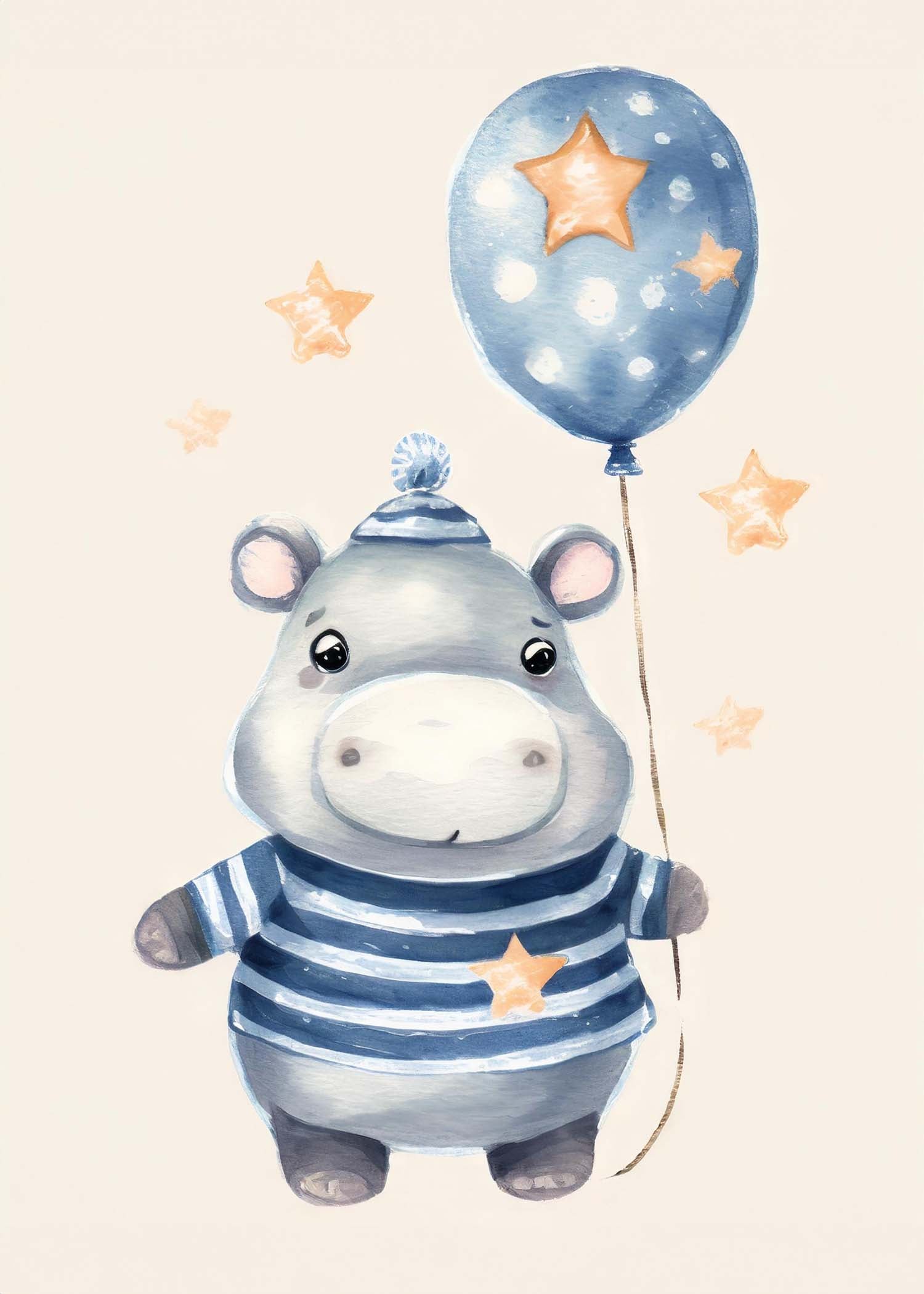 Opdag "Den Lille Flodhests Stjerneballon" plakat, hvor drømme og stjerneskær mødes. Denne charmerende illustration fanger hjertet med sin blide blå ballon, prikket med gyldne stjerner, og en nuttet flodhest i matchende striber. Perfekt til børneværelset, denne plakat tilføjer et strejf af magi og farveglæde.