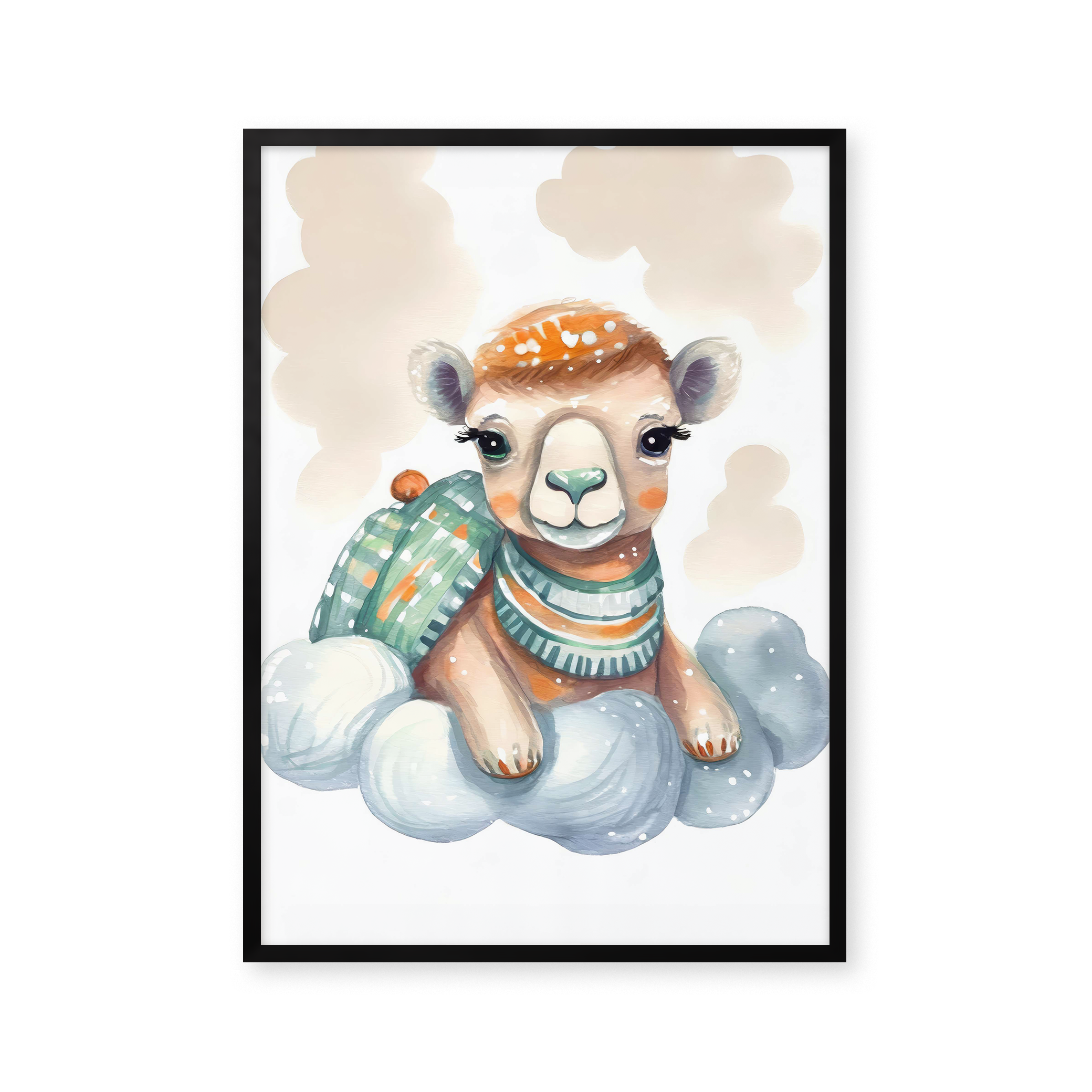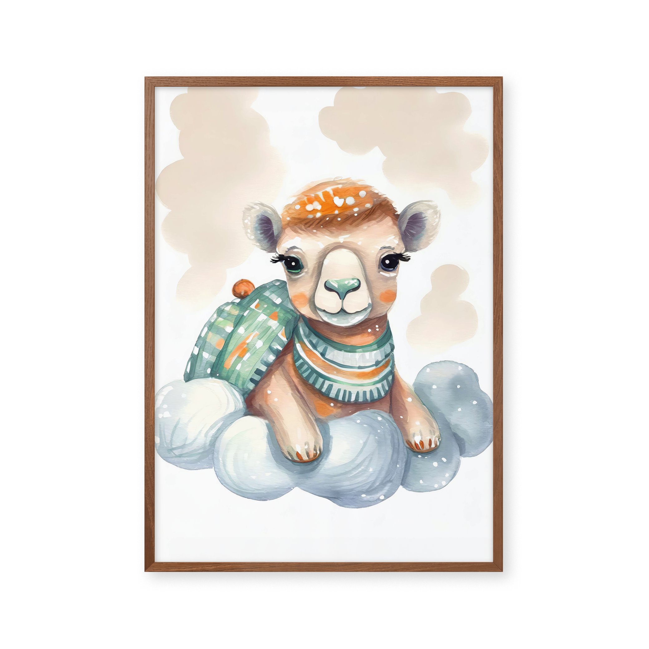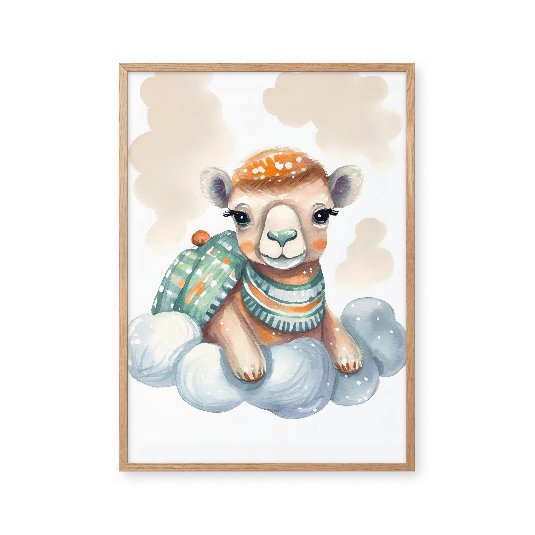 Oplev 'Den Lille Kamels Vinterdrøm' plakat, hvor varme nuancer møder vintermagi. Denne charmerende illustration fanger hjertet med sin nuttede kamel, klædt i en hyggelig sweater og hue, omgivet af bløde snefnug. Perfekt til at tilføre et strejf af glæde og farve til ethvert rum.