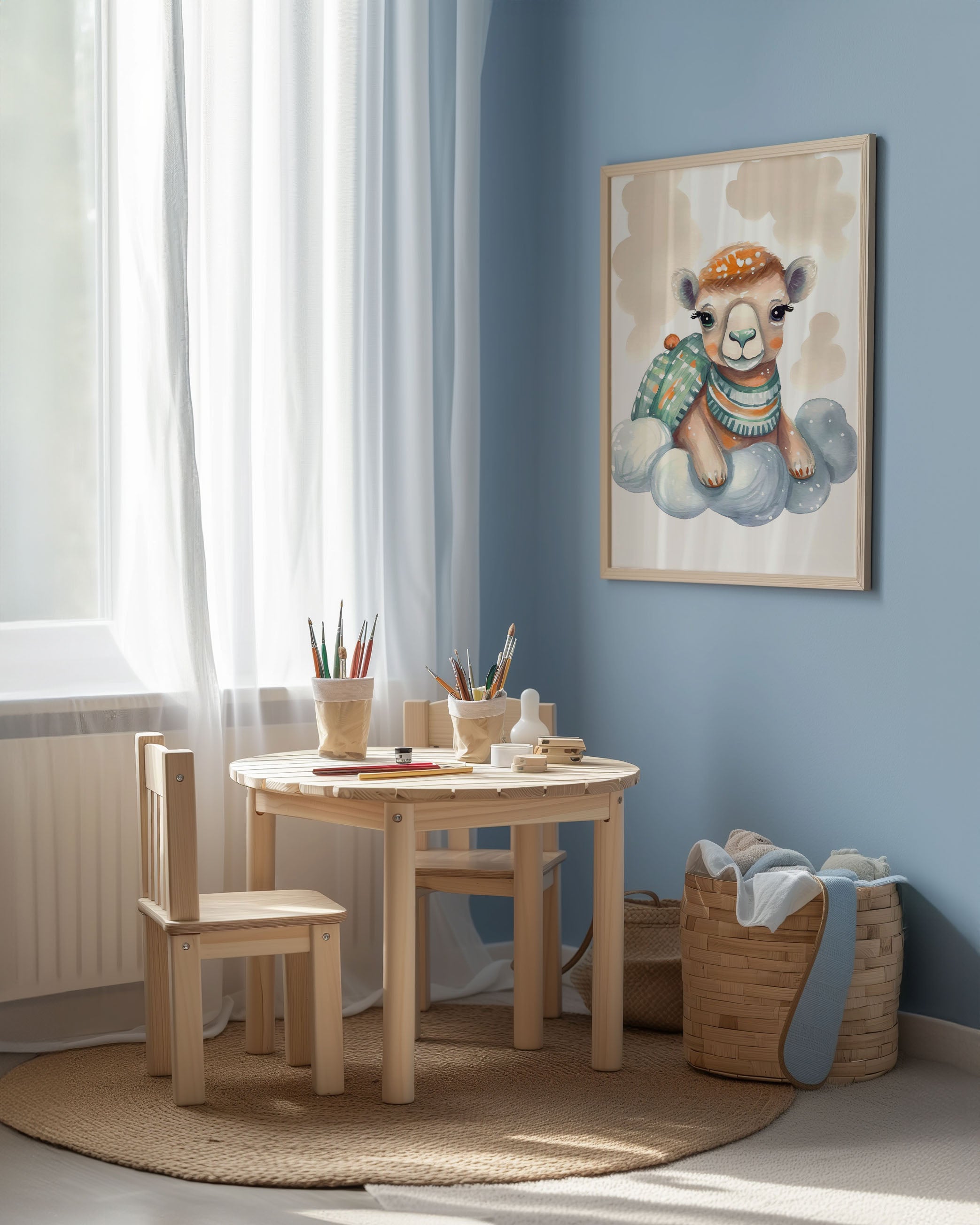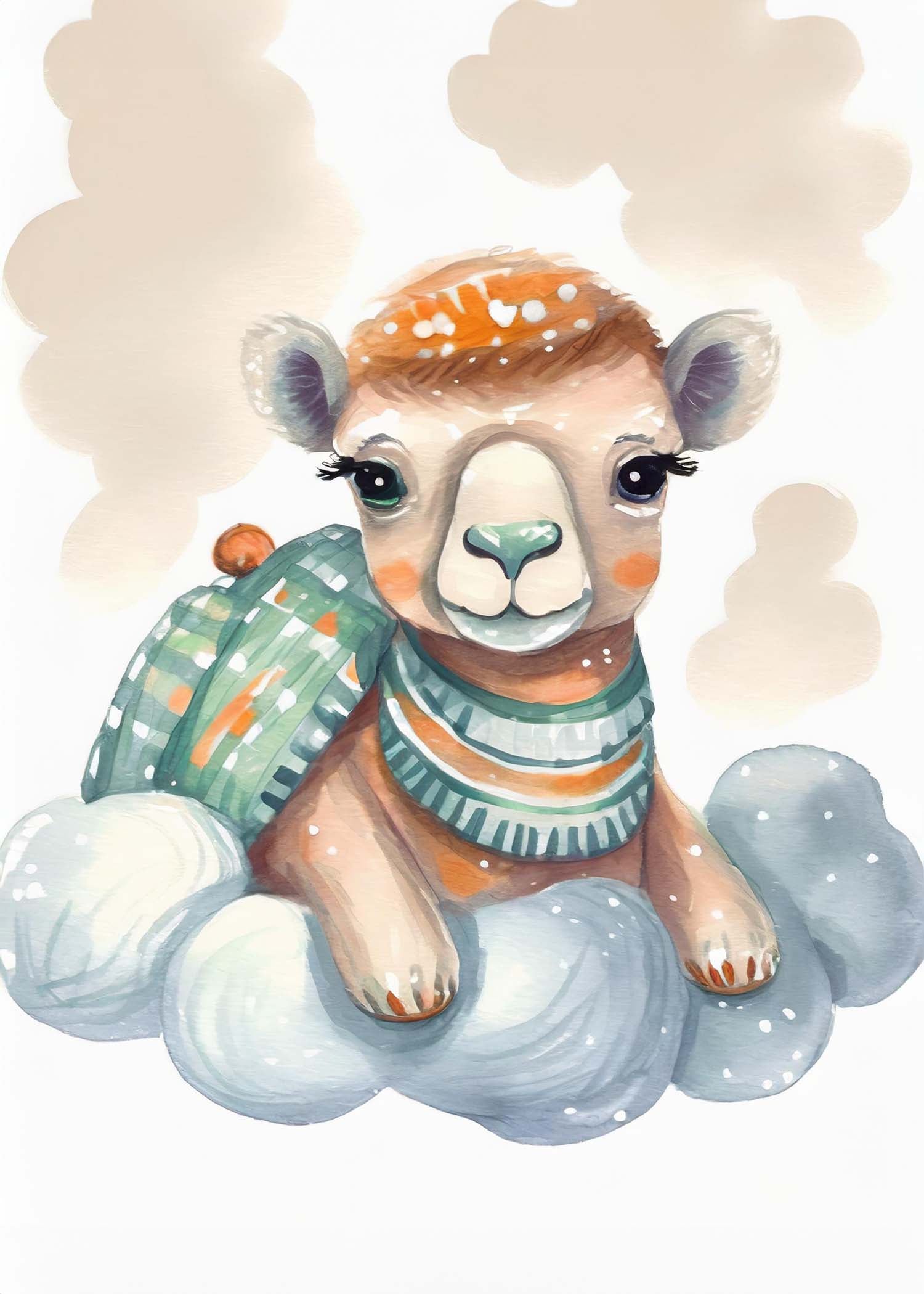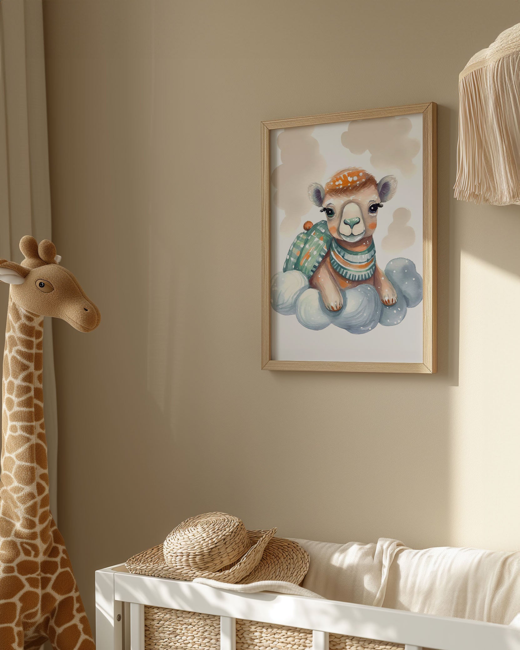 Oplev 'Den Lille Kamels Vinterdrøm' plakat, hvor varme nuancer møder vintermagi. Denne charmerende illustration fanger hjertet med sin nuttede kamel, klædt i en hyggelig sweater og hue, omgivet af bløde snefnug. Perfekt til at tilføre et strejf af glæde og farve til ethvert rum.