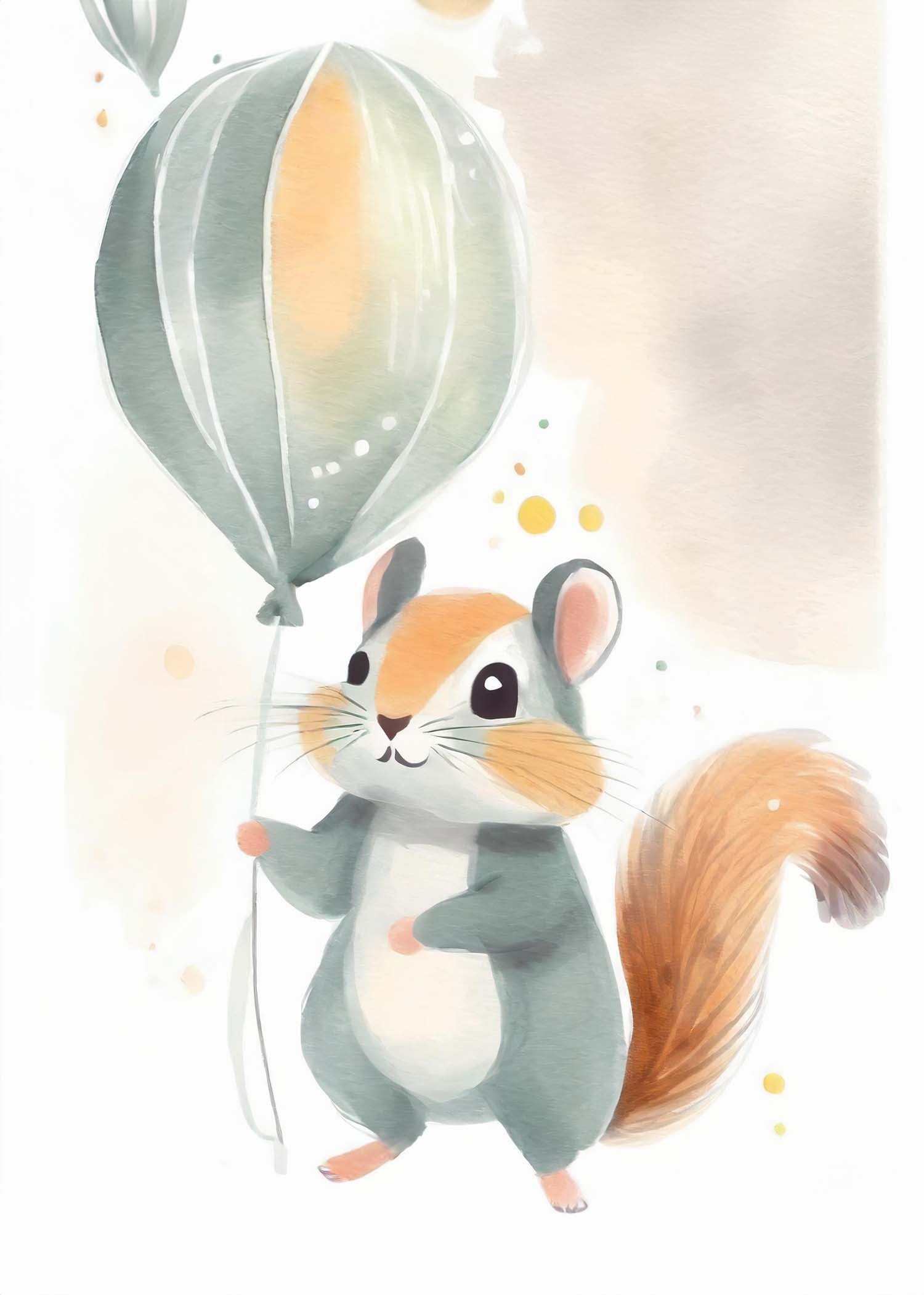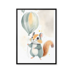 Oplev "Egernets Flyvefest" - en charmerende plakat, der bringer et strejf af eventyr til dit rum. De blide pastelfarver og det legesyge egern, der svæver mod skyerne med sin ballon, skaber en drømmende atmosfære. Perfekt til børneværelset eller som en unik gave.