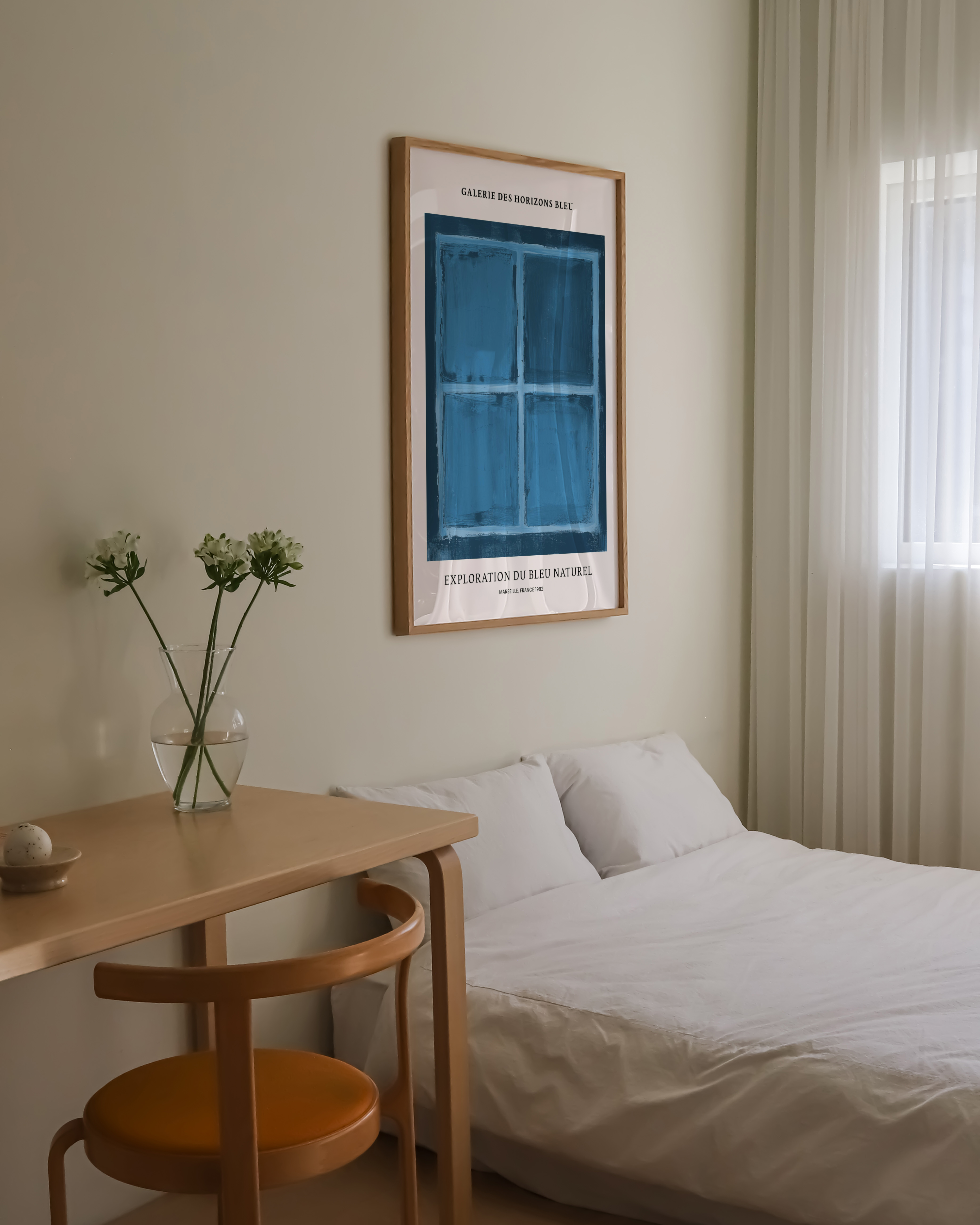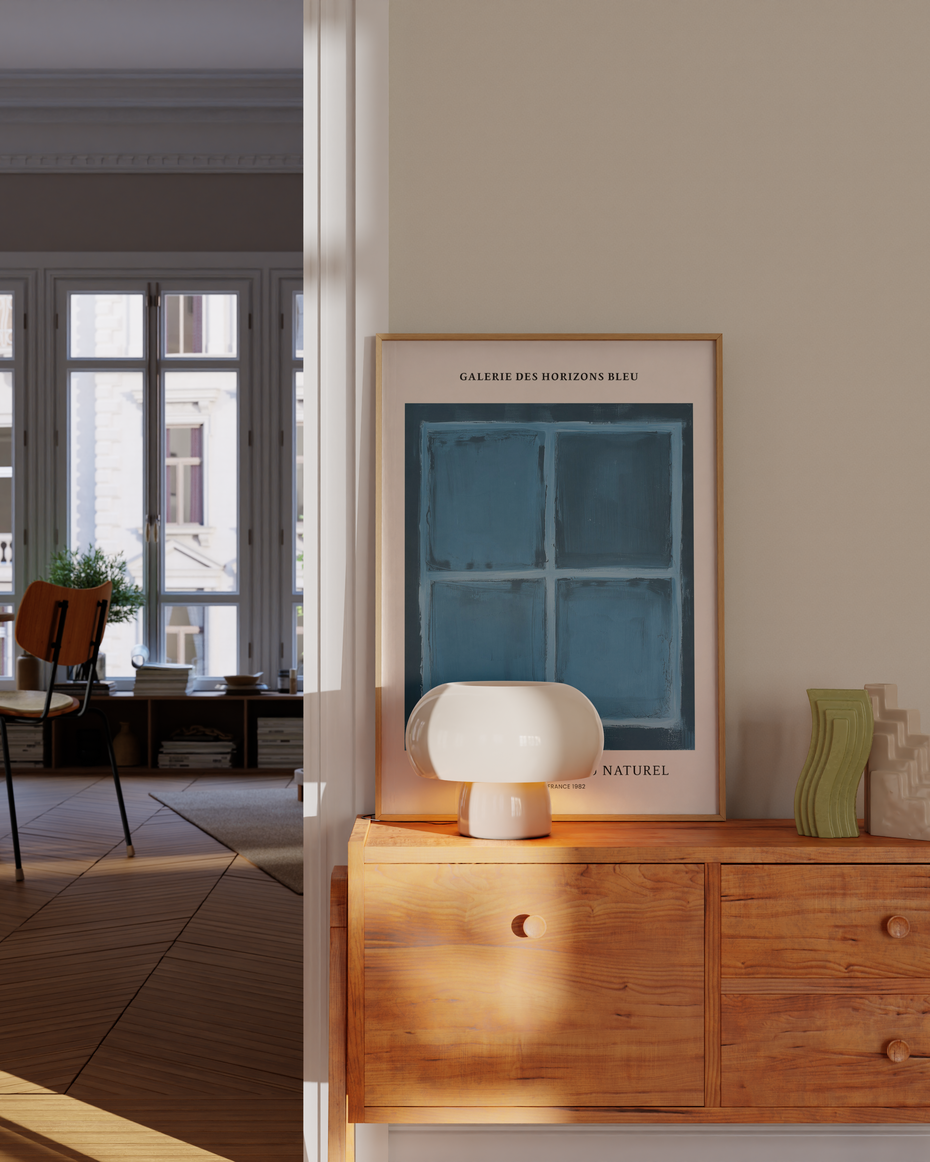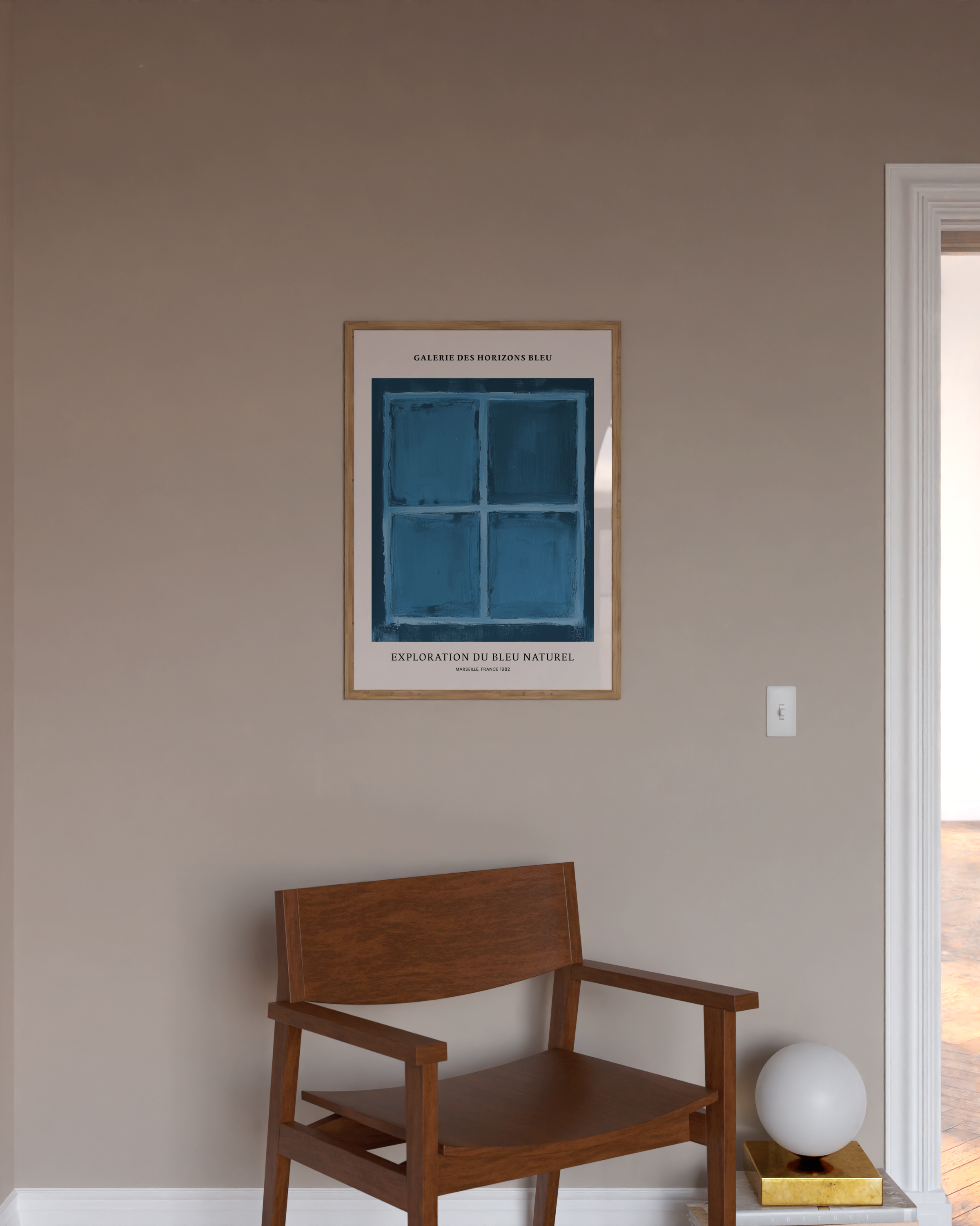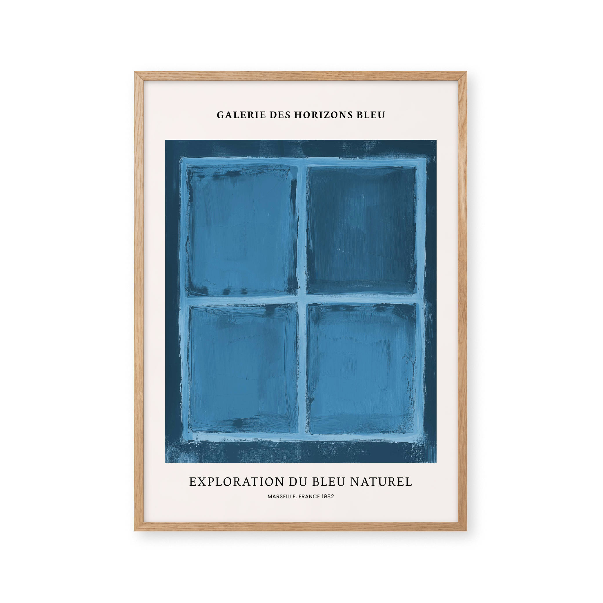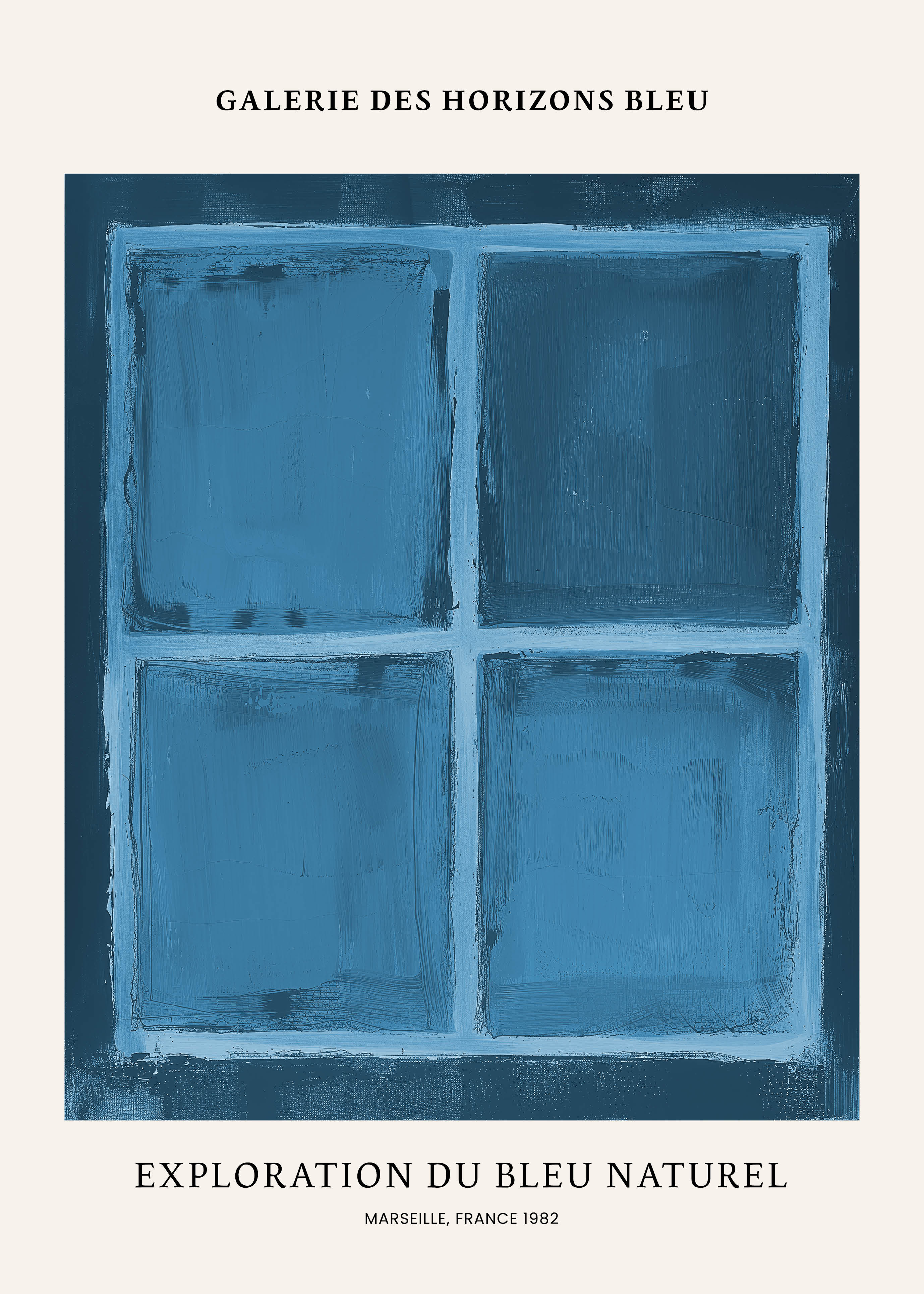 Opdag 'Exploration du Bleu Naturel', en eksklusiv plakat fra Galerie des Horizons Bleu. Denne 1982 Marseille-kunstskat fremviser dyb, beroligende blåtoner i et hypnotiserende kvadratisk mønster, perfekt til at tilføre et strejf af elegance og ro til ethvert moderne hjem.
