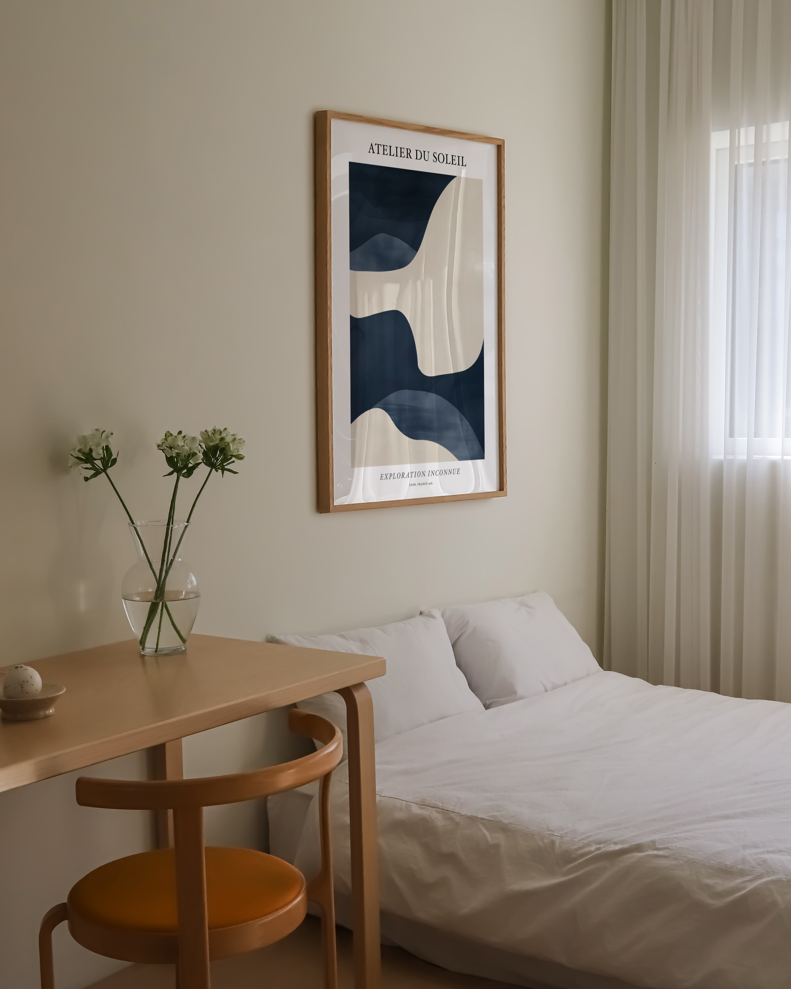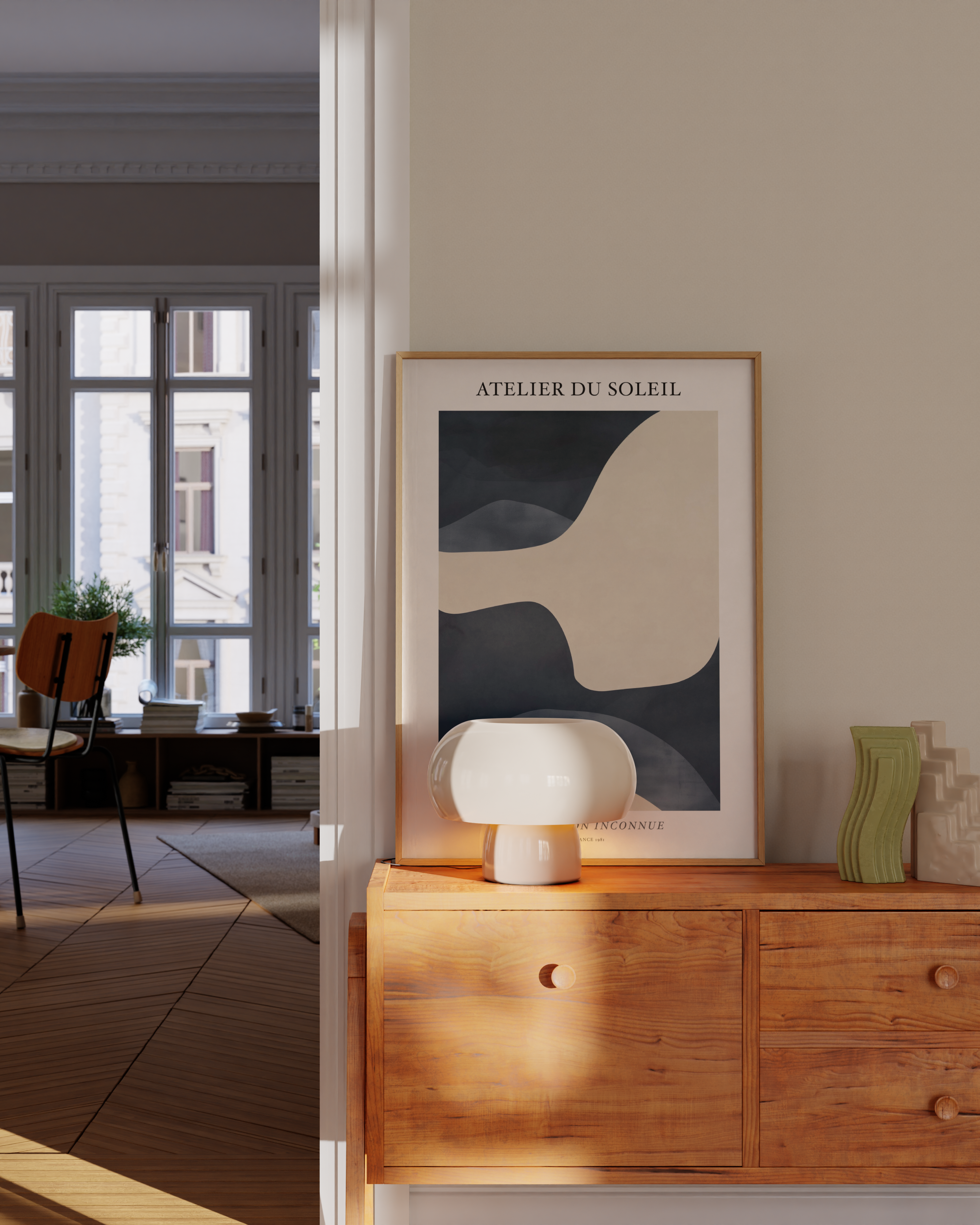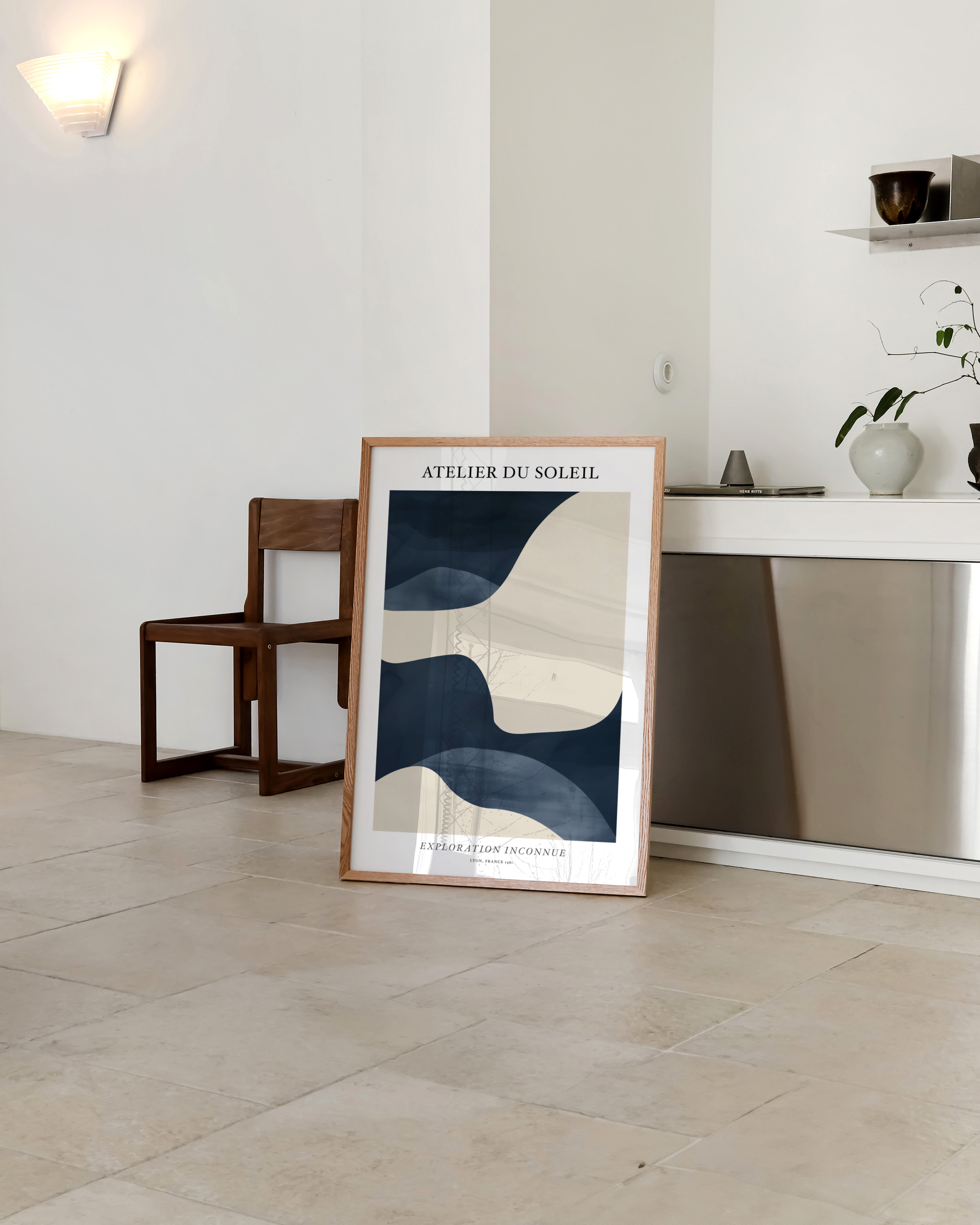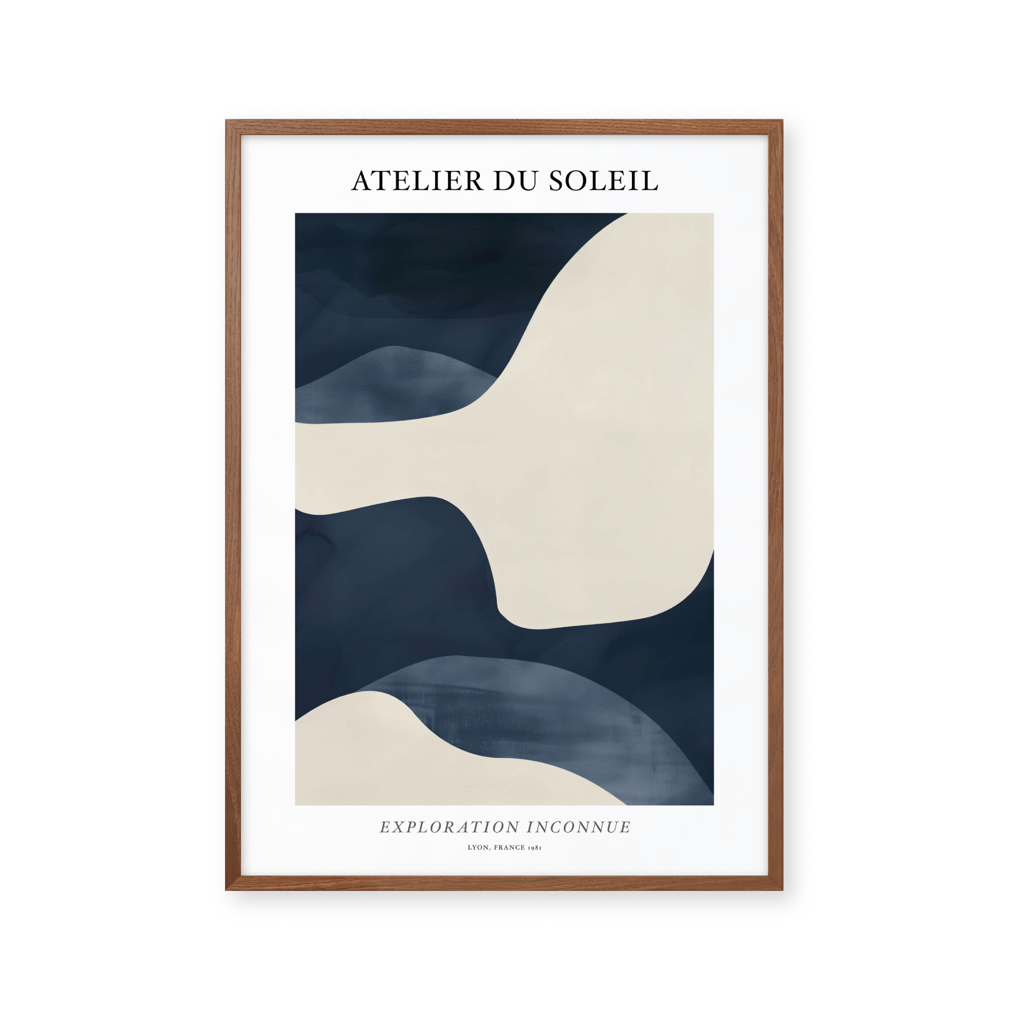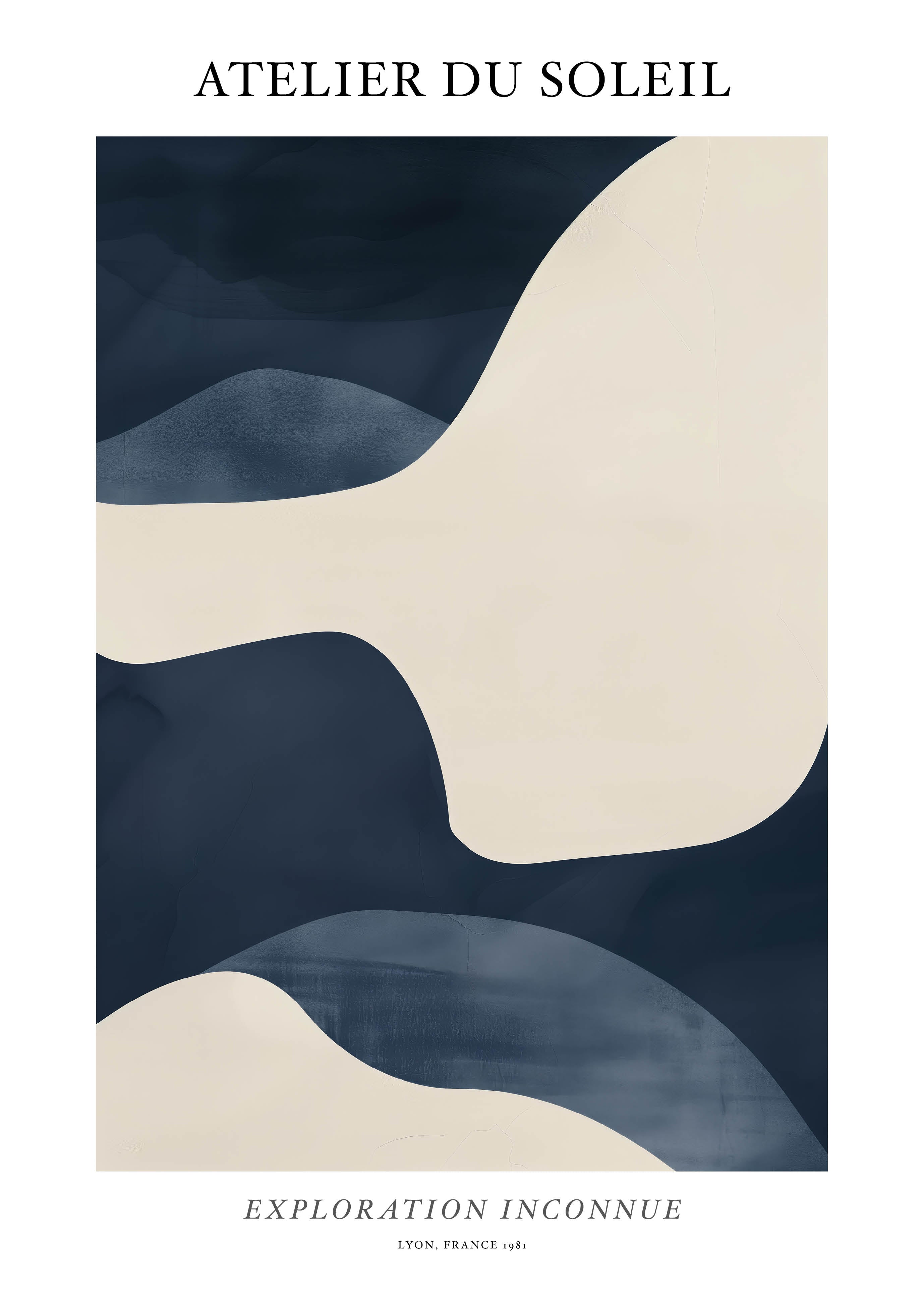 Opdag "Atelier du Soleil" plakaten, en visuel rejse i bløde bølger af cremet beige og dyb marineblå. Perfekt til at tilføje et strejf af elegance og mystik til ethvert rum. Denne plakat, med sit moderne design, inviterer til udforskning og fordybelse. Ideal til kunstelskere og trendsettere.