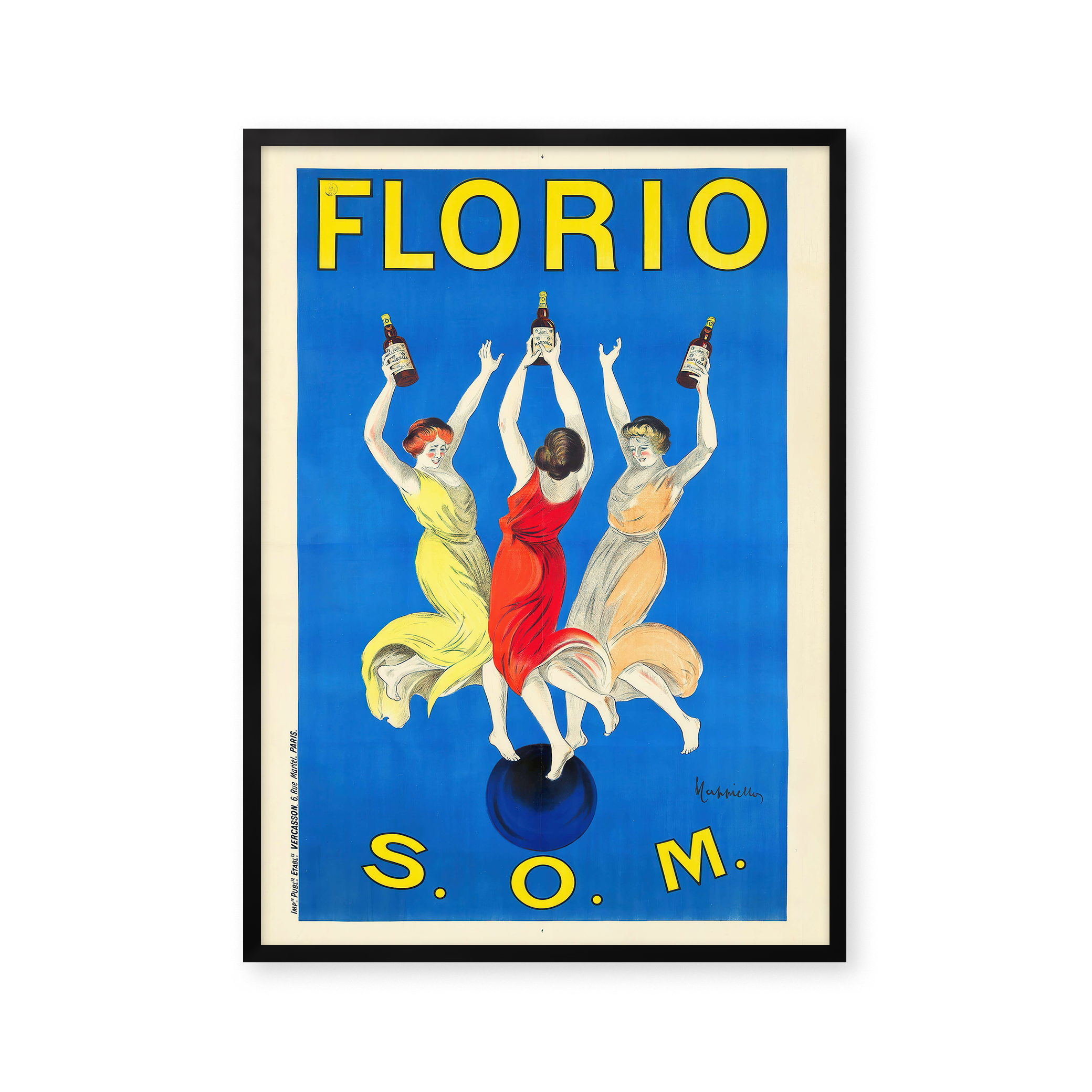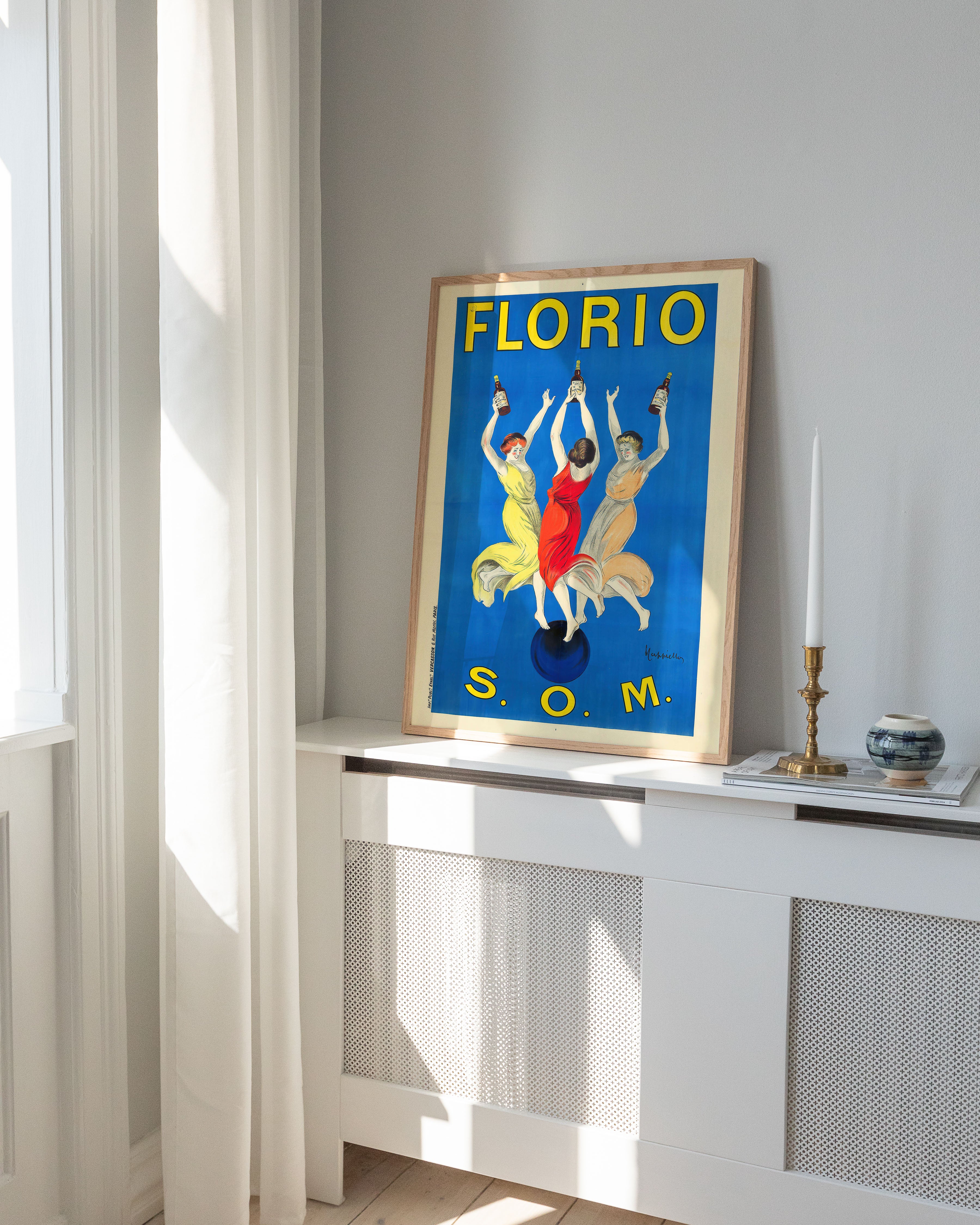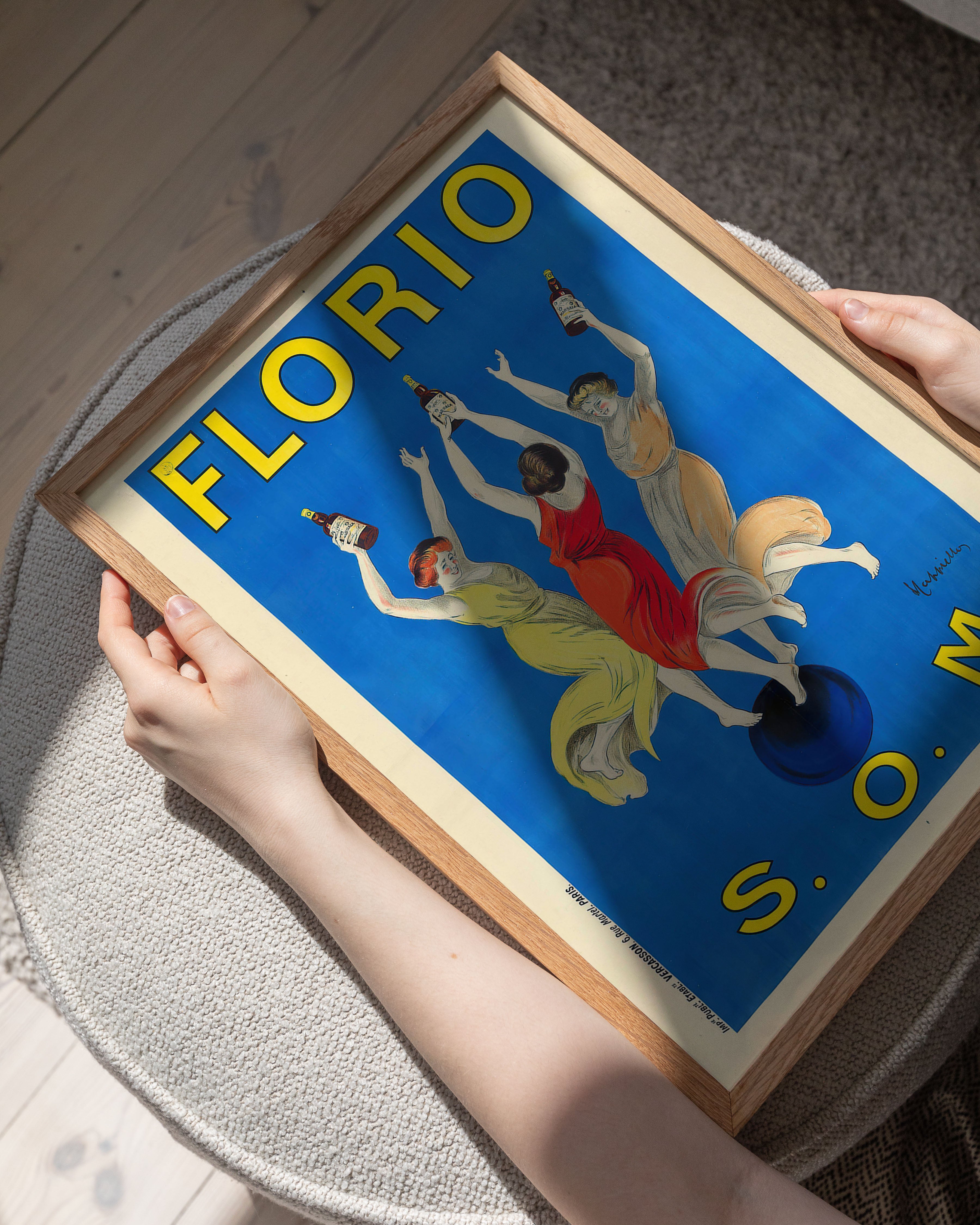 "Florio" - Oplev en eksplosion af farver med denne livlige plakat. Tre dansende figurer i strålende røde, gule og orange nuancer mod en dybblå baggrund. Perfekt til at tilføje et unikt og energisk touch til ethvert rum.