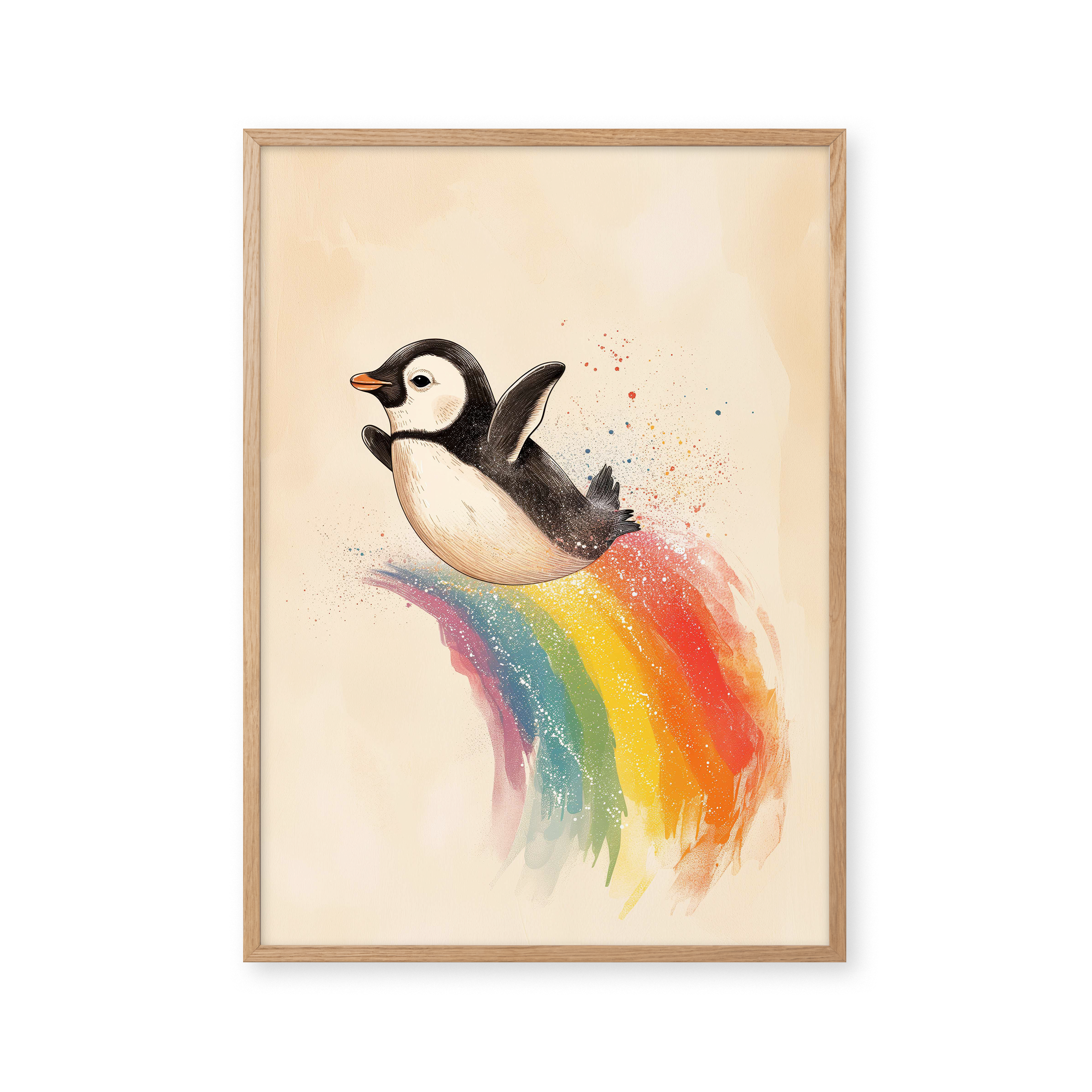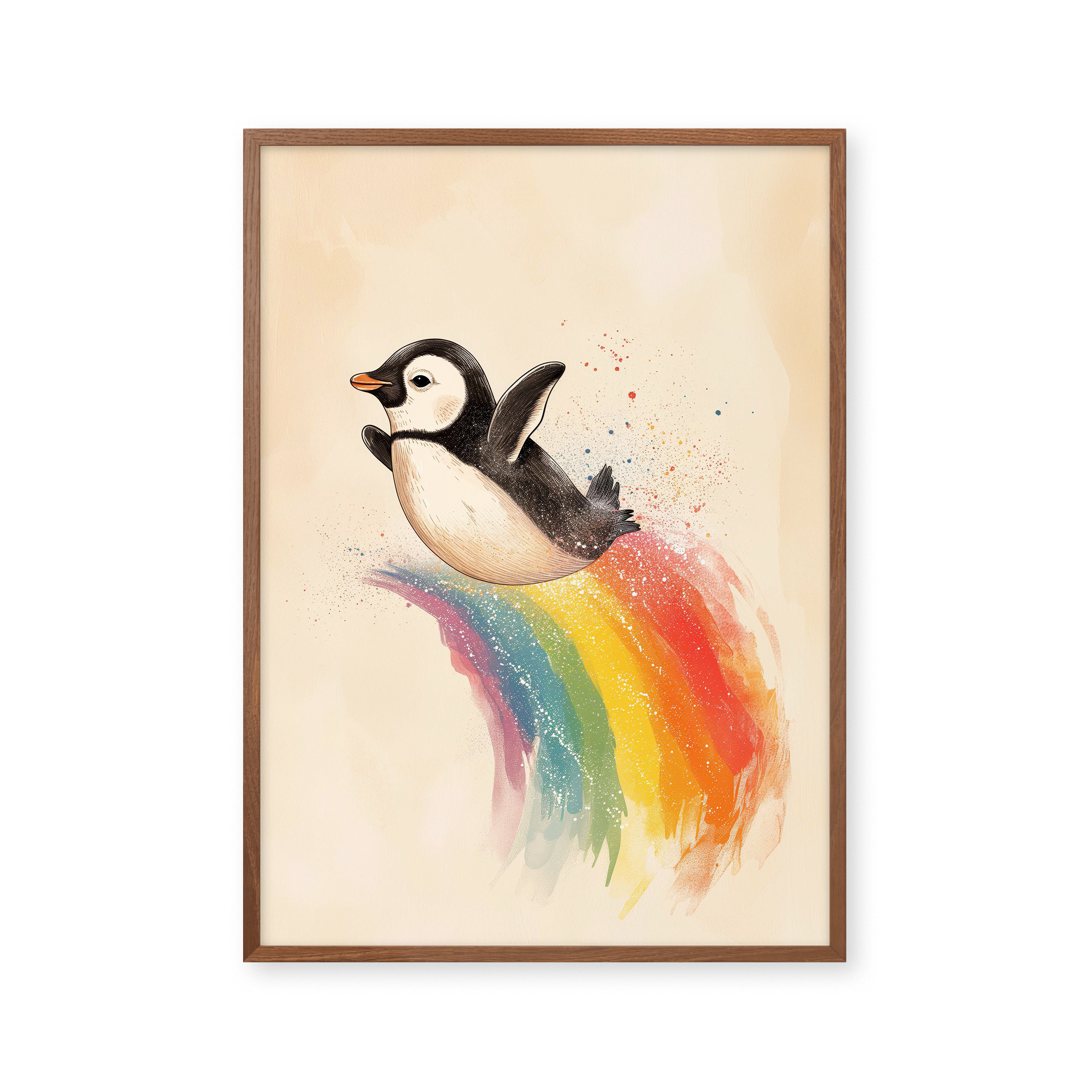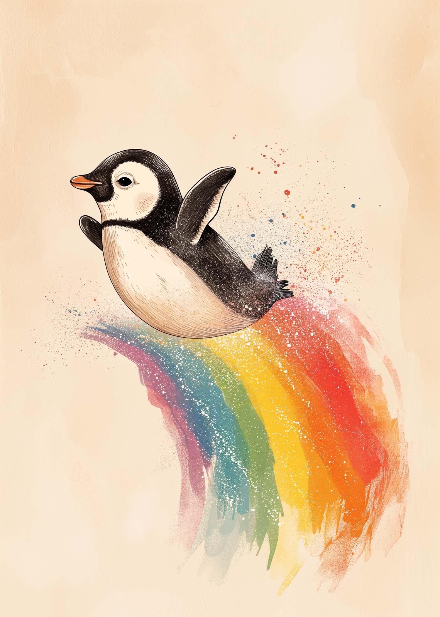Oplev 'Glitrende Farveflugt' – en plakat, der fanger øjet med en legesyg pingvin i flugt over en sprudlende regnbuefarveeksplosion. Perfekt til at tilføre et strejf af fantasi og farverig charme til ethvert rum. En ægte samtalestarter, der lyser op og inspirerer.