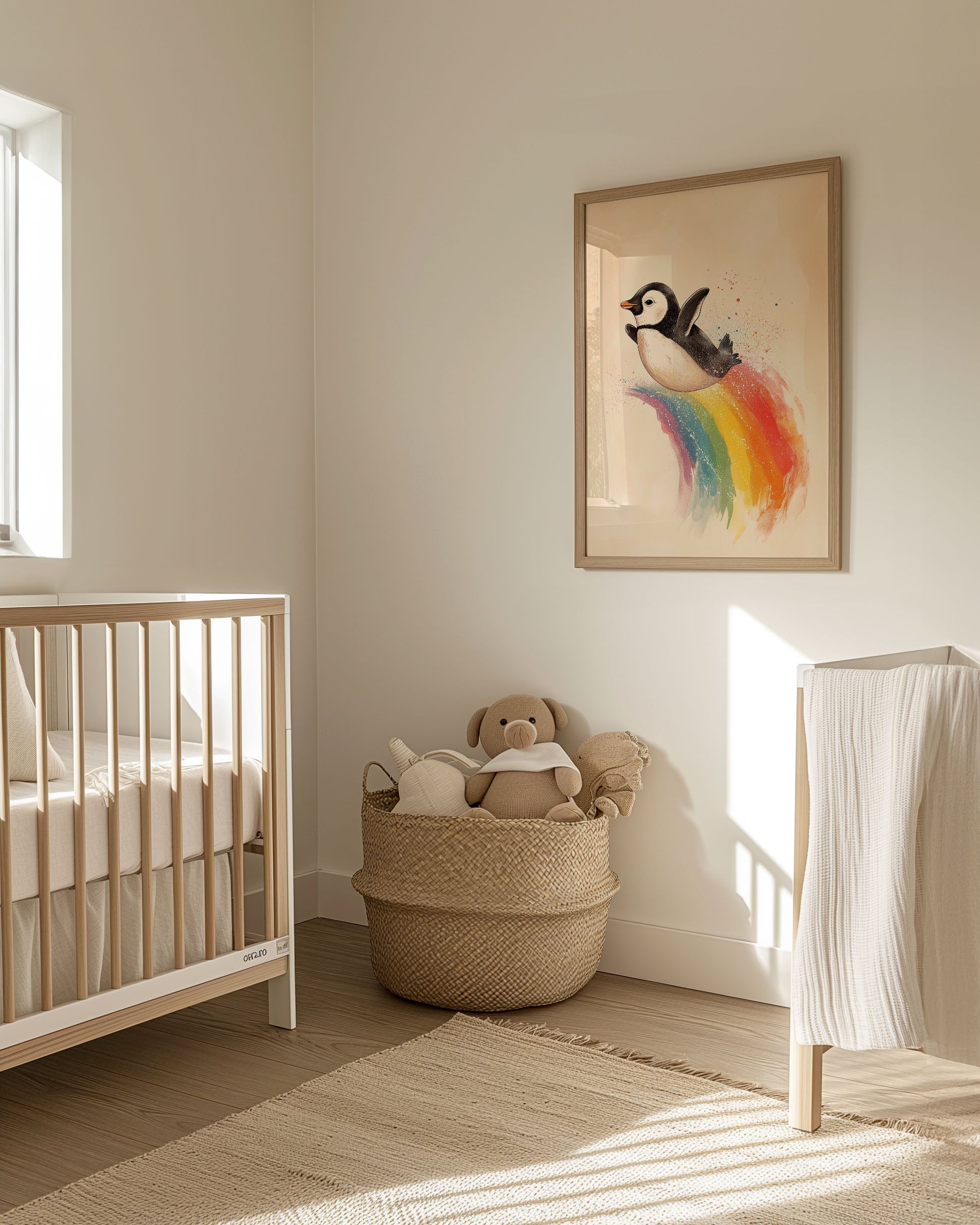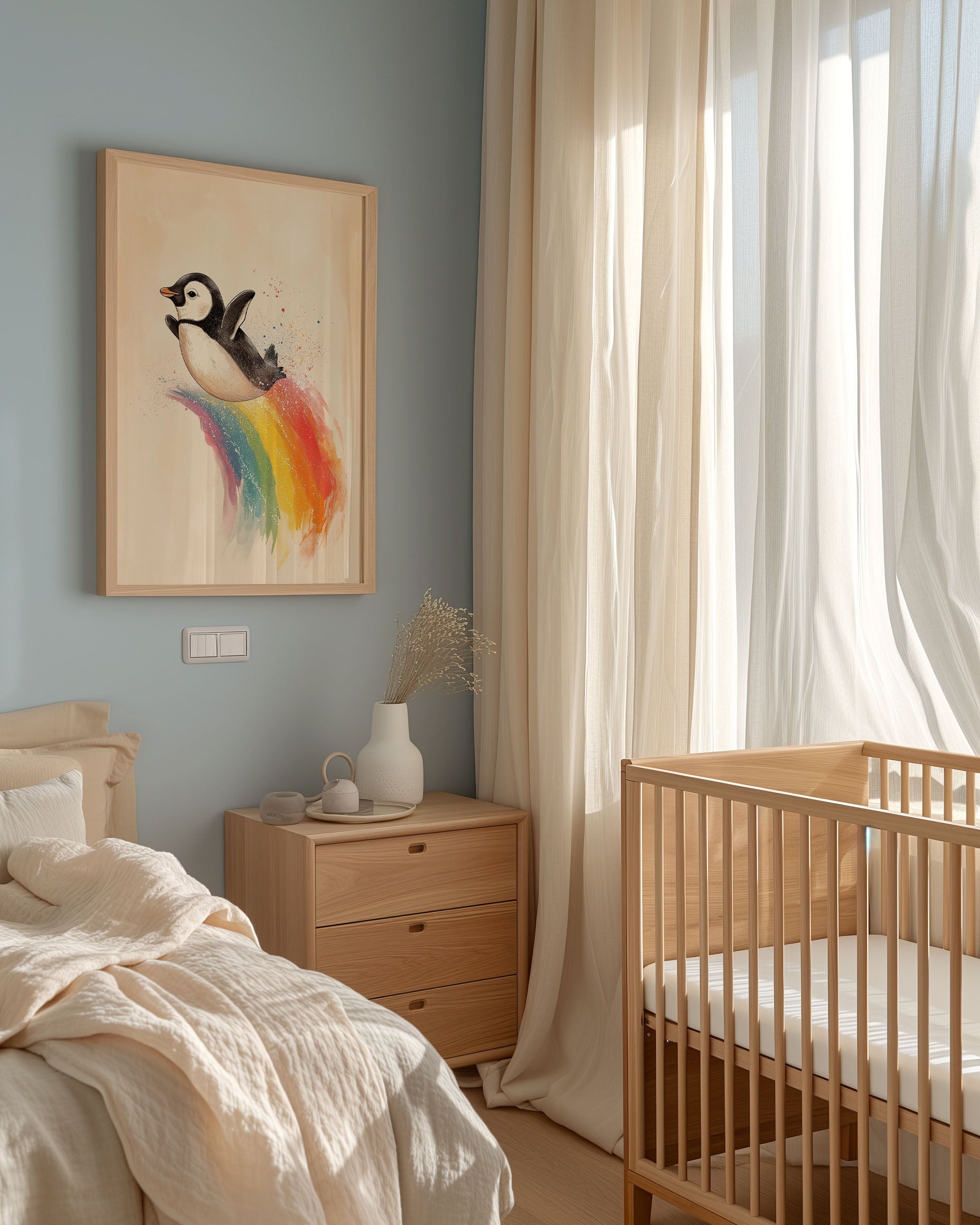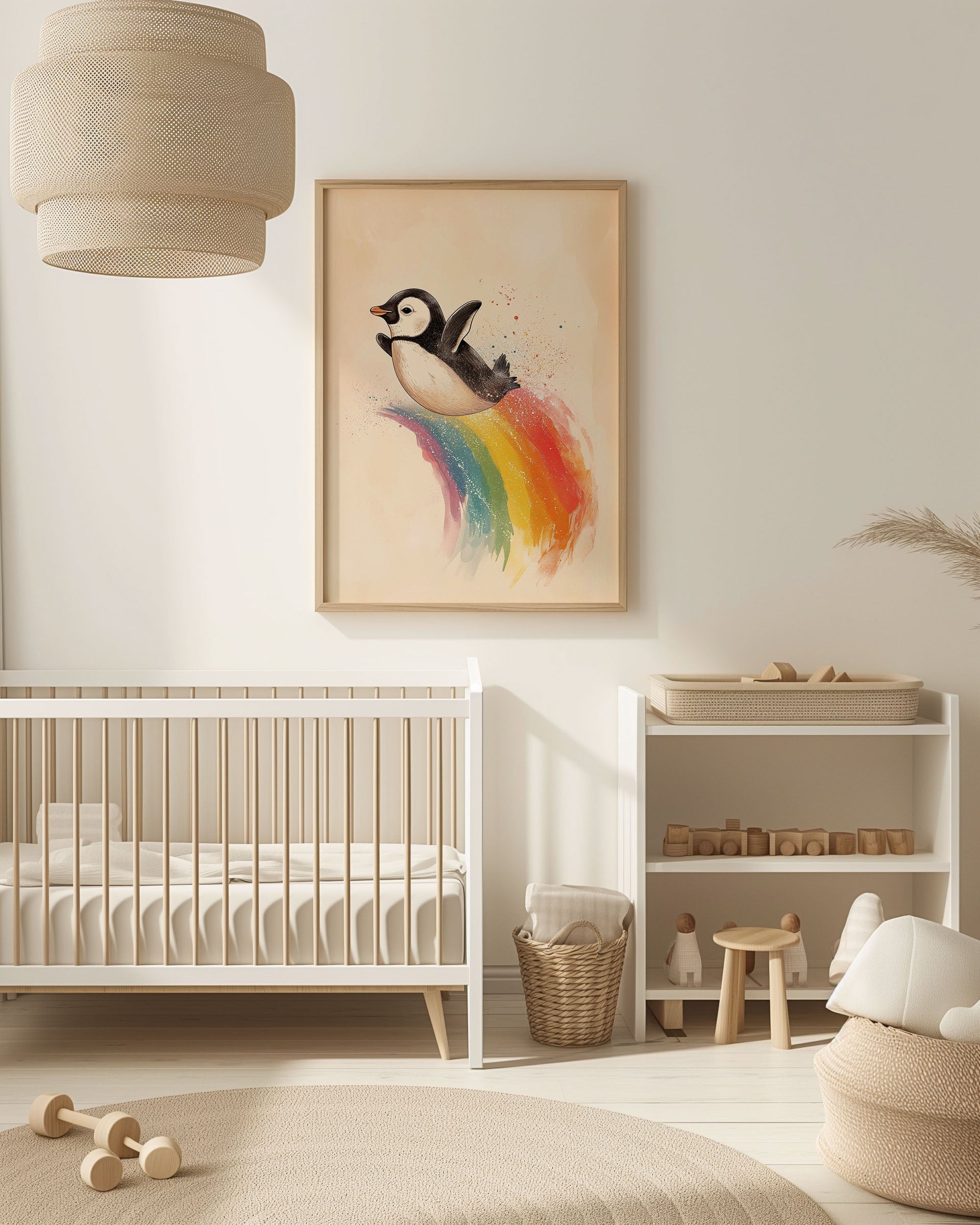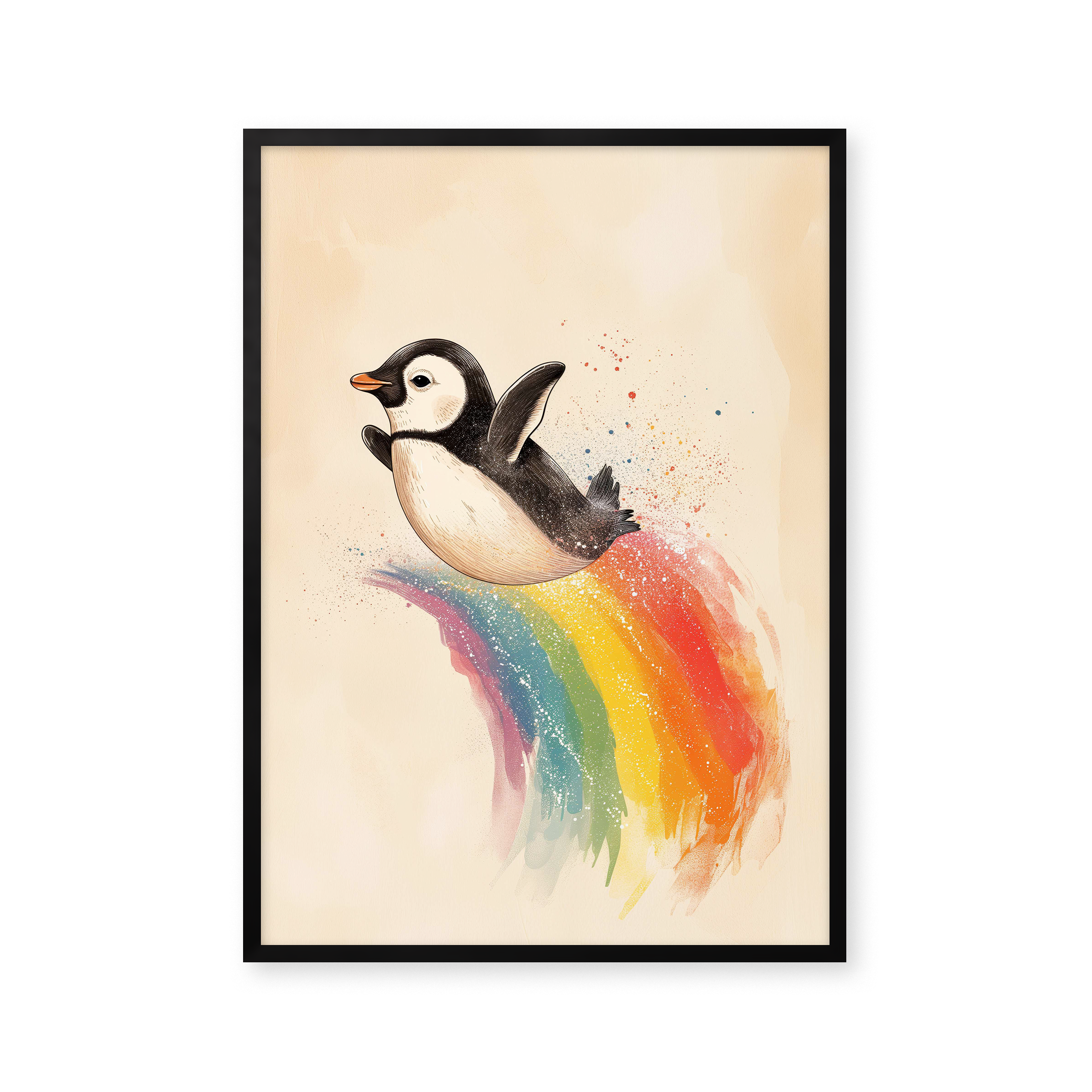 Oplev 'Glitrende Farveflugt' – en plakat, der fanger øjet med en legesyg pingvin i flugt over en sprudlende regnbuefarveeksplosion. Perfekt til at tilføre et strejf af fantasi og farverig charme til ethvert rum. En ægte samtalestarter, der lyser op og inspirerer.