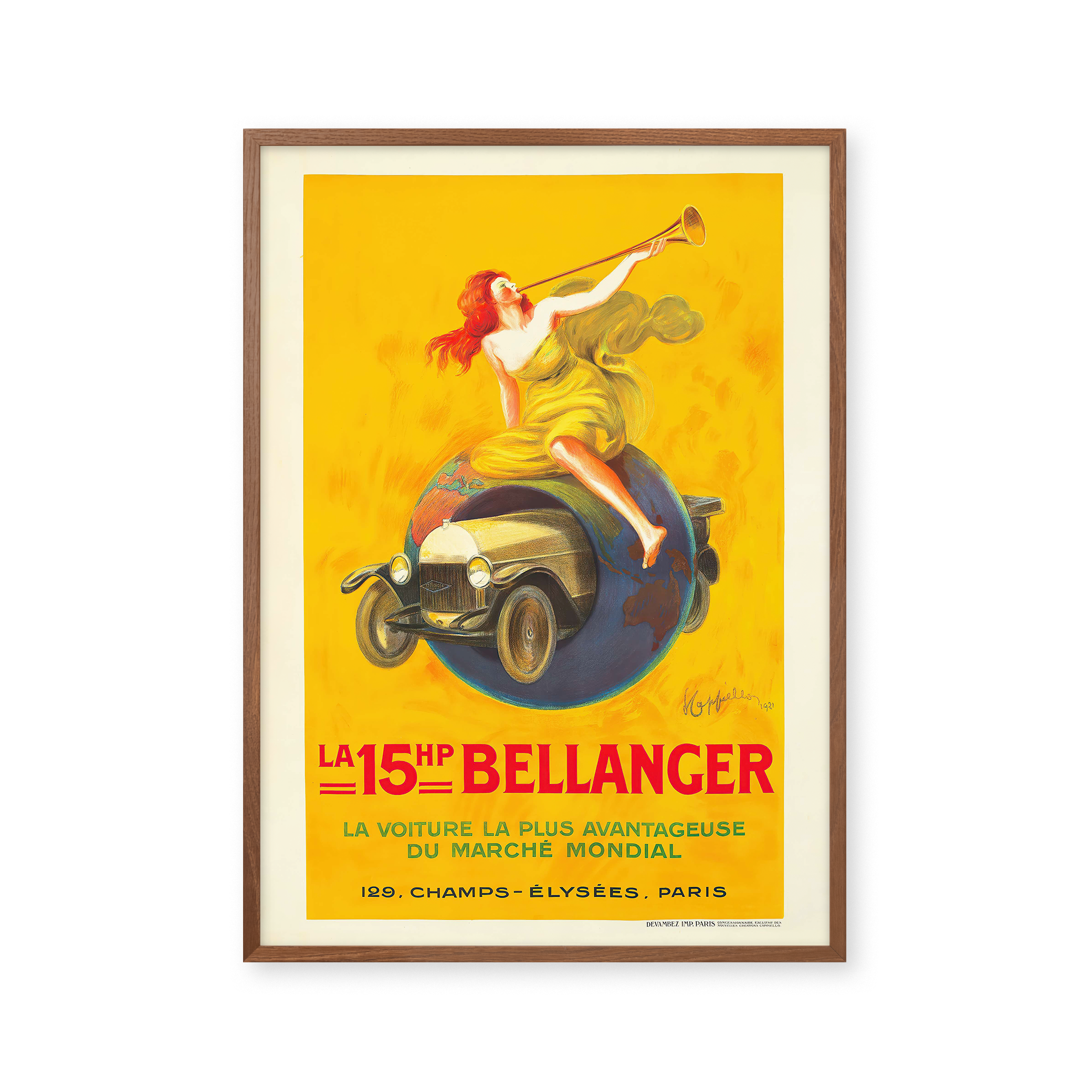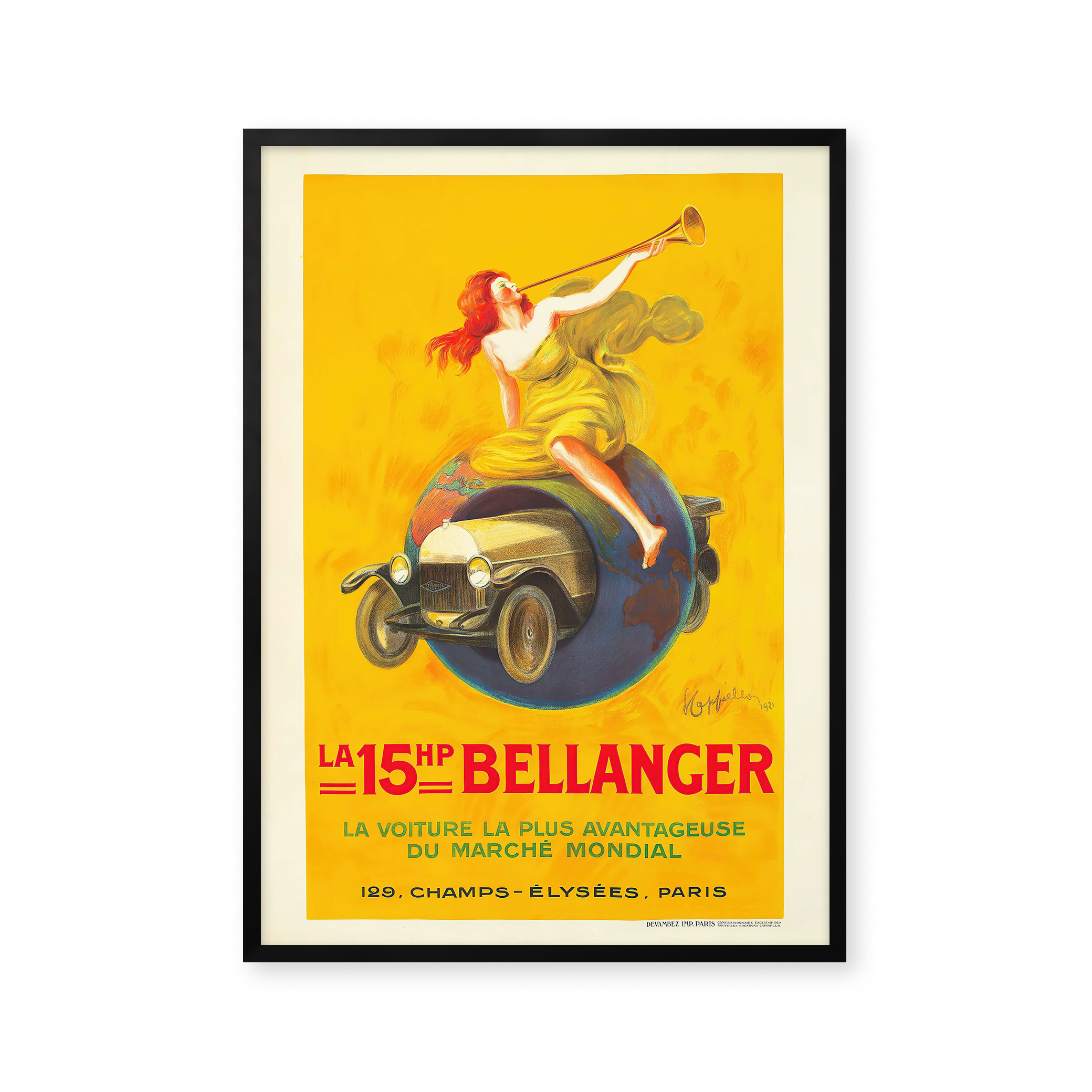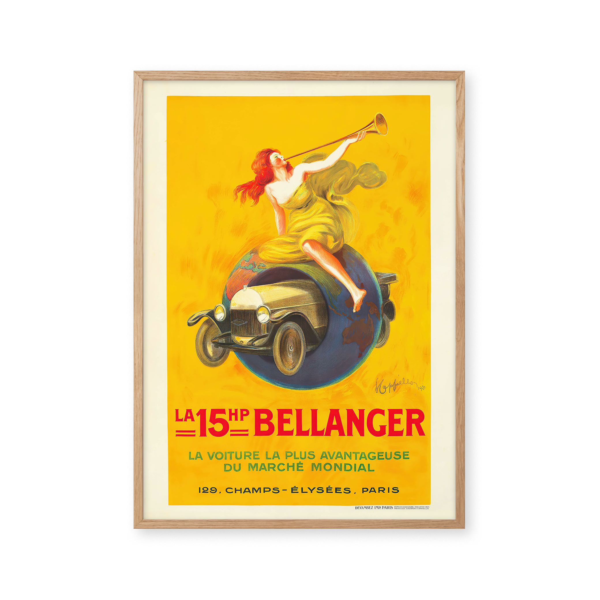 "La 15hp Bellanger" plakat: Oplev en farverig og unik vintage plakat med en kvinde, der blæser i et horn, mens hun sidder på en bil og en jordklode. Perfekt til at tilføje et strejf af retro charme og livlige farver til dit hjem eller kontor.