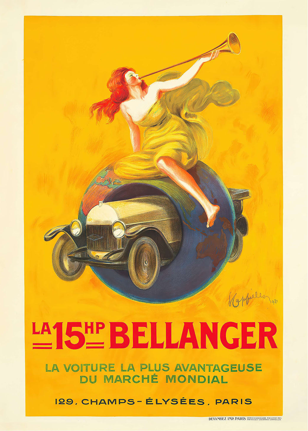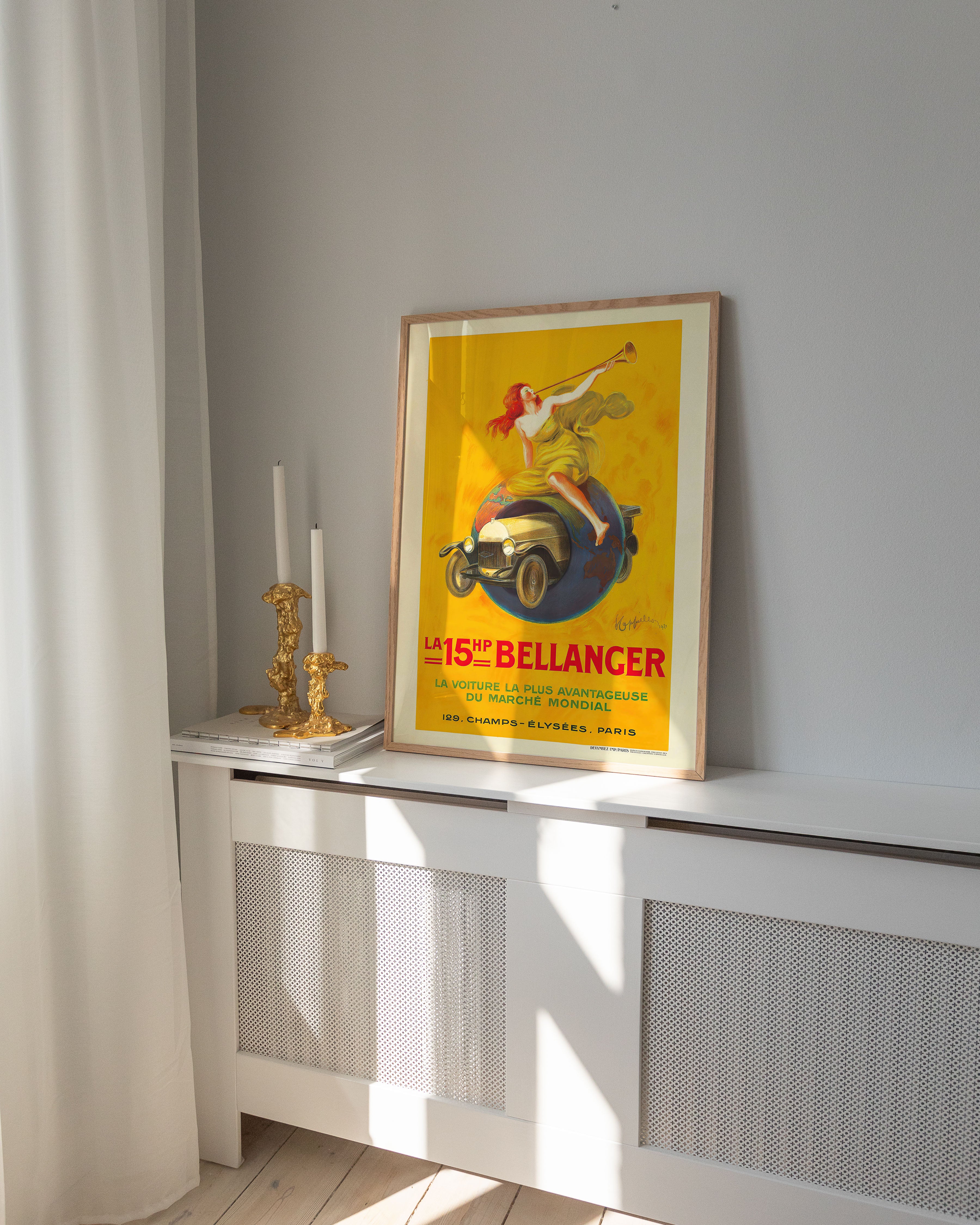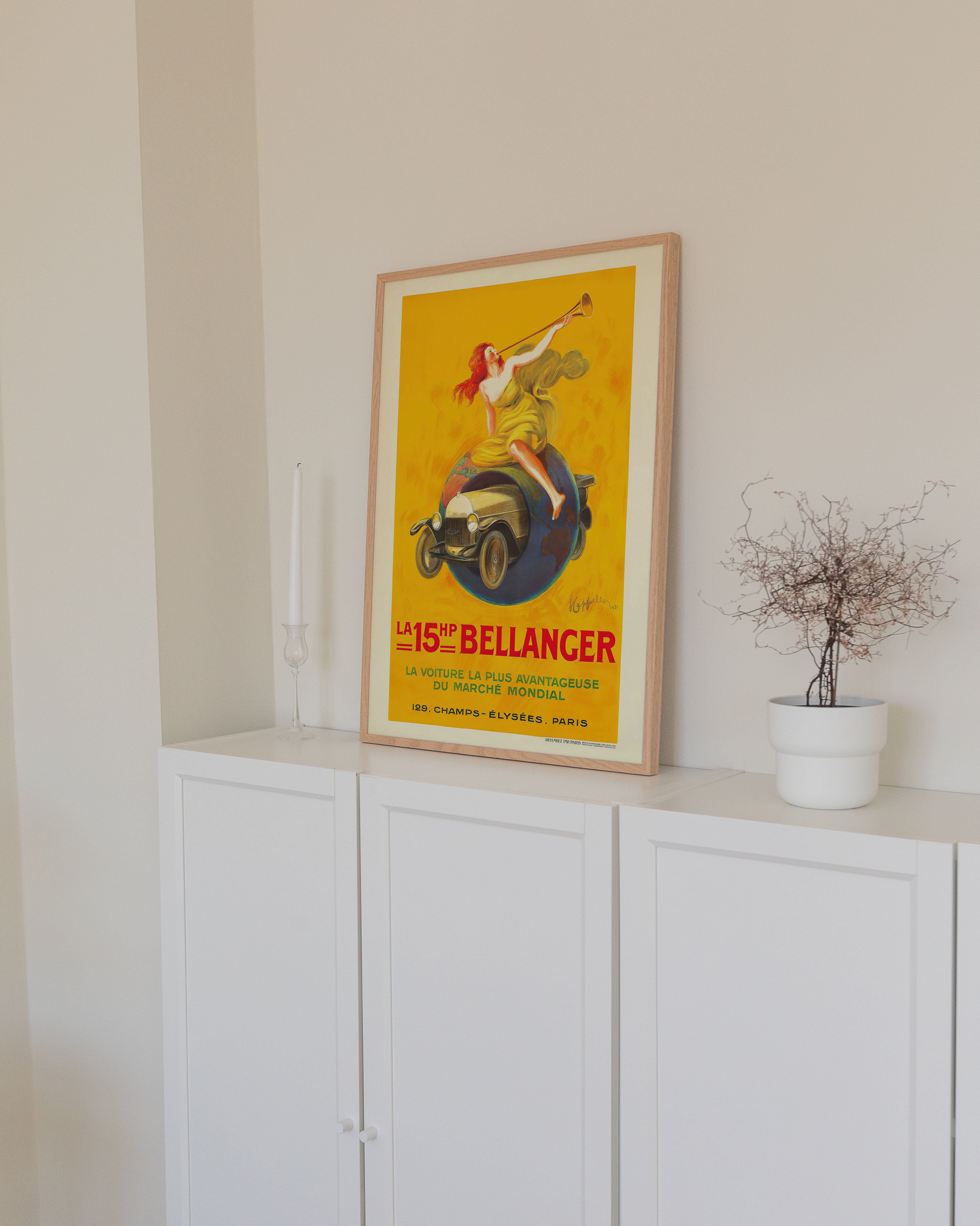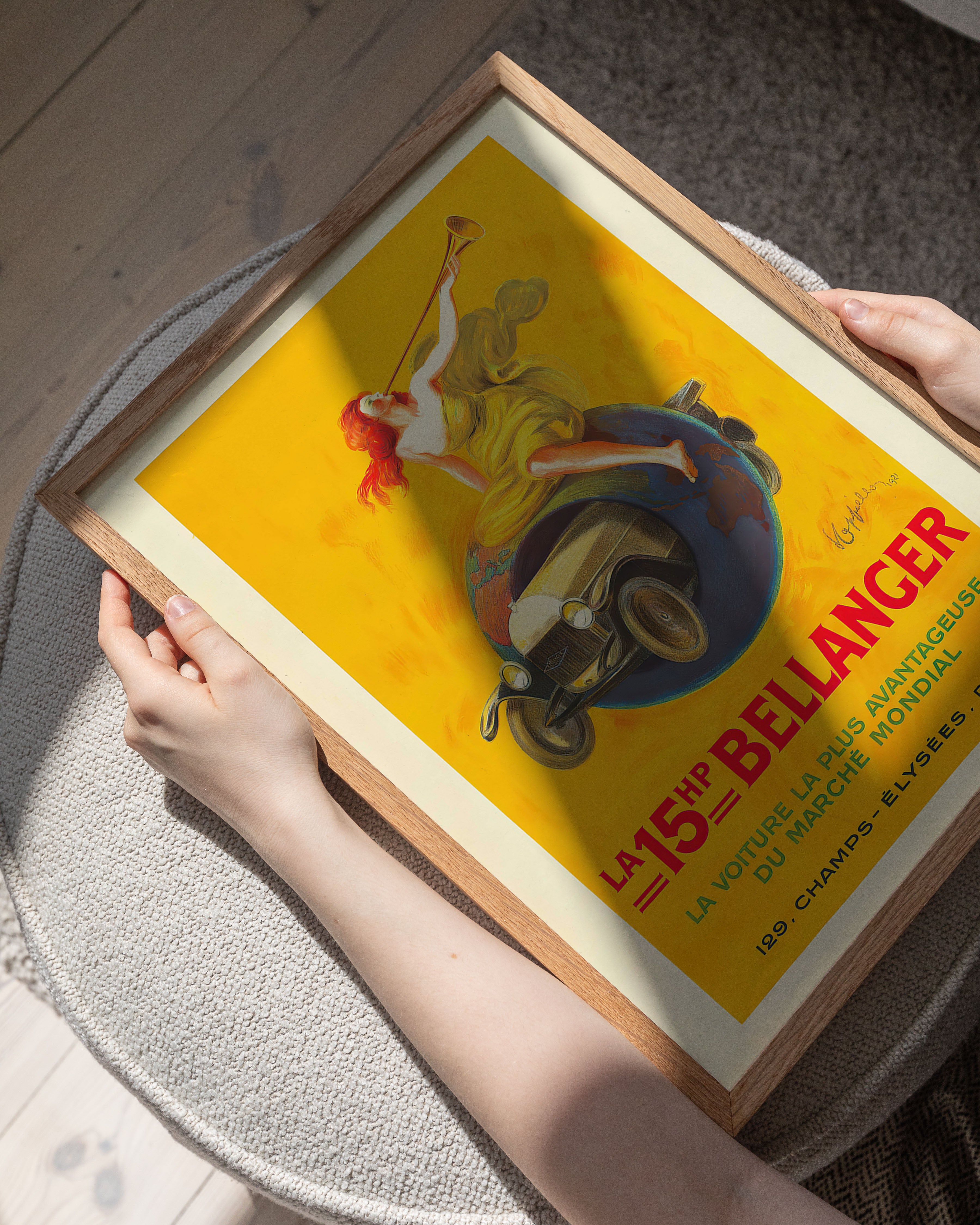 "La 15hp Bellanger" plakat: Oplev en farverig og unik vintage plakat med en kvinde, der blæser i et horn, mens hun sidder på en bil og en jordklode. Perfekt til at tilføje et strejf af retro charme og livlige farver til dit hjem eller kontor.