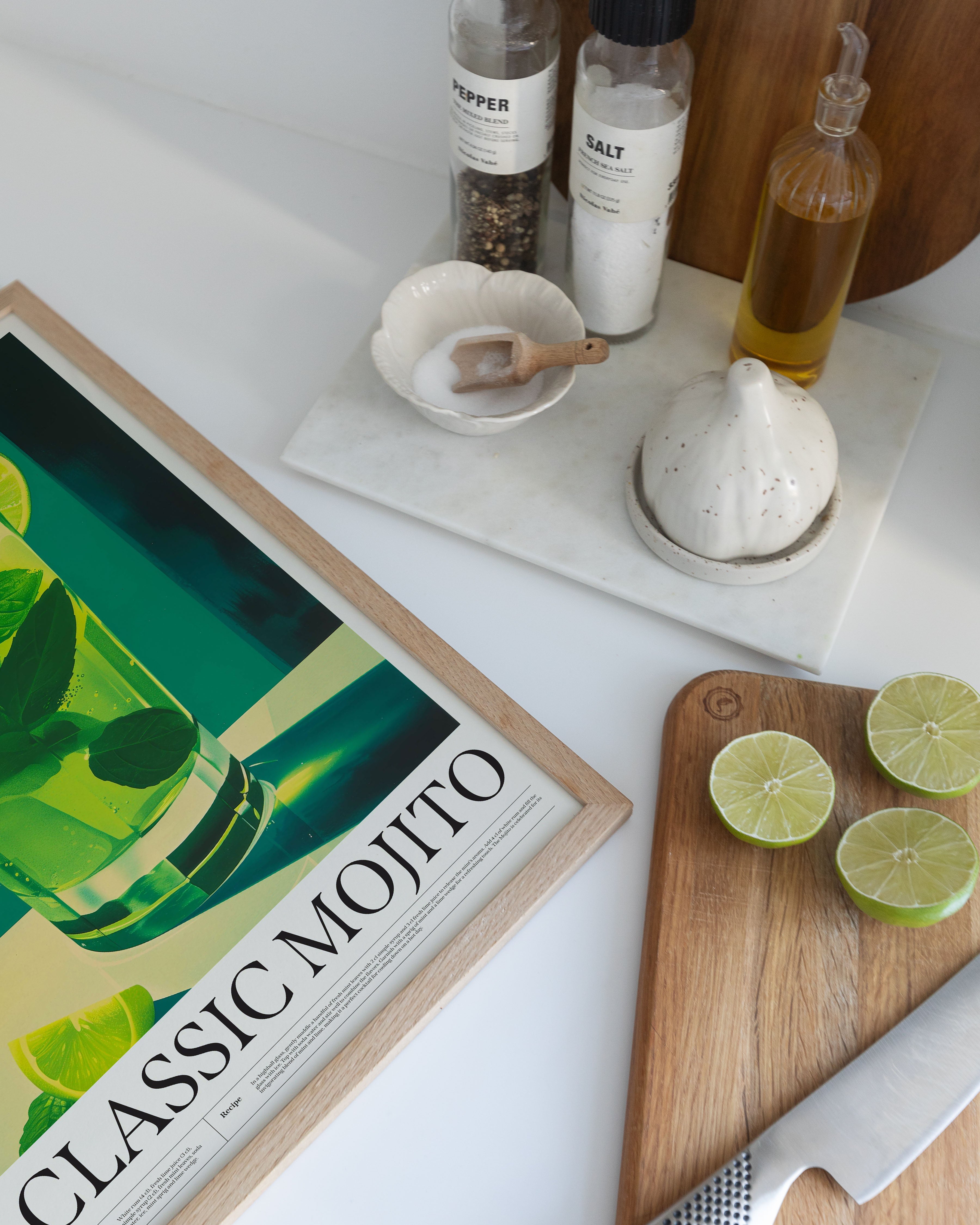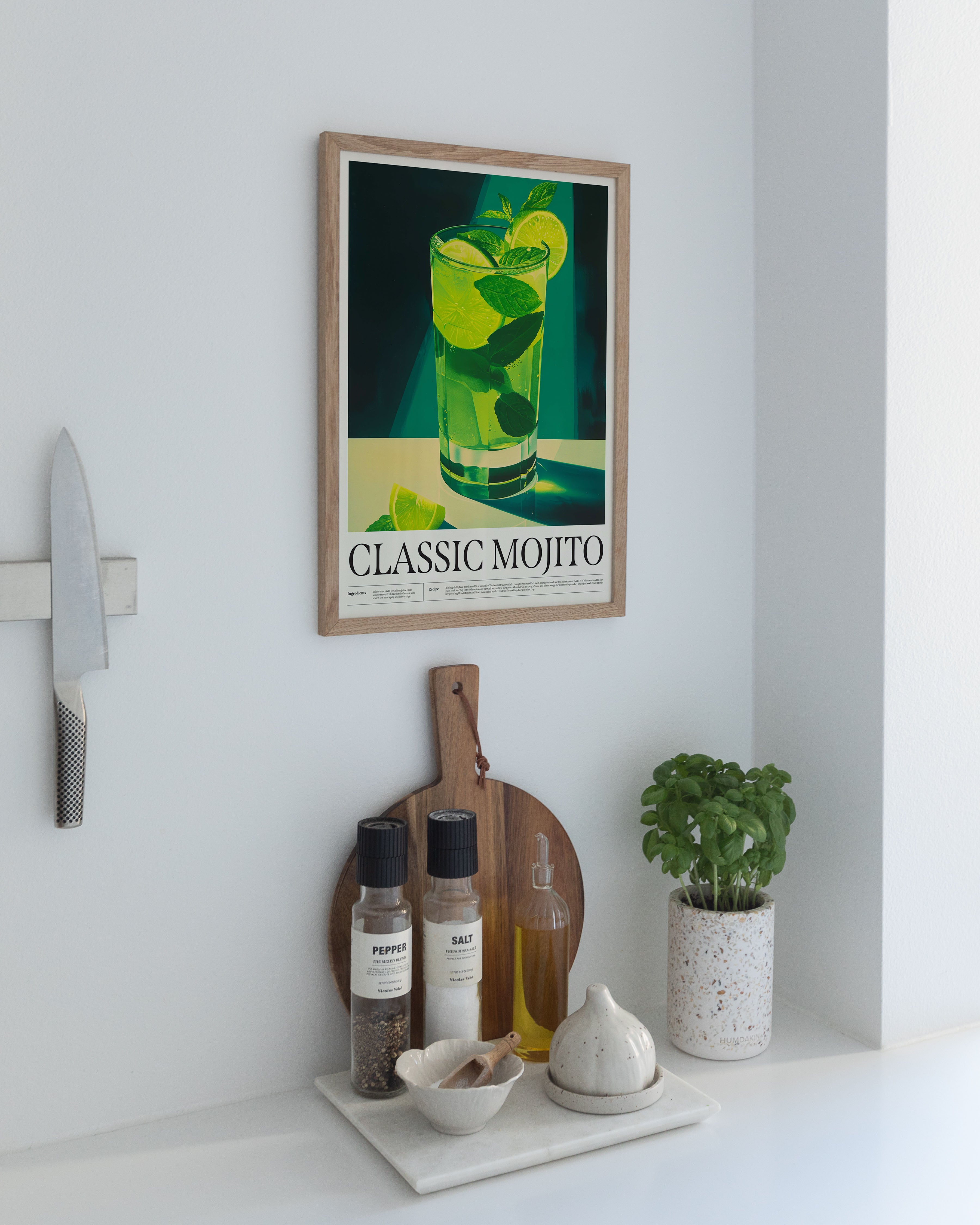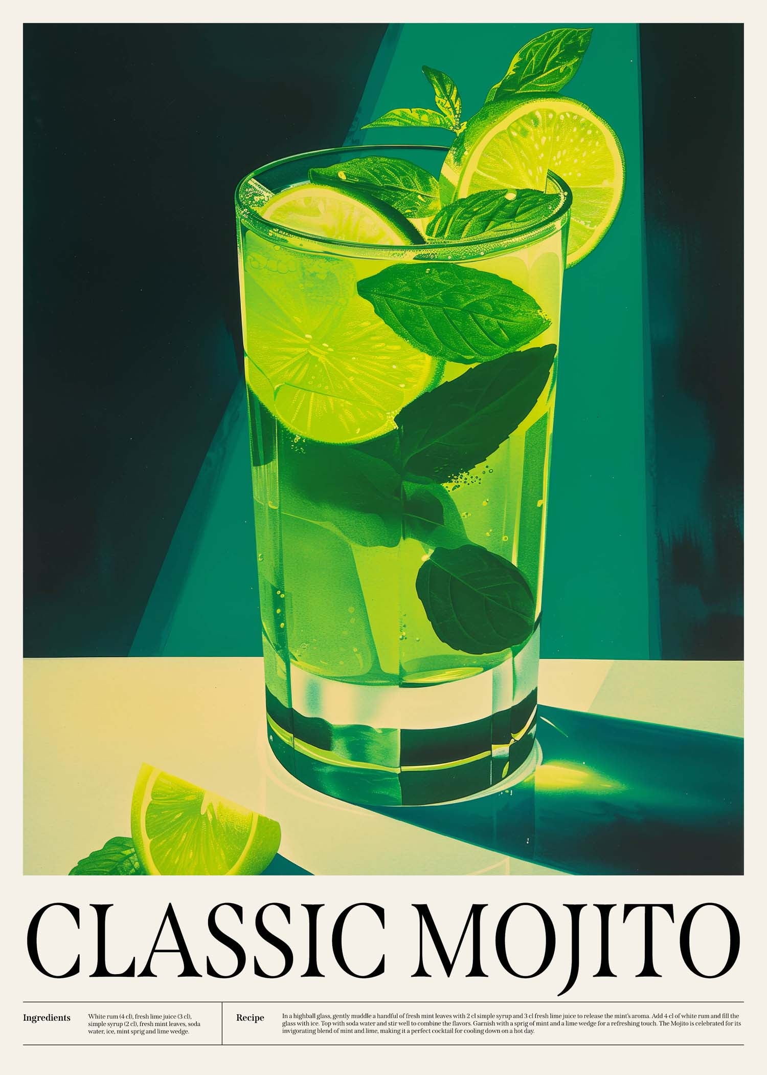 Opfrisk din væg med "Classic Mojito" plakaten! Dyk ned i en verden af kølig forfriskning, hvor smaragdgrønne mynteblade og saftige limebåde danser i krystalklar brus. Perfekt til køkkenet eller baren, denne plakat tilføjer et sprudlende touch af sommer og stil.