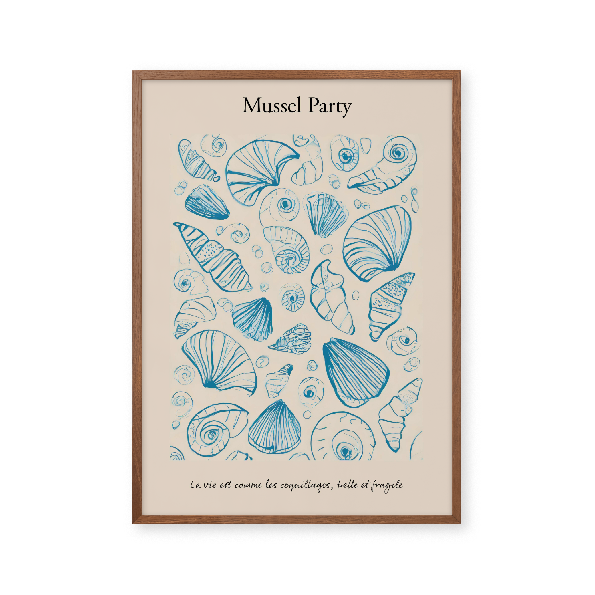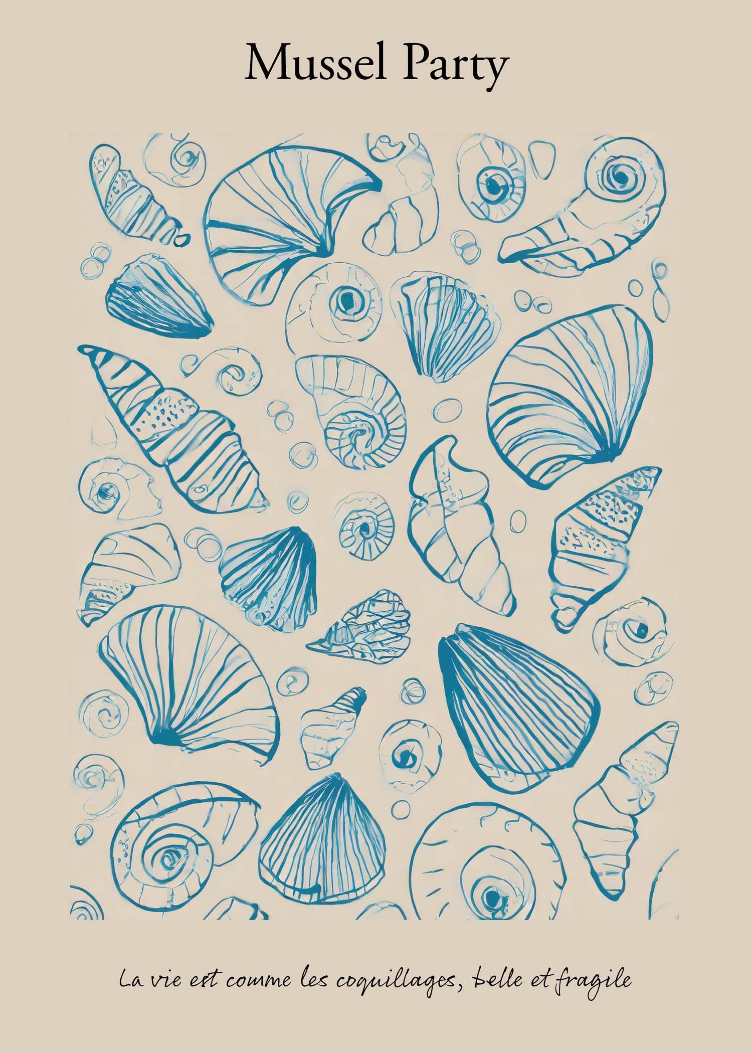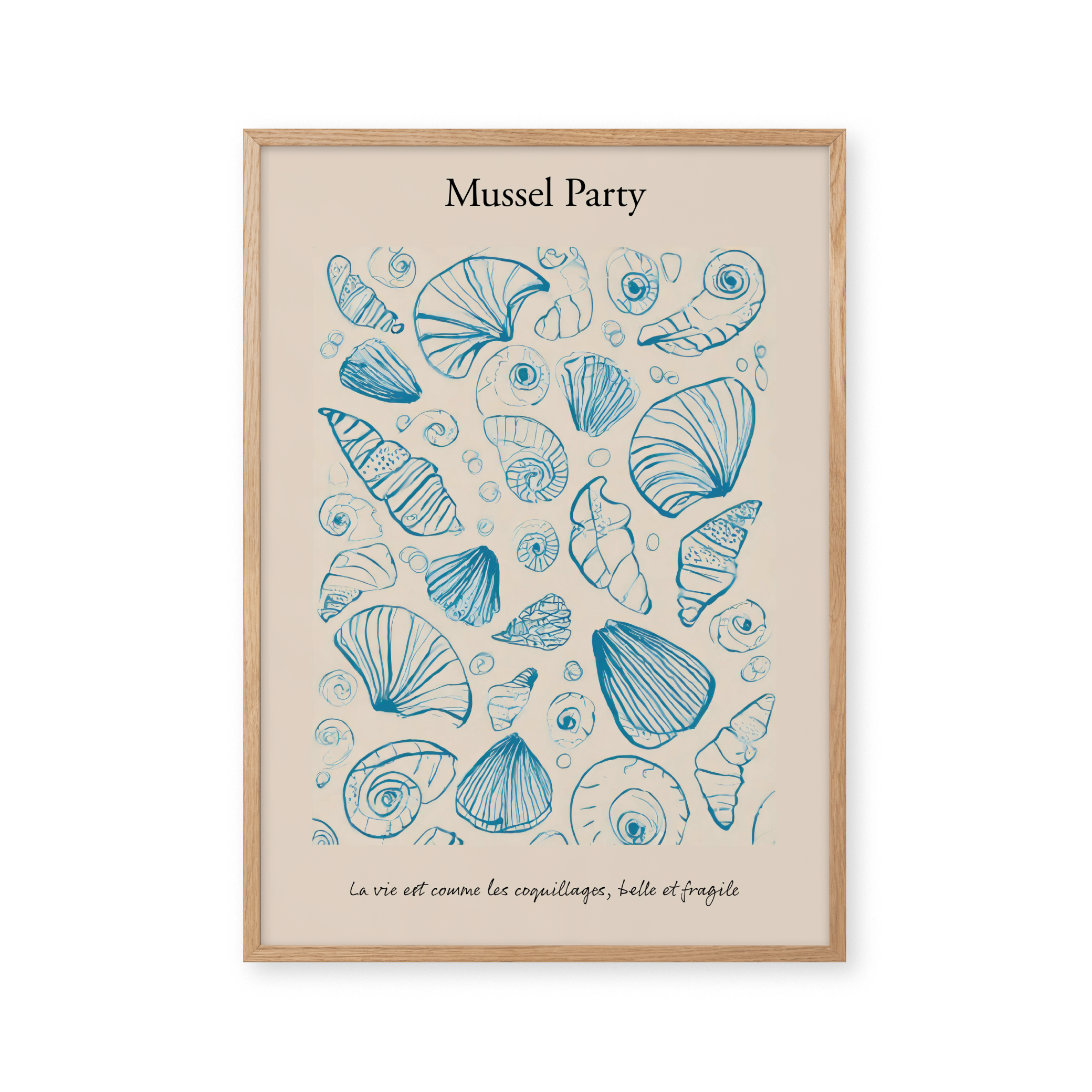 Opdag "Mussel Party" plakaten, en maritim symfoni i beroligende blåtoner. Hver musling og skaldyr er tegnet med kærlighed, perfekt til at tilføre et strejf af havets ro til ethvert rum. Levende, detaljeret og absolut betagende – en ægte visuel fest for øjnene.