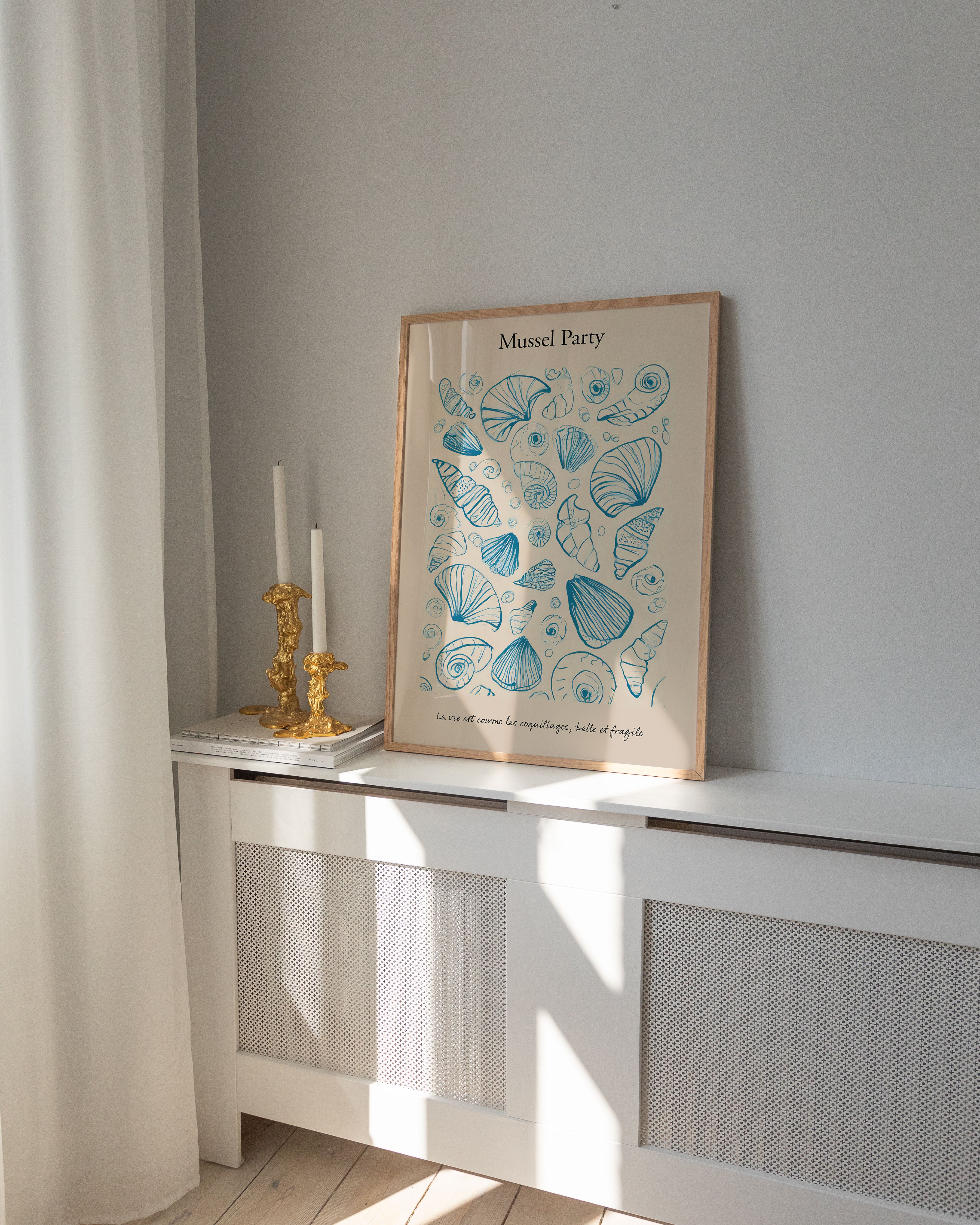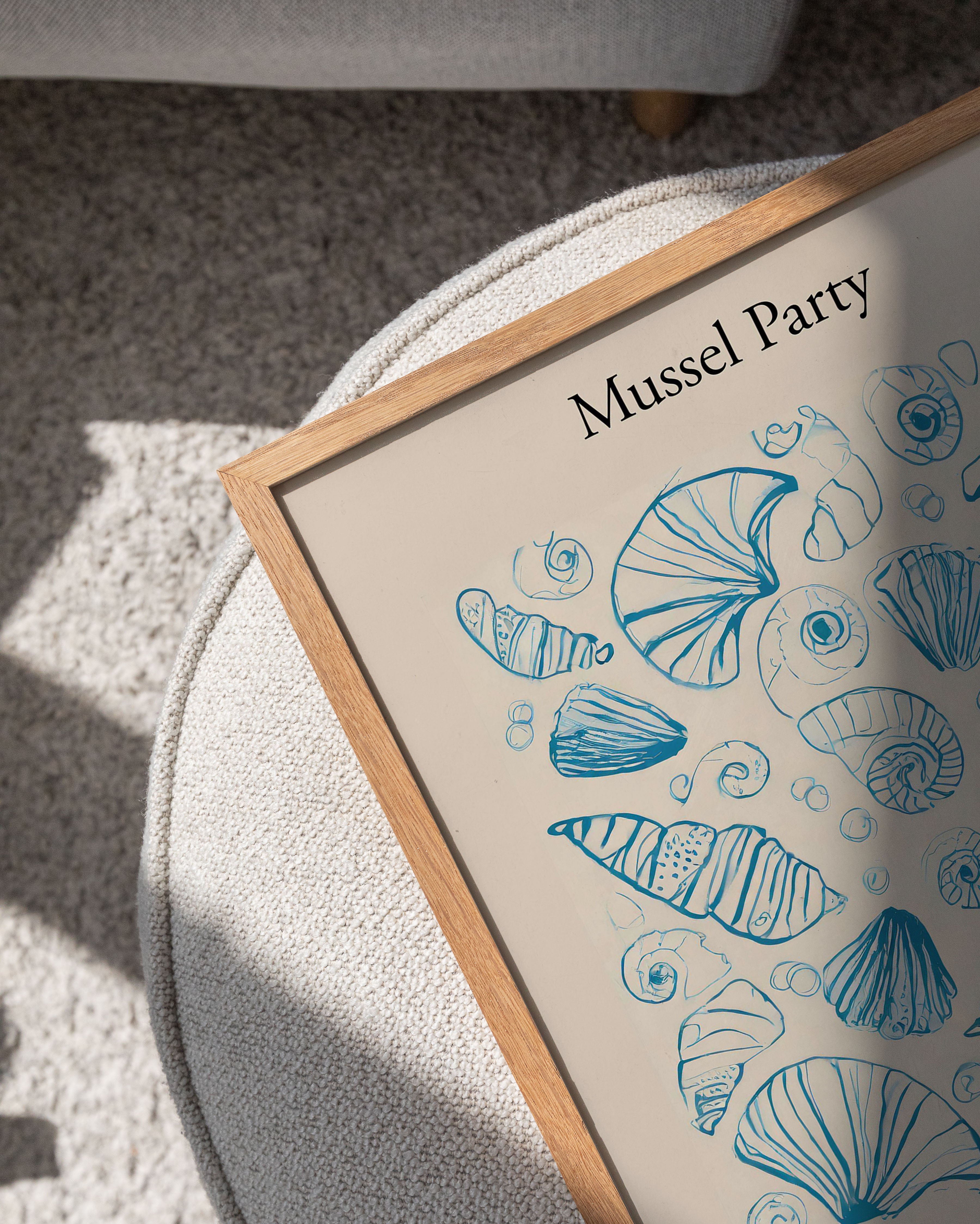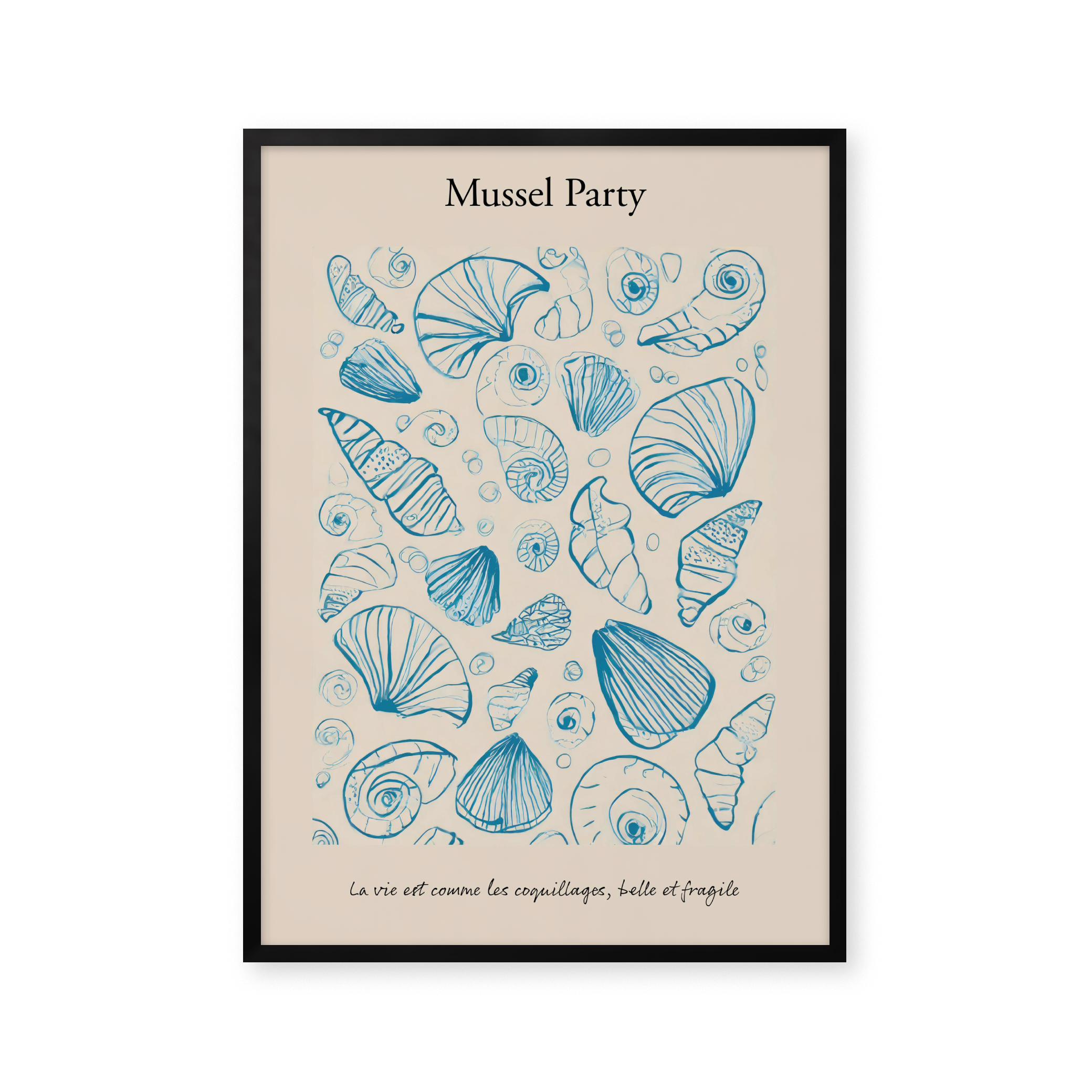 Opdag "Mussel Party" plakaten, en maritim symfoni i beroligende blåtoner. Hver musling og skaldyr er tegnet med kærlighed, perfekt til at tilføre et strejf af havets ro til ethvert rum. Levende, detaljeret og absolut betagende – en ægte visuel fest for øjnene.