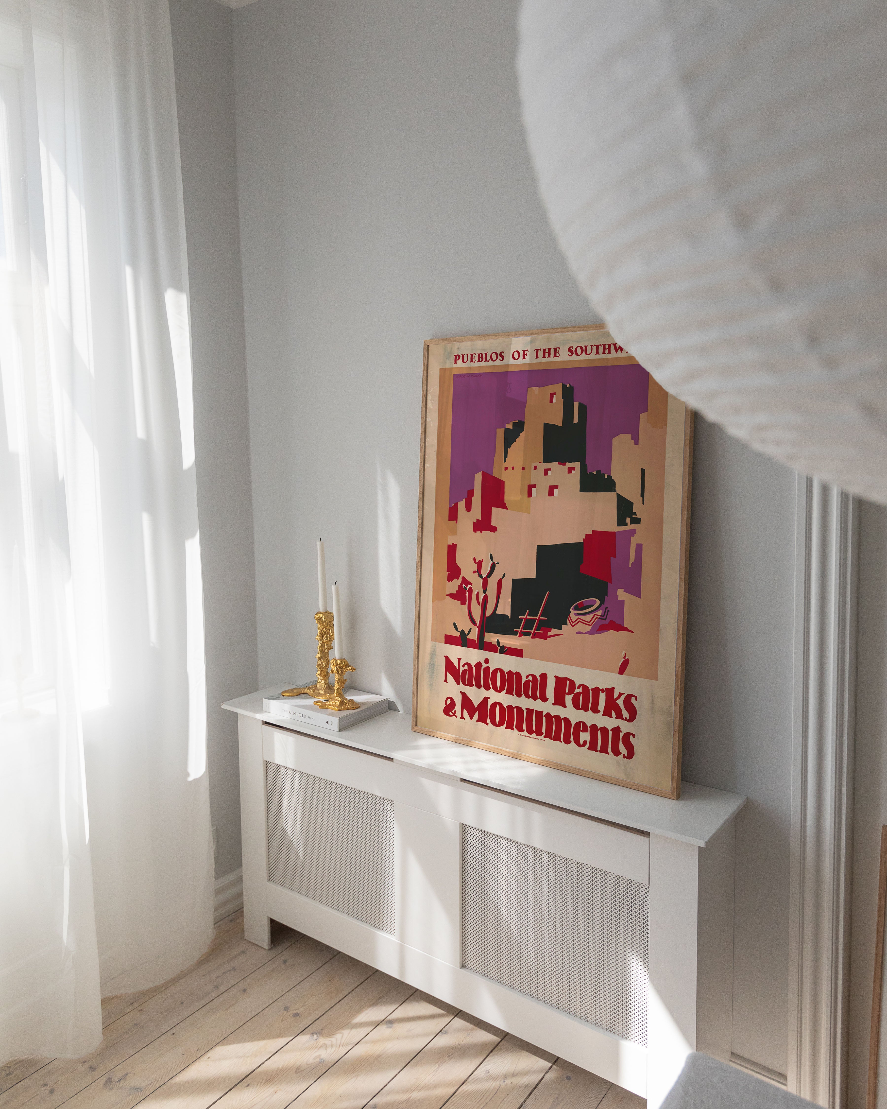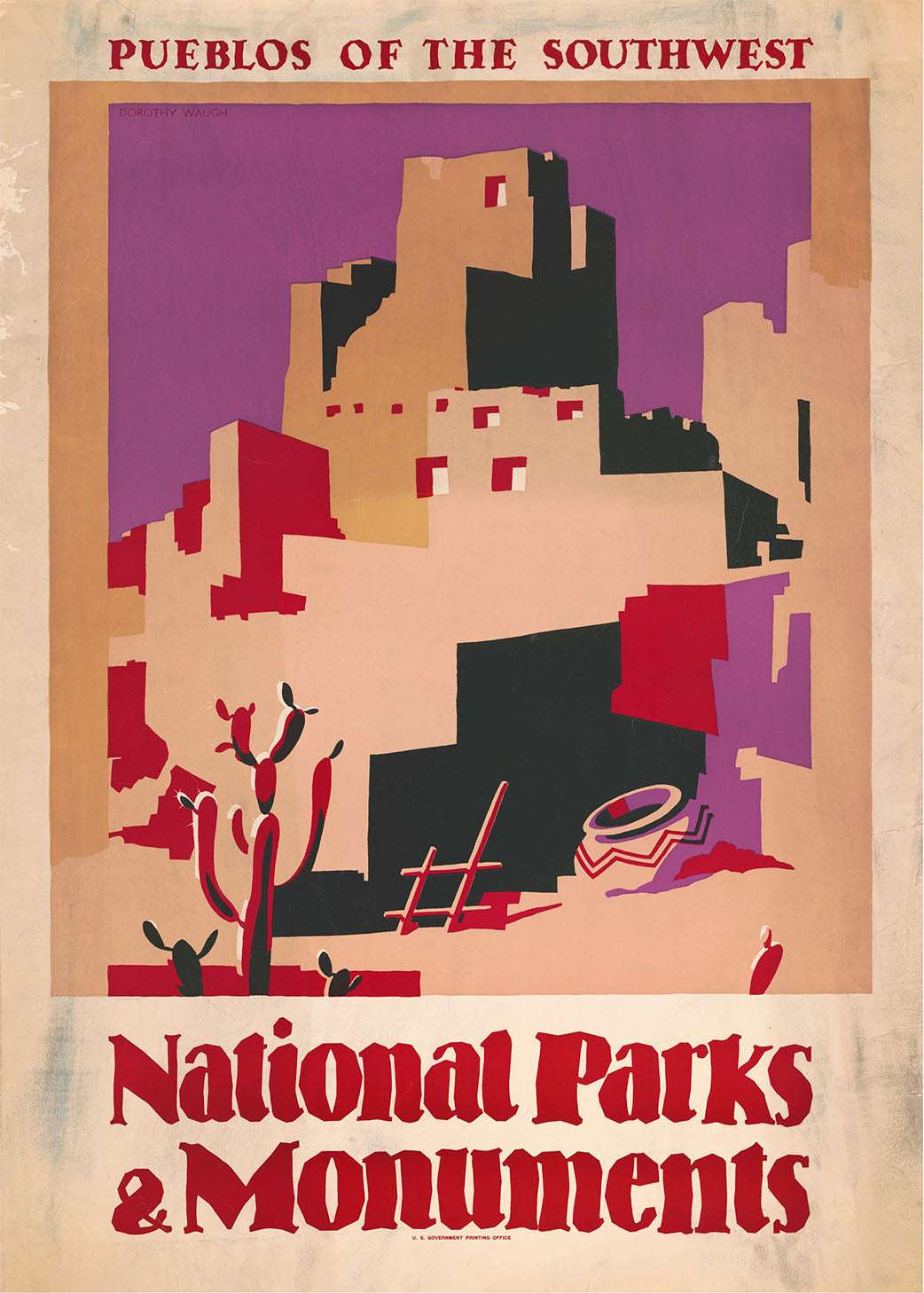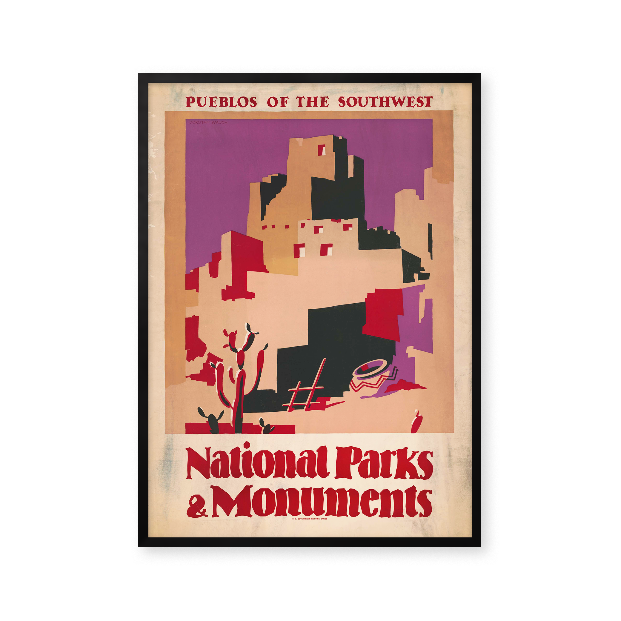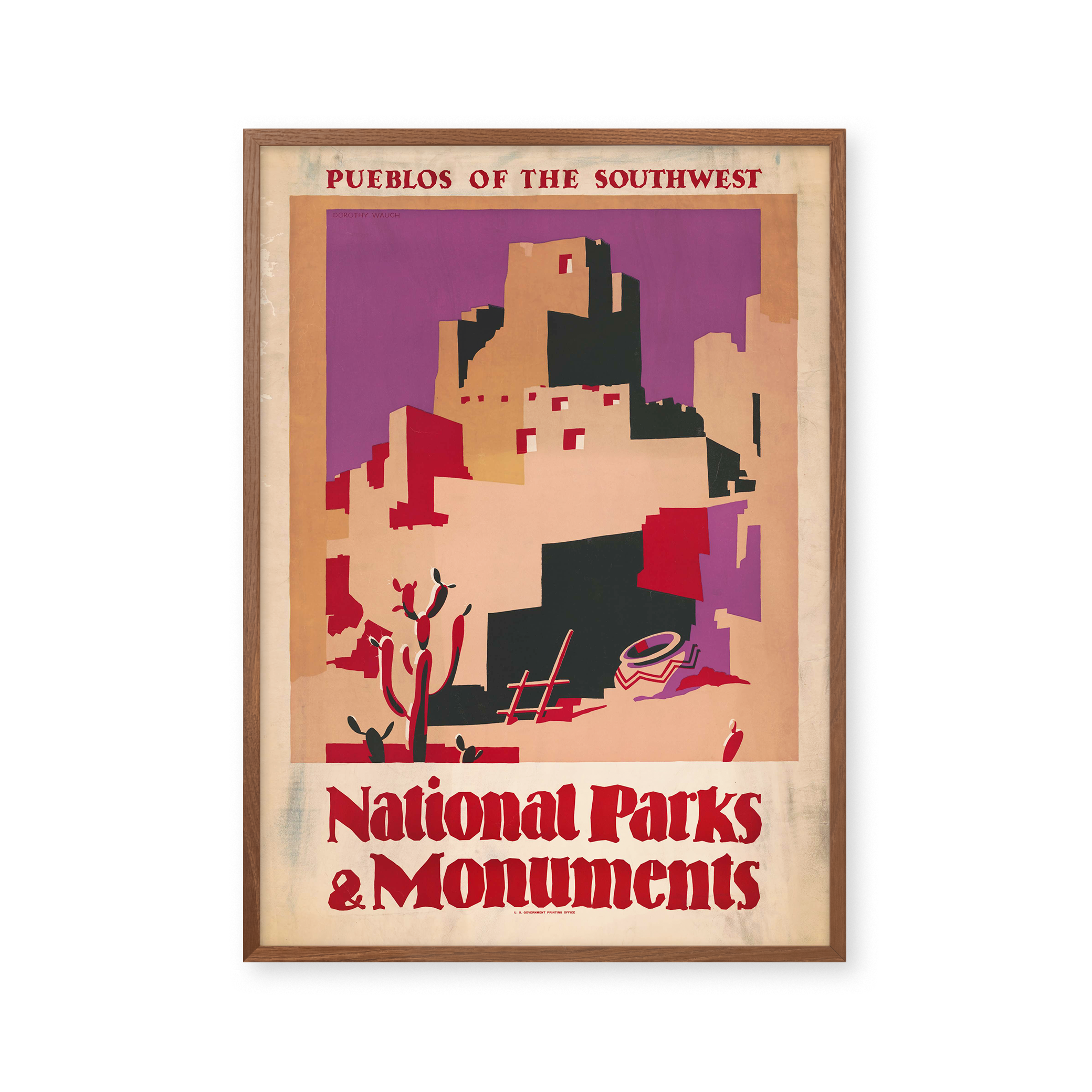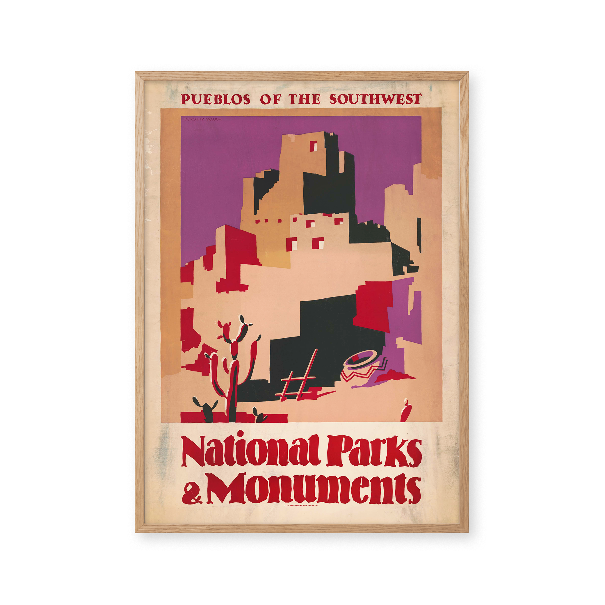 "National Parks and Monuments Pueblos of the Southwest" plakat: Oplev de levende farver og unikke elementer af sydvestens pueblos. Denne kunstneriske plakat fanger essensen af ikoniske nationalparker og monumenter med en betagende farvepalet, der bringer naturens skønhed ind i dit hjem.