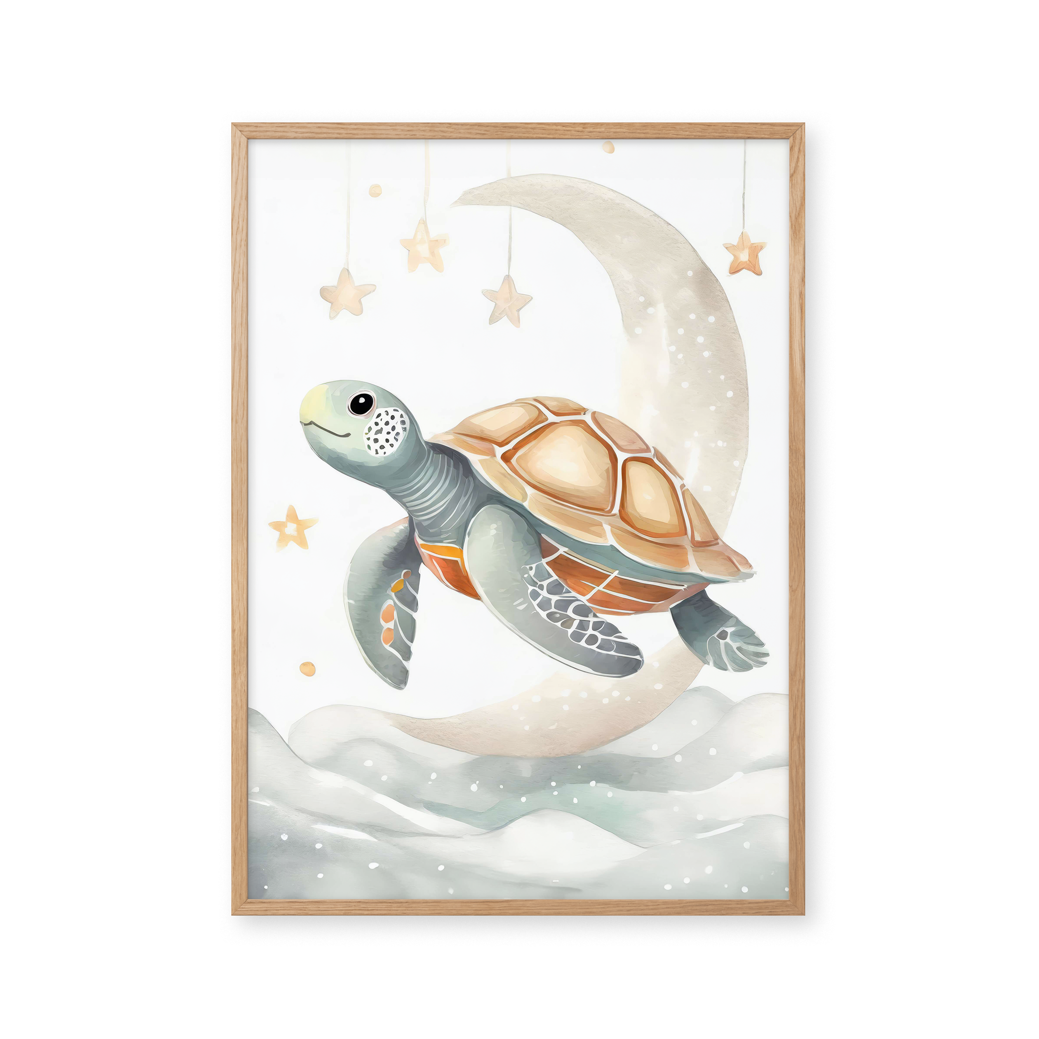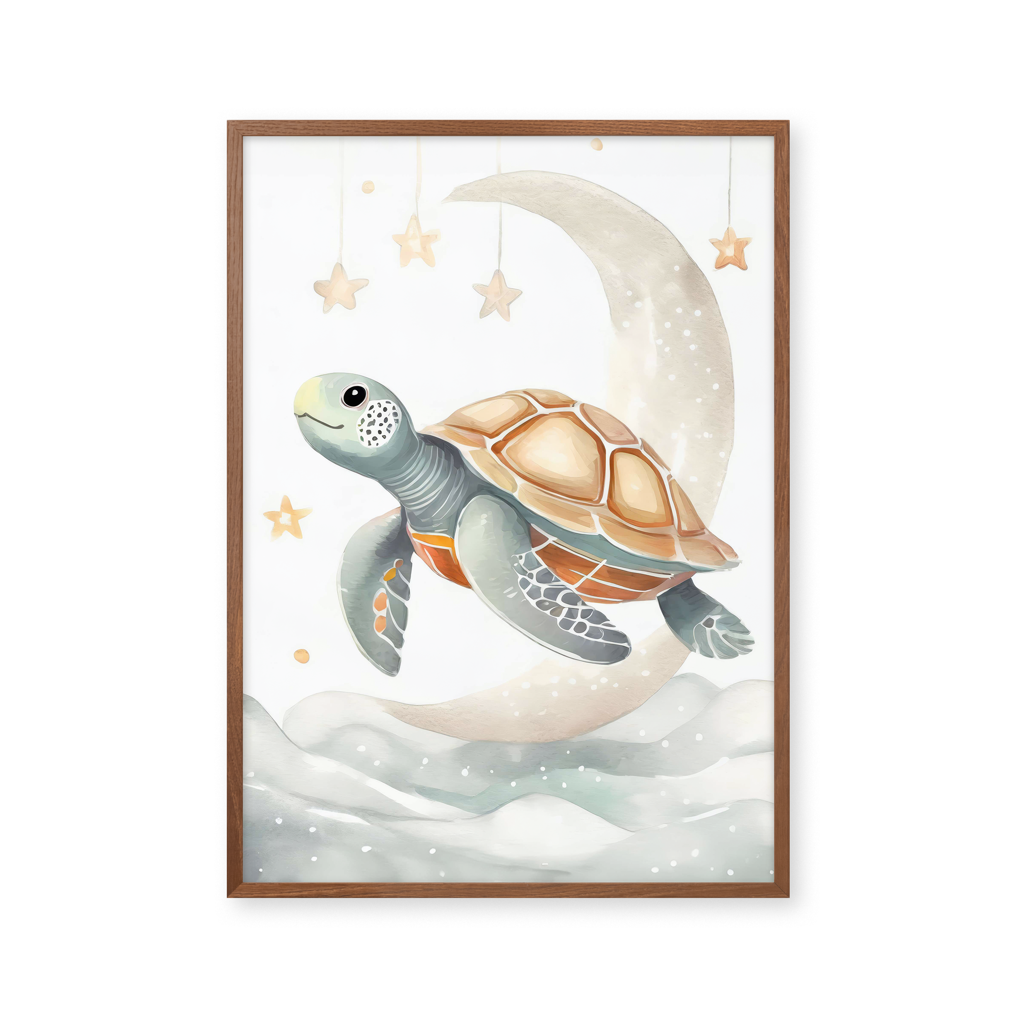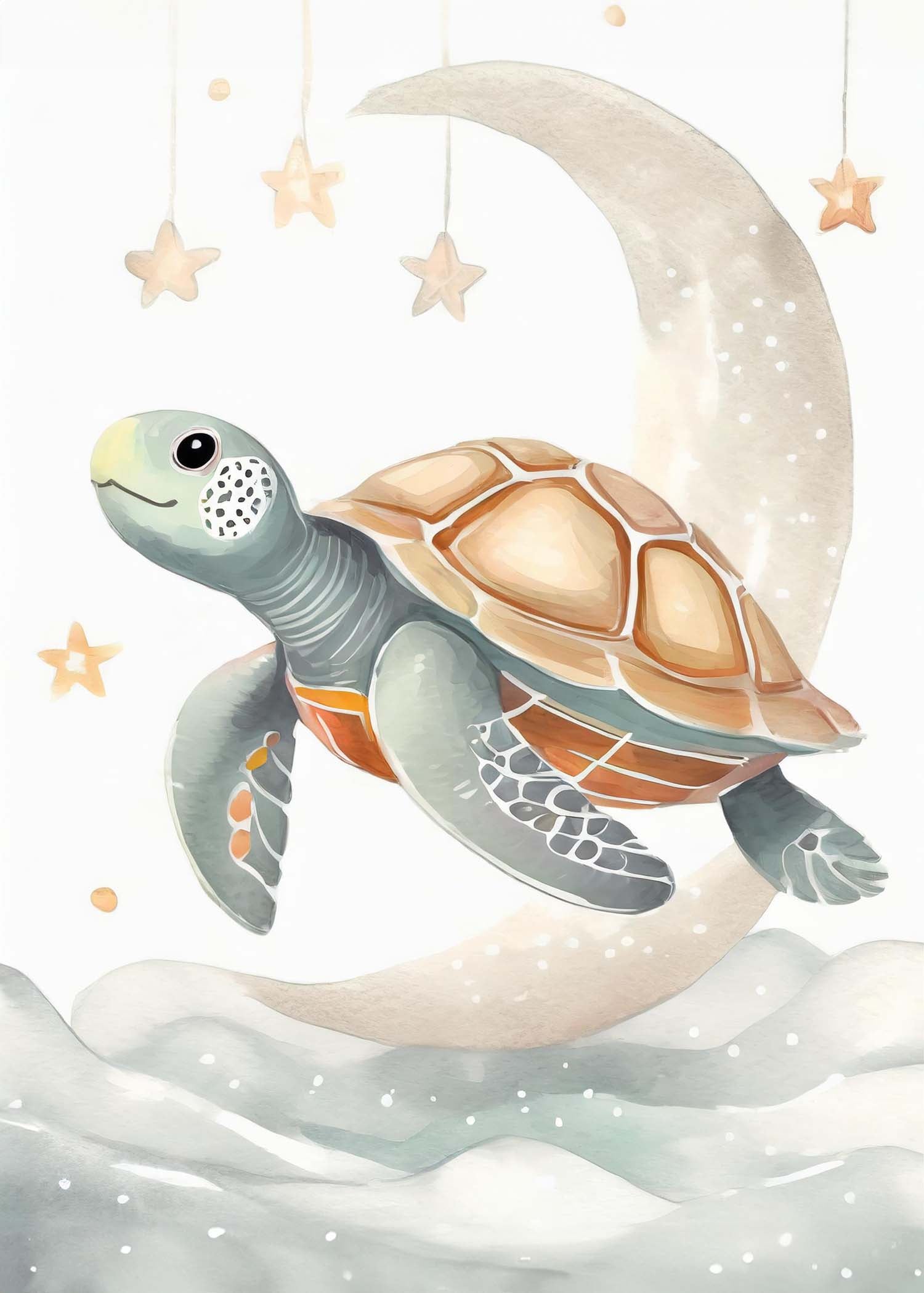 Oplev "Nattens Skildpadderejse" - en drømmende plakat, der fanger hjertet. Bløde pastelfarver og stjernedrys skaber en beroligende atmosfære, perfekt til at forvandle ethvert rum. Denne kunstneriske fortolkning af en skildpadde på eventyr er et must-have for naturelskere og drømmere.