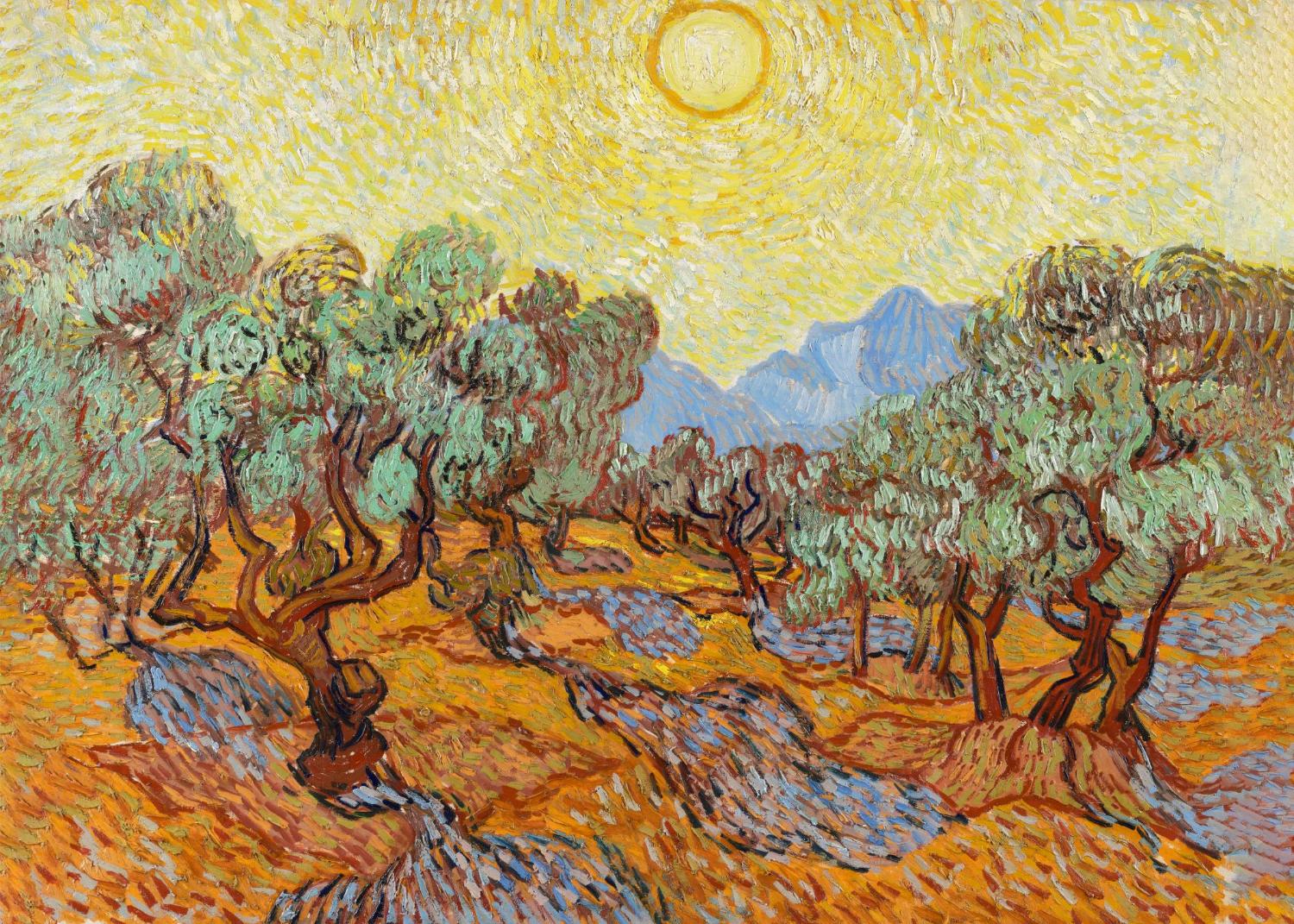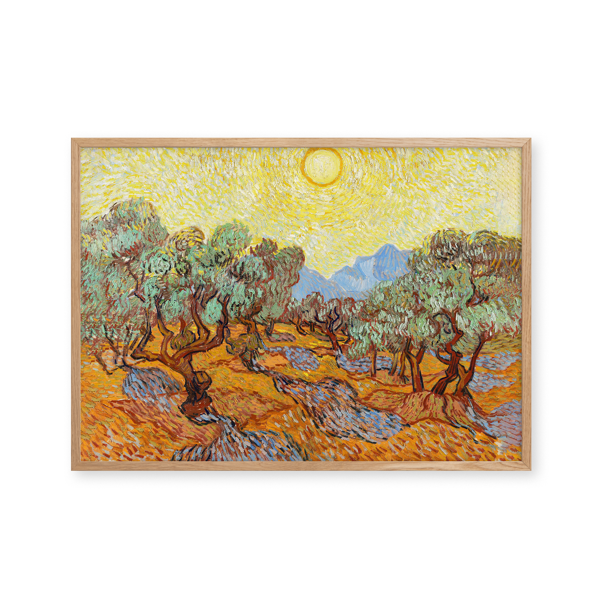 "Olive Trees" plakat: Oplev en eksplosion af farver med denne unikke kunstplakat. De levende grønne oliventræer og den strålende gule sol skaber en dynamisk og fængslende atmosfære. Perfekt til at tilføje liv og energi til ethvert rum.