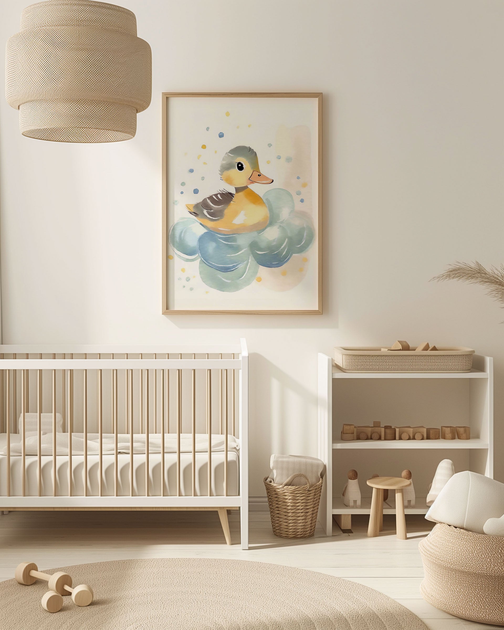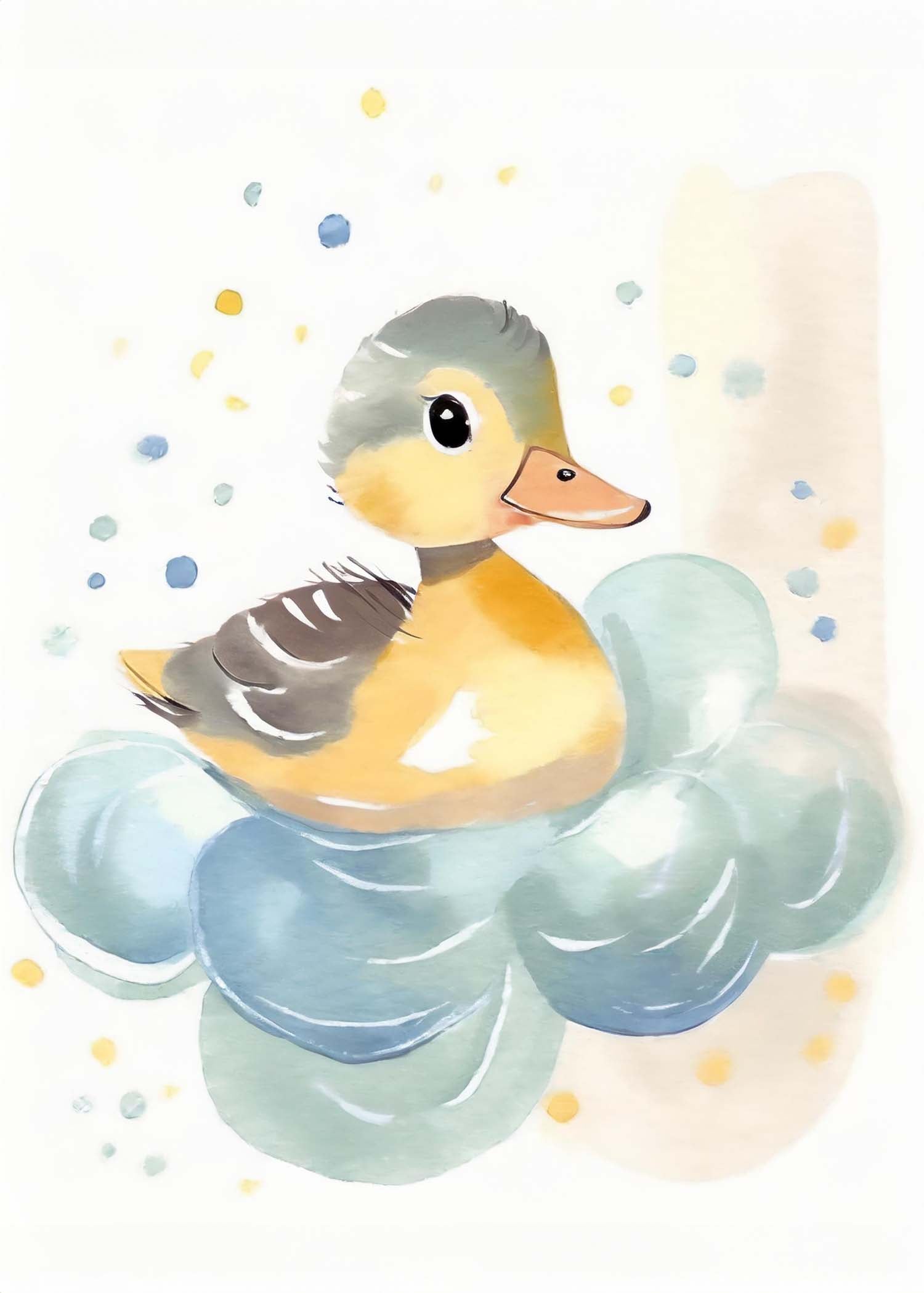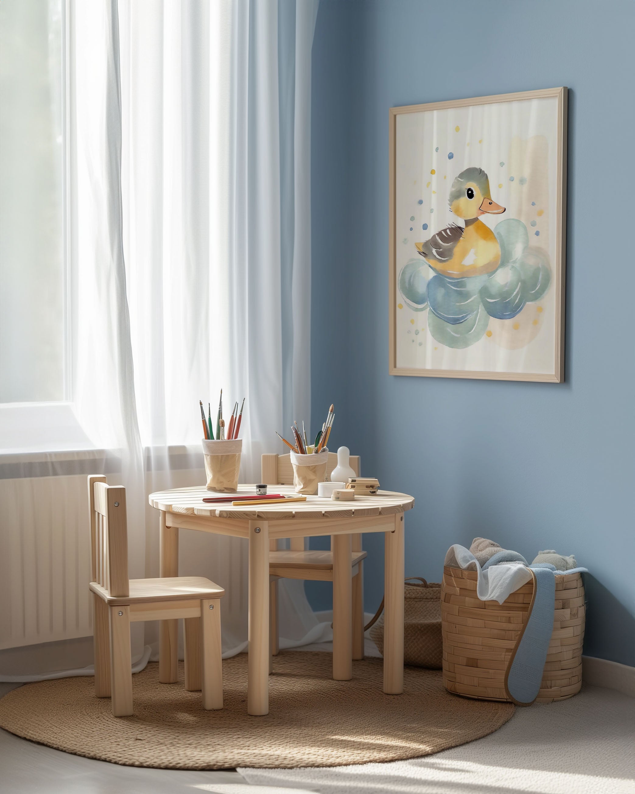 Opdag "På eventyr og ikke andet" – en charmerende plakat, der fanger fantasien med sin livlige andunge, omfavnet af bløde blå bølger og legende konfetti. Perfekt til børneværelset, denne kunsttryk vækker glæde med sine varme nuancer og indbydende design.