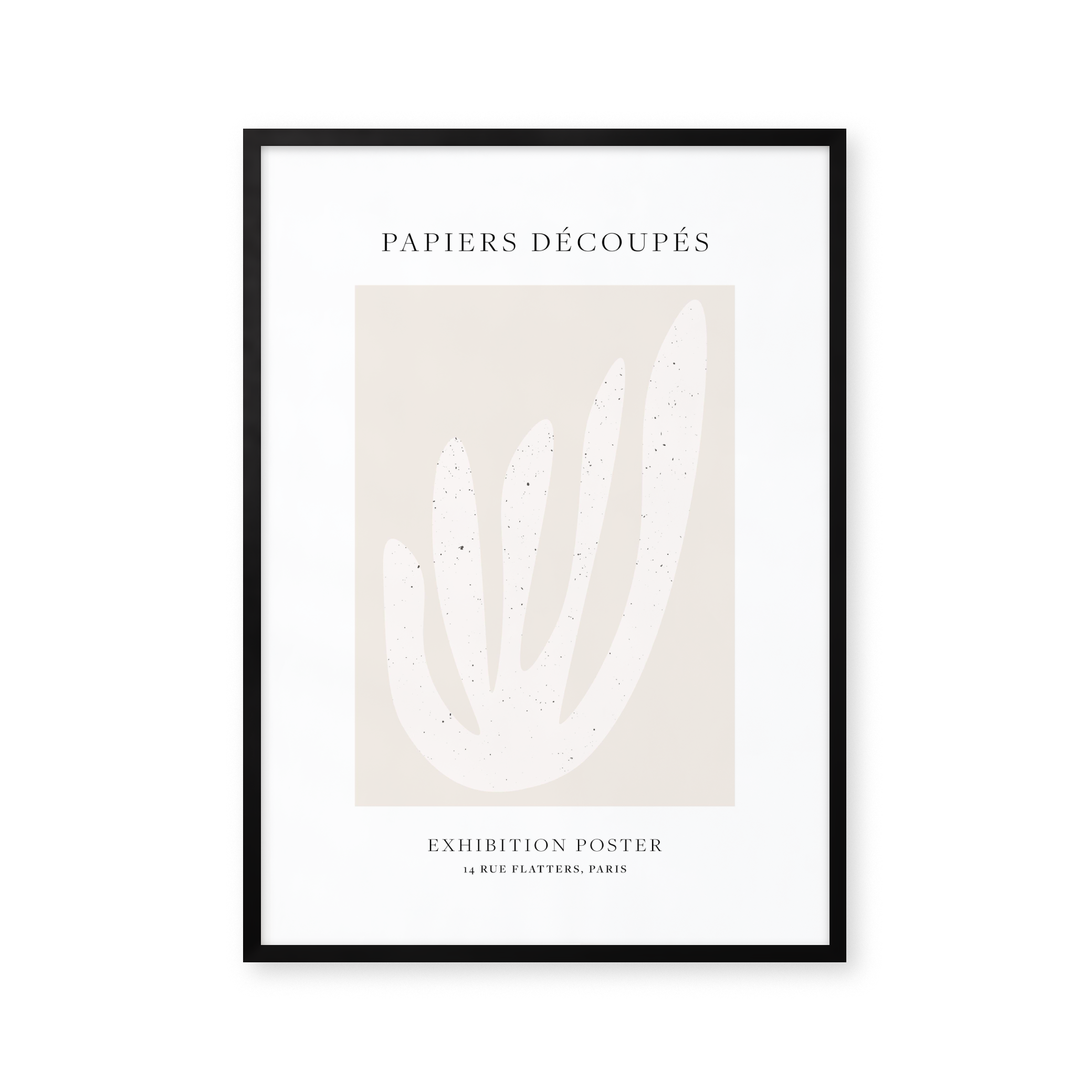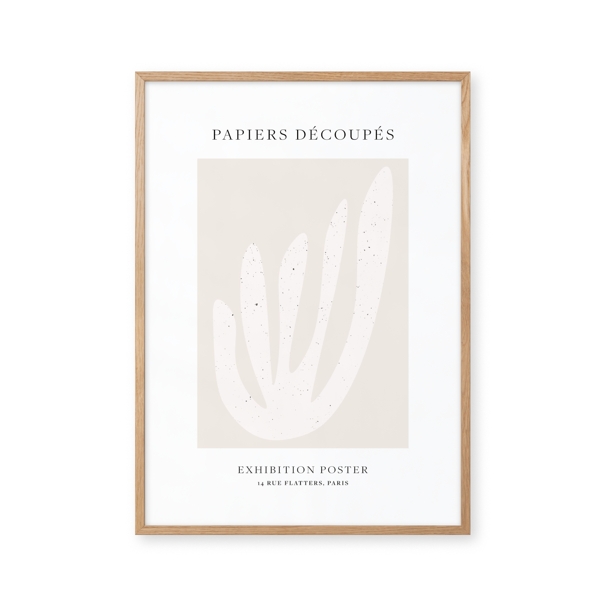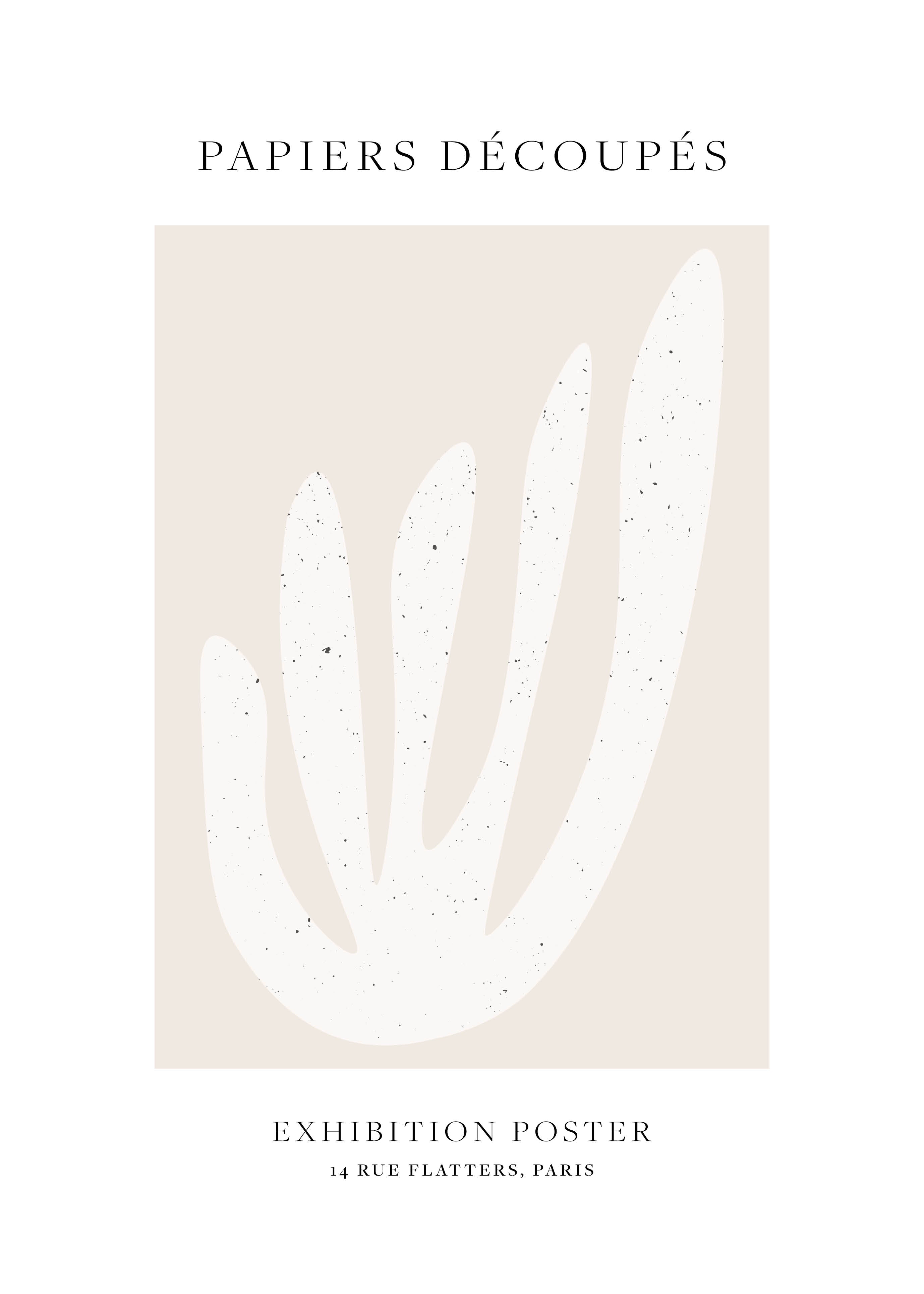 Opdag "Papiers Découpés" – en minimalistisk plakat, der fanger essensen af moderne kunst. Med sin rene beige baggrund og hvidt, speckled cut-out design, tilføjer denne udstillingsplakat fra Paris et strejf af elegance til ethvert rum. Perfekt til kunstelskere og trendsettere.