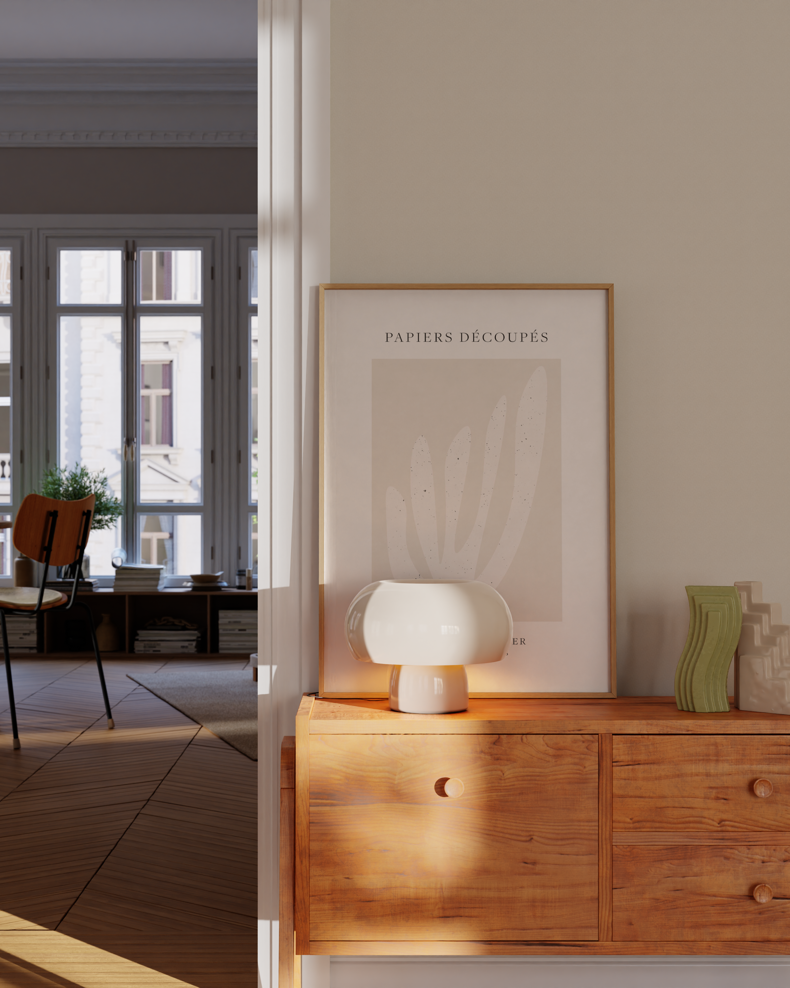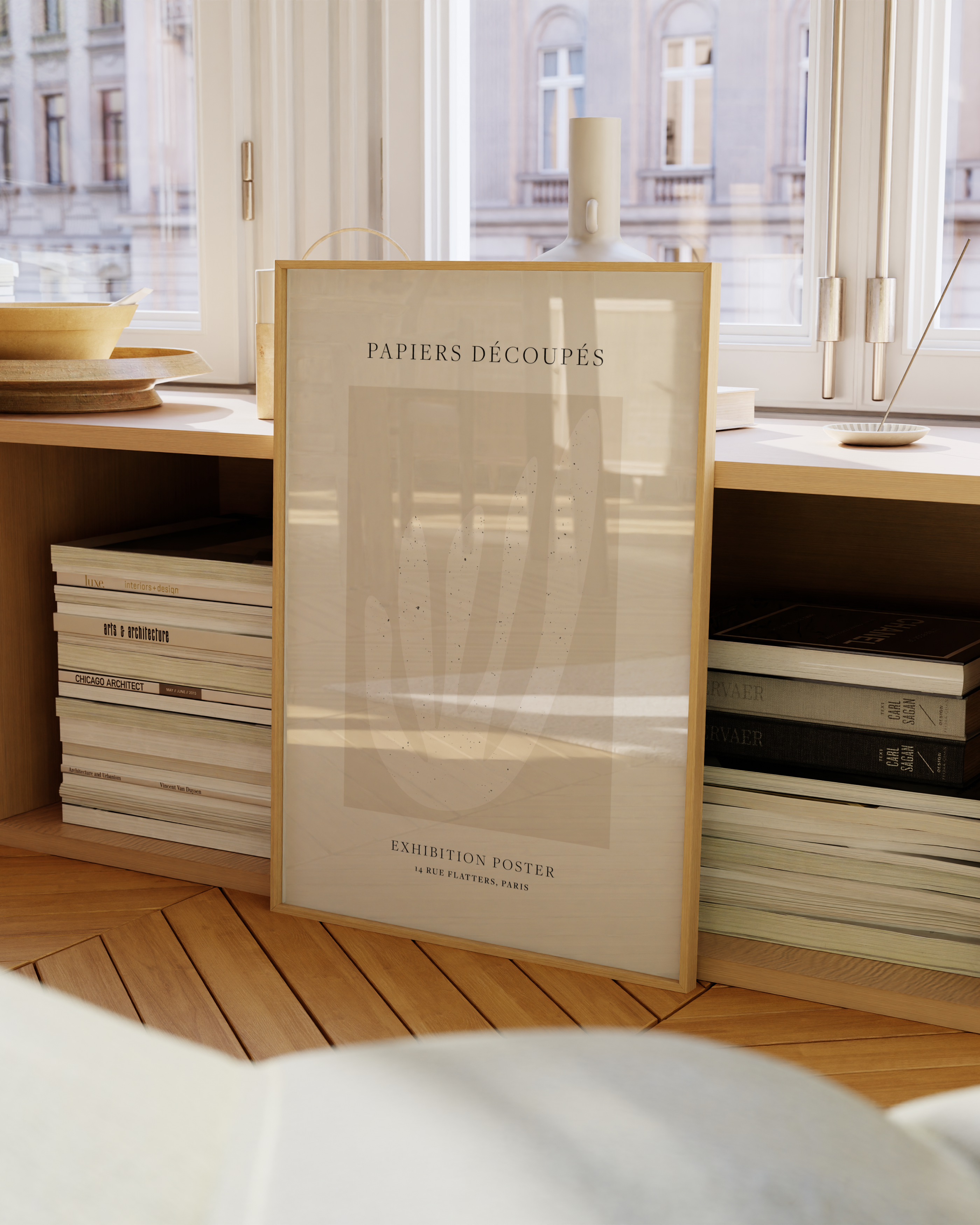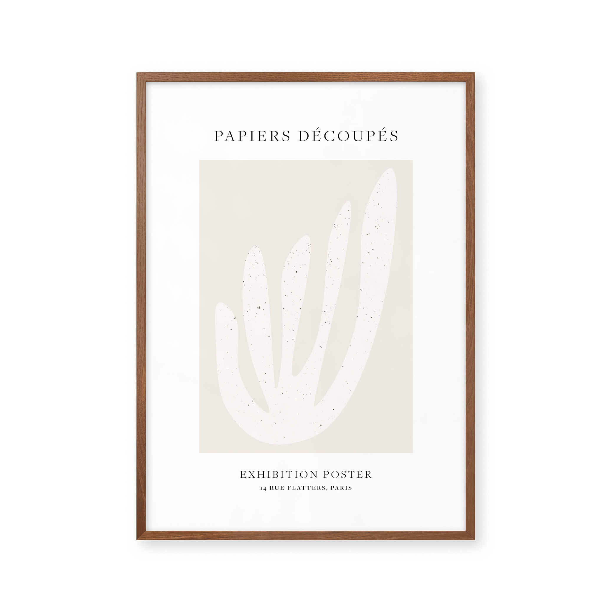 Opdag "Papiers Découpés" – en minimalistisk plakat, der fanger essensen af moderne kunst. Med sin rene beige baggrund og hvidt, speckled cut-out design, tilføjer denne udstillingsplakat fra Paris et strejf af elegance til ethvert rum. Perfekt til kunstelskere og trendsettere.