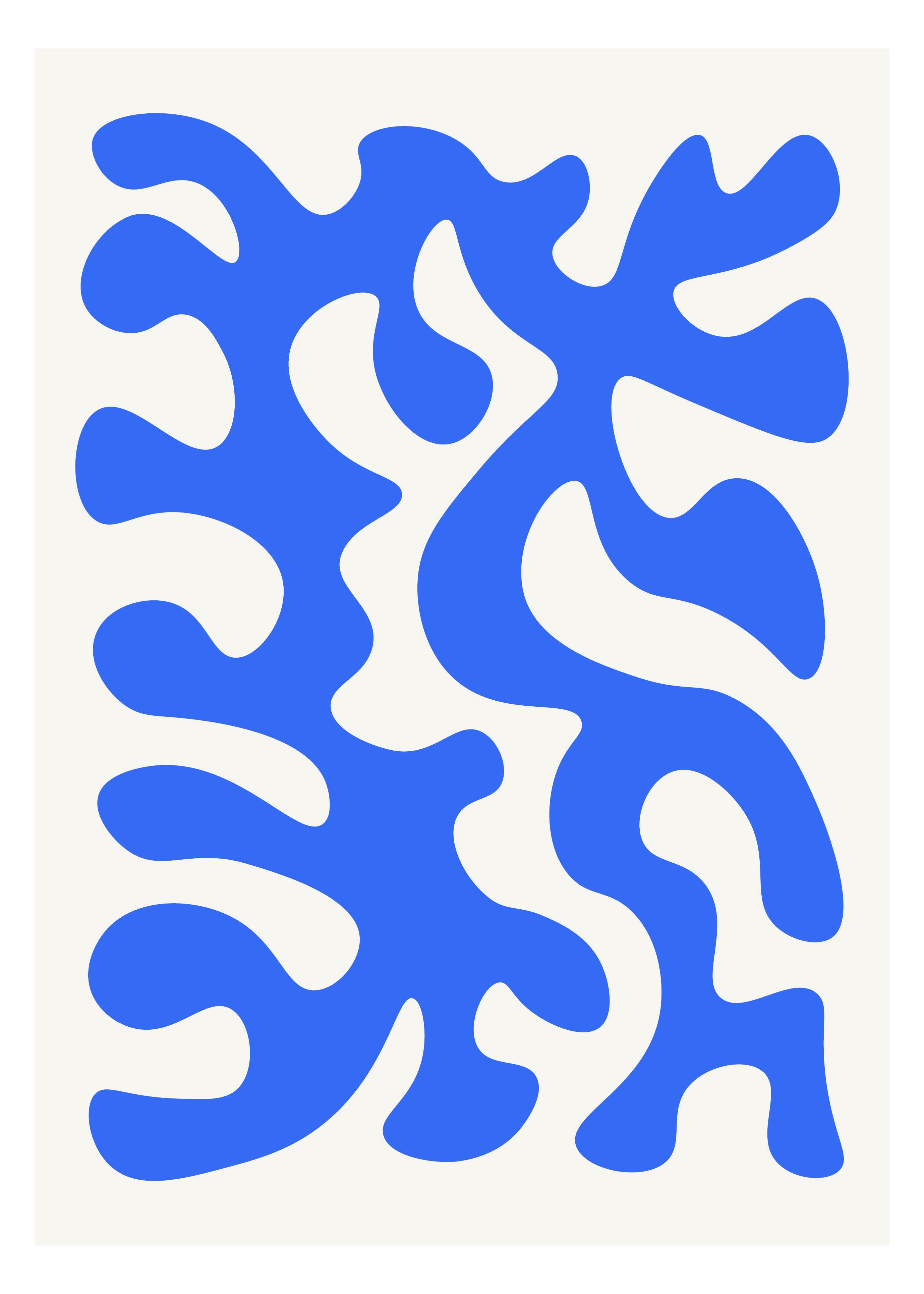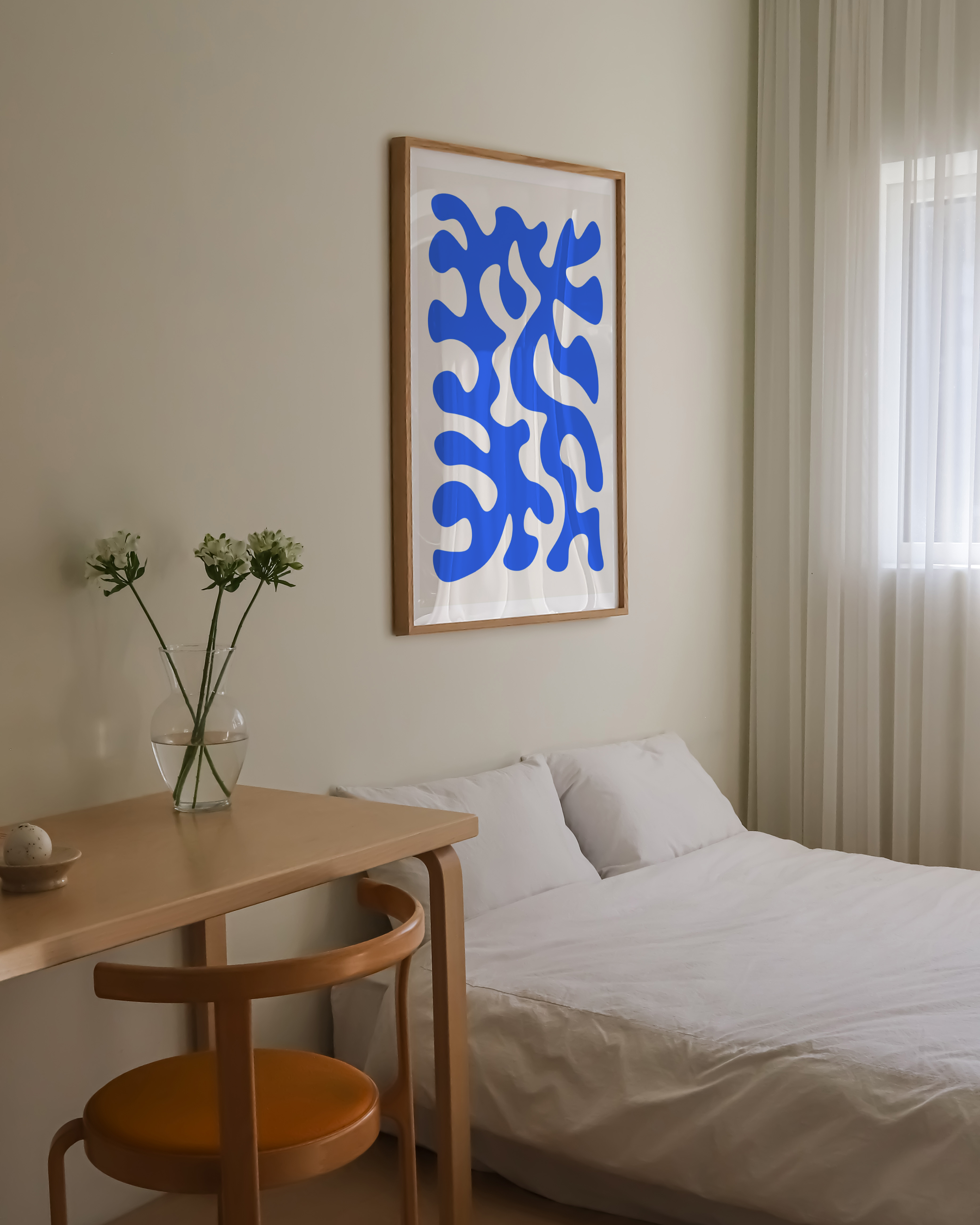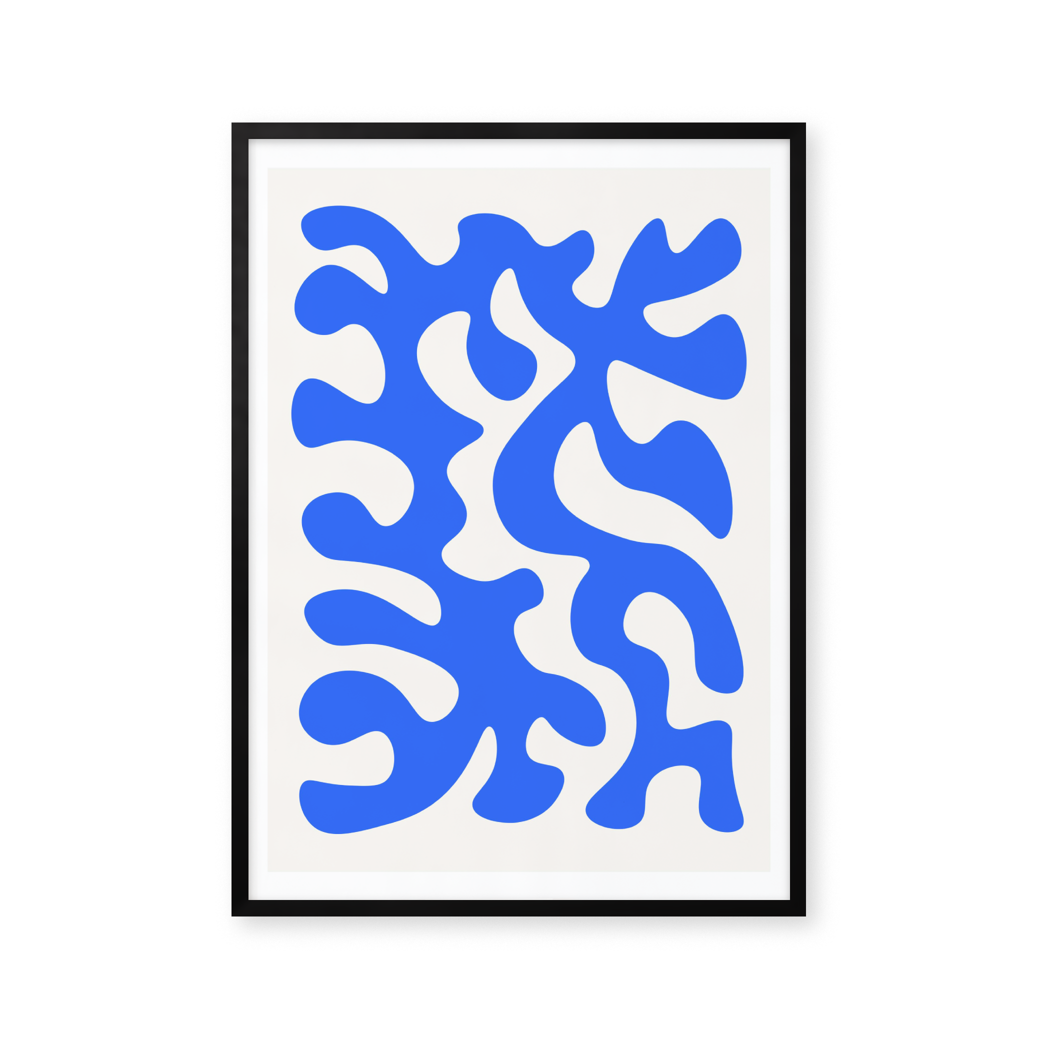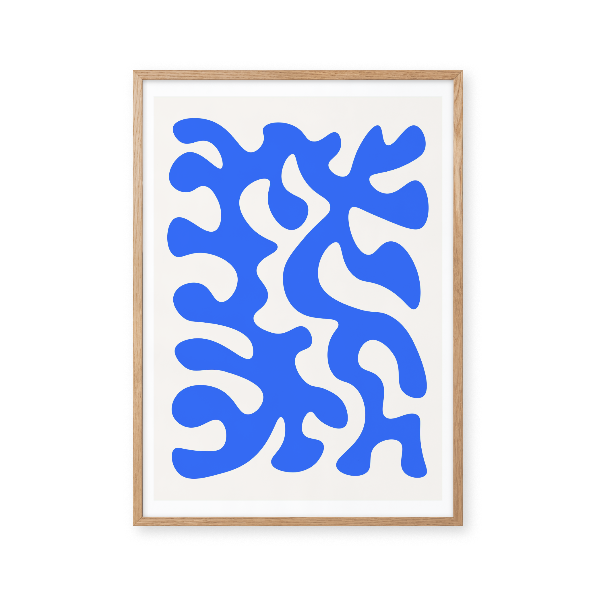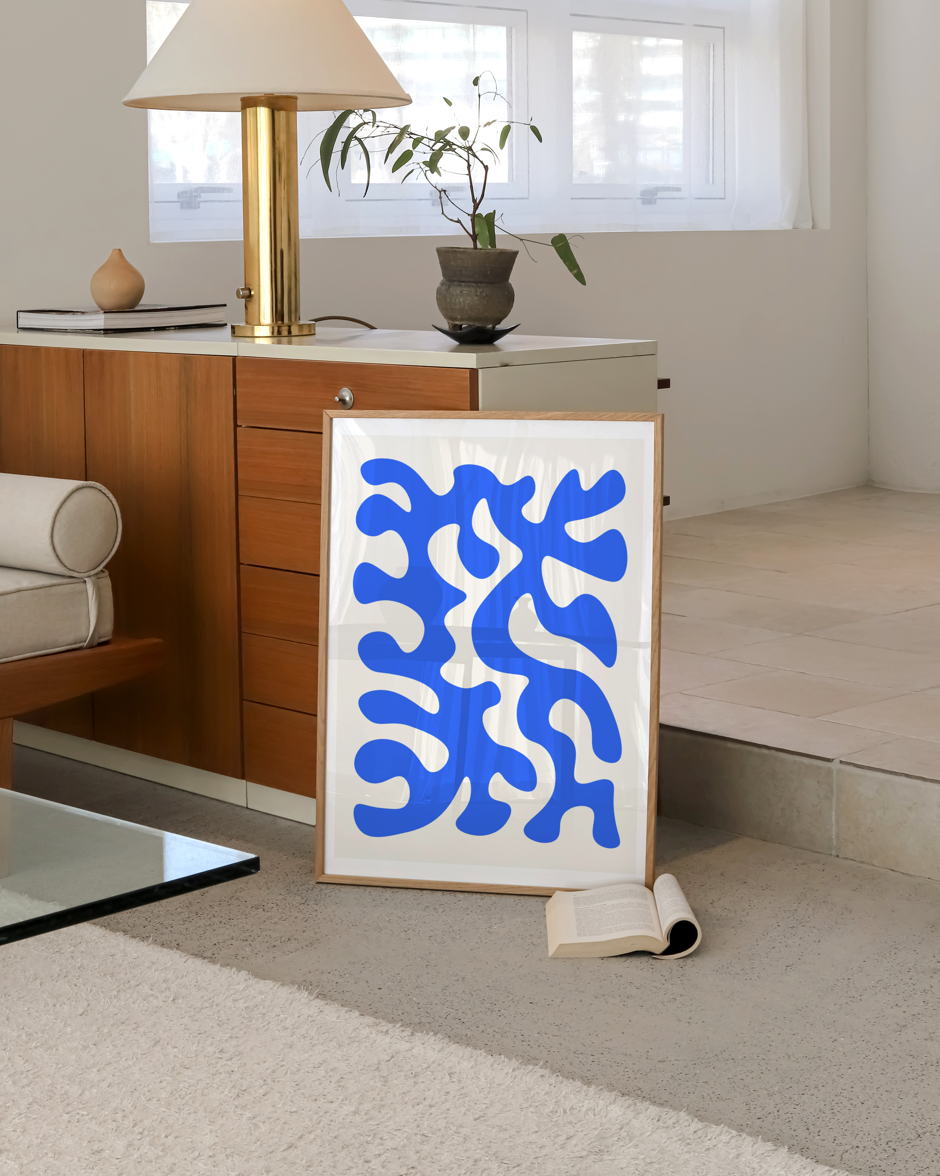 Opdag denne hypnotiserende plakat med sit levende blå mønster, der indfanger blikket og tilføjer et moderne twist til ethvert rum. Perfekt til kunstelskere, der værdsætter abstrakte former og dristige farver. En ægte samtalestarter, der vil berige din vægdekoration.