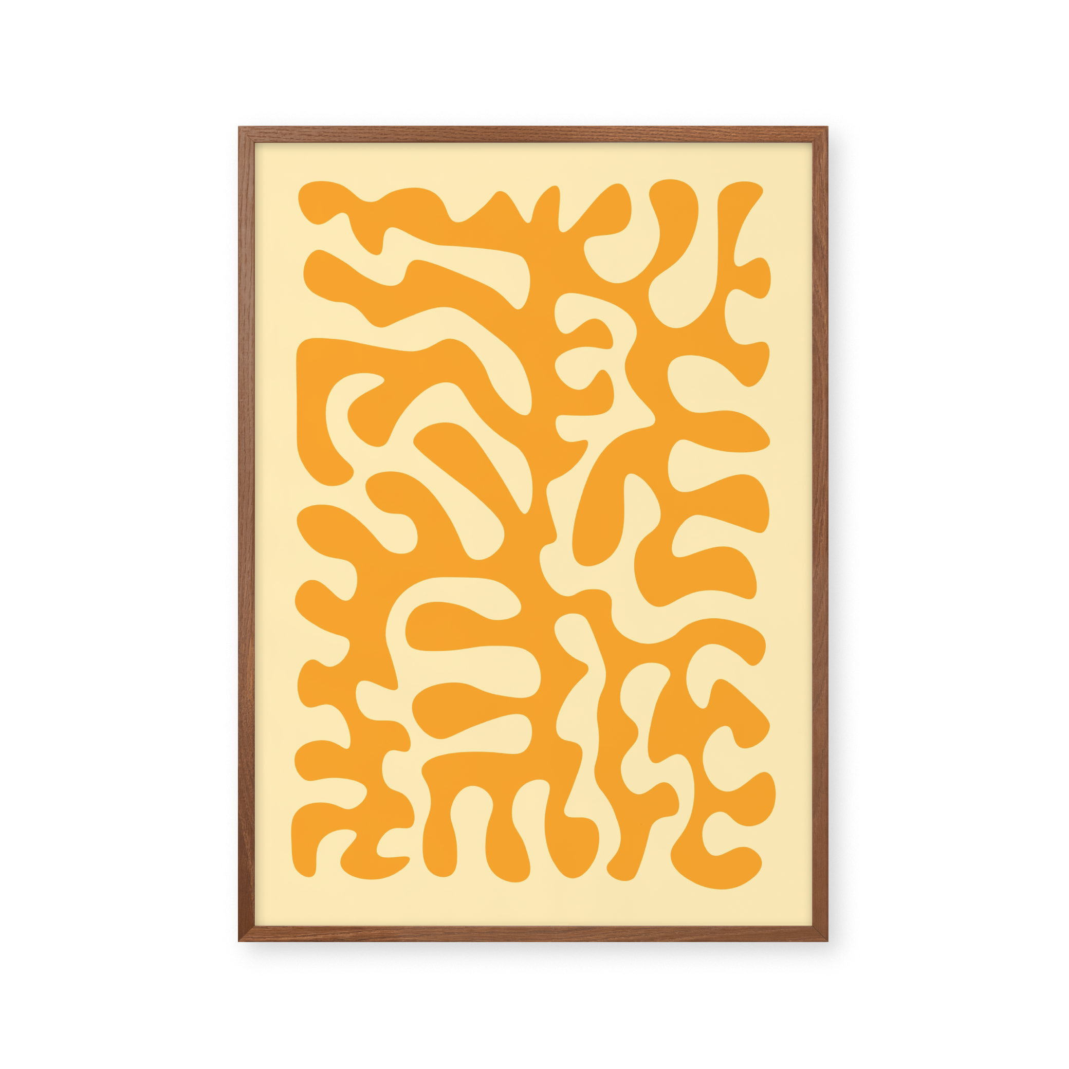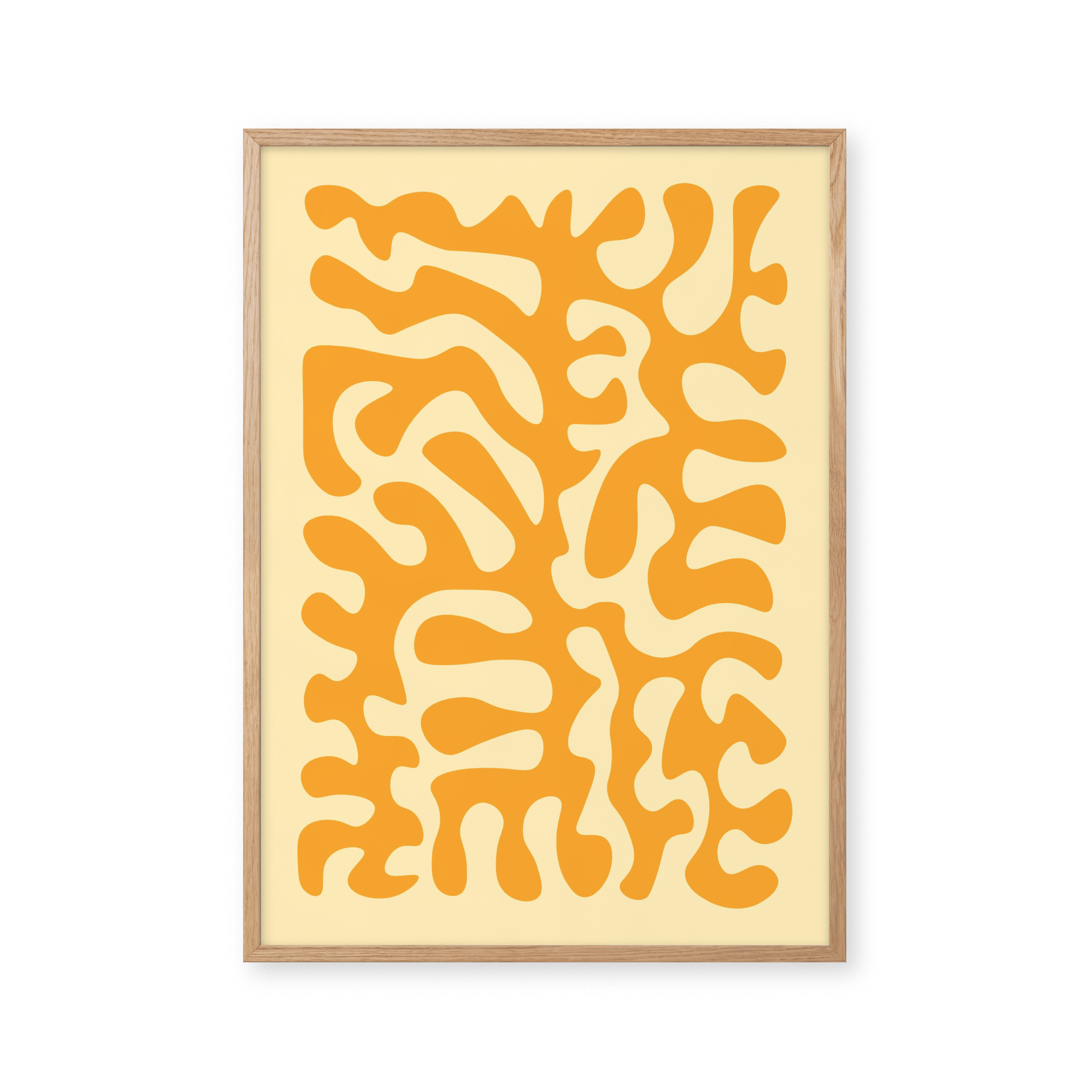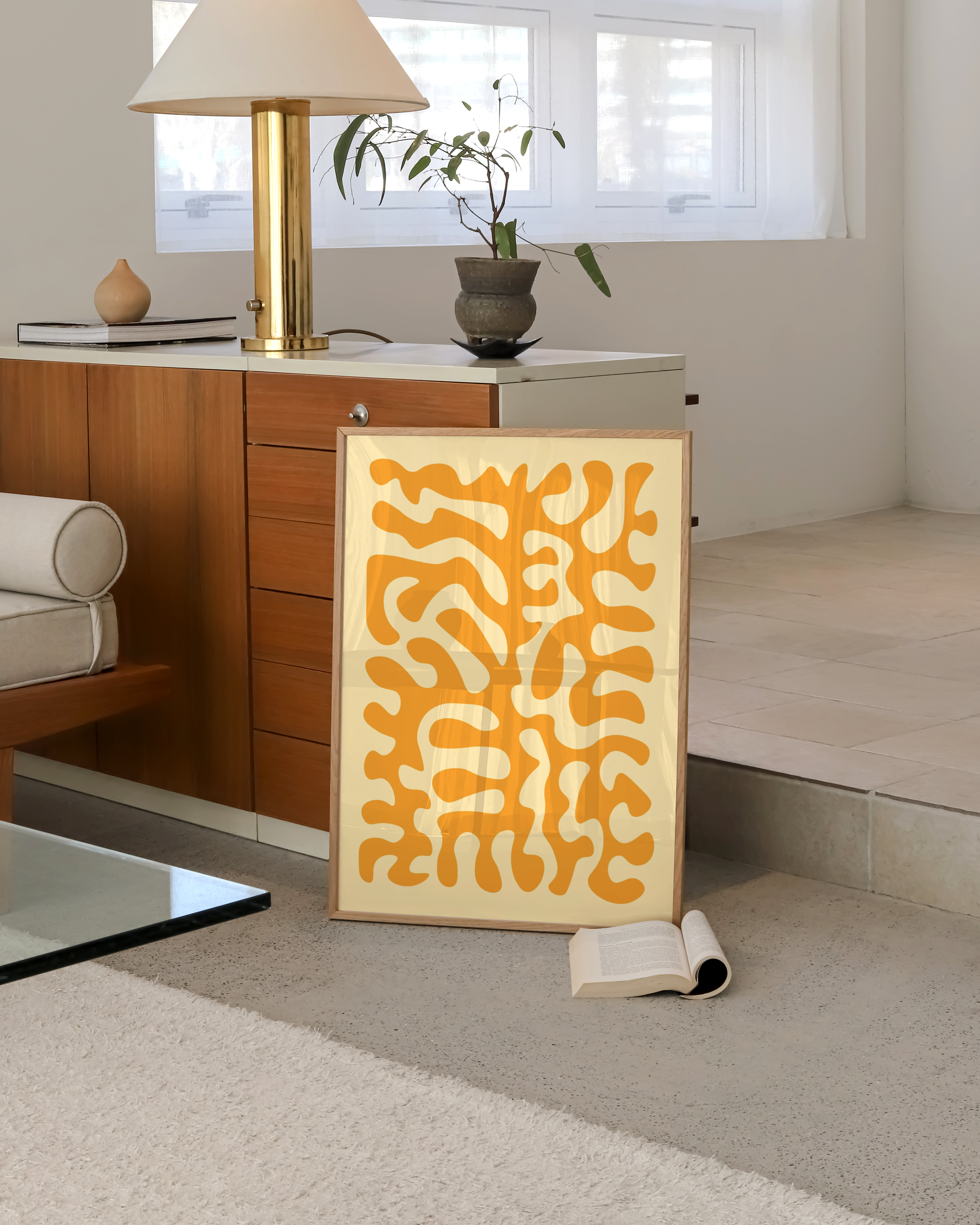 Opdag denne hypnotiserende plakat, hvor abstrakte, orange former danser på en cremefarvet baggrund. Perfekt til at tilføje et strejf af moderne kunst og varme til ethvert rum. En ægte blikfanger, der kombinerer stil og farvespil. Ideal til indretning med flair!