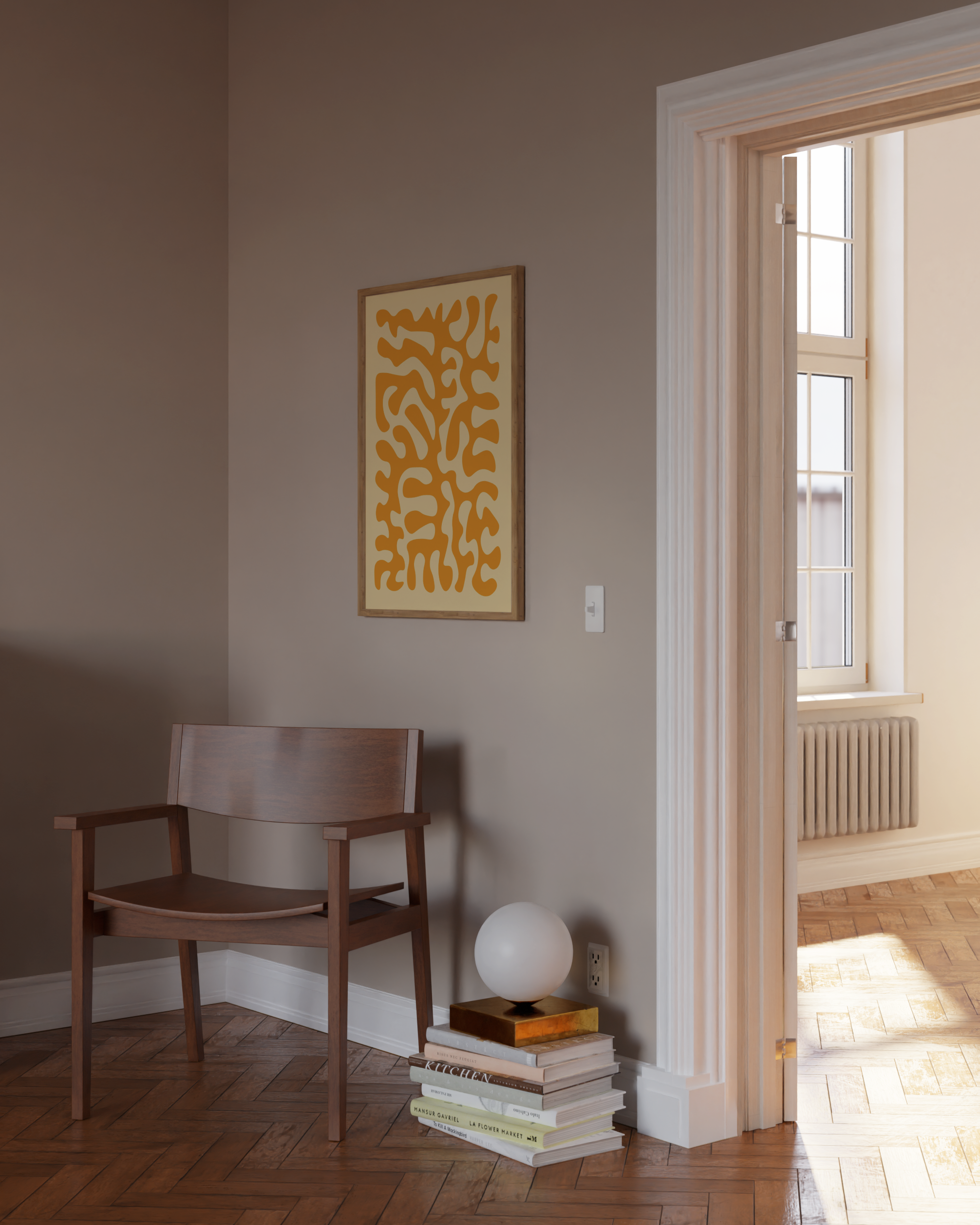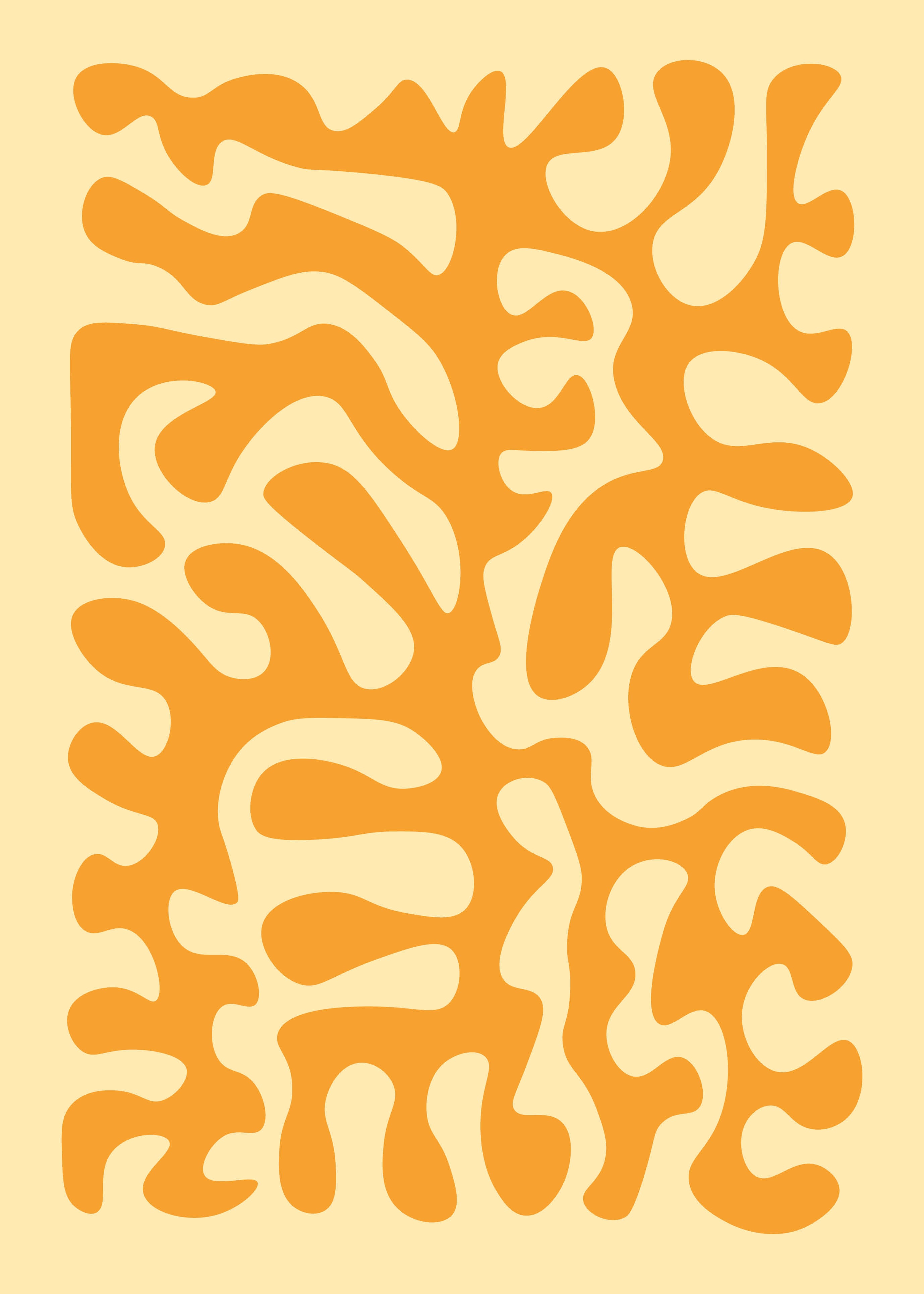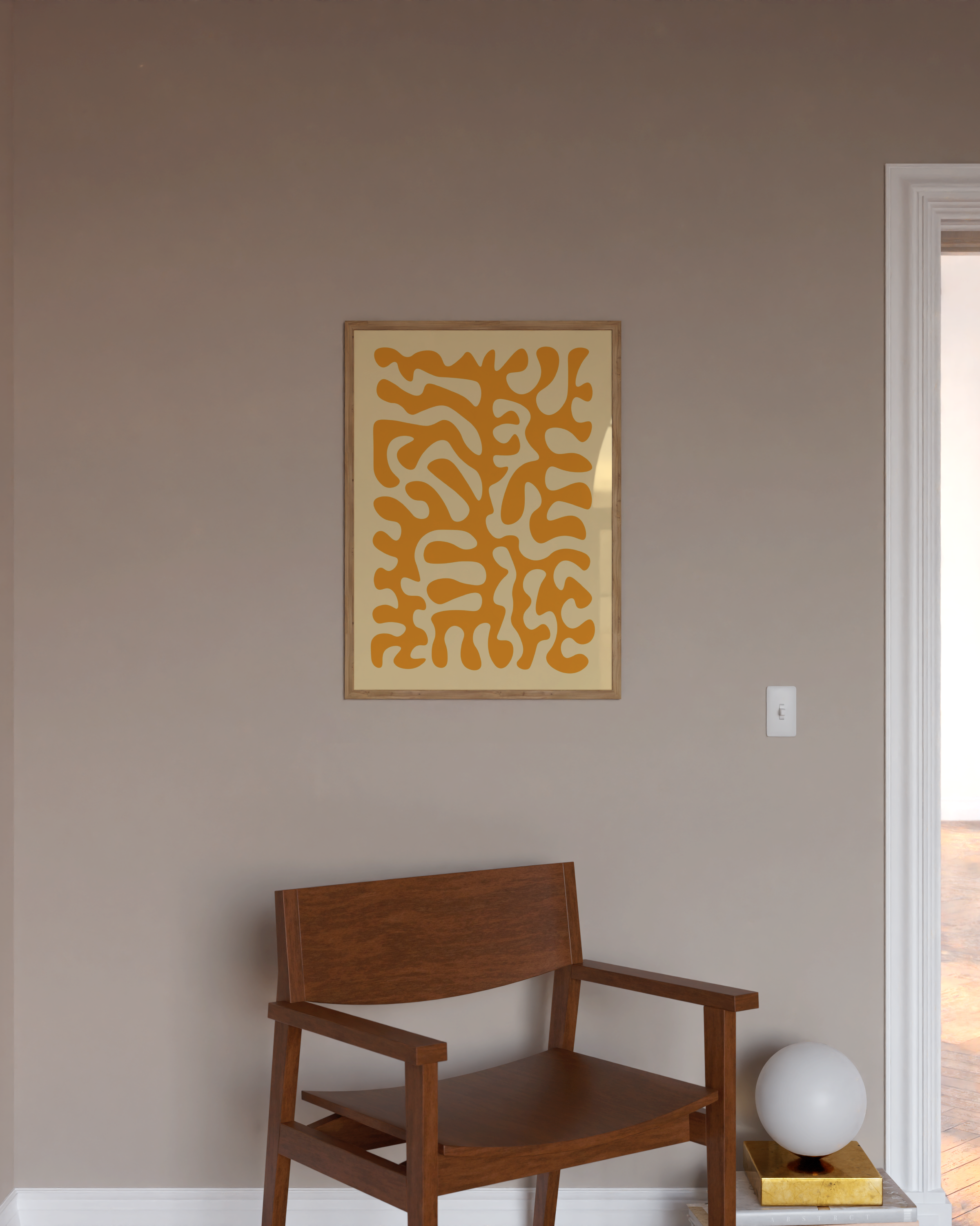 Opdag denne hypnotiserende plakat, hvor abstrakte, orange former danser på en cremefarvet baggrund. Perfekt til at tilføje et strejf af moderne kunst og varme til ethvert rum. En ægte blikfanger, der kombinerer stil og farvespil. Ideal til indretning med flair!