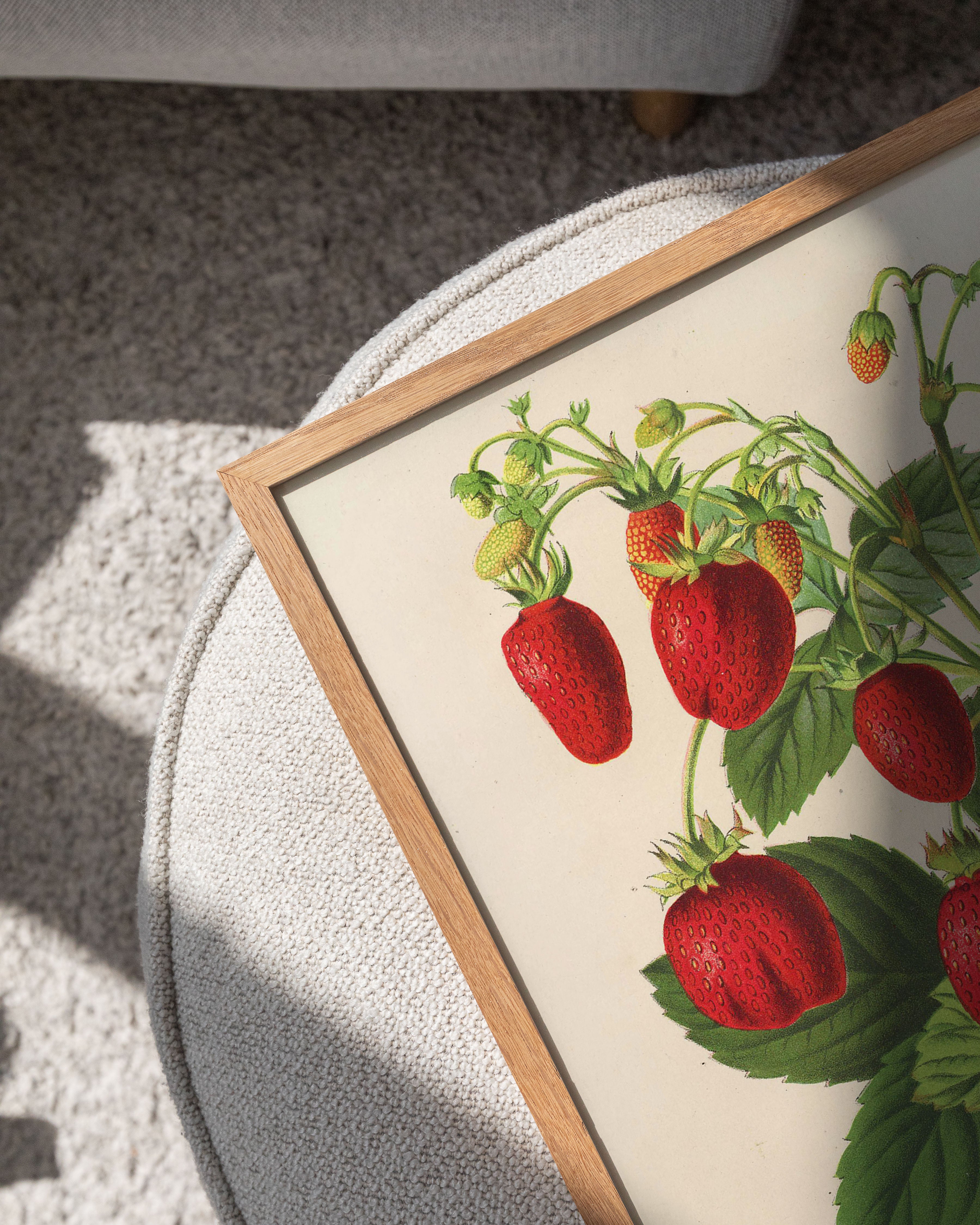 Opdag "rêve de fraise" – en charmerende plakat, der fanger essensen af sommer med sine livlige røde jordbær og frodige grønne blade. Perfekt til at tilføre et strejf af natur og farve til ethvert rum. En ægte visuel lækkerbisken for øjet, der lover at vække dine vægge til live.