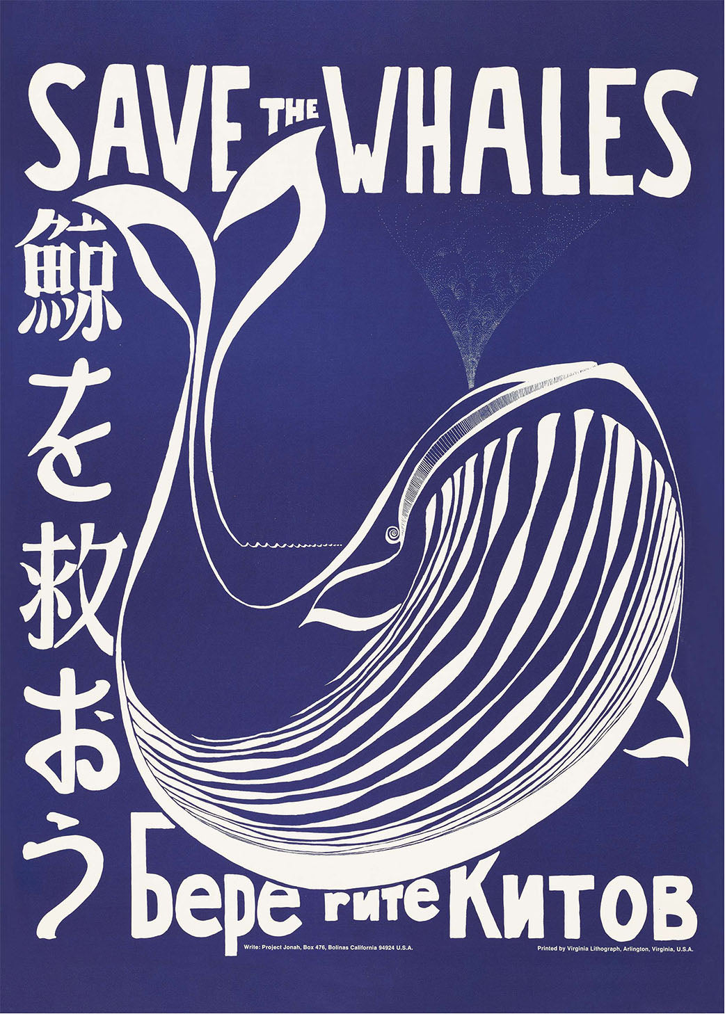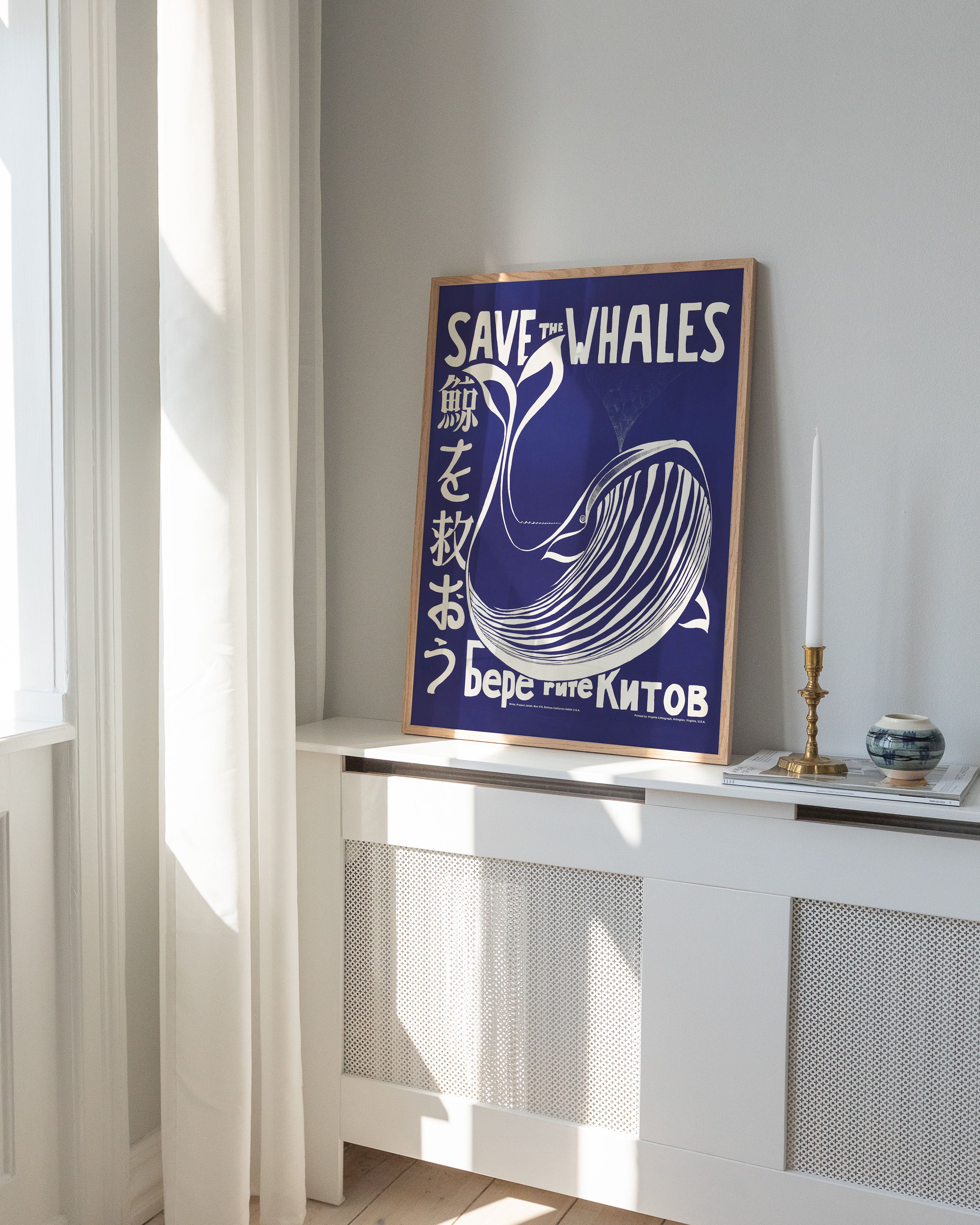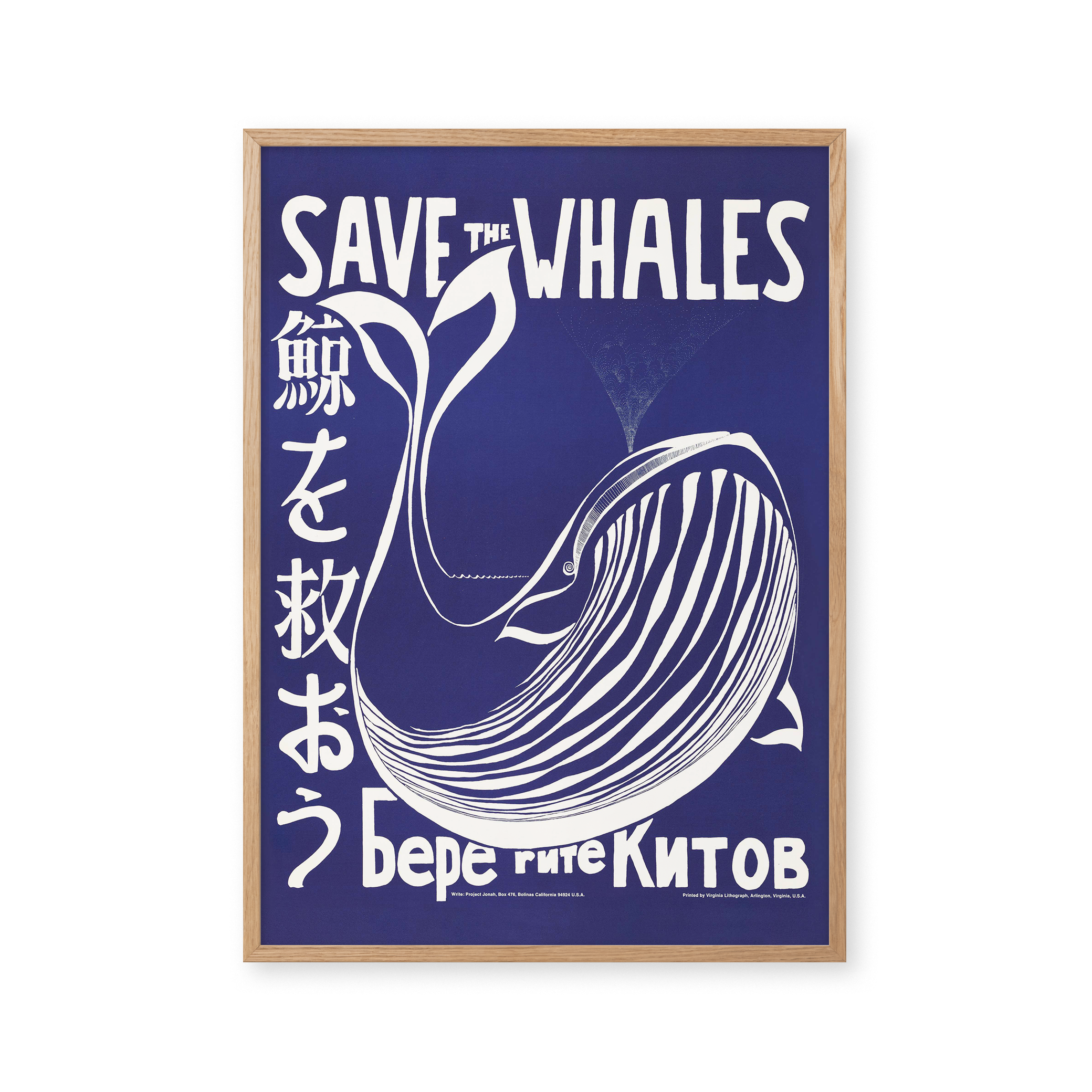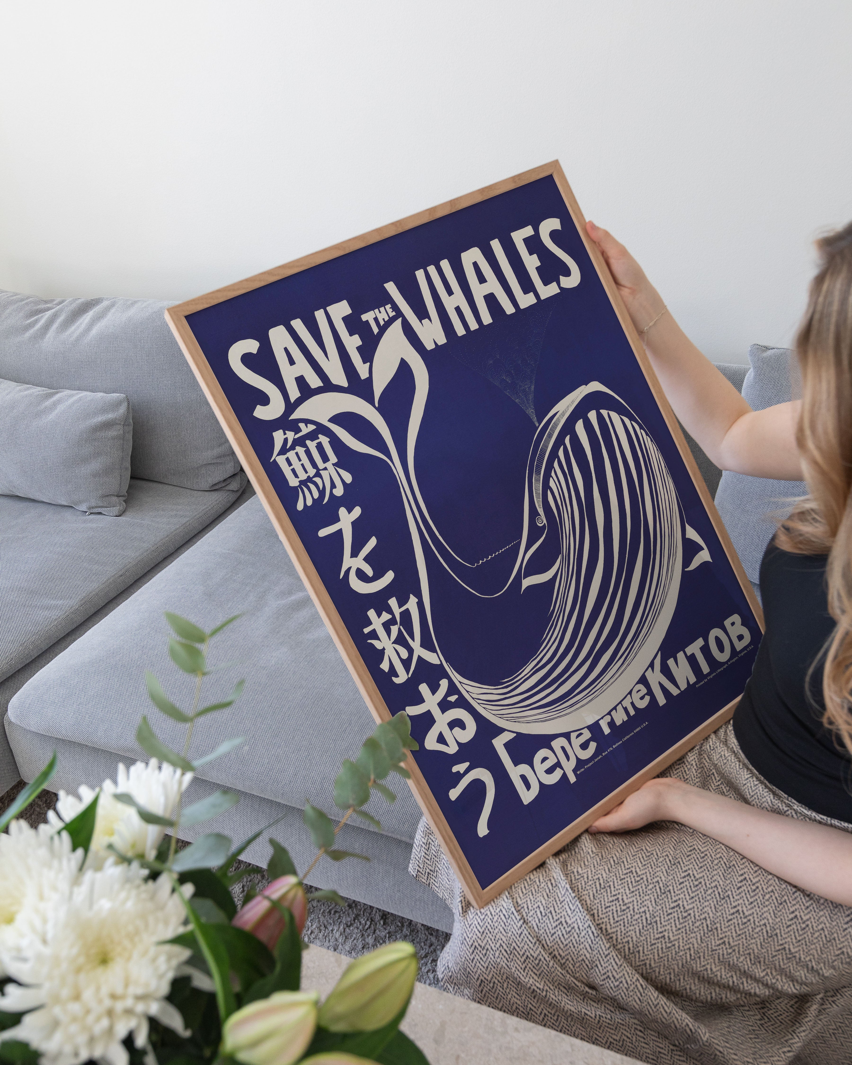 "Save the Whales" plakat: En dybblå baggrund med hvid grafik fremhæver majestætiske hvaler og internationale budskaber. Perfekt til at skabe opmærksomhed om havets skønhed og vigtigheden af at beskytte vores marine liv. Tilføj et strejf af naturbevidsthed til dit rum med denne unikke kunstplakat.