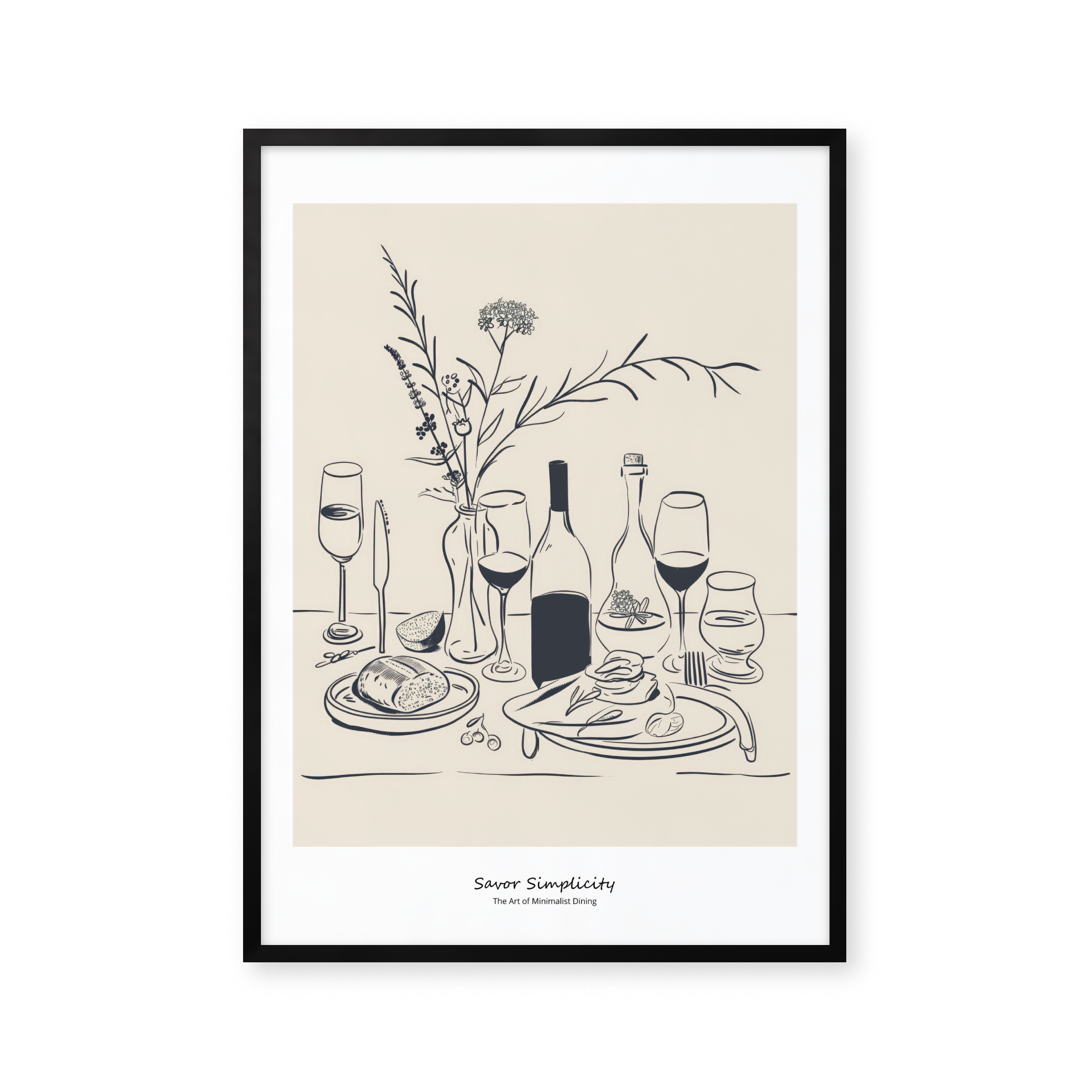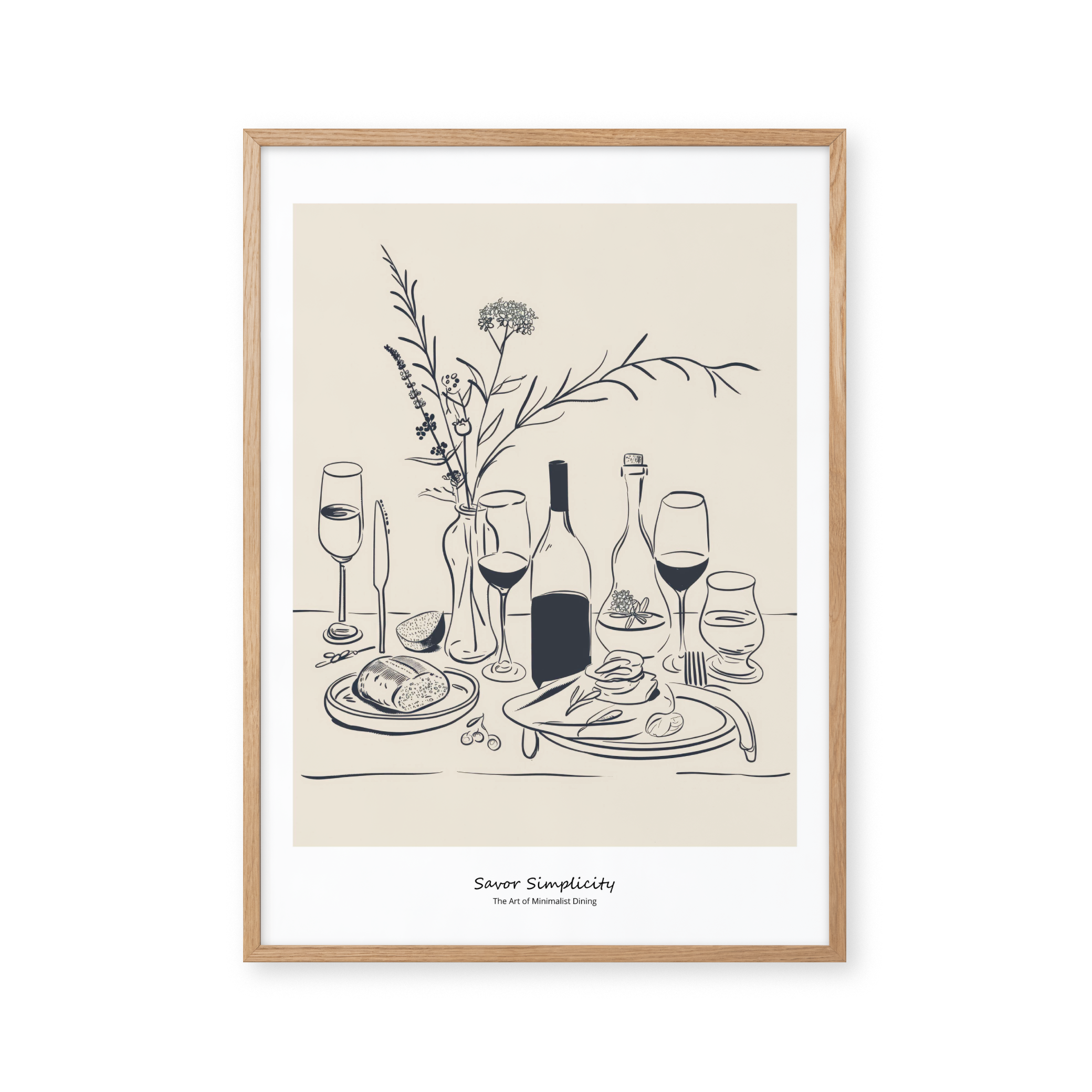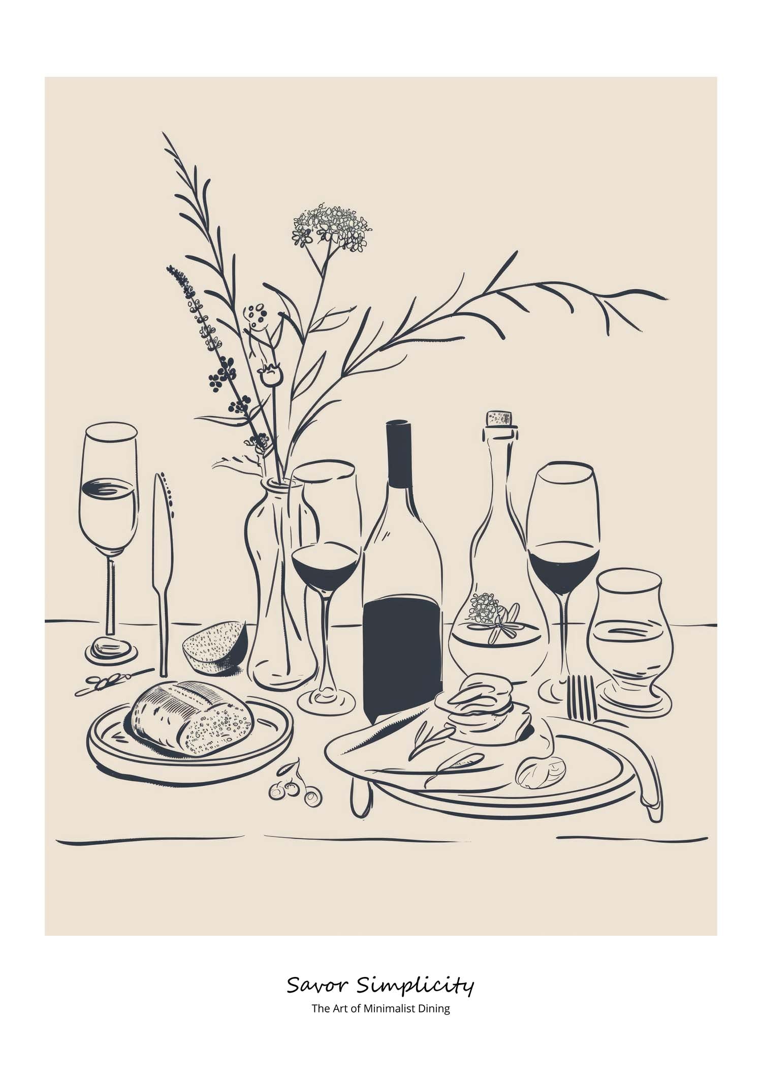 Opdag "Savor Simplicity" - en elegant plakat, der fejrer minimalistisk spisning. Med en beroligende palet af bløde beige og kontrasterende blå nuancer, skildrer denne kunstneriske fremstilling et stilfuldt dækket bord, der indbyder til ro og nydelse. Perfekt til at tilføre et touch af underspillet elegance til ethvert rum.
